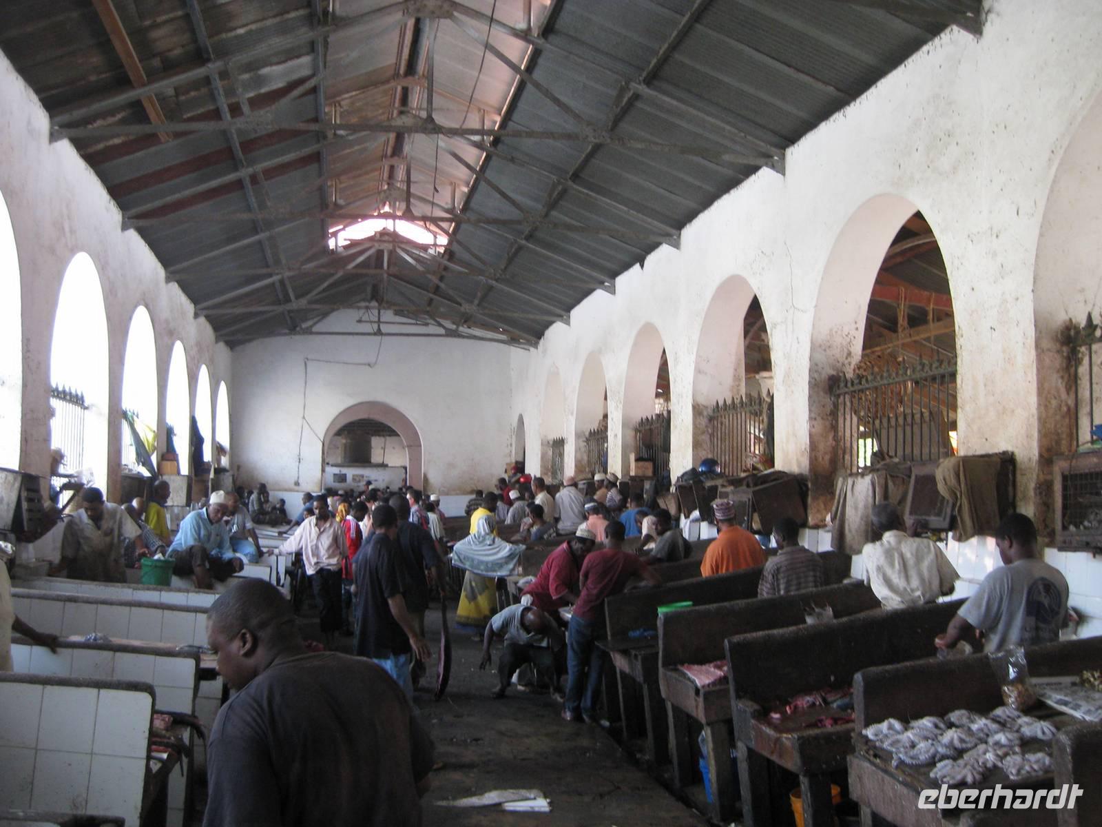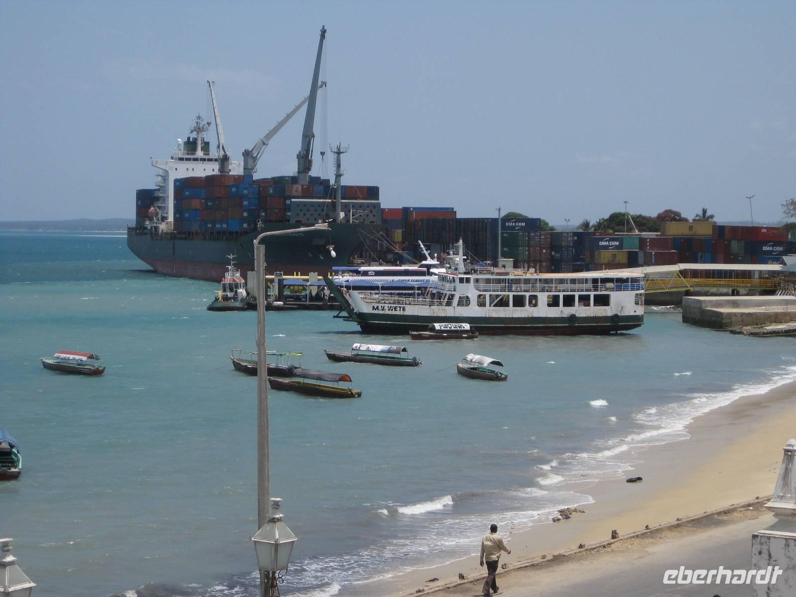 Am Morgen holt uns unser Bus planmäßig ab. Es geht ein letztes Mal quer über die Insel zur Fähre. In einem Dorf kaufen wir noch einmal Wasserflaschen. Im Fährhafen erhalten wir die Tickets vom Manager von Tima Tours. Er kümmert sich extrem gut um uns. An die Ausreiseformalitäten sind wir nun schon fast gewöhnt. Es ist ein ziemliches Gedränge, aber wir und auch unser Gepäck kommen sicher an Bord der Fähre. Unser Koffermann hat wirklich ein gutes Trinkgeld verdient. In unserem klimatisierten Luxusabteil sind wir nicht die Einzigen, aber es gibt auch noch genügend Platz. Nach knapp 2 Stunden herrlicher Überfahrt erreichen wir wieder den Hafen des Friedens, Dar es Salaam. Im Hafen herrscht wieder großes Gedränge. Dann bekommen wir pflichtgemäß Träger zugeteilt.