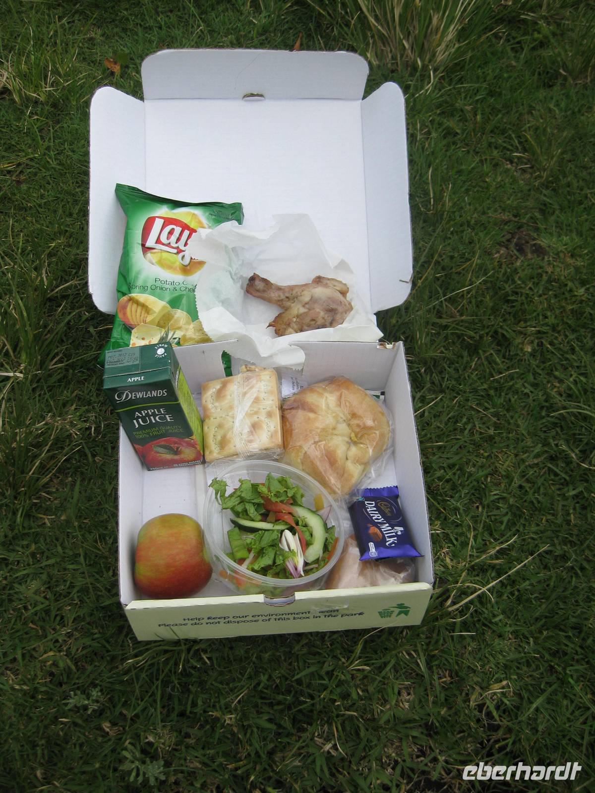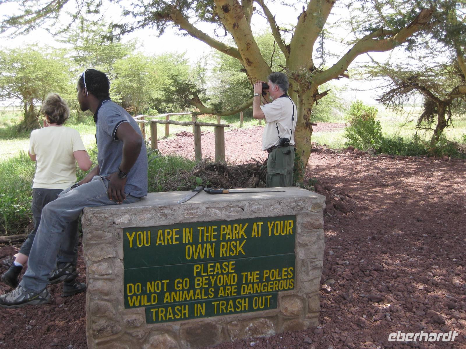 Nachdem Hans unterwegs kleine süße Bananen zum Probieren gekauft hat, sind wir gegen Mittag im Manyara Nationalpark und machen gleich am Eingang erst einmal Picknick. Die Lunchbox ist noch aus der Arumeru Lodge. Danach reiben wir uns gründlich mit Mückenschutz und Sonnenschutz ein und los geht es auf die Safari-Pirsch.