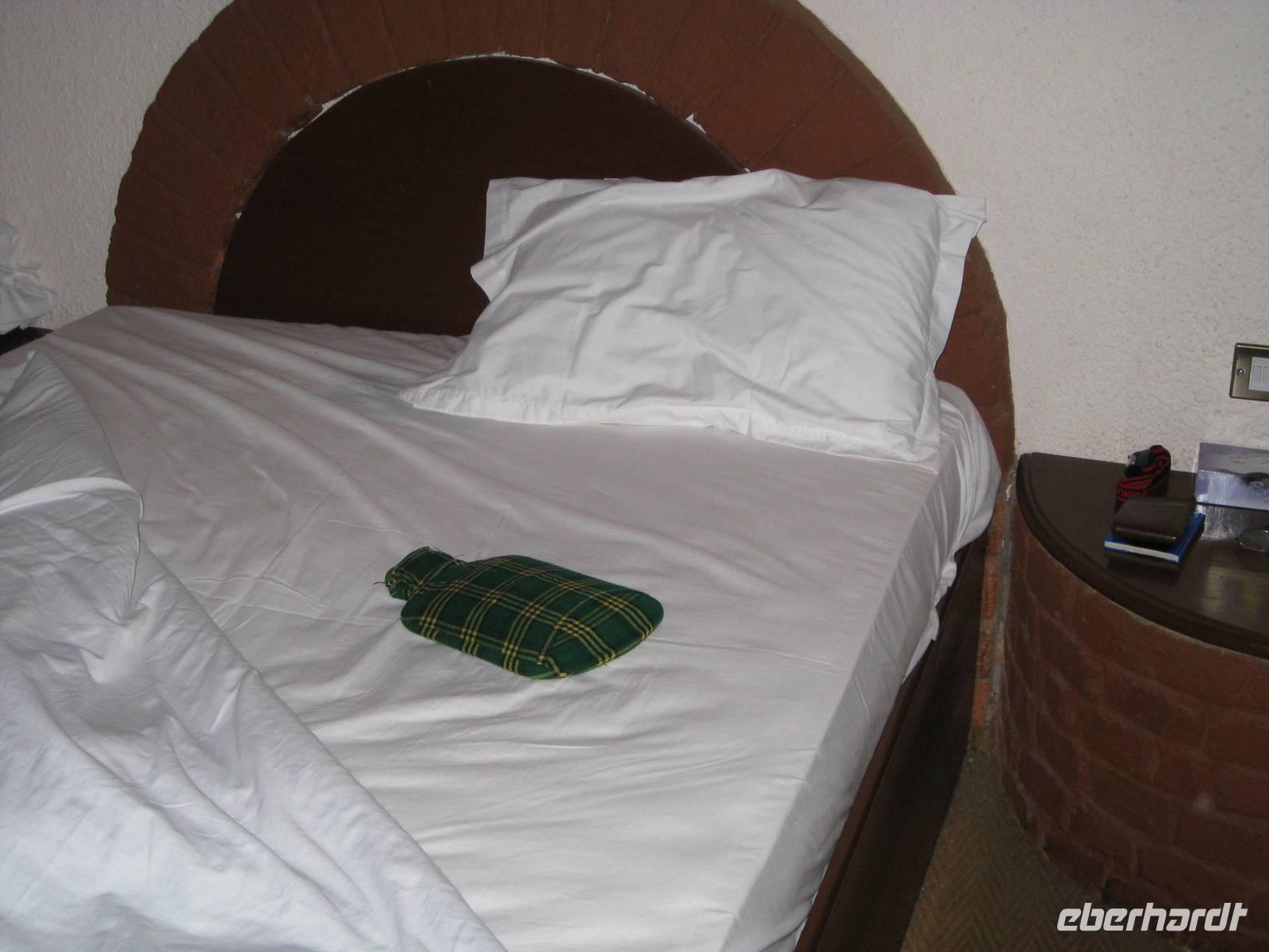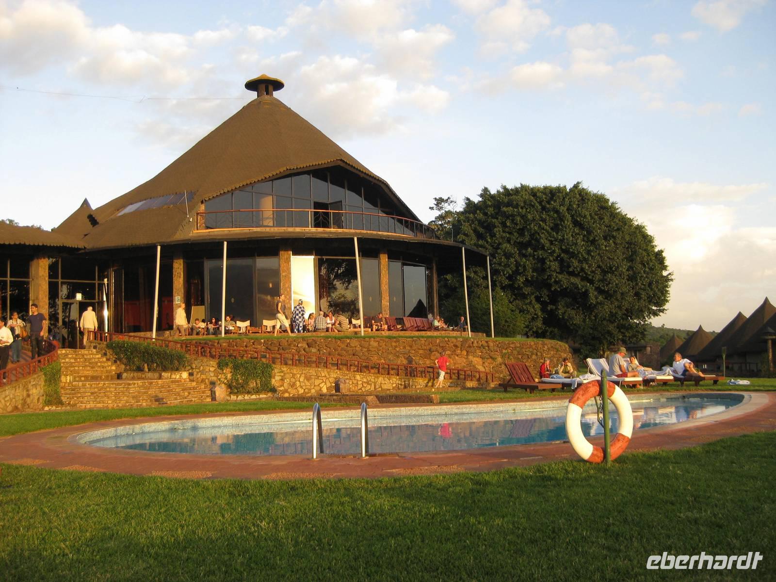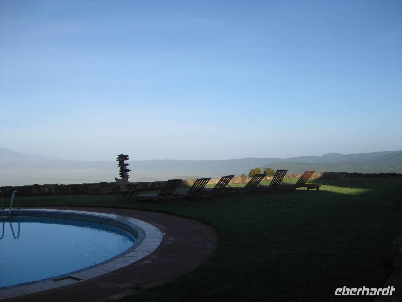 Am späten Nachmittag erreichen wir wieder den Kraterrand und unsere neue Lodge, die Ngorongoro Sopa Lodge. Erfrischungstücher und -trunk heißen uns willkommen. Unsere Zimmer in den Bungalows im afrikanischen Stil liegen allerdings etwas auseinander. Aber die Ausblicke sind fantastisch. Die Liegen am Swimmingpool sind heute leider schon von anderen Gästen belegt. Das Sundowner-Getränk genießen dann alle. Die Zimmer sind großzügig eingerichtet und mit Safe ausgestattet. Obwohl es zu dieser Jahreszeit noch nicht so kalt ist wie im Juni/Juli sind wir völlig überrascht zur Nacht Wärmflaschen in unseren Betten zu finden.