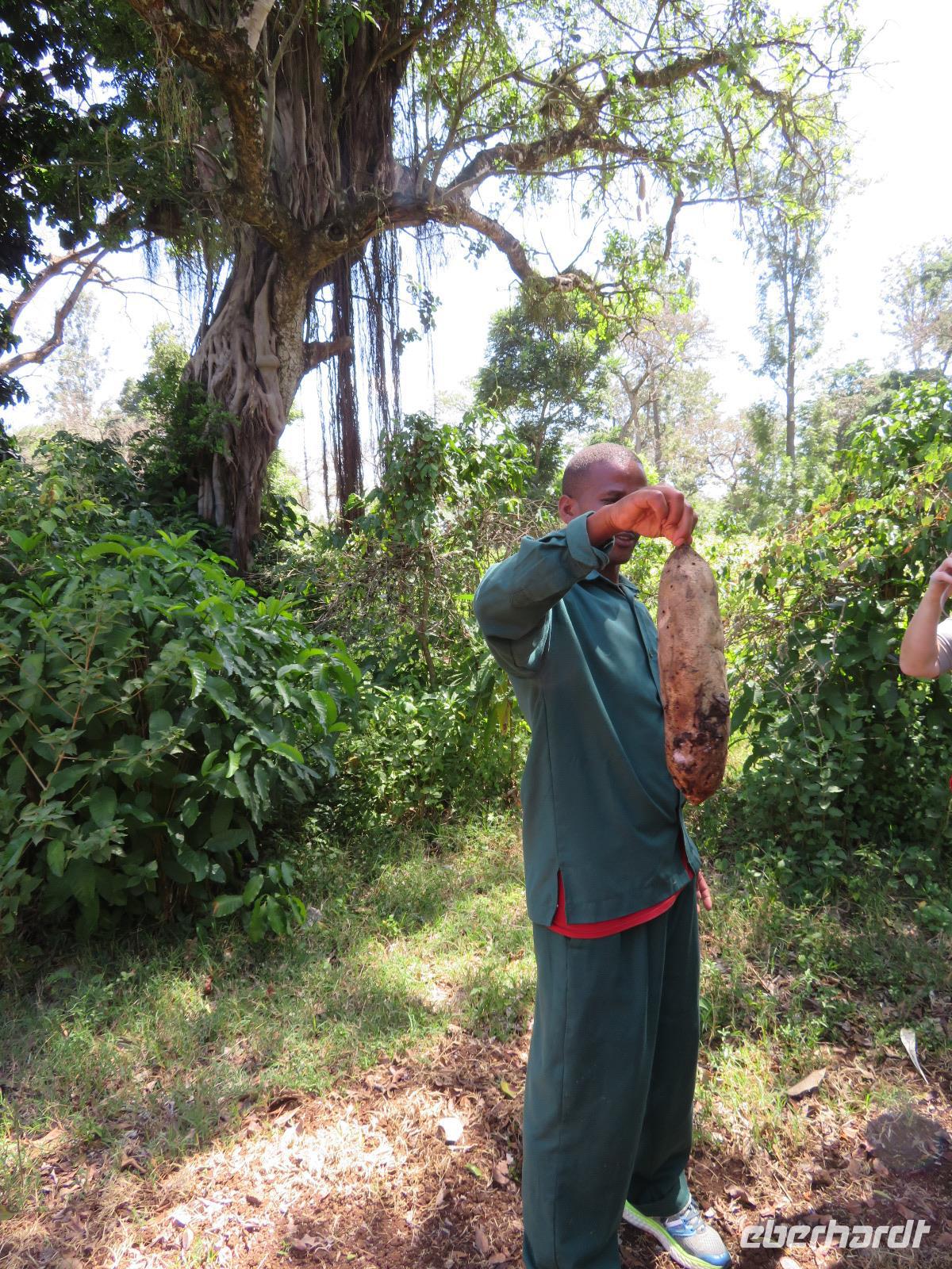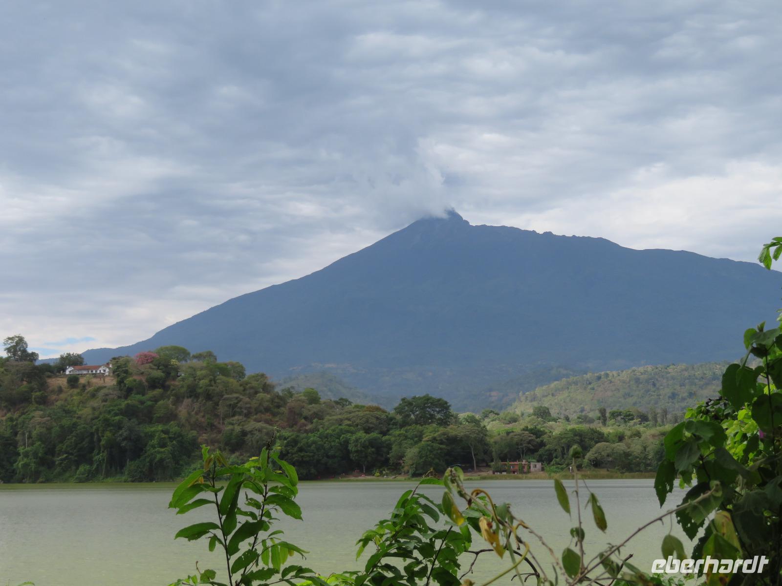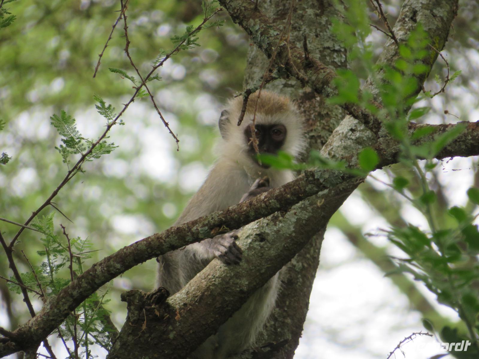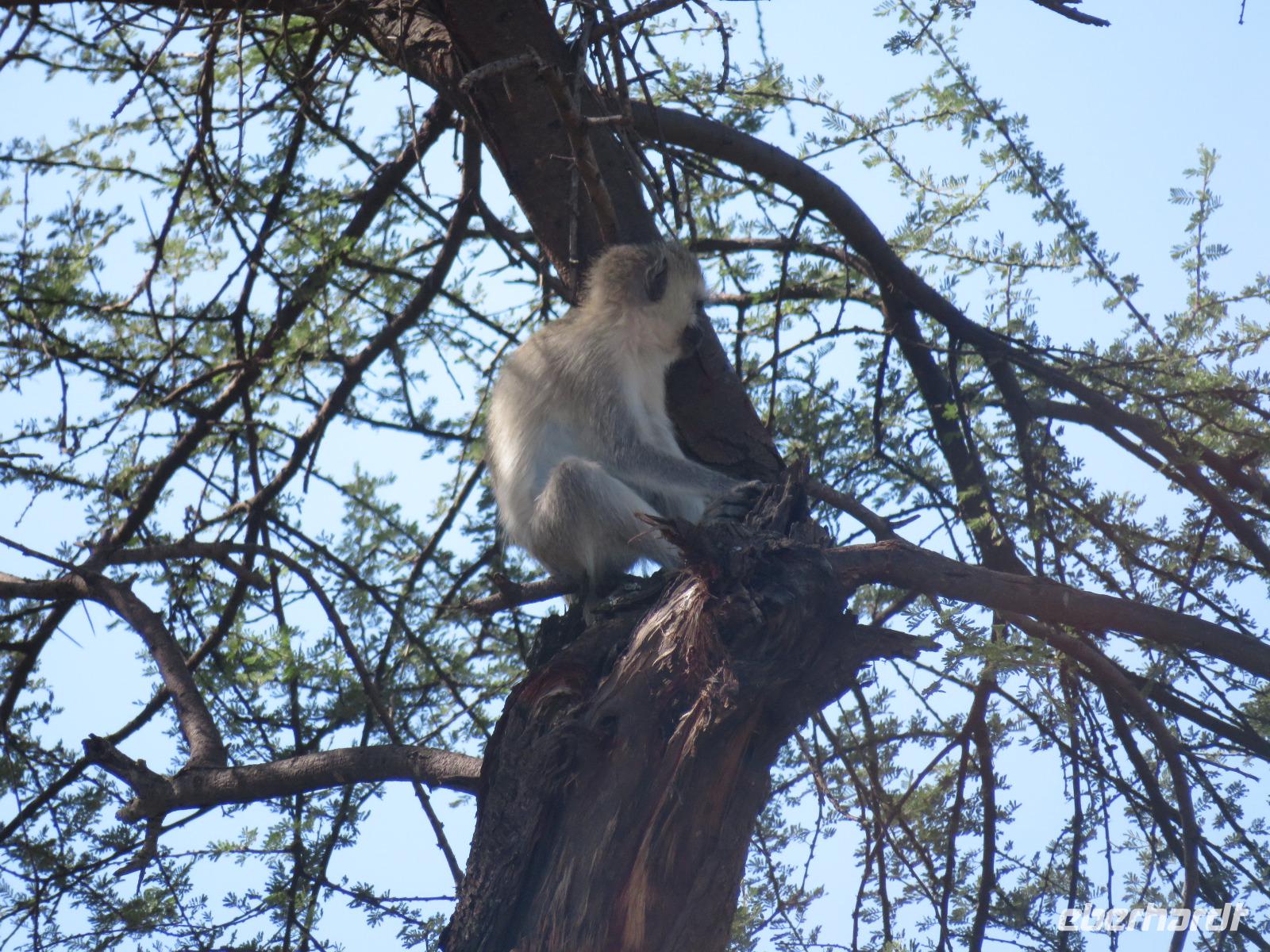 Heute heißt es erst mal ausschlafen. Wir bedienen uns vom reichhaltigen Frühstücksbuffet und genießen den Blick auf den Mount Meru. Der Mount Meru ist mit 4.500 Meter der zweithöchste Berg Tansanias. Am späten Vormittag unternehmen wir einen Spaziergang in die nähere Umgebung der Lodge. Während des Rundganges mit einem Angestellten der Lodge geht es über eine kleinbäuerliche Kaffee-Farm und durch die Gemüsegärten der Bauern und der Lodge. Dabei erfahren wir, wie der Kaffee angebaut wird und welche Schritte nötig sind, bis die schwarzen Bohnen fertig sind. Wir lernen die „afrikanische Kaffeemühle" kennen. Mit einer einfachen Glasflasche wird der vorher über offenen Feuer in einem Tontopf geröstete Kaffee gemahlen. Als wir zu unseren Hütten zurückgehen, sehen wir eine große Gruppe grüner Meerkatzen, die sich tobend an einer Hütte tummeln. Nach dem Mittagessen erwartet uns Macdonald, einer unserer örtlichen Driver-Guides. Mit dem Bus fahren wir zum Dulutisee. Der Name des Sees kommt von einem hier ansässigen Stamm und bedeutet so viel wie „tiefstes Gebiet". Die Tiefe des Sees wurde 1999 gemessen und beträgt 740 Meter. Mit einem örtlichen Ranger wandern wir um den See durch den sogenannten Regenwald. Dabei eröffnen sich uns immer wieder schöne Blicke auf den Mount Meru. Der Kilimanjaro versteckt sich leider in Wolken. Wir sehen verschiedene Vögel, wie den Hammerkopfvogel, den afrikanischen Eisvogel und Komorane. Der Hammerkopfvogel baut die größten Nester. Diese können bis zu 50 kg Gewicht haben und verfügen oft über 4 verschiedene Höhlen. Dies dient dem Schutz vor Schlangen. Am späten Nachmittag kehren wir zurück zur Lodge.