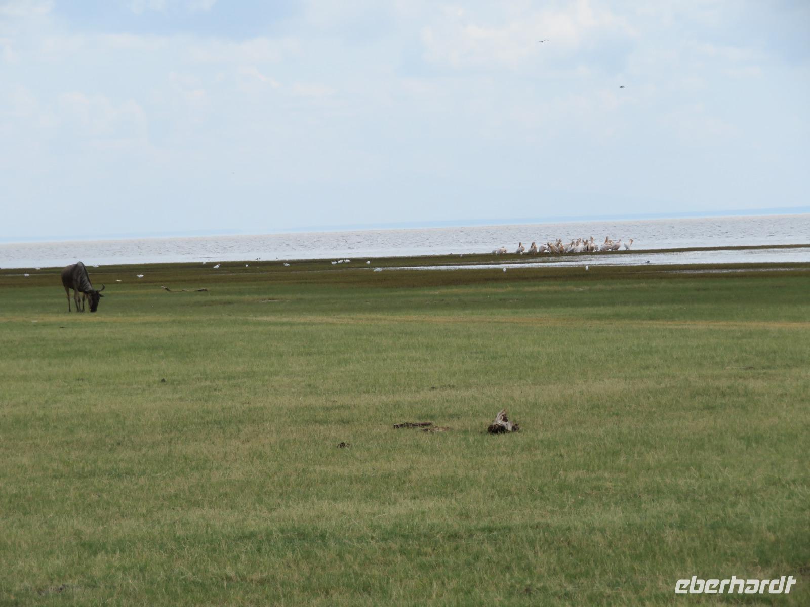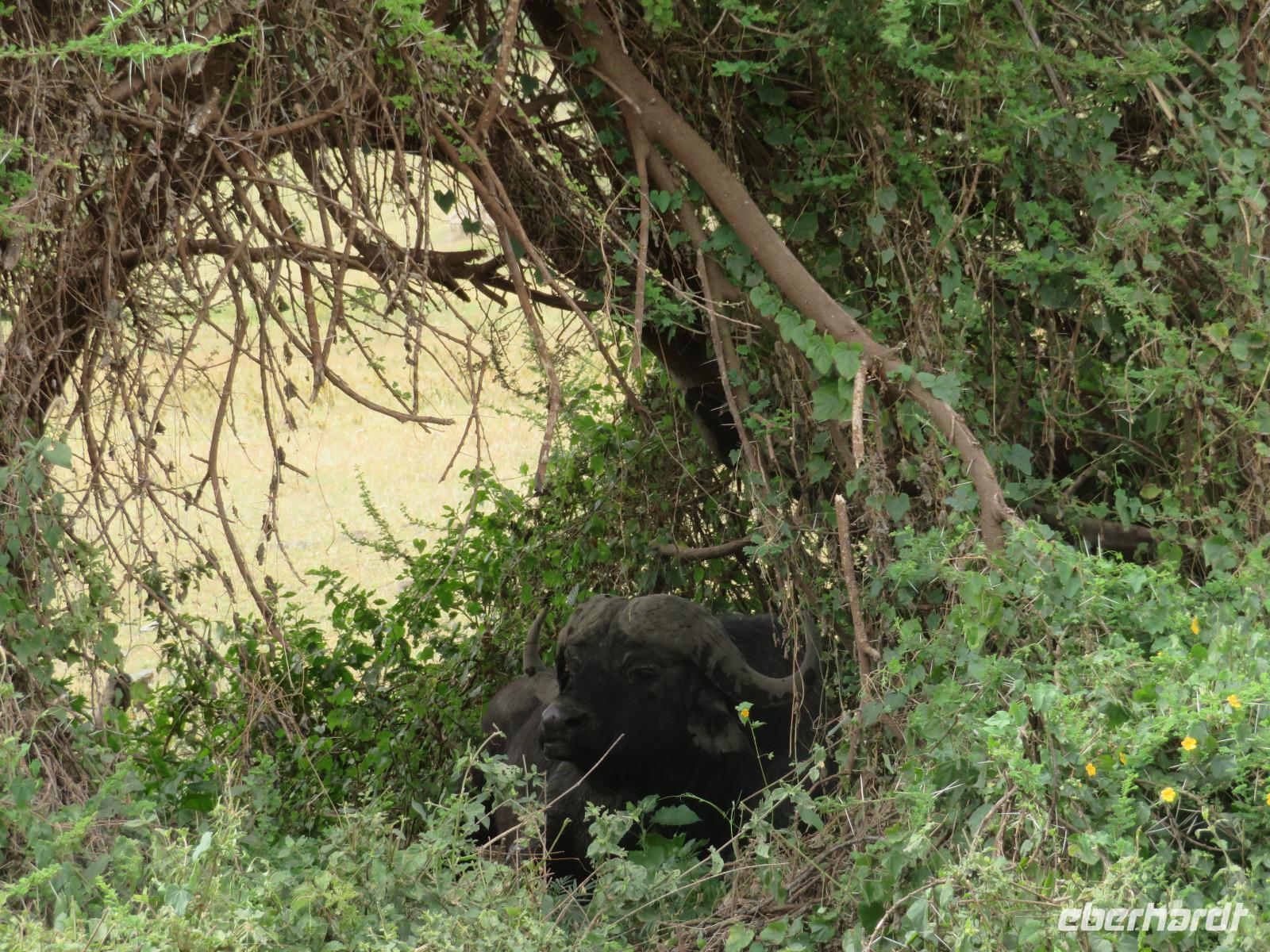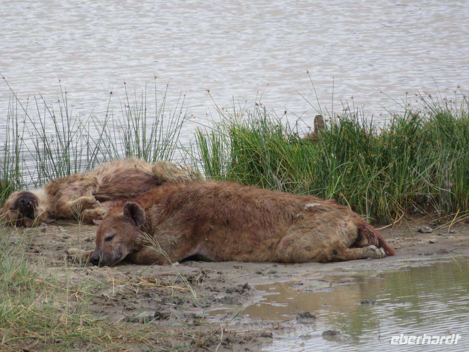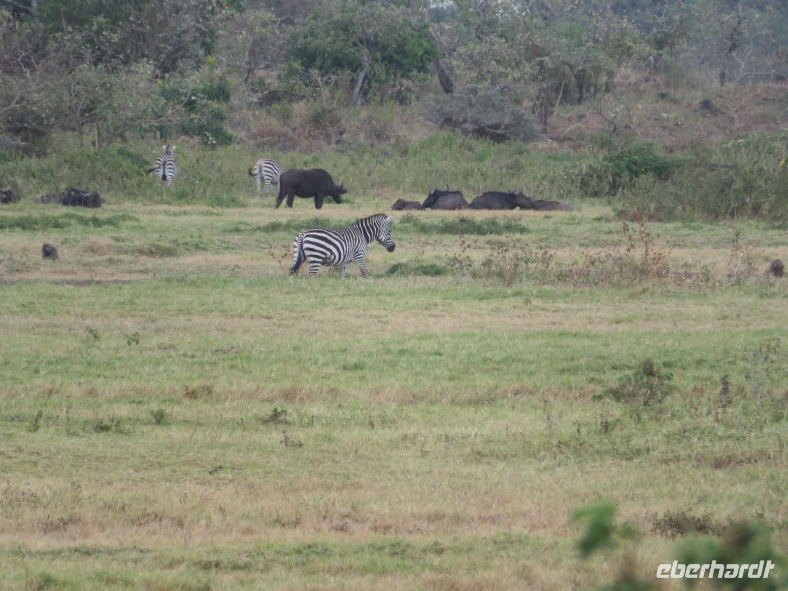 Am Morgen nehmen wir unser Frühstück recht zeitig ein und verlassen dann die wunderschöne Lodge. Unser heutiges Ziel ist zunächst der Lake Manyara-Nationalpark mit dem gleichnamigen See im Herzen des Gebietes. Unsere Fahrt geht erst auf der Hauptstraße entlang, bevor wir in Richtung Nationalpark abbiegen. Nach 35 Kilometern über eine Piste vorbei an kleinen Dörfern und Reisfeldern erreichen wir den Südeingang des Manyara-Nationalparks. Wir unternehmen eine Safarifahrt und sehen bereits am Anfang größere Gruppen von Meerkatzen und Pavianen. Uns begegnen Elefanten, Giraffen und die verschiedensten Vögel, wie zum Beispiel der Kingfisher mit seinem spitzen Schnabel, Geier und Flamingos. Am Ufer des Sees entdecken wir erstmals Gnus, die friedlich mit Zebras gemeinsam grasen. Pelikane und Flamingos bevölkern den See. Majestätisch erheben sich die riesigen Pelikane in die Lüfte und nutzen in großen Scharen die Thermik zum Fliegen - ein faszinierender Anblick. Gegen Mittag erreichen wir die heißen Quellen. Hier entspringt heißes Wasser, welches mit einer Temperatur von 40 - 60°C an die Oberfläche tritt und in den See fließt. Im Gebiet der Quelle und des Zuflusses haben sich spezielle Pflanzen und Bakterien entwickelt, die in diesem Wasser überleben können. Im Manyanasee befindet sich sowohl Süß- als auch Salzwasser. Wir sehen im See auch die ersten Nilpferde. Nachdem wir unsere Mittagspause am See mit gut gefüllten Lunchboxen von der Lodge beendet haben, fahren wir weiter durch den Park. Im dichten Wald sehen wir nur wenige Tiere. Eine Gruppe tobender und balgender junger Meerkatzen zieht uns aber noch in den Bann. Es macht riesigen Spaß, den kleinen Affen zuzuschauen. Am Ende unserer Tour dürfen wir aber noch einen absoluten Höhepunkt erleben: direkt am Rand der Piste sehen wir eine Löwin, die sich redlich müht, einen toten Büffel ins Gebüsch zu ziehen. Beim genauen Hinschauen, entdecken wir gut versteckt im Dickicht eine weitere Löwin und drei junge Löwen. Diese tollen im Gebüsch und versuchen sich auch am Büffel etwas zu holen. Ein einzigartiges Erlebnis, so nah an die Löwen zu kommen. Unser Fahrer vermutet, dass der Büffel in der Nacht von den Löwinnen getötet worden ist und sie diesen nun für ihre Jungen ins Gebüsch holen möchte, damit sich nicht noch andere daran bedienen. Wir sind fasziniert und eine tolle Pirsch mit unendlich vielen Fotos geht für uns zu Ende. Anschließend statten wir der Afrikan Art Gallery noch einen Besuch ab. In dem großzügigen Einkaufszentrum wird eine Vielzahl an Volkskunstartikeln und Souvenirs angeboten. Nun fahren wir zu unserer Lodge. Die Straße zur Endoro Lodge fordert nochmals das ganze Können unserer Fahrer. Dieses Mal sind unsere Zimmer Chalets, die an einem Berghang gebaut sind. Wir bedienen uns am reichhaltigen Buffet und lassen den Tag ausklingen.