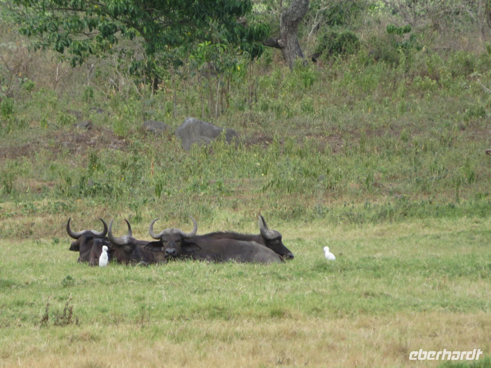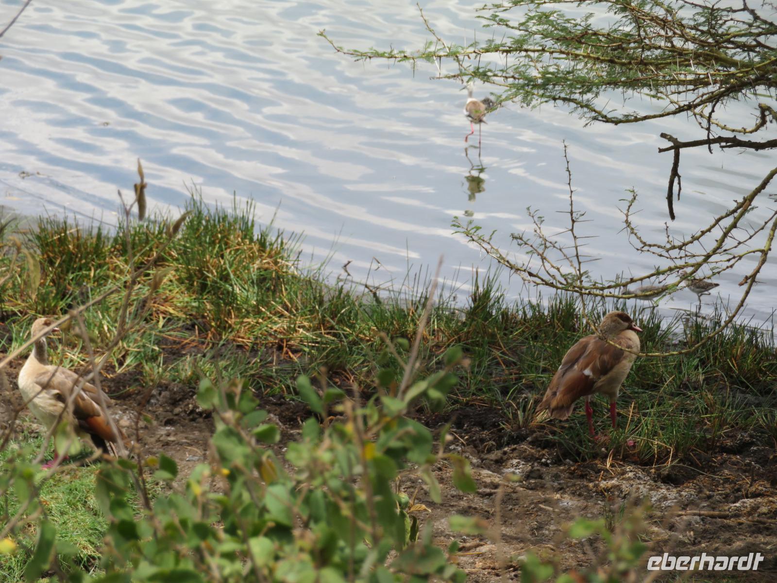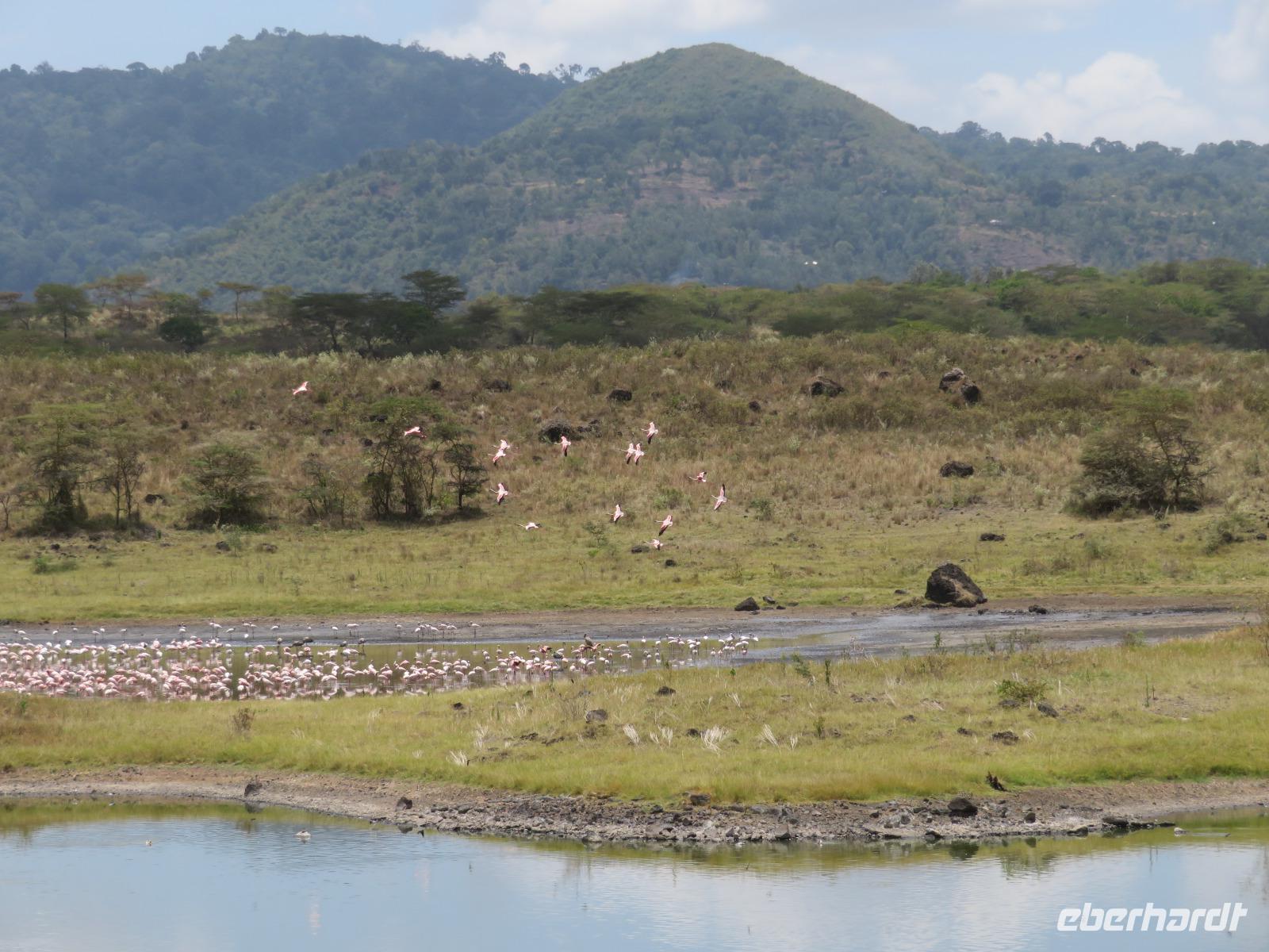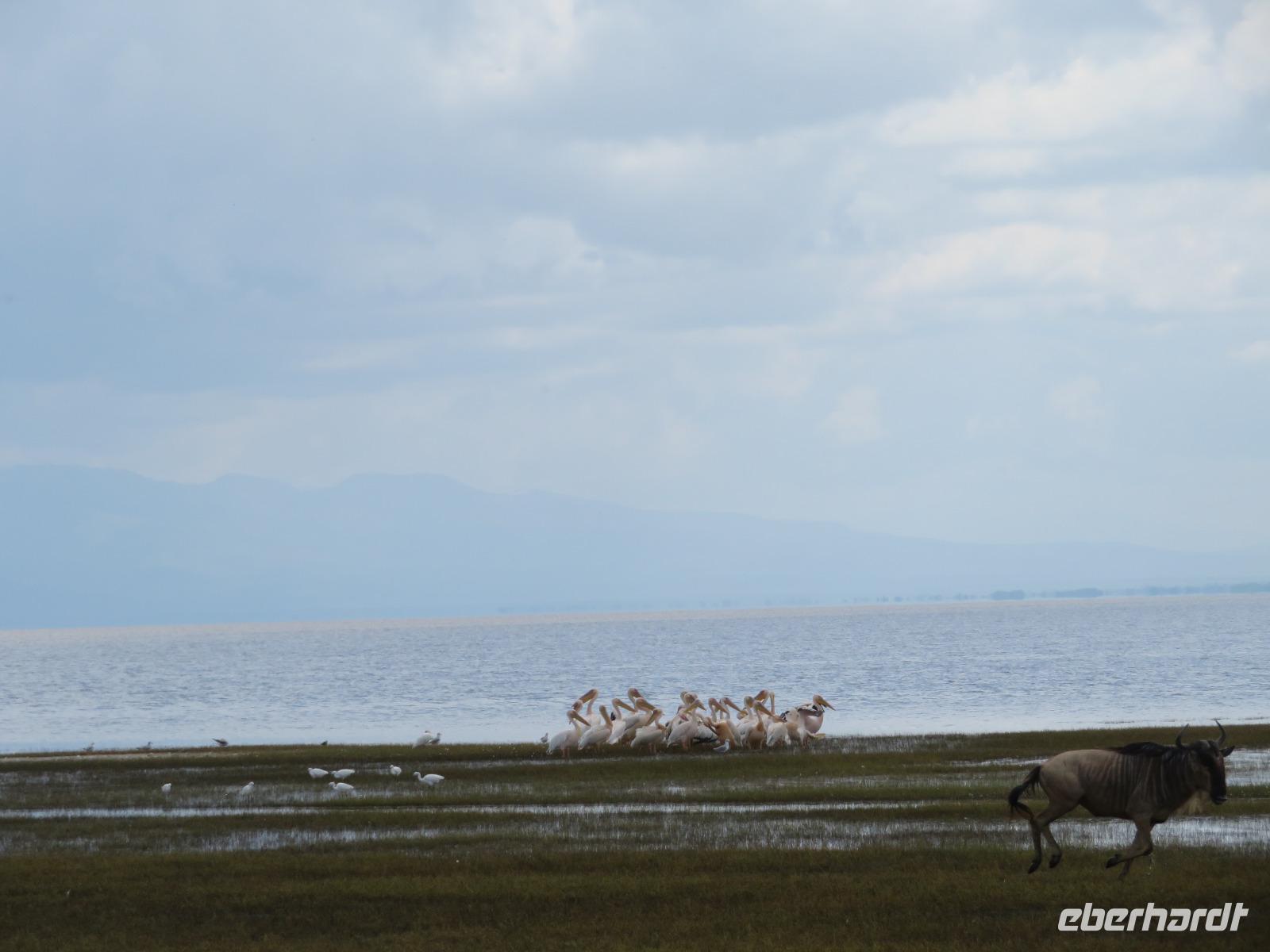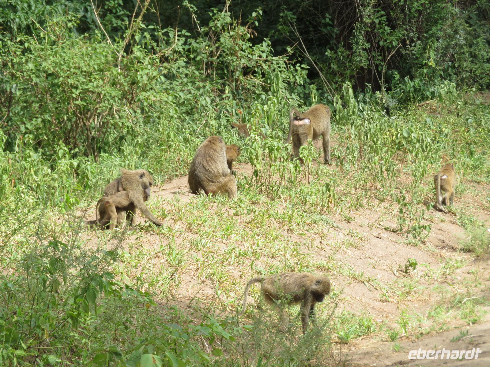 Am Morgen nehmen wir unser Frühstück recht zeitig ein und verlassen dann die wunderschöne Lodge. Unser heutiges Ziel ist zunächst der Lake Manyara-Nationalpark mit dem gleichnamigen See im Herzen des Gebietes. Unsere Fahrt geht erst auf der Hauptstraße entlang, bevor wir in Richtung Nationalpark abbiegen. Nach 35 Kilometern über eine Piste vorbei an kleinen Dörfern und Reisfeldern erreichen wir den Südeingang des Manyara-Nationalparks. Wir unternehmen eine Safarifahrt und sehen bereits am Anfang größere Gruppen von Meerkatzen und Pavianen. Uns begegnen Elefanten, Giraffen und die verschiedensten Vögel, wie zum Beispiel der Kingfisher mit seinem spitzen Schnabel, Geier und Flamingos. Am Ufer des Sees entdecken wir erstmals Gnus, die friedlich mit Zebras gemeinsam grasen. Pelikane und Flamingos bevölkern den See. Majestätisch erheben sich die riesigen Pelikane in die Lüfte und nutzen in großen Scharen die Thermik zum Fliegen - ein faszinierender Anblick. Gegen Mittag erreichen wir die heißen Quellen. Hier entspringt heißes Wasser, welches mit einer Temperatur von 40 - 60°C an die Oberfläche tritt und in den See fließt. Im Gebiet der Quelle und des Zuflusses haben sich spezielle Pflanzen und Bakterien entwickelt, die in diesem Wasser überleben können. Im Manyanasee befindet sich sowohl Süß- als auch Salzwasser. Wir sehen im See auch die ersten Nilpferde. Nachdem wir unsere Mittagspause am See mit gut gefüllten Lunchboxen von der Lodge beendet haben, fahren wir weiter durch den Park. Im dichten Wald sehen wir nur wenige Tiere. Eine Gruppe tobender und balgender junger Meerkatzen zieht uns aber noch in den Bann. Es macht riesigen Spaß, den kleinen Affen zuzuschauen. Am Ende unserer Tour dürfen wir aber noch einen absoluten Höhepunkt erleben: direkt am Rand der Piste sehen wir eine Löwin, die sich redlich müht, einen toten Büffel ins Gebüsch zu ziehen. Beim genauen Hinschauen, entdecken wir gut versteckt im Dickicht eine weitere Löwin und drei junge Löwen. Diese tollen im Gebüsch und versuchen sich auch am Büffel etwas zu holen. Ein einzigartiges Erlebnis, so nah an die Löwen zu kommen. Unser Fahrer vermutet, dass der Büffel in der Nacht von den Löwinnen getötet worden ist und sie diesen nun für ihre Jungen ins Gebüsch holen möchte, damit sich nicht noch andere daran bedienen. Wir sind fasziniert und eine tolle Pirsch mit unendlich vielen Fotos geht für uns zu Ende. Anschließend statten wir der Afrikan Art Gallery noch einen Besuch ab. In dem großzügigen Einkaufszentrum wird eine Vielzahl an Volkskunstartikeln und Souvenirs angeboten. Nun fahren wir zu unserer Lodge. Die Straße zur Endoro Lodge fordert nochmals das ganze Können unserer Fahrer. Dieses Mal sind unsere Zimmer Chalets, die an einem Berghang gebaut sind. Wir bedienen uns am reichhaltigen Buffet und lassen den Tag ausklingen.