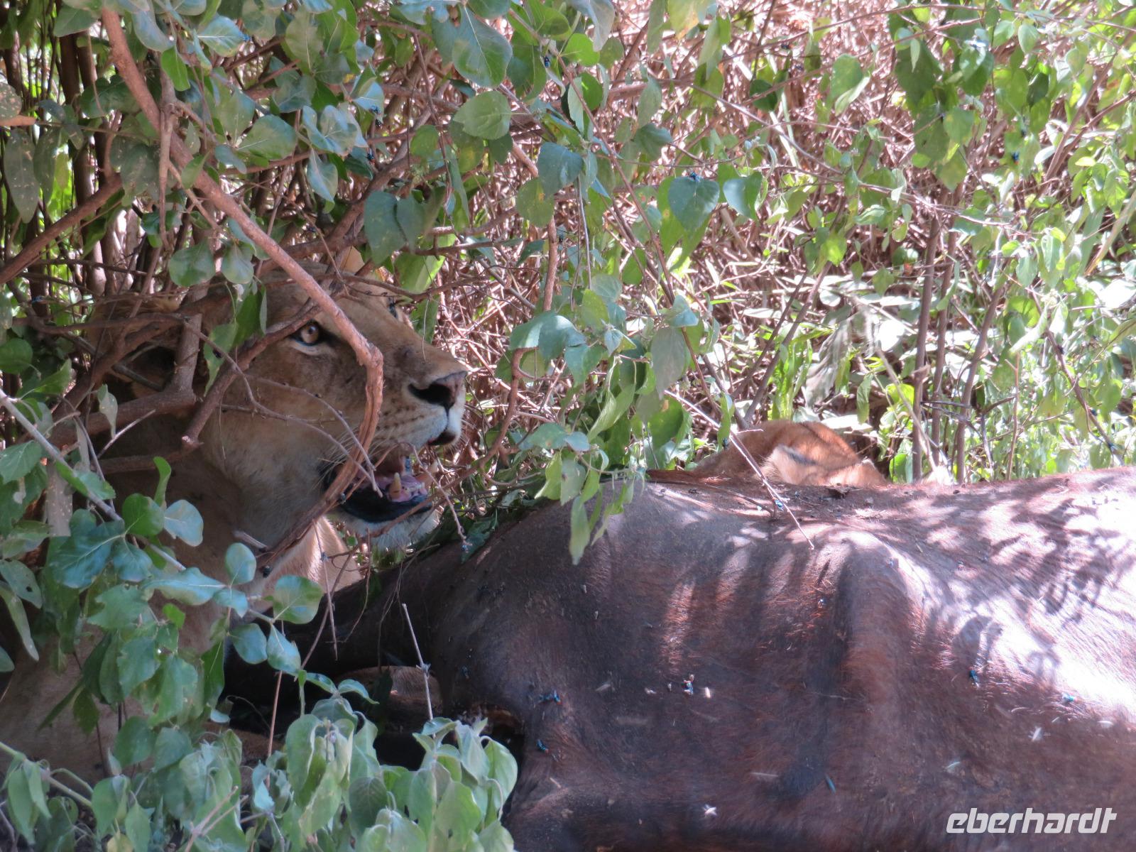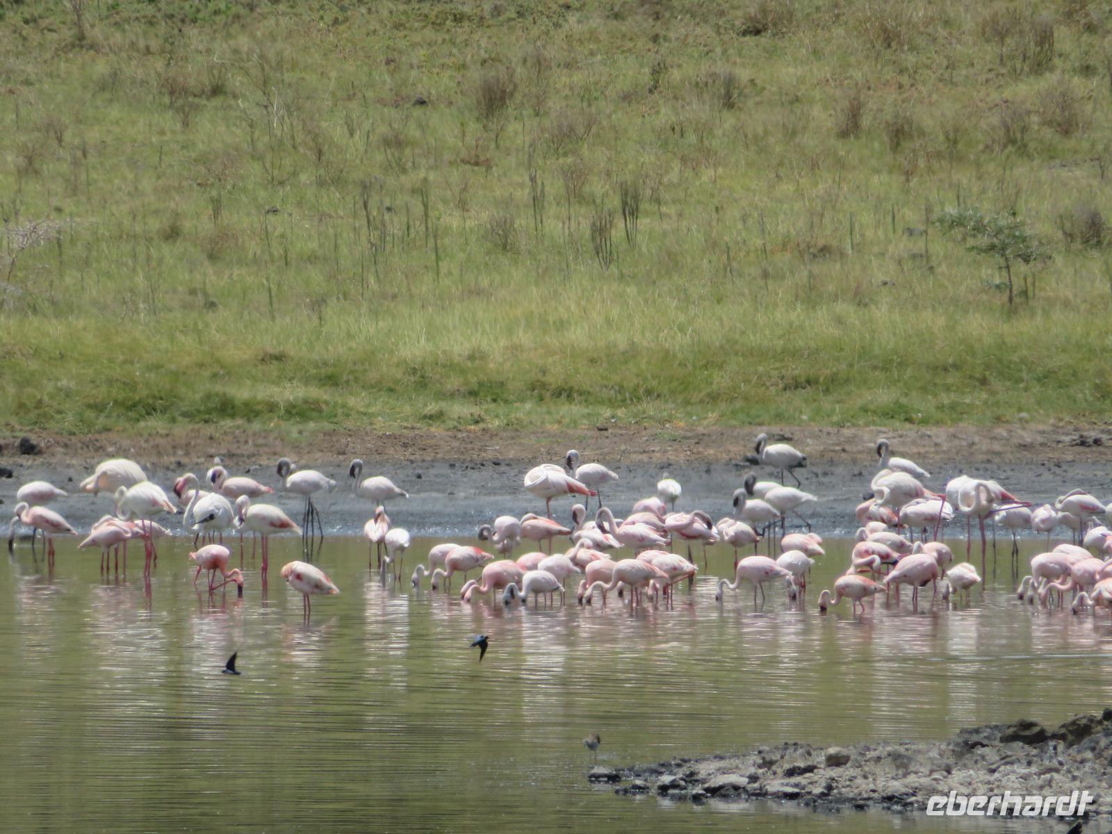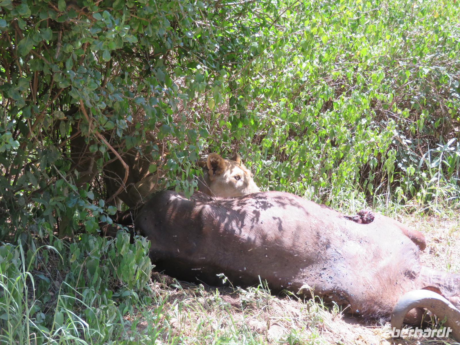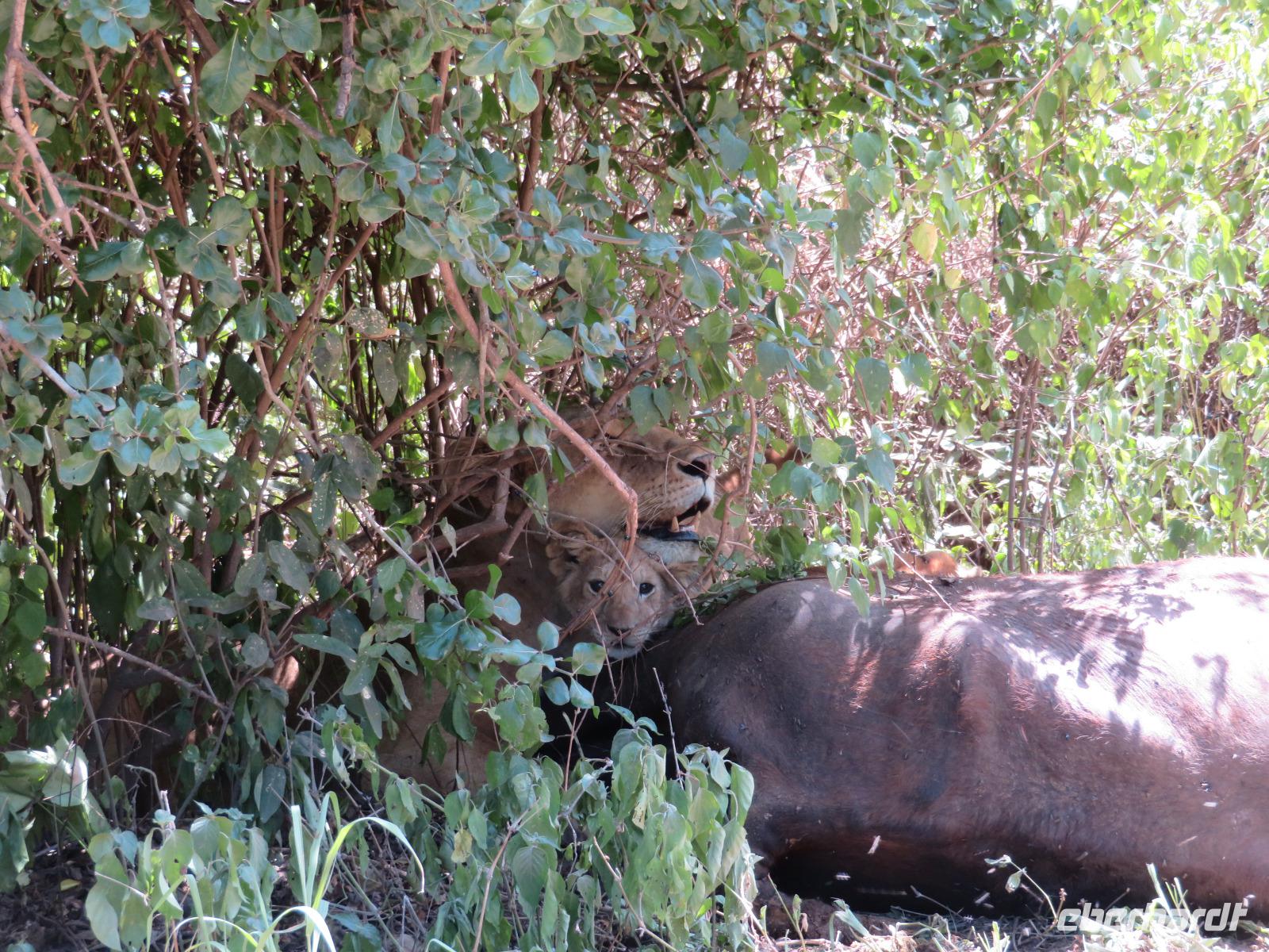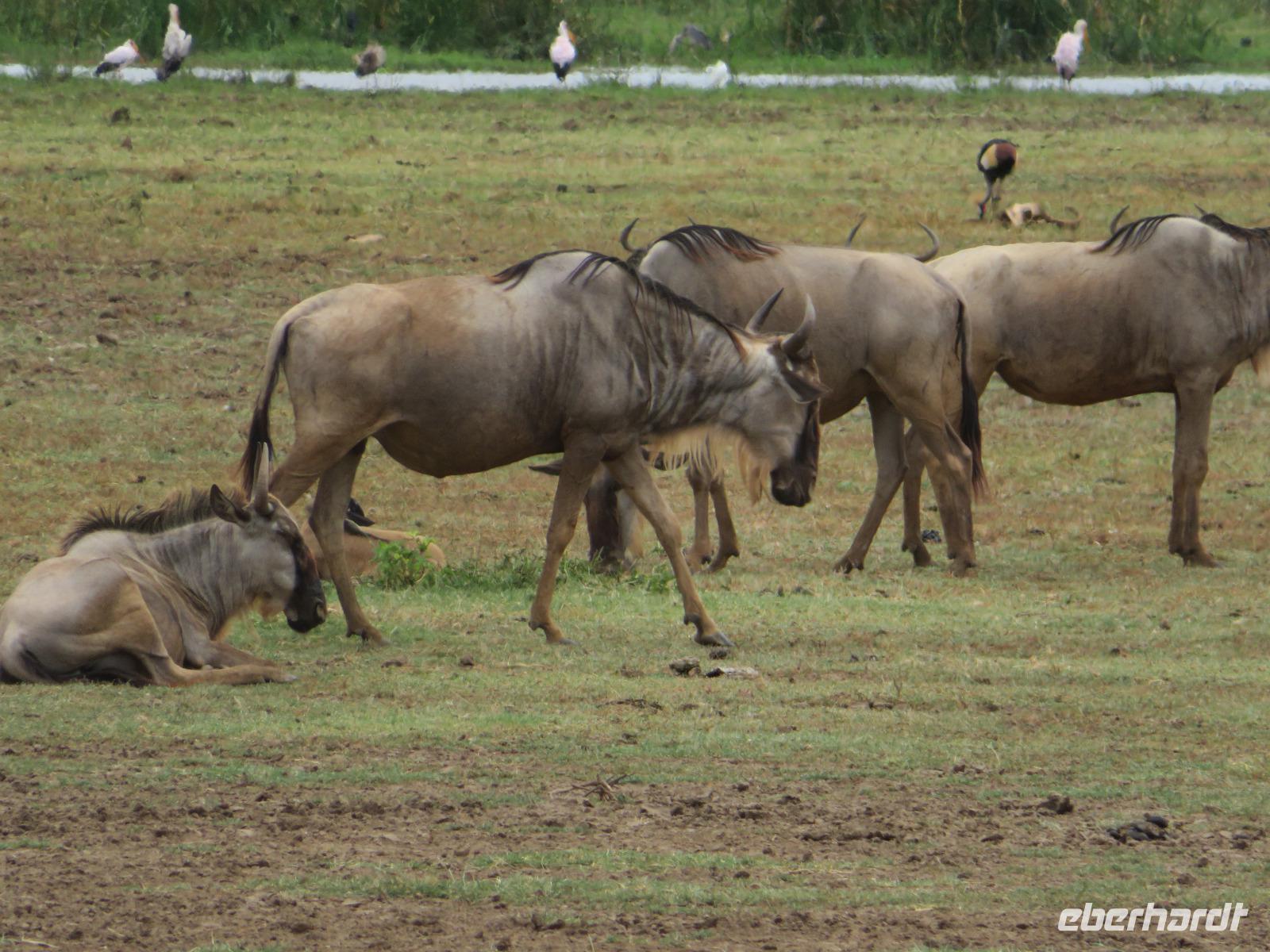 Am Morgen nehmen wir unser Frühstück recht zeitig ein und verlassen dann die wunderschöne Lodge. Unser heutiges Ziel ist zunächst der Lake Manyara-Nationalpark mit dem gleichnamigen See im Herzen des Gebietes. Unsere Fahrt geht erst auf der Hauptstraße entlang, bevor wir in Richtung Nationalpark abbiegen. Nach 35 Kilometern über eine Piste vorbei an kleinen Dörfern und Reisfeldern erreichen wir den Südeingang des Manyara-Nationalparks. Wir unternehmen eine Safarifahrt und sehen bereits am Anfang größere Gruppen von Meerkatzen und Pavianen. Uns begegnen Elefanten, Giraffen und die verschiedensten Vögel, wie zum Beispiel der Kingfisher mit seinem spitzen Schnabel, Geier und Flamingos. Am Ufer des Sees entdecken wir erstmals Gnus, die friedlich mit Zebras gemeinsam grasen. Pelikane und Flamingos bevölkern den See. Majestätisch erheben sich die riesigen Pelikane in die Lüfte und nutzen in großen Scharen die Thermik zum Fliegen - ein faszinierender Anblick. Gegen Mittag erreichen wir die heißen Quellen. Hier entspringt heißes Wasser, welches mit einer Temperatur von 40 - 60°C an die Oberfläche tritt und in den See fließt. Im Gebiet der Quelle und des Zuflusses haben sich spezielle Pflanzen und Bakterien entwickelt, die in diesem Wasser überleben können. Im Manyanasee befindet sich sowohl Süß- als auch Salzwasser. Wir sehen im See auch die ersten Nilpferde. Nachdem wir unsere Mittagspause am See mit gut gefüllten Lunchboxen von der Lodge beendet haben, fahren wir weiter durch den Park. Im dichten Wald sehen wir nur wenige Tiere. Eine Gruppe tobender und balgender junger Meerkatzen zieht uns aber noch in den Bann. Es macht riesigen Spaß, den kleinen Affen zuzuschauen. Am Ende unserer Tour dürfen wir aber noch einen absoluten Höhepunkt erleben: direkt am Rand der Piste sehen wir eine Löwin, die sich redlich müht, einen toten Büffel ins Gebüsch zu ziehen. Beim genauen Hinschauen, entdecken wir gut versteckt im Dickicht eine weitere Löwin und drei junge Löwen. Diese tollen im Gebüsch und versuchen sich auch am Büffel etwas zu holen. Ein einzigartiges Erlebnis, so nah an die Löwen zu kommen. Unser Fahrer vermutet, dass der Büffel in der Nacht von den Löwinnen getötet worden ist und sie diesen nun für ihre Jungen ins Gebüsch holen möchte, damit sich nicht noch andere daran bedienen. Wir sind fasziniert und eine tolle Pirsch mit unendlich vielen Fotos geht für uns zu Ende. Anschließend statten wir der Afrikan Art Gallery noch einen Besuch ab. In dem großzügigen Einkaufszentrum wird eine Vielzahl an Volkskunstartikeln und Souvenirs angeboten. Nun fahren wir zu unserer Lodge. Die Straße zur Endoro Lodge fordert nochmals das ganze Können unserer Fahrer. Dieses Mal sind unsere Zimmer Chalets, die an einem Berghang gebaut sind. Wir bedienen uns am reichhaltigen Buffet und lassen den Tag ausklingen.