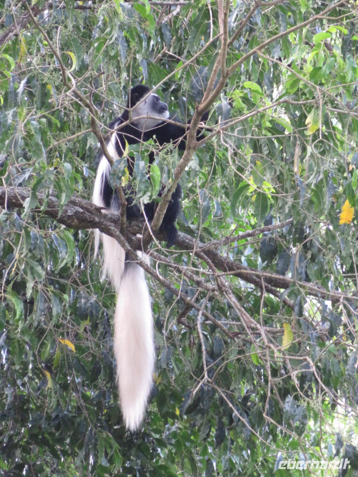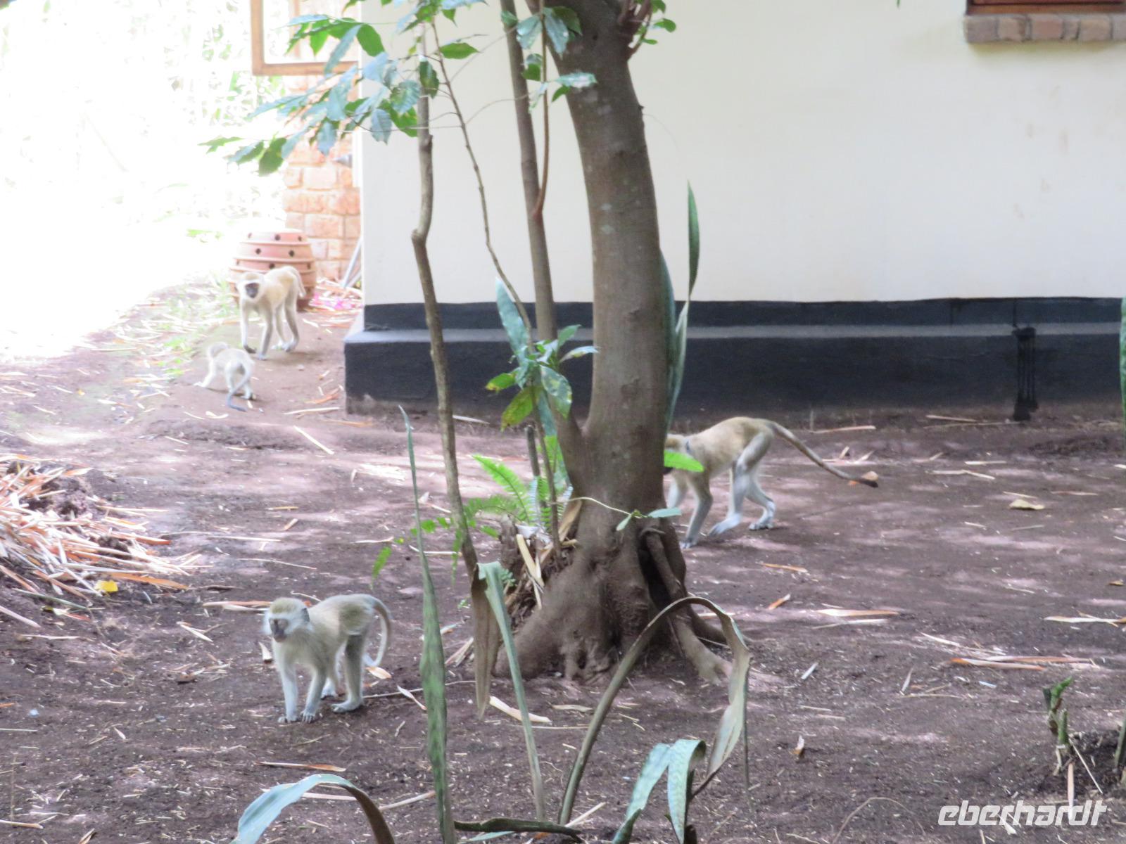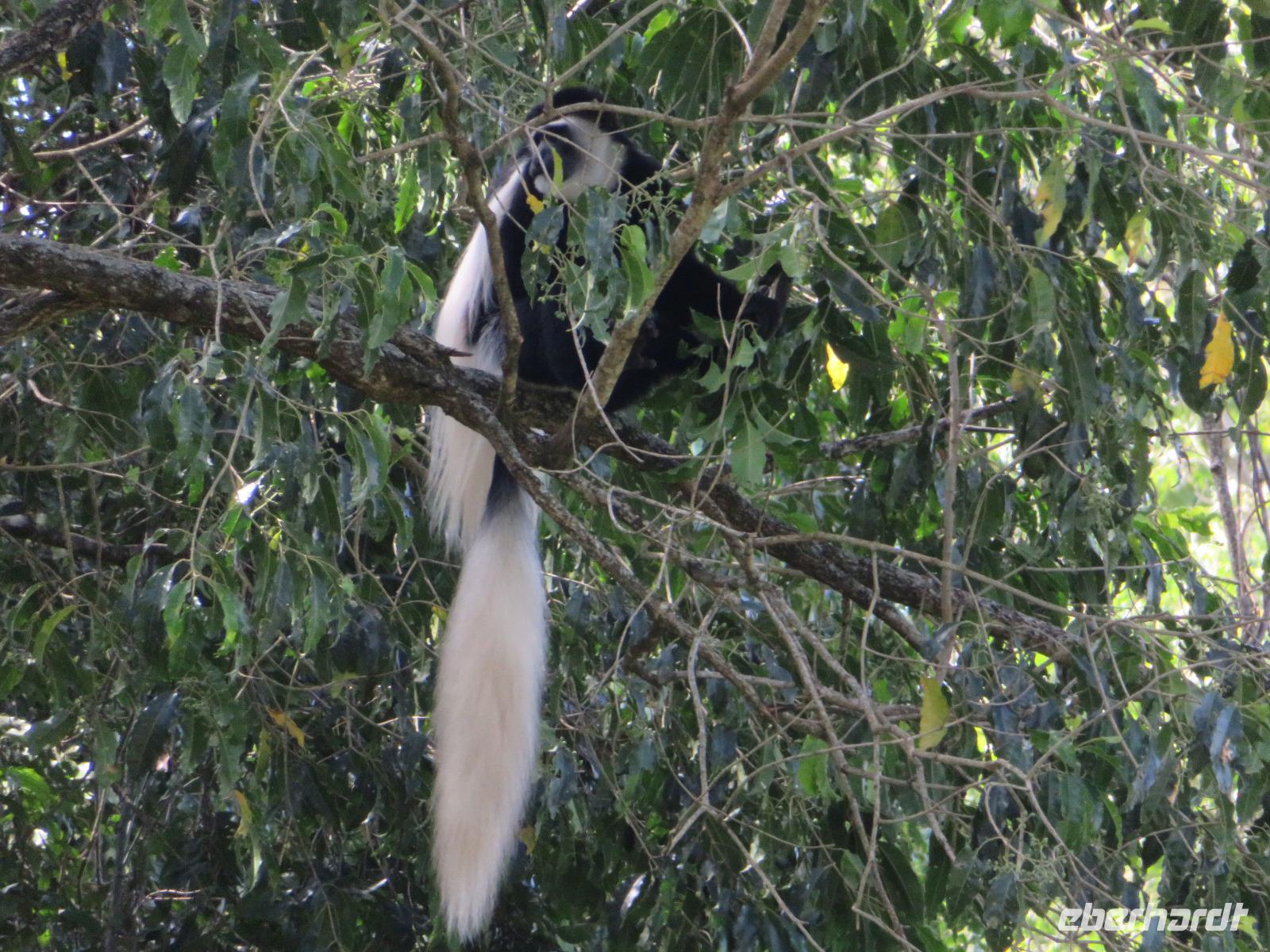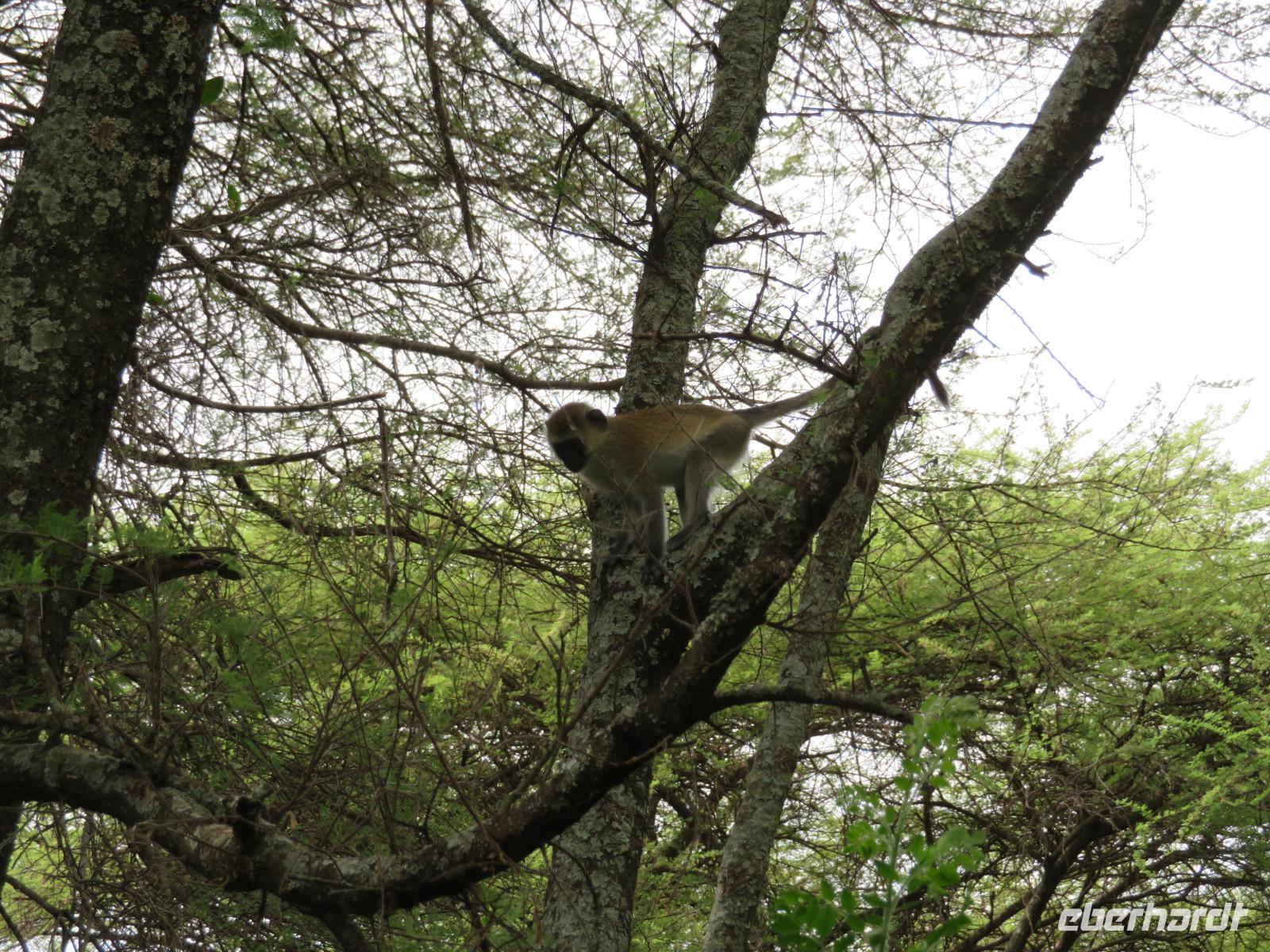 Ab heute fahren wir in zwei Jeeps. Unser erstes Ziel ist der Arusha-Nationalpark. Er ist mit 135 km² einer der kleineren Nationalparks Tansanias wurde aber bereits 1907 gegründet. Der Weg führt uns durch eine abwechslungsreiche Landschaft aus Savannen und Bergwäldern. Wir fahren zunächst zum Aussichtspunkt oberhalb des Ngurudoto Kraters. Dabei entdecken wir erstmals Paviane. Vom Aussichtspunkt sehen wir den Krater und Kafferbüffel. Weiter führt uns unsere Tour durch den Park. Wir beobachten die beeindruckenden schwarz-weißen Colobus-Affen. Ihre dicken weißen Schwänze sind weithin sichtbar im dichten Geäst der Bäume. Ganz in der Nähe turnen Meerkatzen, eine weitere Affenart durch die Wipfel der Bäume. Auf unserer weiteren Pirsch begegnen uns Giraffen, Buschböcke und Warzenschweine. Unsere Tour führt uns zu den Momella-Seen. Hier entdecken wir Scharen von Flamingos. Wir sehen die ägyptische Wasserganz und weitere Wasservögel. Am späten Mittag fahren wir zu einem Gate und nehmen das Mittag aus unseren Lunchboxen, welche uns das nette Personal unserer Lodge mitgegeben hat. Beim Aussteigen aus dem Jeep kommt gleich ein frecher Pavian und klaut eine Lunchbox. Zum Glück schreiten unsere Driver-Guides ein uns so erwischt er nur ein belegtes Brötchen. Anschließend kehren wir zur Lodge zurück. Dabei entdecken wir noch Buschböcke und wieder Meerkatzen und Colobus-Affen. Bis zum Abendessen bleibt noch etwas Zeit zum Entspannen.