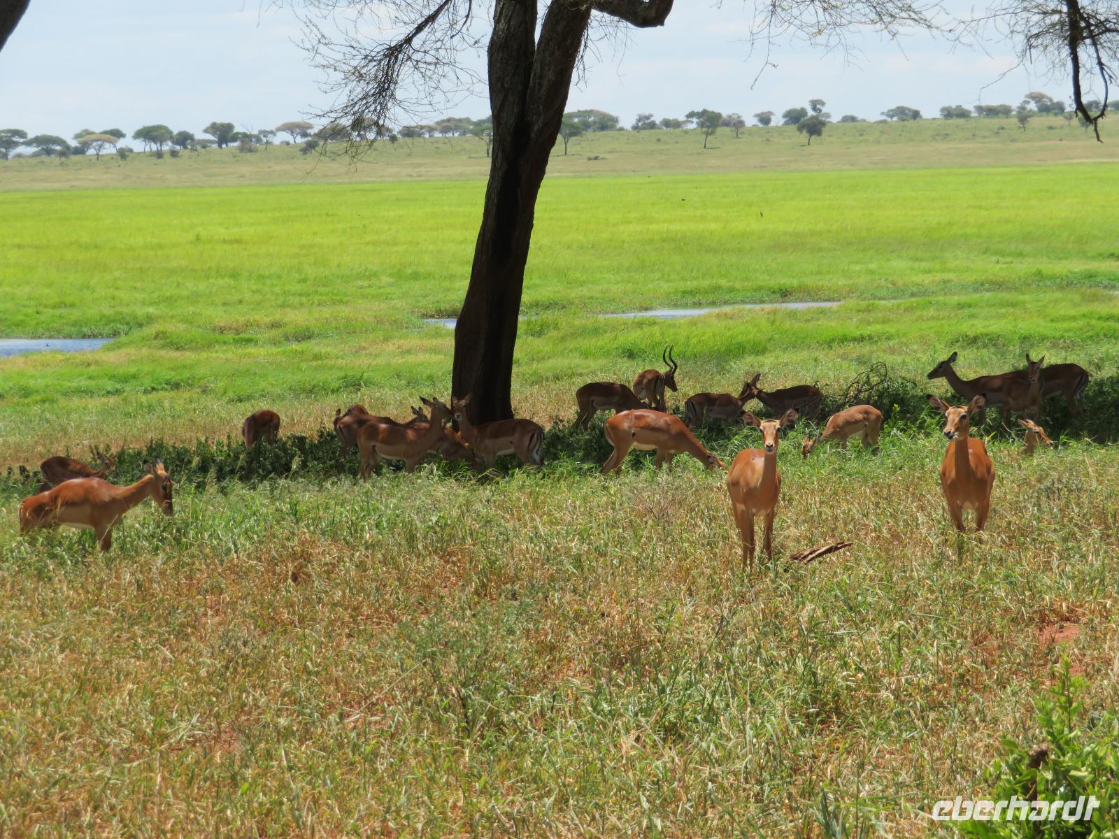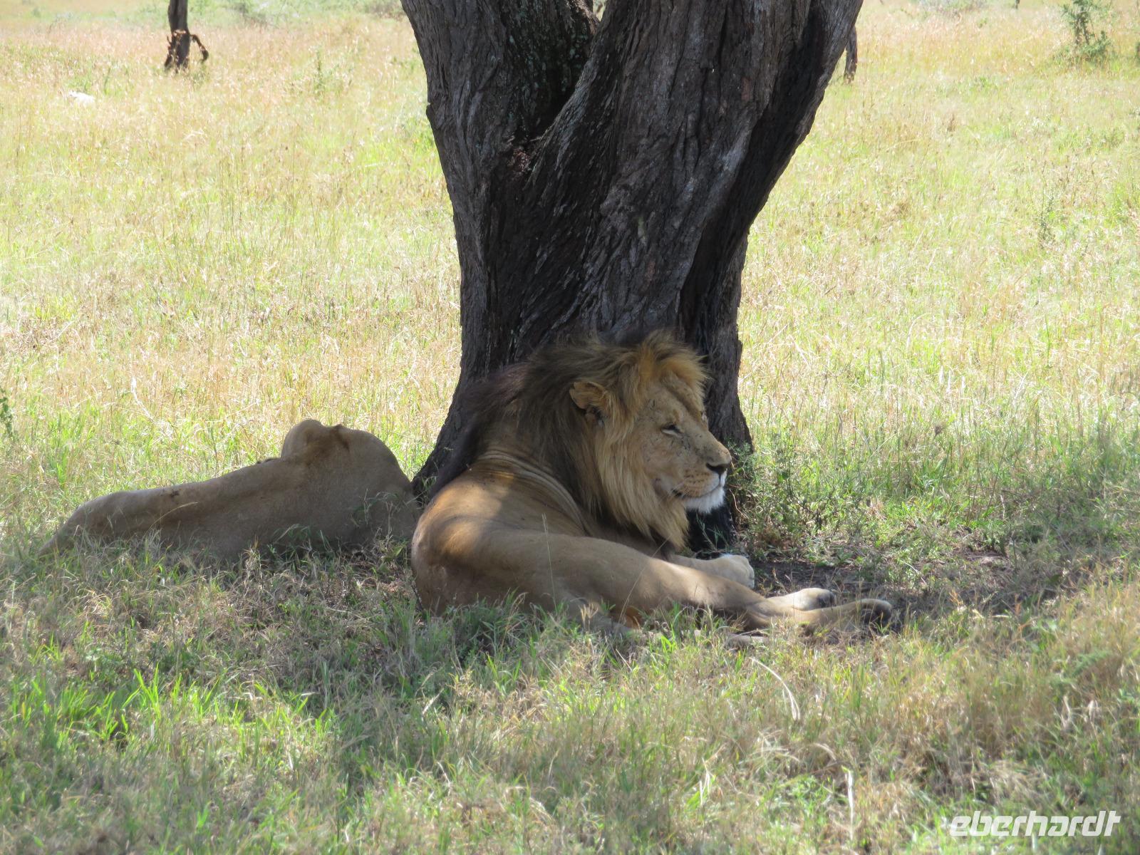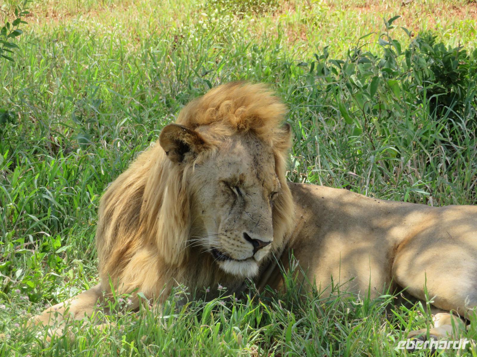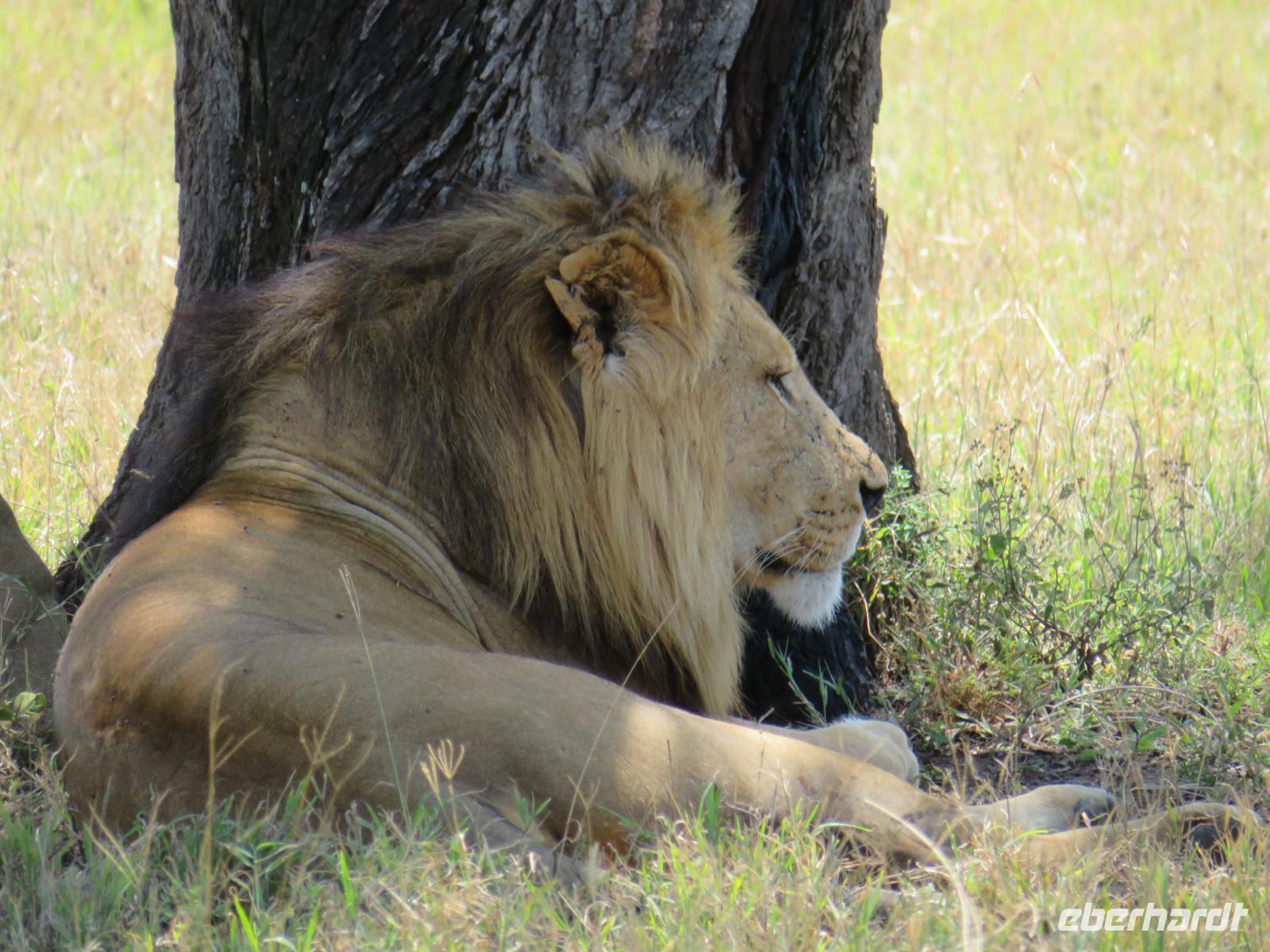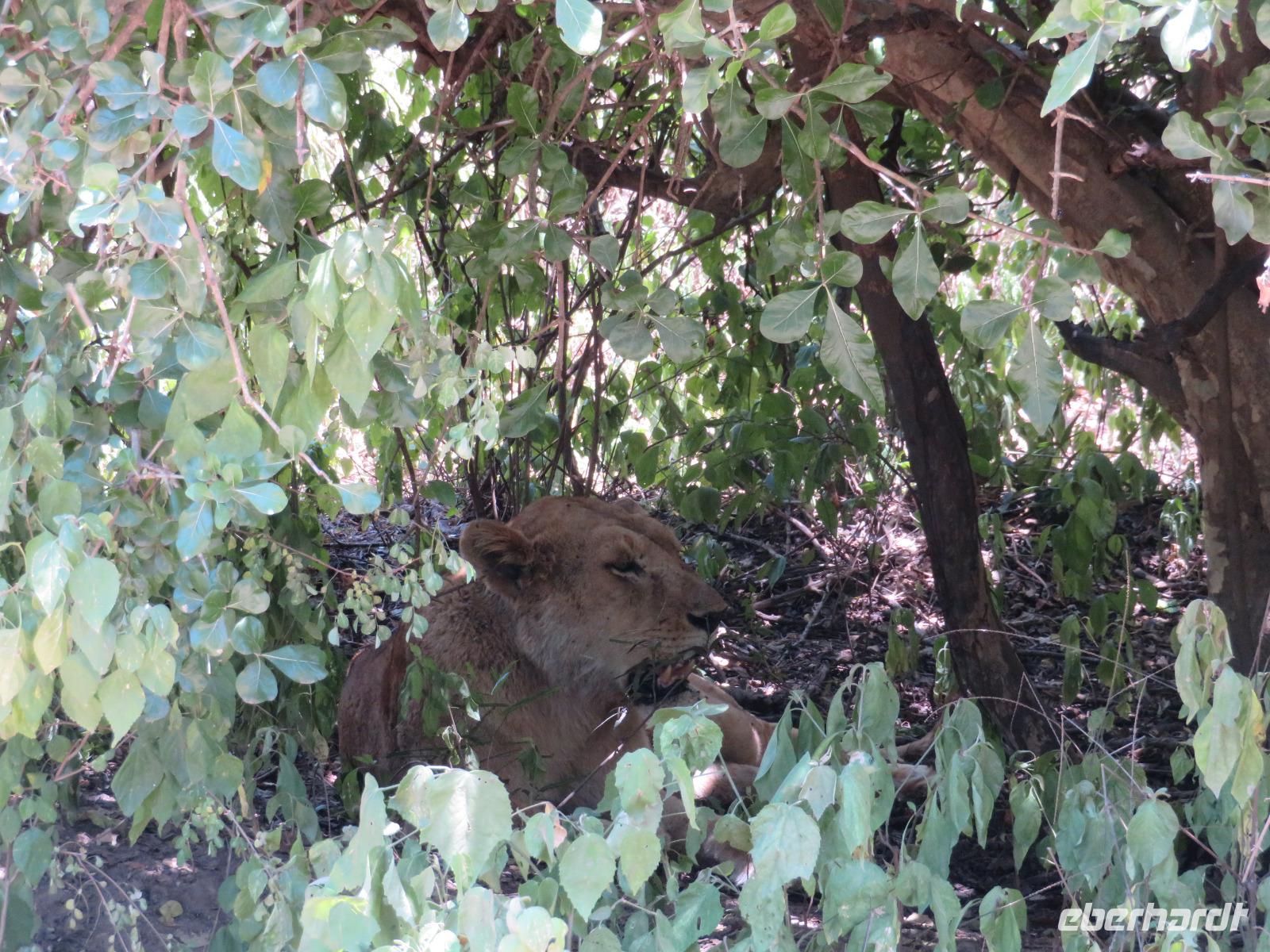 Wir haben die Nacht alle gut verbracht und starten gut gelaunt in den neuen Tag. Nach einem zeitigen Frühstück starten wir zur nächsten Pirschfahrt in den Park. Gleich zu Beginn begegnen uns wieder Impalas und Wasserböcke. Uns beeindrucken aber auch die riesigen Baobab-Bäume. Diese können bis zu 2.500 Jahre alt werden und sind sehr imposant. Leider sehen wir zunächst nur verschiedene Vögel, wie Kronenkraniche, Adler, Gaukler und Glanzstare. Die großen Tiere lassen noch auf sich warten. Doch bald sehen wir Giraffen und Strauße. Kleine, ganz reizend aussehende Dikdiks, die kleinste Antilopenart, kreuzen unseren Weg. Und auch einen Springschliefer, eine seltene kleine Antilopenart entdecken wir auf einem Stein. Plötzlich hören wir regen Funkverkehr zwischen den Rangern von verschiedenen Fahrzeugen. Nach einer kurzen Toiletten-Pause geht die Fahrt nun etwas zügiger. Irgendetwas haben die Ranger entdeckt. Wir lassen Giraffen, Sträuße und verschiedene Vögel erst mal links liegen. Am Rand des großen Sumpfgebietes des Tranagire- Nationalparks haben die Ranger Löwen entdeckt. Drei stattliche Löwenherren - vermutlich Brüder - liegen in der Sonne und dösen vor sich hin. Wir können bis auf wenige Meter an den König der Tiere ranfahren. Vermutlich haben sie am Morgen eine Antilope gerissen und sind nun satt. Ein tolles Erlebnis mit wunderschönen Bildern. Nun geht es zurück und wir beobachten dabei noch Hornvögel, Störche und Zebramangusten. Am Picknickplatz mit herrlicher Aussicht über das große Sumpfgebiet zaubern unsere beiden Fahrer ein vorzügliches Mittagessen aus dem Auto. Die Küchencrew der Lodge hatte uns ein wunderbares Menü mitgegeben. Dieses wurde uns stilecht mit Tischdecke und Geschirr serviert. Wir waren begeistert. Gut gestärkt treten wir nun die Rückfahrt Richtung Lodge an. Unterwegs sehen wir nochmals Giraffen, Zebras und immer wieder auch Impalas und Warzenschweine. Kurz vor dem Verlassen des Parks stoßen wir auf eine Elefantenmama mit ihren Kindern. Wunderschön war es anzusehen, wie diese imposanten Tiere mit ihren großen Ohren schlagen und sich damit Kühlung verschaffen. Zum Abschluss sehen wir eine ganze Familie blauer Meerkatzen durch die Bäume toben. Wir sind uns einig: es war eine herrliche Pirschfahrt, auch wenn wir in der Mittagszeit nicht allzu viele Tiere gesehen haben. Bis zum Abendessen blieb noch Zeit für eine Abkühlung im Pool oder einfach zum Genießen der herrlichen Landschaft von der Terrasse der Zelte aus.