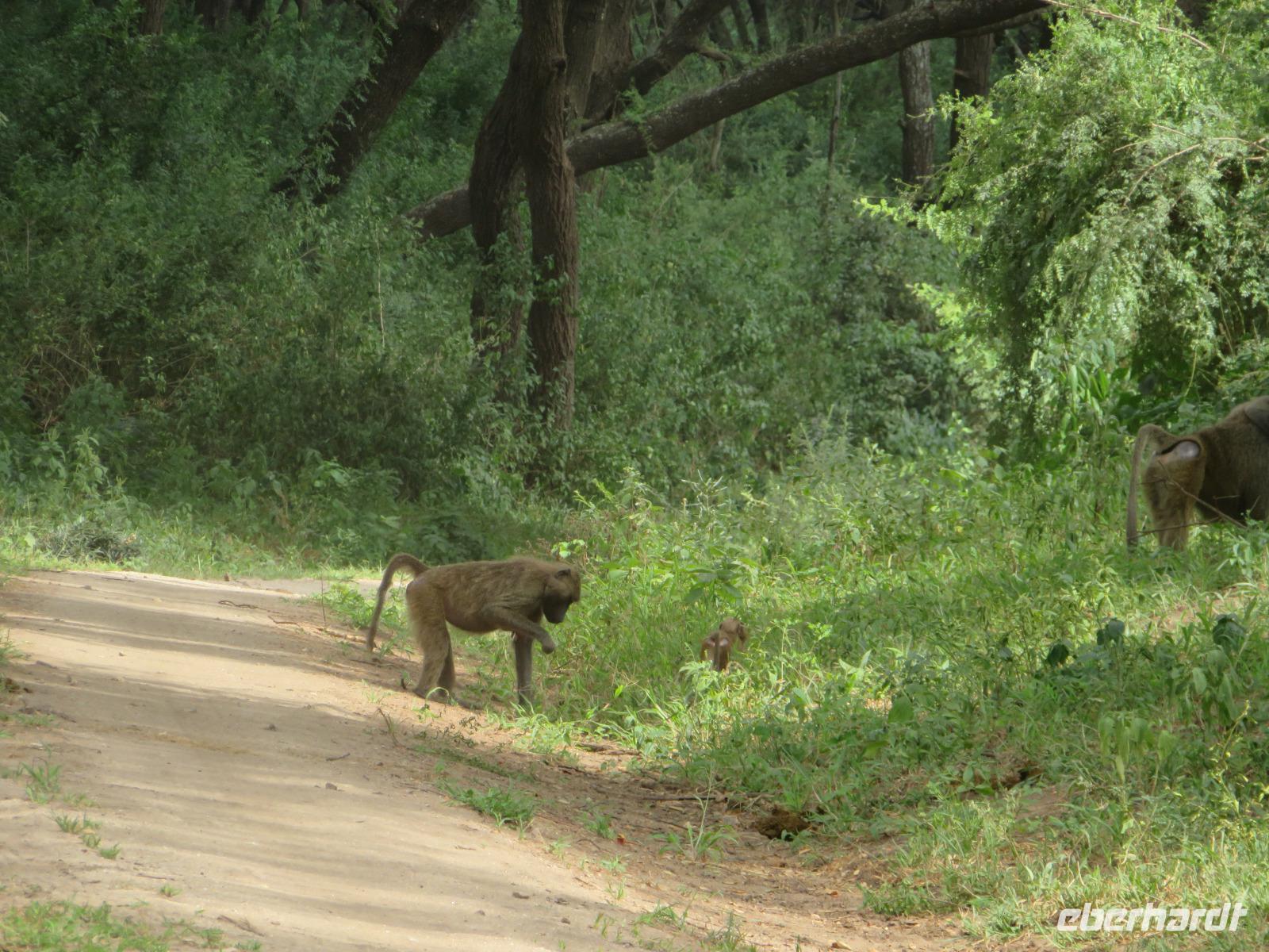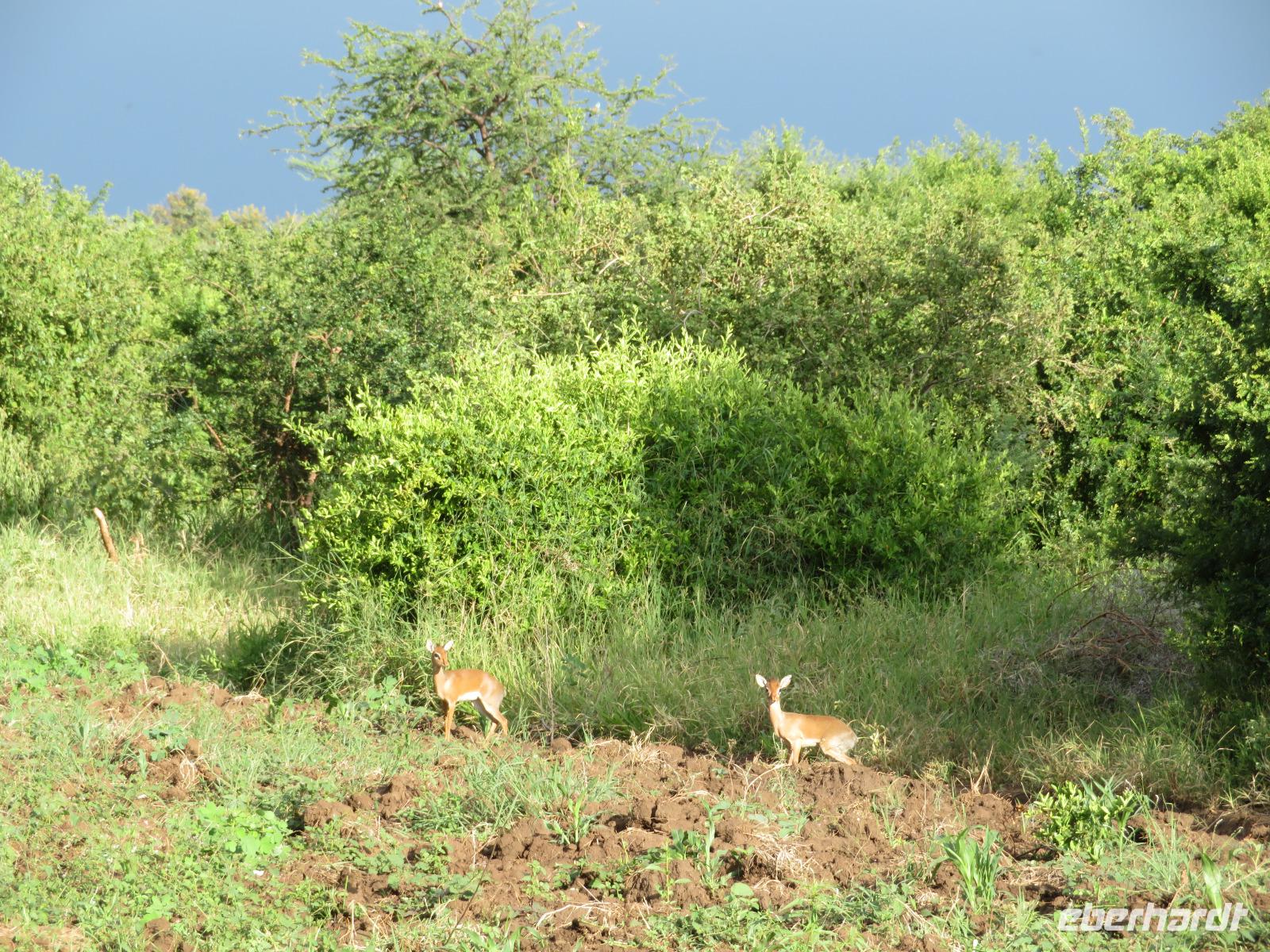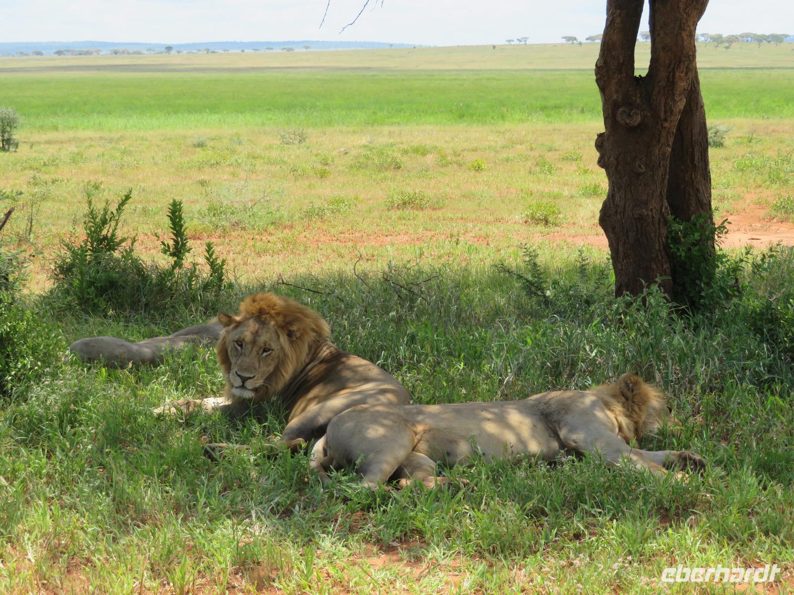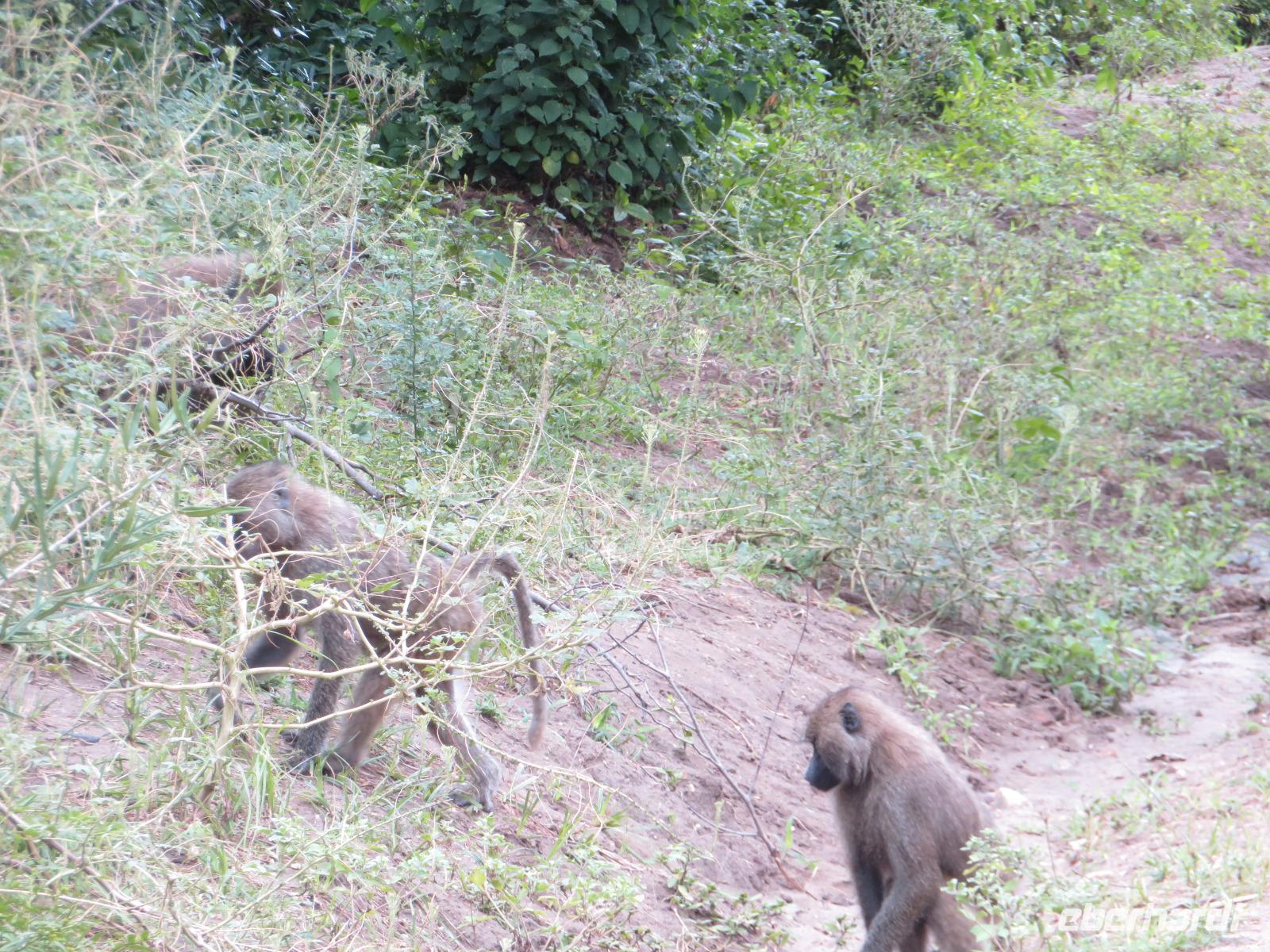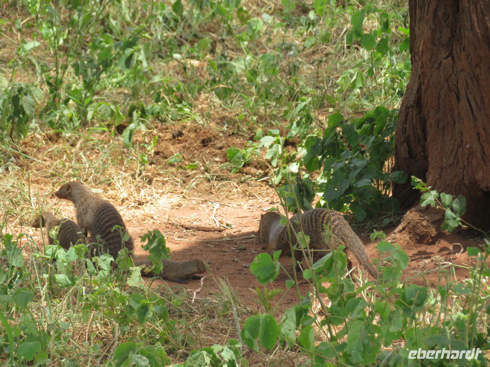 Wir haben die Nacht alle gut verbracht und starten gut gelaunt in den neuen Tag. Nach einem zeitigen Frühstück starten wir zur nächsten Pirschfahrt in den Park. Gleich zu Beginn begegnen uns wieder Impalas und Wasserböcke. Uns beeindrucken aber auch die riesigen Baobab-Bäume. Diese können bis zu 2.500 Jahre alt werden und sind sehr imposant. Leider sehen wir zunächst nur verschiedene Vögel, wie Kronenkraniche, Adler, Gaukler und Glanzstare. Die großen Tiere lassen noch auf sich warten. Doch bald sehen wir Giraffen und Strauße. Kleine, ganz reizend aussehende Dikdiks, die kleinste Antilopenart, kreuzen unseren Weg. Und auch einen Springschliefer, eine seltene kleine Antilopenart entdecken wir auf einem Stein. Plötzlich hören wir regen Funkverkehr zwischen den Rangern von verschiedenen Fahrzeugen. Nach einer kurzen Toiletten-Pause geht die Fahrt nun etwas zügiger. Irgendetwas haben die Ranger entdeckt. Wir lassen Giraffen, Sträuße und verschiedene Vögel erst mal links liegen. Am Rand des großen Sumpfgebietes des Tranagire- Nationalparks haben die Ranger Löwen entdeckt. Drei stattliche Löwenherren - vermutlich Brüder - liegen in der Sonne und dösen vor sich hin. Wir können bis auf wenige Meter an den König der Tiere ranfahren. Vermutlich haben sie am Morgen eine Antilope gerissen und sind nun satt. Ein tolles Erlebnis mit wunderschönen Bildern. Nun geht es zurück und wir beobachten dabei noch Hornvögel, Störche und Zebramangusten. Am Picknickplatz mit herrlicher Aussicht über das große Sumpfgebiet zaubern unsere beiden Fahrer ein vorzügliches Mittagessen aus dem Auto. Die Küchencrew der Lodge hatte uns ein wunderbares Menü mitgegeben. Dieses wurde uns stilecht mit Tischdecke und Geschirr serviert. Wir waren begeistert. Gut gestärkt treten wir nun die Rückfahrt Richtung Lodge an. Unterwegs sehen wir nochmals Giraffen, Zebras und immer wieder auch Impalas und Warzenschweine. Kurz vor dem Verlassen des Parks stoßen wir auf eine Elefantenmama mit ihren Kindern. Wunderschön war es anzusehen, wie diese imposanten Tiere mit ihren großen Ohren schlagen und sich damit Kühlung verschaffen. Zum Abschluss sehen wir eine ganze Familie blauer Meerkatzen durch die Bäume toben. Wir sind uns einig: es war eine herrliche Pirschfahrt, auch wenn wir in der Mittagszeit nicht allzu viele Tiere gesehen haben. Bis zum Abendessen blieb noch Zeit für eine Abkühlung im Pool oder einfach zum Genießen der herrlichen Landschaft von der Terrasse der Zelte aus.