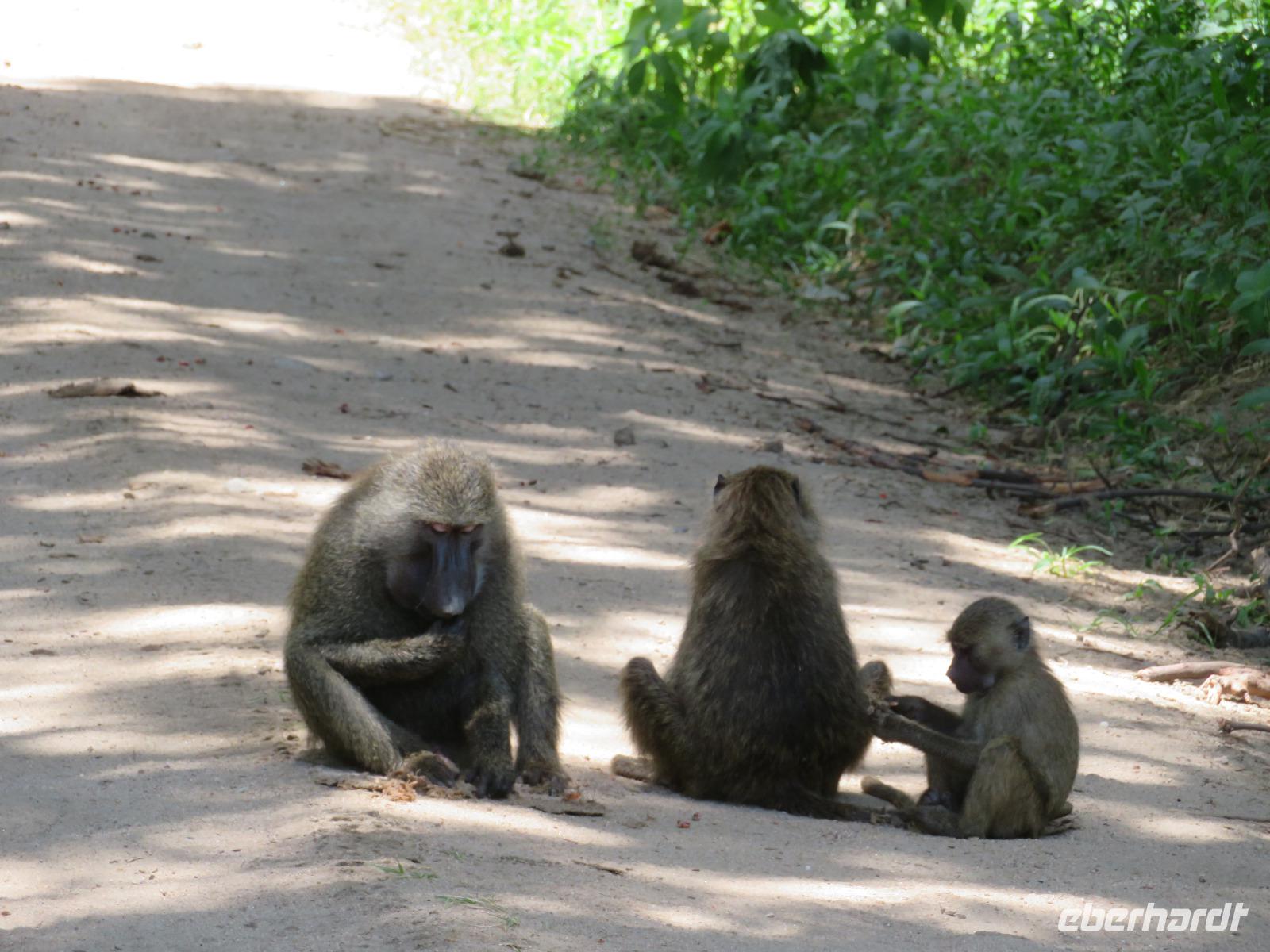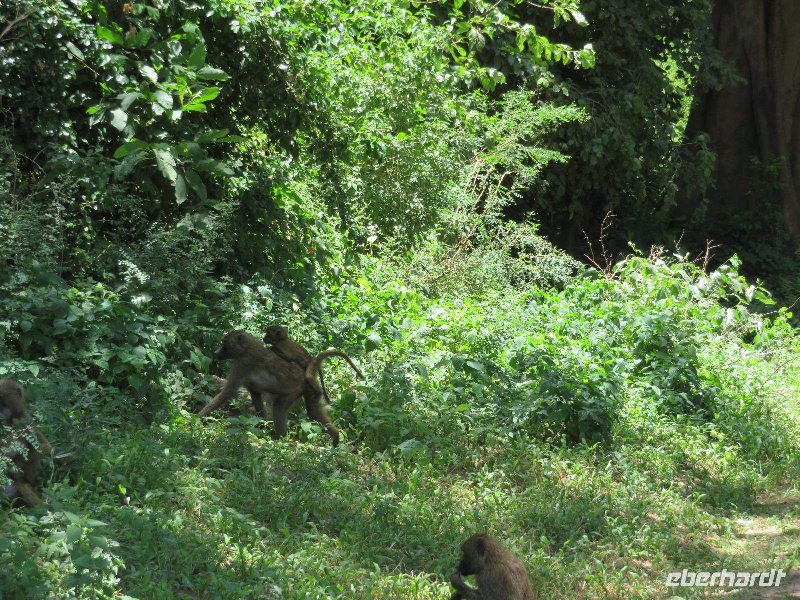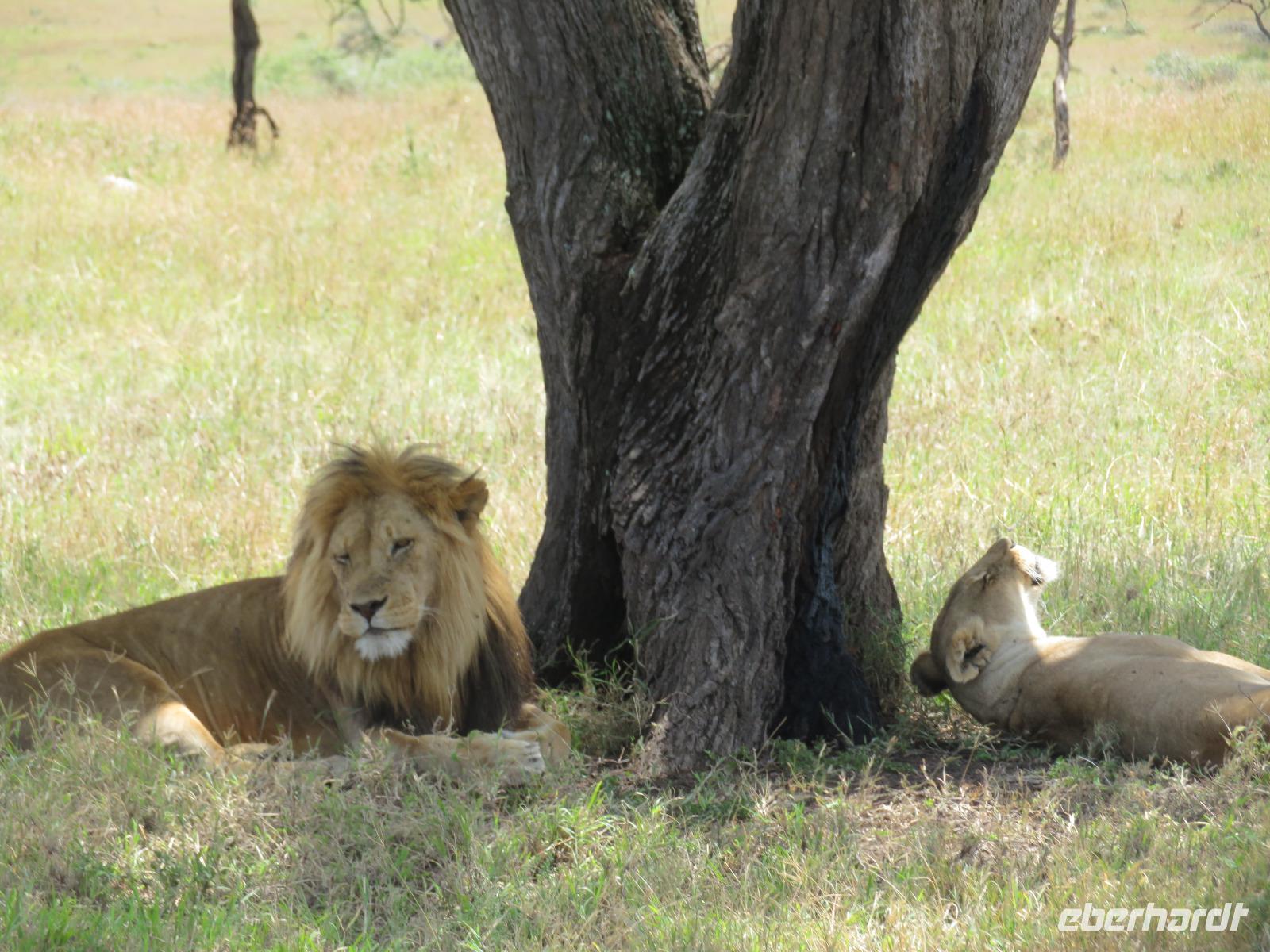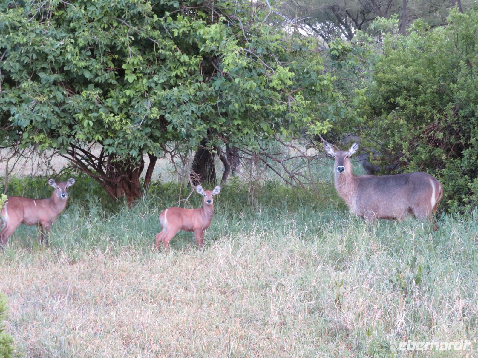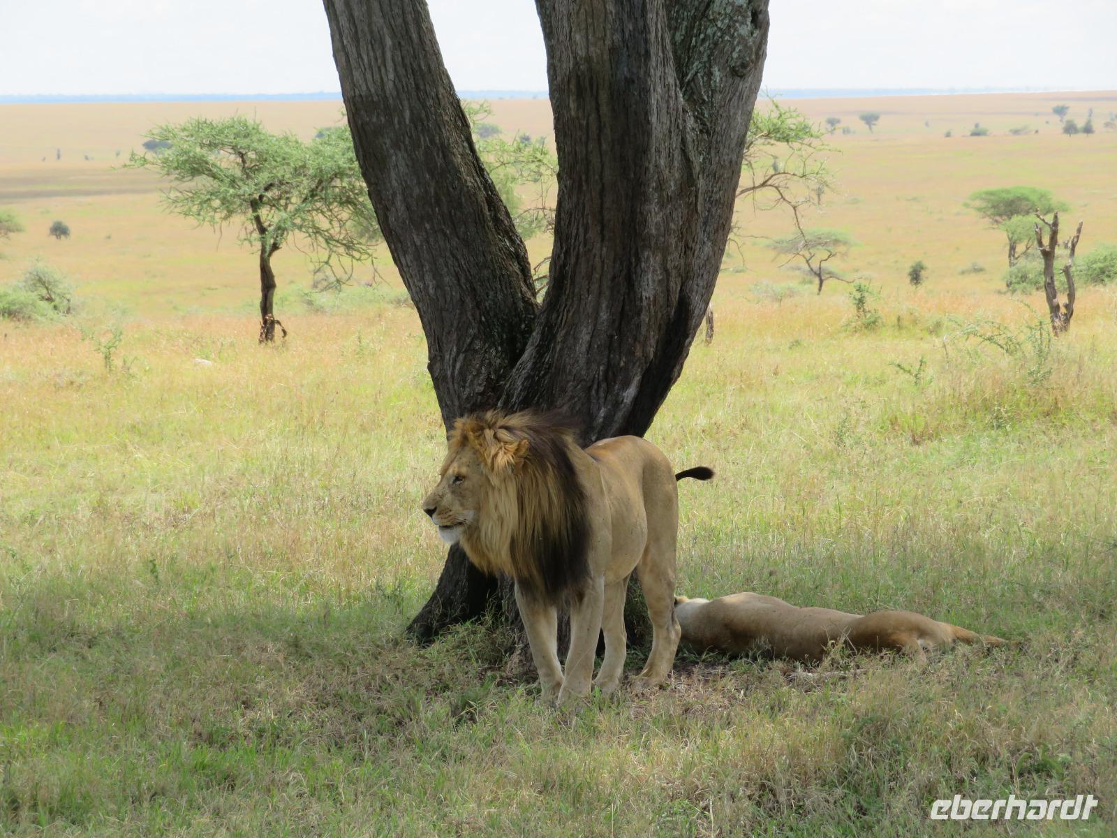 Wir haben die Nacht alle gut verbracht und starten gut gelaunt in den neuen Tag. Nach einem zeitigen Frühstück starten wir zur nächsten Pirschfahrt in den Park. Gleich zu Beginn begegnen uns wieder Impalas und Wasserböcke. Uns beeindrucken aber auch die riesigen Baobab-Bäume. Diese können bis zu 2.500 Jahre alt werden und sind sehr imposant. Leider sehen wir zunächst nur verschiedene Vögel, wie Kronenkraniche, Adler, Gaukler und Glanzstare. Die großen Tiere lassen noch auf sich warten. Doch bald sehen wir Giraffen und Strauße. Kleine, ganz reizend aussehende Dikdiks, die kleinste Antilopenart, kreuzen unseren Weg. Und auch einen Springschliefer, eine seltene kleine Antilopenart entdecken wir auf einem Stein. Plötzlich hören wir regen Funkverkehr zwischen den Rangern von verschiedenen Fahrzeugen. Nach einer kurzen Toiletten-Pause geht die Fahrt nun etwas zügiger. Irgendetwas haben die Ranger entdeckt. Wir lassen Giraffen, Sträuße und verschiedene Vögel erst mal links liegen. Am Rand des großen Sumpfgebietes des Tranagire- Nationalparks haben die Ranger Löwen entdeckt. Drei stattliche Löwenherren - vermutlich Brüder - liegen in der Sonne und dösen vor sich hin. Wir können bis auf wenige Meter an den König der Tiere ranfahren. Vermutlich haben sie am Morgen eine Antilope gerissen und sind nun satt. Ein tolles Erlebnis mit wunderschönen Bildern. Nun geht es zurück und wir beobachten dabei noch Hornvögel, Störche und Zebramangusten. Am Picknickplatz mit herrlicher Aussicht über das große Sumpfgebiet zaubern unsere beiden Fahrer ein vorzügliches Mittagessen aus dem Auto. Die Küchencrew der Lodge hatte uns ein wunderbares Menü mitgegeben. Dieses wurde uns stilecht mit Tischdecke und Geschirr serviert. Wir waren begeistert. Gut gestärkt treten wir nun die Rückfahrt Richtung Lodge an. Unterwegs sehen wir nochmals Giraffen, Zebras und immer wieder auch Impalas und Warzenschweine. Kurz vor dem Verlassen des Parks stoßen wir auf eine Elefantenmama mit ihren Kindern. Wunderschön war es anzusehen, wie diese imposanten Tiere mit ihren großen Ohren schlagen und sich damit Kühlung verschaffen. Zum Abschluss sehen wir eine ganze Familie blauer Meerkatzen durch die Bäume toben. Wir sind uns einig: es war eine herrliche Pirschfahrt, auch wenn wir in der Mittagszeit nicht allzu viele Tiere gesehen haben. Bis zum Abendessen blieb noch Zeit für eine Abkühlung im Pool oder einfach zum Genießen der herrlichen Landschaft von der Terrasse der Zelte aus.