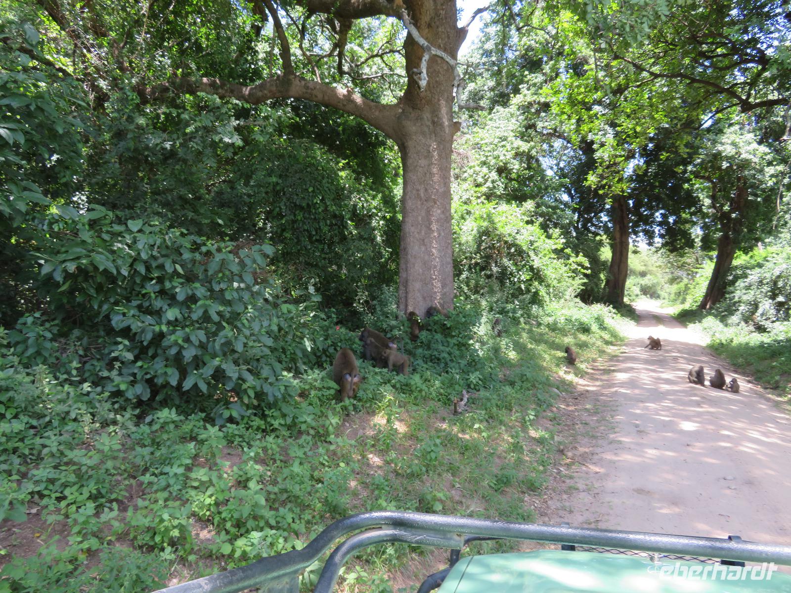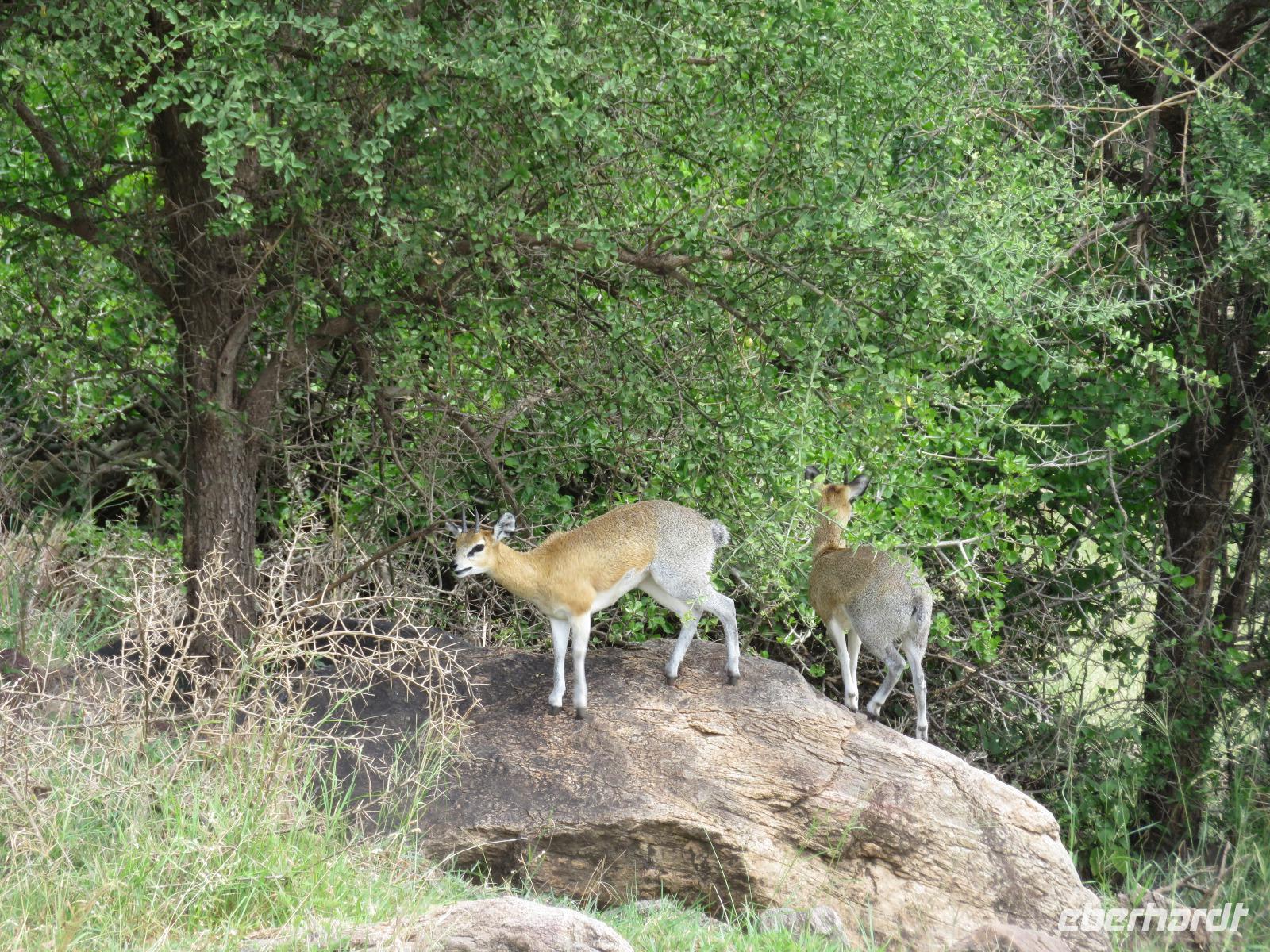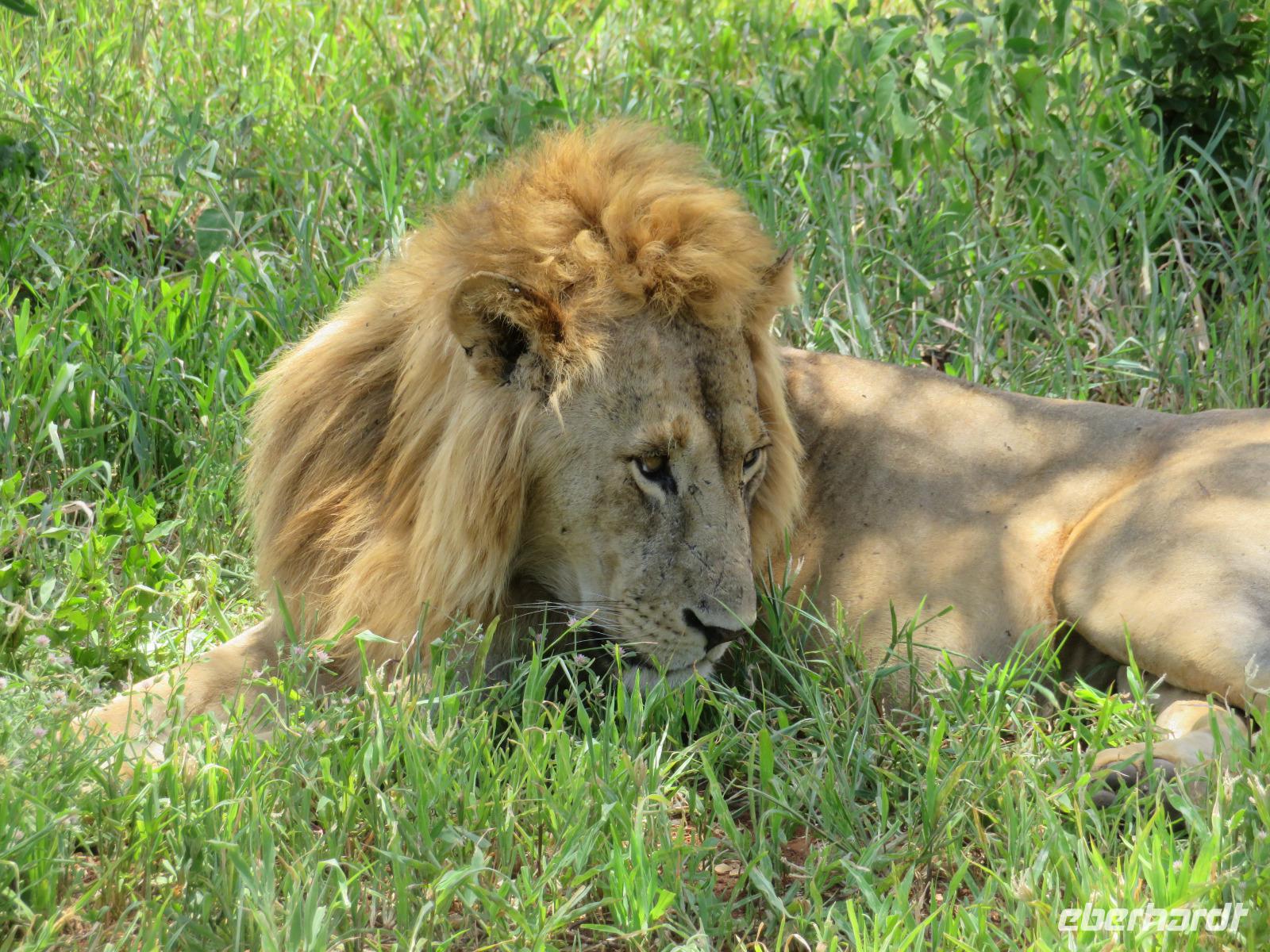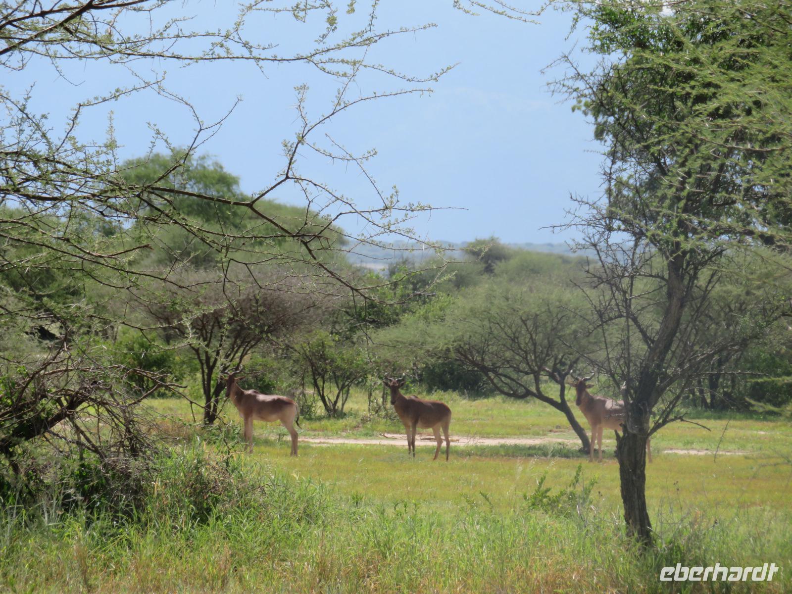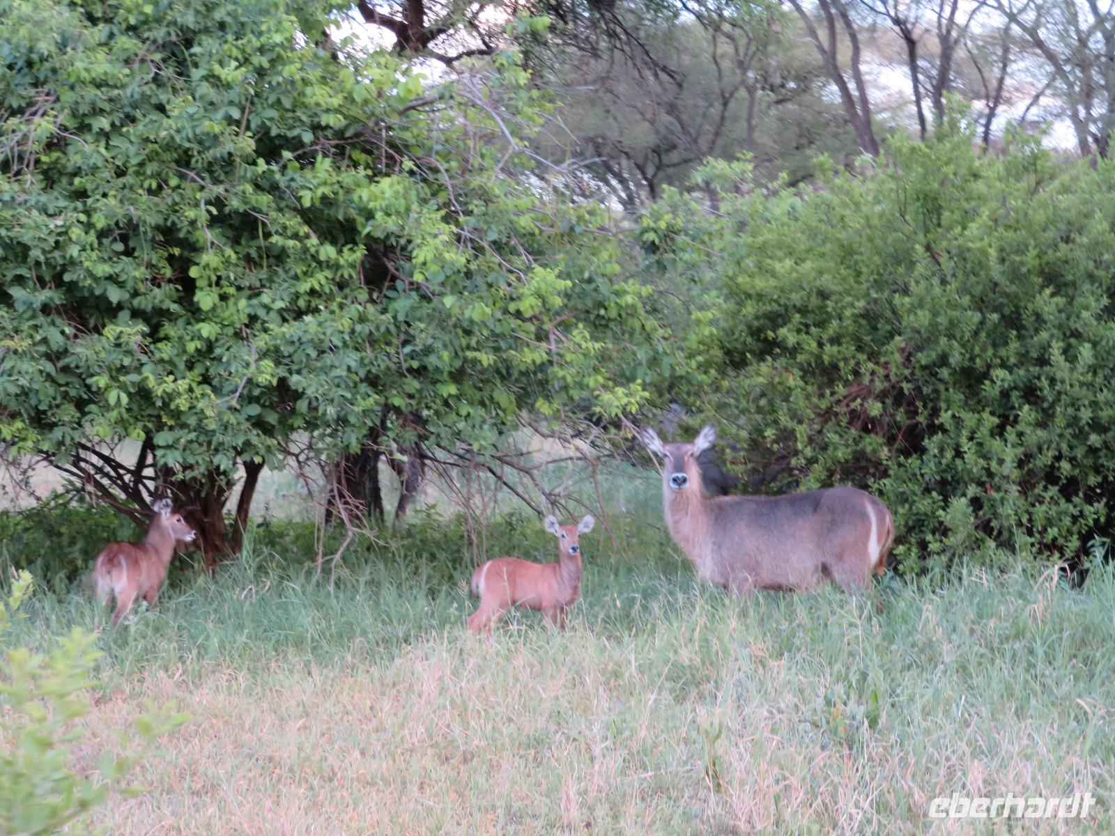 Wir haben die Nacht alle gut verbracht und starten gut gelaunt in den neuen Tag. Nach einem zeitigen Frühstück starten wir zur nächsten Pirschfahrt in den Park. Gleich zu Beginn begegnen uns wieder Impalas und Wasserböcke. Uns beeindrucken aber auch die riesigen Baobab-Bäume. Diese können bis zu 2.500 Jahre alt werden und sind sehr imposant. Leider sehen wir zunächst nur verschiedene Vögel, wie Kronenkraniche, Adler, Gaukler und Glanzstare. Die großen Tiere lassen noch auf sich warten. Doch bald sehen wir Giraffen und Strauße. Kleine, ganz reizend aussehende Dikdiks, die kleinste Antilopenart, kreuzen unseren Weg. Und auch einen Springschliefer, eine seltene kleine Antilopenart entdecken wir auf einem Stein. Plötzlich hören wir regen Funkverkehr zwischen den Rangern von verschiedenen Fahrzeugen. Nach einer kurzen Toiletten-Pause geht die Fahrt nun etwas zügiger. Irgendetwas haben die Ranger entdeckt. Wir lassen Giraffen, Sträuße und verschiedene Vögel erst mal links liegen. Am Rand des großen Sumpfgebietes des Tranagire- Nationalparks haben die Ranger Löwen entdeckt. Drei stattliche Löwenherren - vermutlich Brüder - liegen in der Sonne und dösen vor sich hin. Wir können bis auf wenige Meter an den König der Tiere ranfahren. Vermutlich haben sie am Morgen eine Antilope gerissen und sind nun satt. Ein tolles Erlebnis mit wunderschönen Bildern. Nun geht es zurück und wir beobachten dabei noch Hornvögel, Störche und Zebramangusten. Am Picknickplatz mit herrlicher Aussicht über das große Sumpfgebiet zaubern unsere beiden Fahrer ein vorzügliches Mittagessen aus dem Auto. Die Küchencrew der Lodge hatte uns ein wunderbares Menü mitgegeben. Dieses wurde uns stilecht mit Tischdecke und Geschirr serviert. Wir waren begeistert. Gut gestärkt treten wir nun die Rückfahrt Richtung Lodge an. Unterwegs sehen wir nochmals Giraffen, Zebras und immer wieder auch Impalas und Warzenschweine. Kurz vor dem Verlassen des Parks stoßen wir auf eine Elefantenmama mit ihren Kindern. Wunderschön war es anzusehen, wie diese imposanten Tiere mit ihren großen Ohren schlagen und sich damit Kühlung verschaffen. Zum Abschluss sehen wir eine ganze Familie blauer Meerkatzen durch die Bäume toben. Wir sind uns einig: es war eine herrliche Pirschfahrt, auch wenn wir in der Mittagszeit nicht allzu viele Tiere gesehen haben. Bis zum Abendessen blieb noch Zeit für eine Abkühlung im Pool oder einfach zum Genießen der herrlichen Landschaft von der Terrasse der Zelte aus.