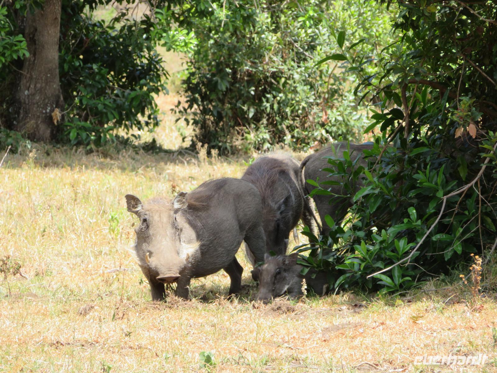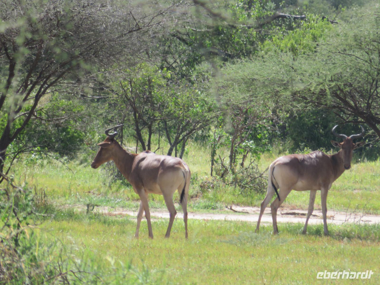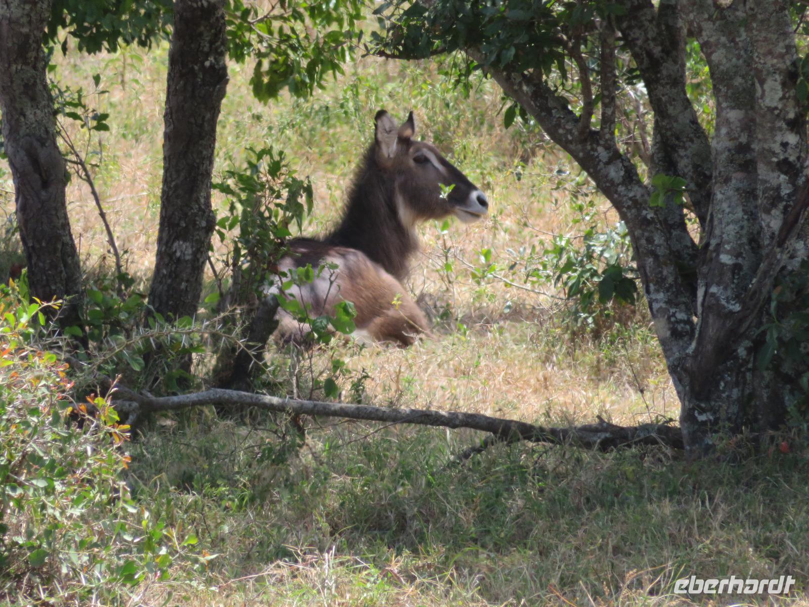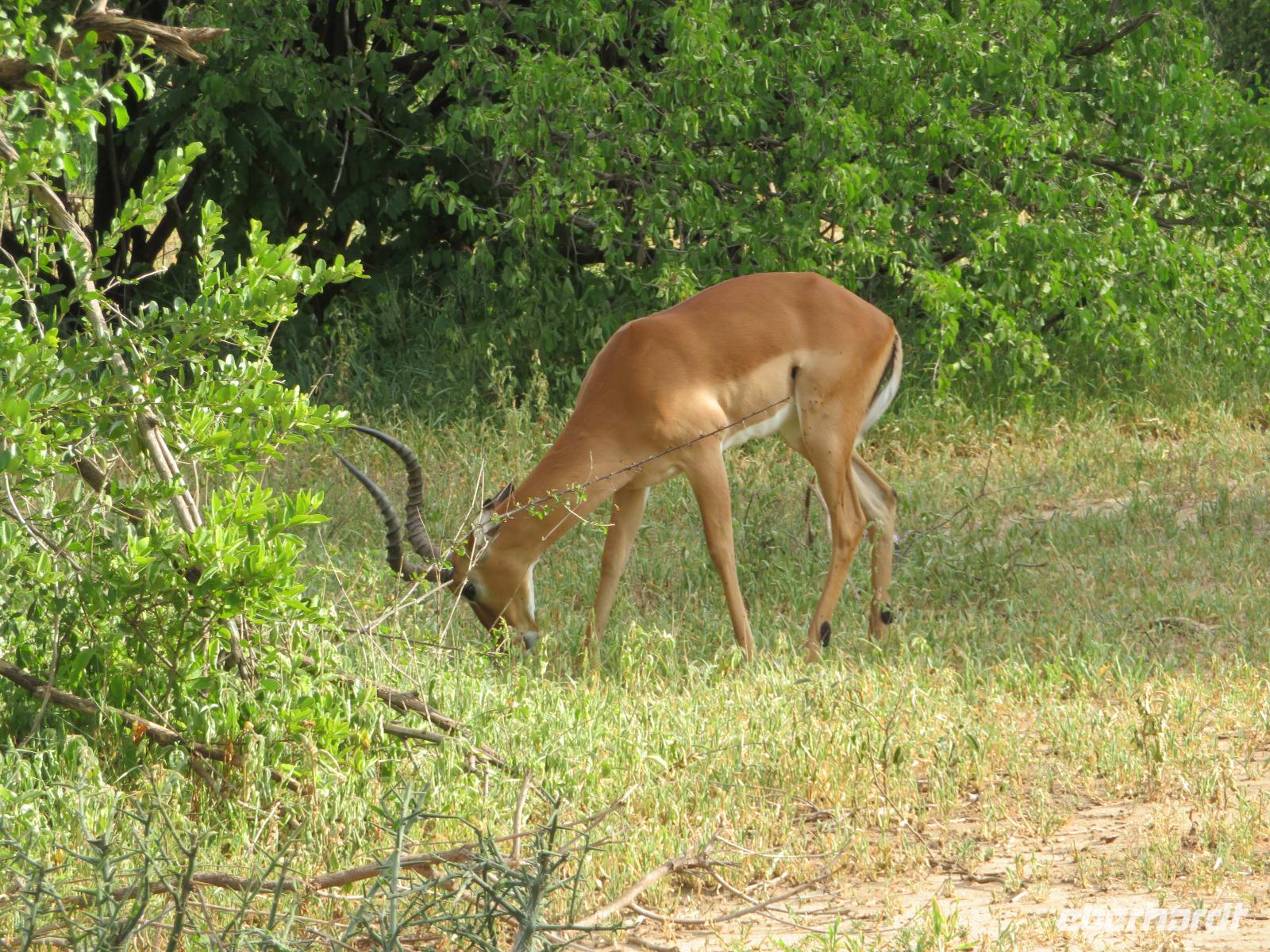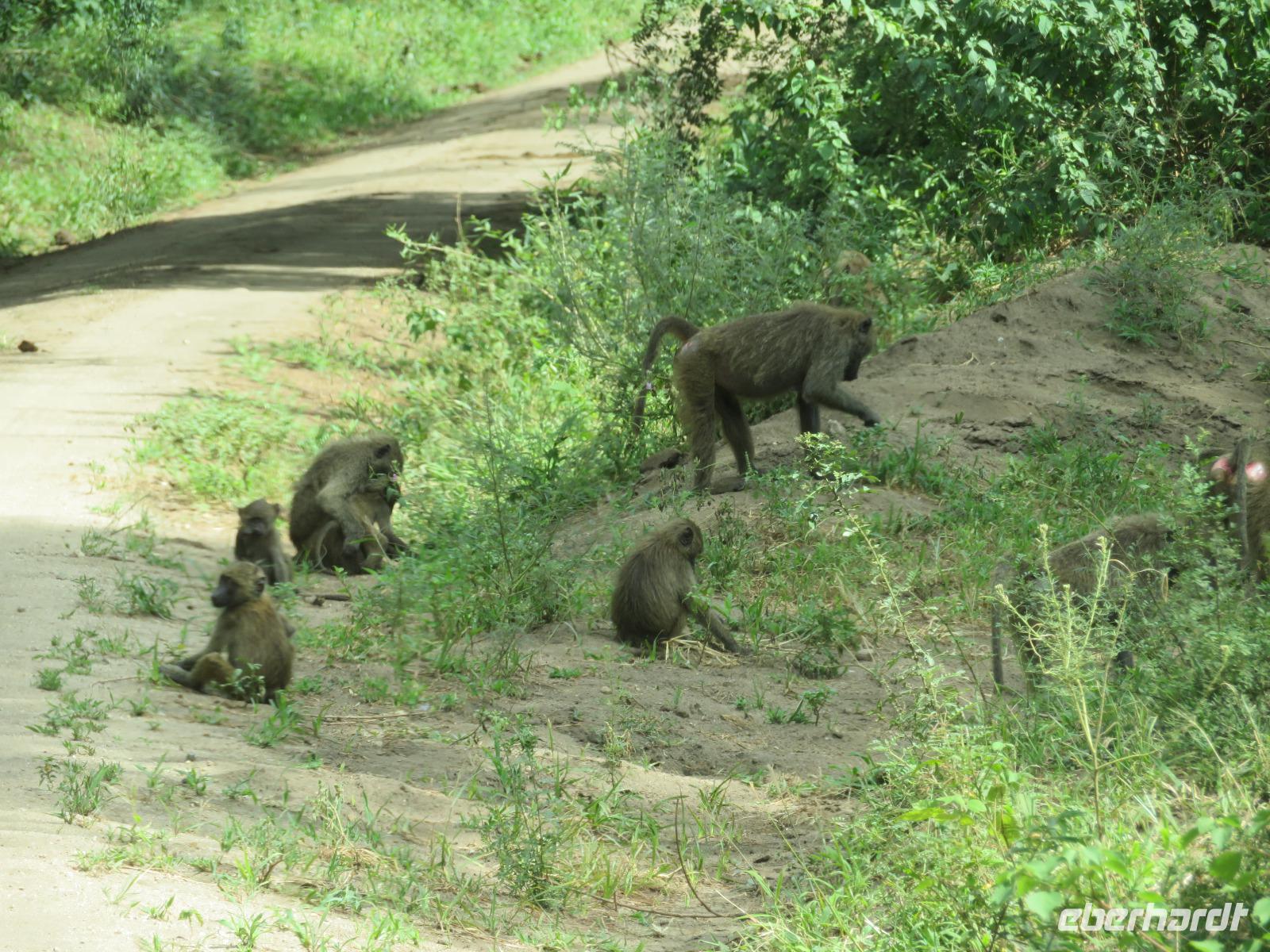 Wir haben die Nacht alle gut verbracht und starten gut gelaunt in den neuen Tag. Nach einem zeitigen Frühstück starten wir zur nächsten Pirschfahrt in den Park. Gleich zu Beginn begegnen uns wieder Impalas und Wasserböcke. Uns beeindrucken aber auch die riesigen Baobab-Bäume. Diese können bis zu 2.500 Jahre alt werden und sind sehr imposant. Leider sehen wir zunächst nur verschiedene Vögel, wie Kronenkraniche, Adler, Gaukler und Glanzstare. Die großen Tiere lassen noch auf sich warten. Doch bald sehen wir Giraffen und Strauße. Kleine, ganz reizend aussehende Dikdiks, die kleinste Antilopenart, kreuzen unseren Weg. Und auch einen Springschliefer, eine seltene kleine Antilopenart entdecken wir auf einem Stein. Plötzlich hören wir regen Funkverkehr zwischen den Rangern von verschiedenen Fahrzeugen. Nach einer kurzen Toiletten-Pause geht die Fahrt nun etwas zügiger. Irgendetwas haben die Ranger entdeckt. Wir lassen Giraffen, Sträuße und verschiedene Vögel erst mal links liegen. Am Rand des großen Sumpfgebietes des Tranagire- Nationalparks haben die Ranger Löwen entdeckt. Drei stattliche Löwenherren - vermutlich Brüder - liegen in der Sonne und dösen vor sich hin. Wir können bis auf wenige Meter an den König der Tiere ranfahren. Vermutlich haben sie am Morgen eine Antilope gerissen und sind nun satt. Ein tolles Erlebnis mit wunderschönen Bildern. Nun geht es zurück und wir beobachten dabei noch Hornvögel, Störche und Zebramangusten. Am Picknickplatz mit herrlicher Aussicht über das große Sumpfgebiet zaubern unsere beiden Fahrer ein vorzügliches Mittagessen aus dem Auto. Die Küchencrew der Lodge hatte uns ein wunderbares Menü mitgegeben. Dieses wurde uns stilecht mit Tischdecke und Geschirr serviert. Wir waren begeistert. Gut gestärkt treten wir nun die Rückfahrt Richtung Lodge an. Unterwegs sehen wir nochmals Giraffen, Zebras und immer wieder auch Impalas und Warzenschweine. Kurz vor dem Verlassen des Parks stoßen wir auf eine Elefantenmama mit ihren Kindern. Wunderschön war es anzusehen, wie diese imposanten Tiere mit ihren großen Ohren schlagen und sich damit Kühlung verschaffen. Zum Abschluss sehen wir eine ganze Familie blauer Meerkatzen durch die Bäume toben. Wir sind uns einig: es war eine herrliche Pirschfahrt, auch wenn wir in der Mittagszeit nicht allzu viele Tiere gesehen haben. Bis zum Abendessen blieb noch Zeit für eine Abkühlung im Pool oder einfach zum Genießen der herrlichen Landschaft von der Terrasse der Zelte aus.