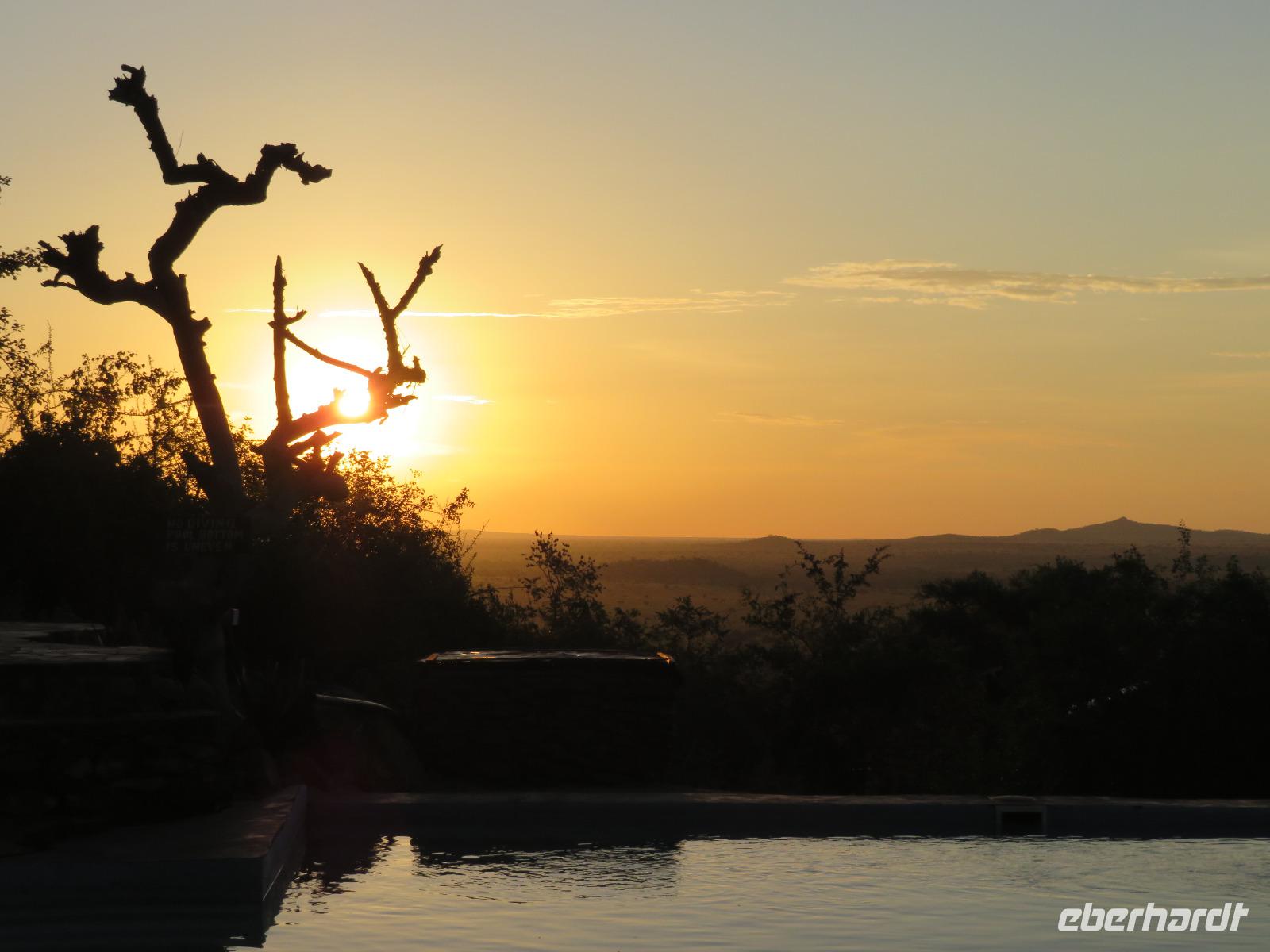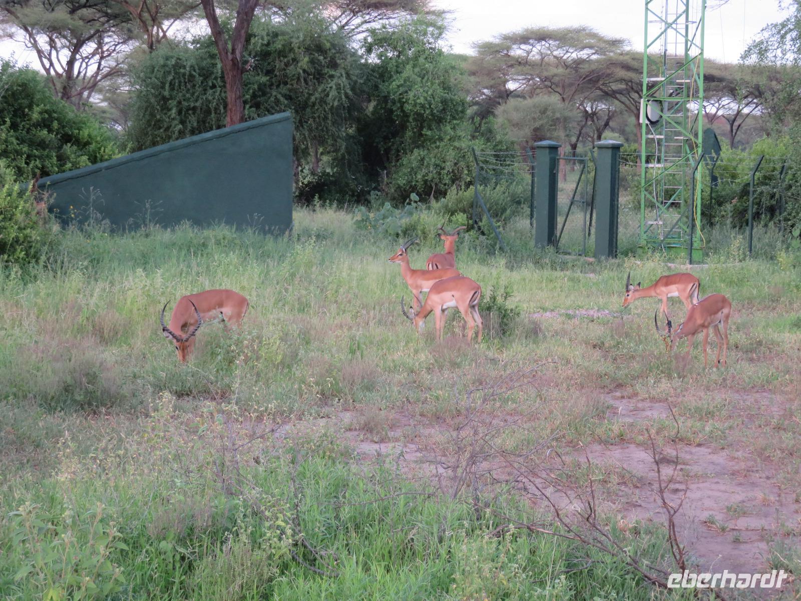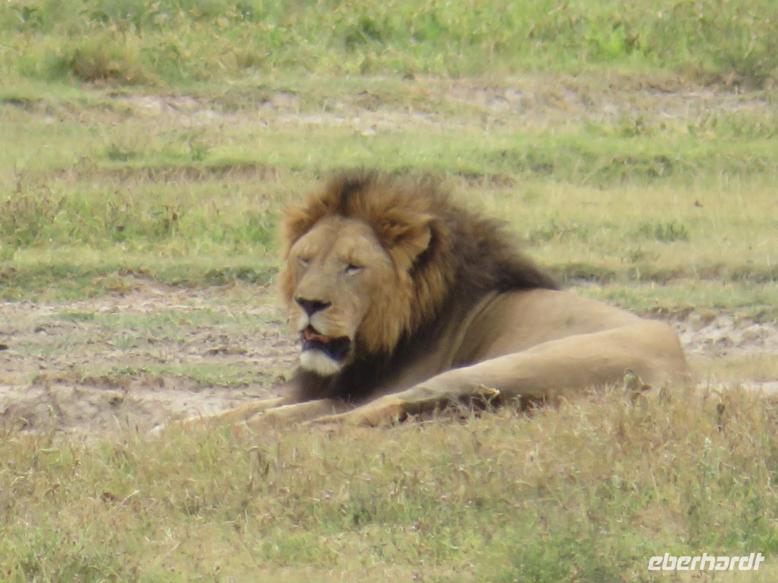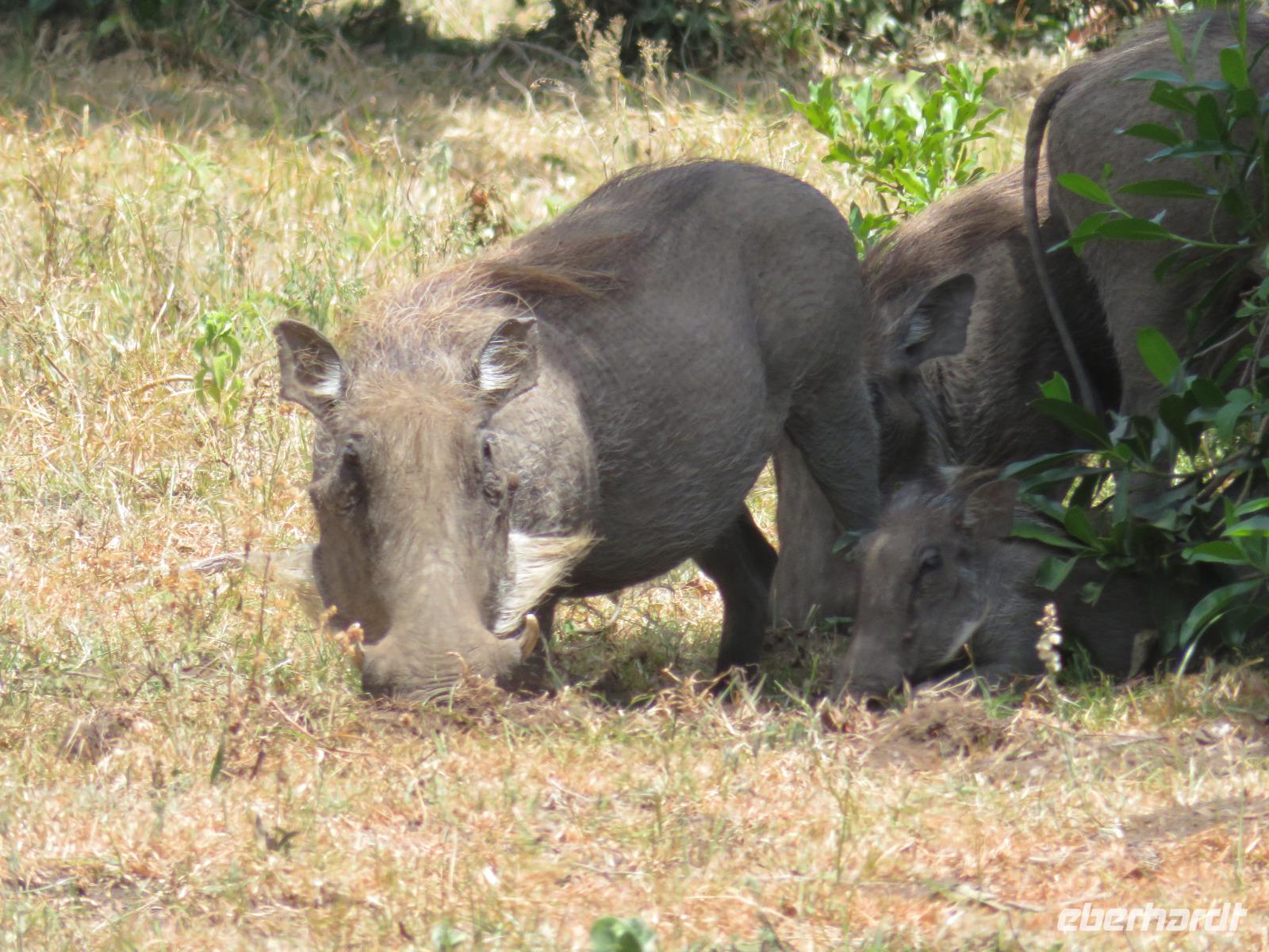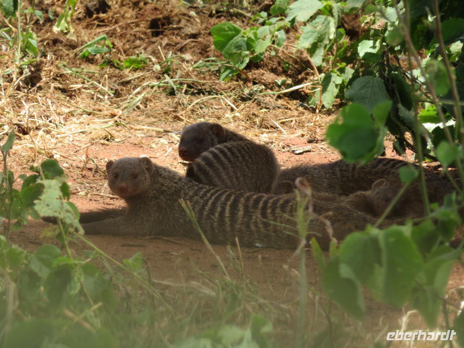 Wir haben die Nacht alle gut verbracht und starten gut gelaunt in den neuen Tag. Nach einem zeitigen Frühstück starten wir zur nächsten Pirschfahrt in den Park. Gleich zu Beginn begegnen uns wieder Impalas und Wasserböcke. Uns beeindrucken aber auch die riesigen Baobab-Bäume. Diese können bis zu 2.500 Jahre alt werden und sind sehr imposant. Leider sehen wir zunächst nur verschiedene Vögel, wie Kronenkraniche, Adler, Gaukler und Glanzstare. Die großen Tiere lassen noch auf sich warten. Doch bald sehen wir Giraffen und Strauße. Kleine, ganz reizend aussehende Dikdiks, die kleinste Antilopenart, kreuzen unseren Weg. Und auch einen Springschliefer, eine seltene kleine Antilopenart entdecken wir auf einem Stein. Plötzlich hören wir regen Funkverkehr zwischen den Rangern von verschiedenen Fahrzeugen. Nach einer kurzen Toiletten-Pause geht die Fahrt nun etwas zügiger. Irgendetwas haben die Ranger entdeckt. Wir lassen Giraffen, Sträuße und verschiedene Vögel erst mal links liegen. Am Rand des großen Sumpfgebietes des Tranagire- Nationalparks haben die Ranger Löwen entdeckt. Drei stattliche Löwenherren - vermutlich Brüder - liegen in der Sonne und dösen vor sich hin. Wir können bis auf wenige Meter an den König der Tiere ranfahren. Vermutlich haben sie am Morgen eine Antilope gerissen und sind nun satt. Ein tolles Erlebnis mit wunderschönen Bildern. Nun geht es zurück und wir beobachten dabei noch Hornvögel, Störche und Zebramangusten. Am Picknickplatz mit herrlicher Aussicht über das große Sumpfgebiet zaubern unsere beiden Fahrer ein vorzügliches Mittagessen aus dem Auto. Die Küchencrew der Lodge hatte uns ein wunderbares Menü mitgegeben. Dieses wurde uns stilecht mit Tischdecke und Geschirr serviert. Wir waren begeistert. Gut gestärkt treten wir nun die Rückfahrt Richtung Lodge an. Unterwegs sehen wir nochmals Giraffen, Zebras und immer wieder auch Impalas und Warzenschweine. Kurz vor dem Verlassen des Parks stoßen wir auf eine Elefantenmama mit ihren Kindern. Wunderschön war es anzusehen, wie diese imposanten Tiere mit ihren großen Ohren schlagen und sich damit Kühlung verschaffen. Zum Abschluss sehen wir eine ganze Familie blauer Meerkatzen durch die Bäume toben. Wir sind uns einig: es war eine herrliche Pirschfahrt, auch wenn wir in der Mittagszeit nicht allzu viele Tiere gesehen haben. Bis zum Abendessen blieb noch Zeit für eine Abkühlung im Pool oder einfach zum Genießen der herrlichen Landschaft von der Terrasse der Zelte aus.