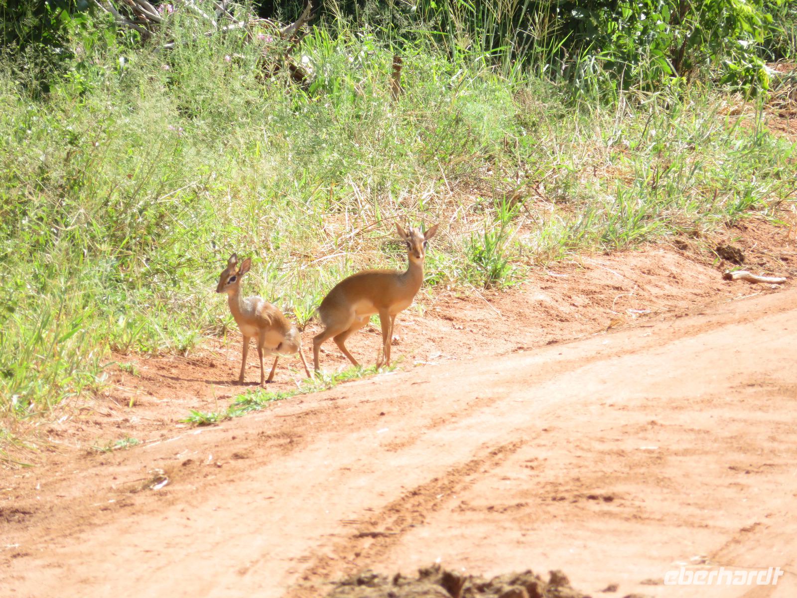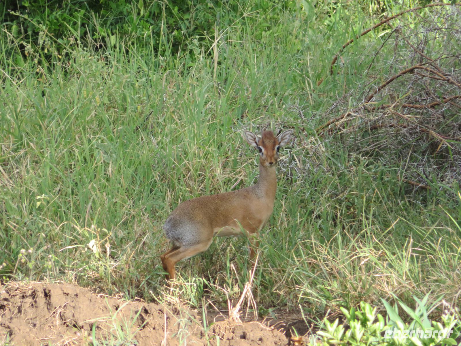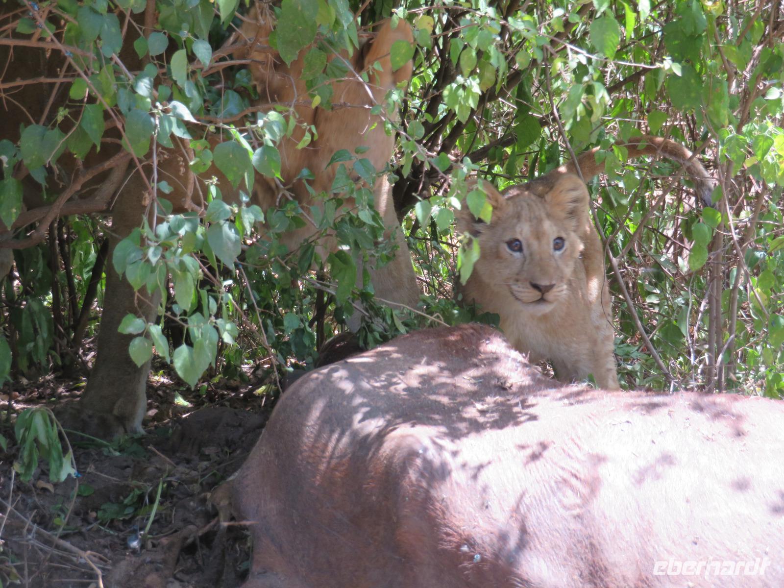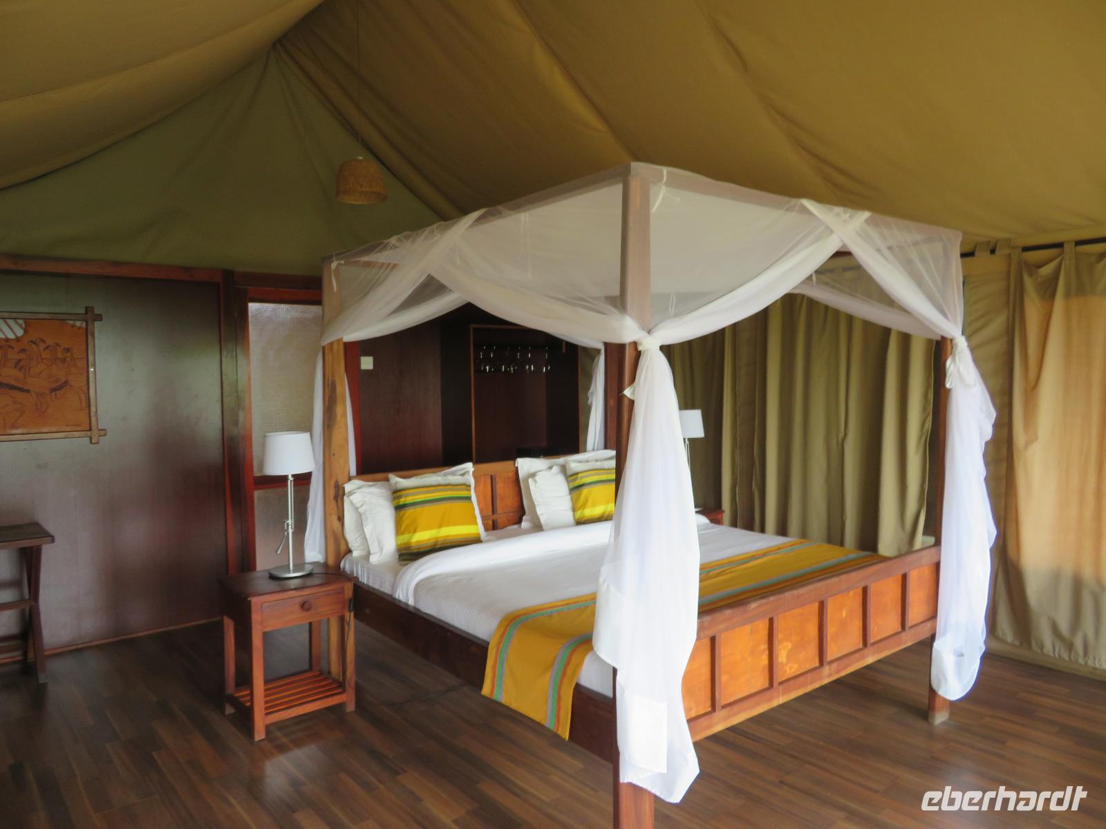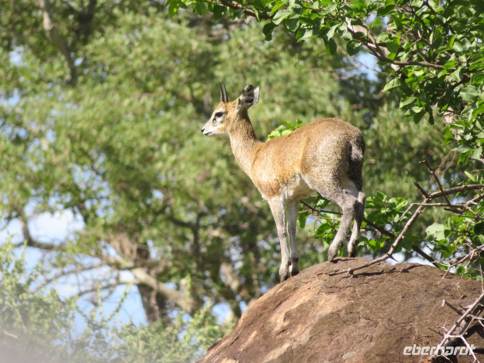 Wir haben die Nacht alle gut verbracht und starten gut gelaunt in den neuen Tag. Nach einem zeitigen Frühstück starten wir zur nächsten Pirschfahrt in den Park. Gleich zu Beginn begegnen uns wieder Impalas und Wasserböcke. Uns beeindrucken aber auch die riesigen Baobab-Bäume. Diese können bis zu 2.500 Jahre alt werden und sind sehr imposant. Leider sehen wir zunächst nur verschiedene Vögel, wie Kronenkraniche, Adler, Gaukler und Glanzstare. Die großen Tiere lassen noch auf sich warten. Doch bald sehen wir Giraffen und Strauße. Kleine, ganz reizend aussehende Dikdiks, die kleinste Antilopenart, kreuzen unseren Weg. Und auch einen Springschliefer, eine seltene kleine Antilopenart entdecken wir auf einem Stein. Plötzlich hören wir regen Funkverkehr zwischen den Rangern von verschiedenen Fahrzeugen. Nach einer kurzen Toiletten-Pause geht die Fahrt nun etwas zügiger. Irgendetwas haben die Ranger entdeckt. Wir lassen Giraffen, Sträuße und verschiedene Vögel erst mal links liegen. Am Rand des großen Sumpfgebietes des Tranagire- Nationalparks haben die Ranger Löwen entdeckt. Drei stattliche Löwenherren - vermutlich Brüder - liegen in der Sonne und dösen vor sich hin. Wir können bis auf wenige Meter an den König der Tiere ranfahren. Vermutlich haben sie am Morgen eine Antilope gerissen und sind nun satt. Ein tolles Erlebnis mit wunderschönen Bildern. Nun geht es zurück und wir beobachten dabei noch Hornvögel, Störche und Zebramangusten. Am Picknickplatz mit herrlicher Aussicht über das große Sumpfgebiet zaubern unsere beiden Fahrer ein vorzügliches Mittagessen aus dem Auto. Die Küchencrew der Lodge hatte uns ein wunderbares Menü mitgegeben. Dieses wurde uns stilecht mit Tischdecke und Geschirr serviert. Wir waren begeistert. Gut gestärkt treten wir nun die Rückfahrt Richtung Lodge an. Unterwegs sehen wir nochmals Giraffen, Zebras und immer wieder auch Impalas und Warzenschweine. Kurz vor dem Verlassen des Parks stoßen wir auf eine Elefantenmama mit ihren Kindern. Wunderschön war es anzusehen, wie diese imposanten Tiere mit ihren großen Ohren schlagen und sich damit Kühlung verschaffen. Zum Abschluss sehen wir eine ganze Familie blauer Meerkatzen durch die Bäume toben. Wir sind uns einig: es war eine herrliche Pirschfahrt, auch wenn wir in der Mittagszeit nicht allzu viele Tiere gesehen haben. Bis zum Abendessen blieb noch Zeit für eine Abkühlung im Pool oder einfach zum Genießen der herrlichen Landschaft von der Terrasse der Zelte aus.