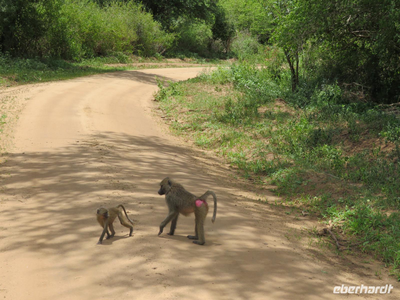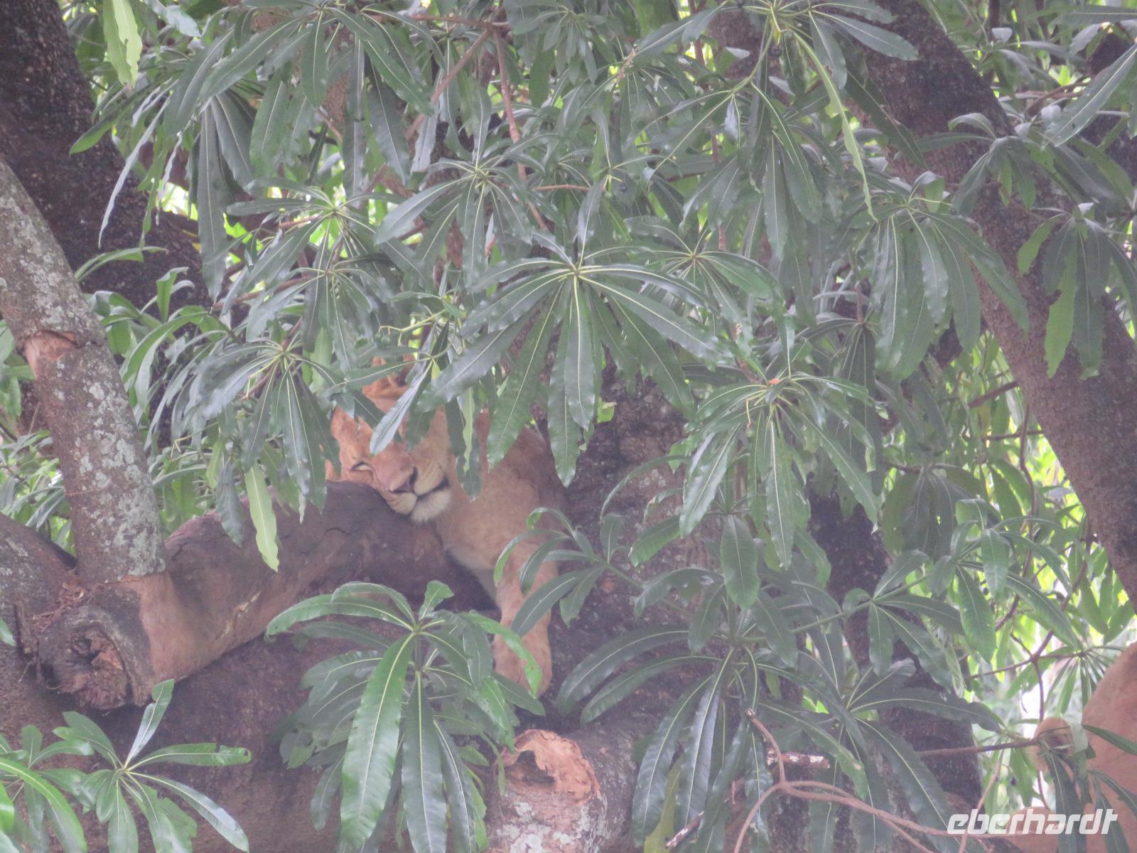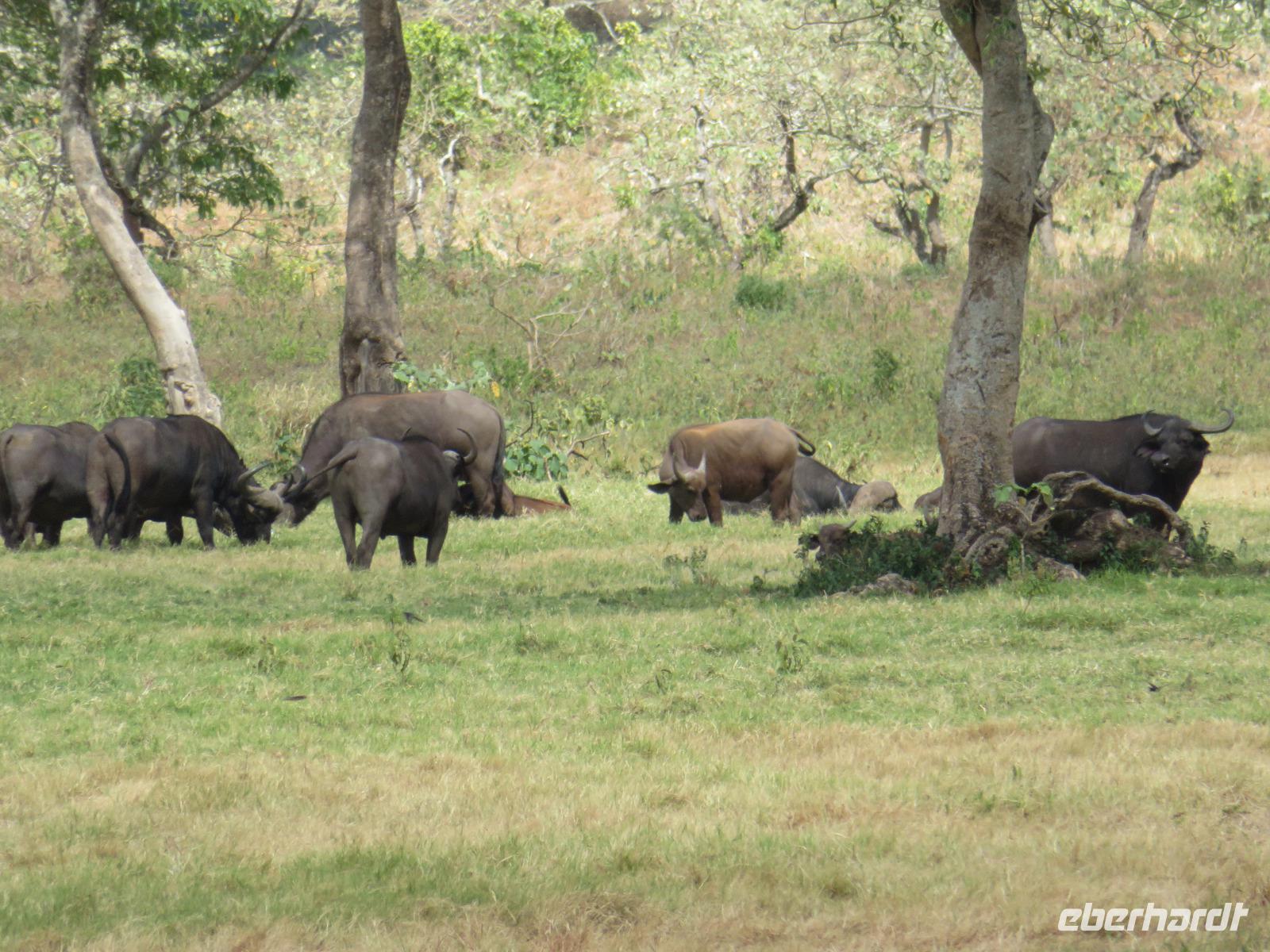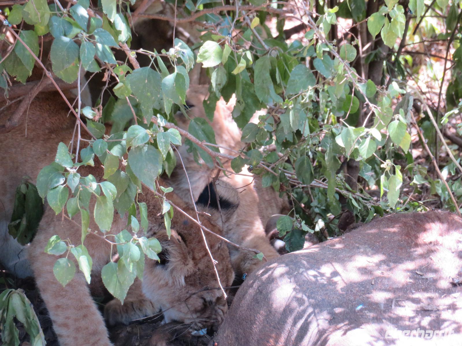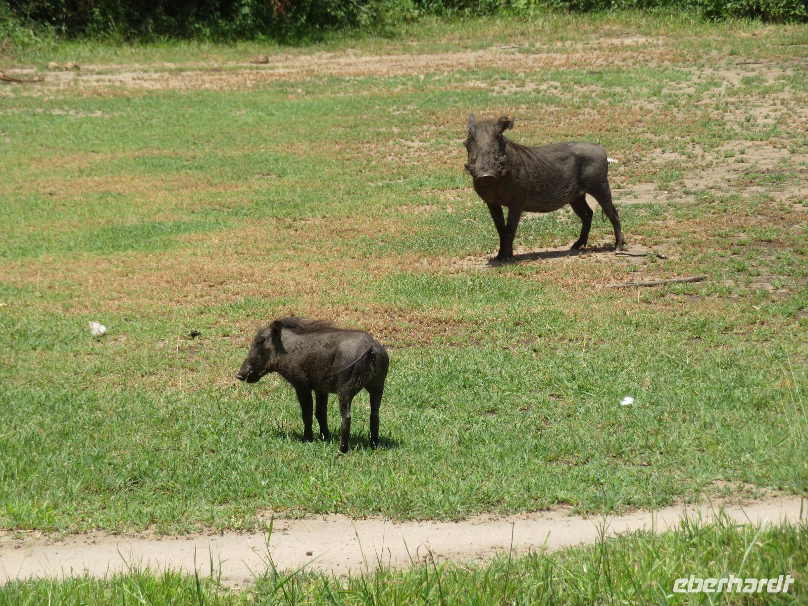 Wir haben die Nacht alle gut verbracht und starten gut gelaunt in den neuen Tag. Nach einem zeitigen Frühstück starten wir zur nächsten Pirschfahrt in den Park. Gleich zu Beginn begegnen uns wieder Impalas und Wasserböcke. Uns beeindrucken aber auch die riesigen Baobab-Bäume. Diese können bis zu 2.500 Jahre alt werden und sind sehr imposant. Leider sehen wir zunächst nur verschiedene Vögel, wie Kronenkraniche, Adler, Gaukler und Glanzstare. Die großen Tiere lassen noch auf sich warten. Doch bald sehen wir Giraffen und Strauße. Kleine, ganz reizend aussehende Dikdiks, die kleinste Antilopenart, kreuzen unseren Weg. Und auch einen Springschliefer, eine seltene kleine Antilopenart entdecken wir auf einem Stein. Plötzlich hören wir regen Funkverkehr zwischen den Rangern von verschiedenen Fahrzeugen. Nach einer kurzen Toiletten-Pause geht die Fahrt nun etwas zügiger. Irgendetwas haben die Ranger entdeckt. Wir lassen Giraffen, Sträuße und verschiedene Vögel erst mal links liegen. Am Rand des großen Sumpfgebietes des Tranagire- Nationalparks haben die Ranger Löwen entdeckt. Drei stattliche Löwenherren - vermutlich Brüder - liegen in der Sonne und dösen vor sich hin. Wir können bis auf wenige Meter an den König der Tiere ranfahren. Vermutlich haben sie am Morgen eine Antilope gerissen und sind nun satt. Ein tolles Erlebnis mit wunderschönen Bildern. Nun geht es zurück und wir beobachten dabei noch Hornvögel, Störche und Zebramangusten. Am Picknickplatz mit herrlicher Aussicht über das große Sumpfgebiet zaubern unsere beiden Fahrer ein vorzügliches Mittagessen aus dem Auto. Die Küchencrew der Lodge hatte uns ein wunderbares Menü mitgegeben. Dieses wurde uns stilecht mit Tischdecke und Geschirr serviert. Wir waren begeistert. Gut gestärkt treten wir nun die Rückfahrt Richtung Lodge an. Unterwegs sehen wir nochmals Giraffen, Zebras und immer wieder auch Impalas und Warzenschweine. Kurz vor dem Verlassen des Parks stoßen wir auf eine Elefantenmama mit ihren Kindern. Wunderschön war es anzusehen, wie diese imposanten Tiere mit ihren großen Ohren schlagen und sich damit Kühlung verschaffen. Zum Abschluss sehen wir eine ganze Familie blauer Meerkatzen durch die Bäume toben. Wir sind uns einig: es war eine herrliche Pirschfahrt, auch wenn wir in der Mittagszeit nicht allzu viele Tiere gesehen haben. Bis zum Abendessen blieb noch Zeit für eine Abkühlung im Pool oder einfach zum Genießen der herrlichen Landschaft von der Terrasse der Zelte aus.