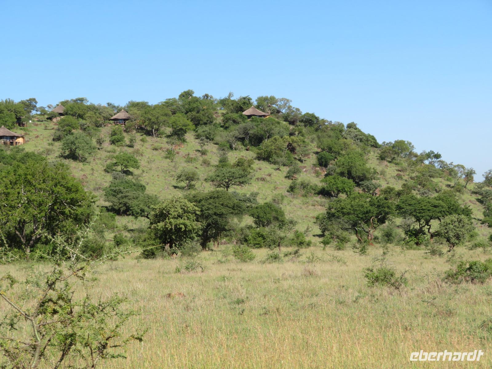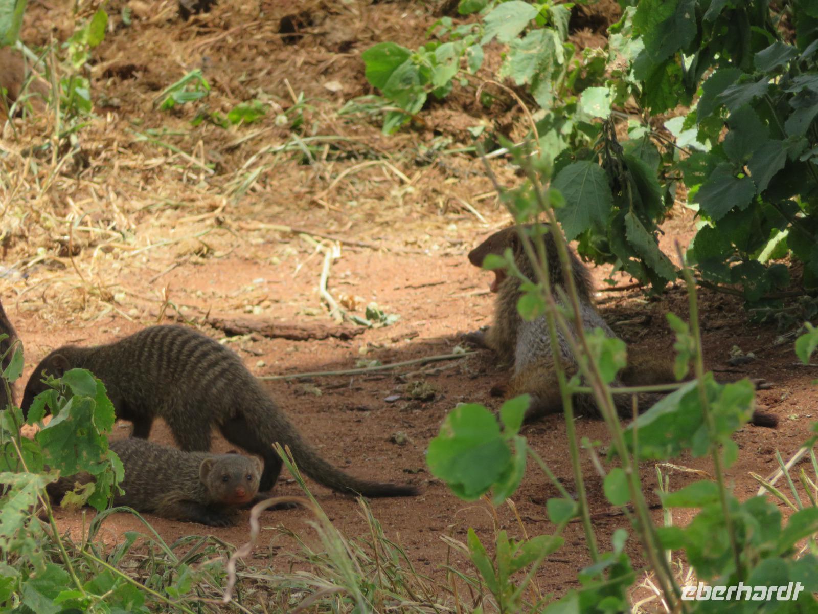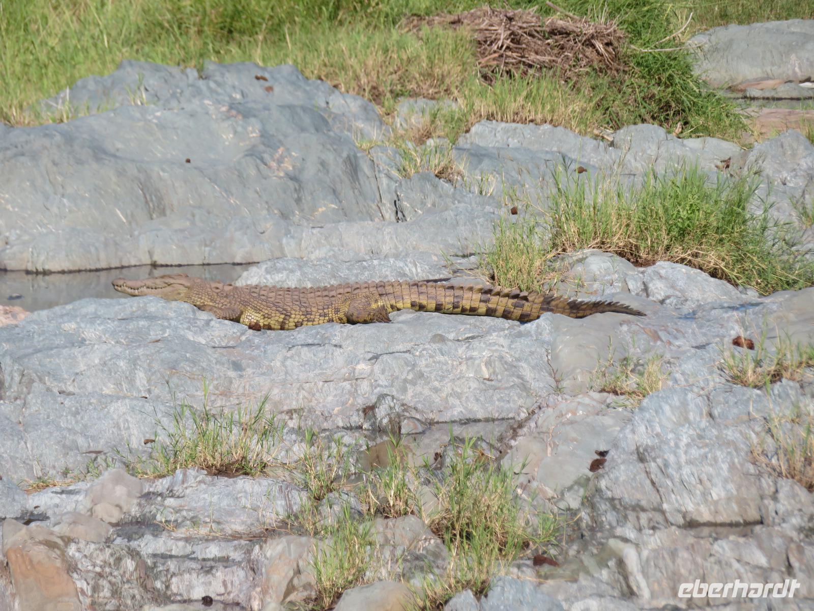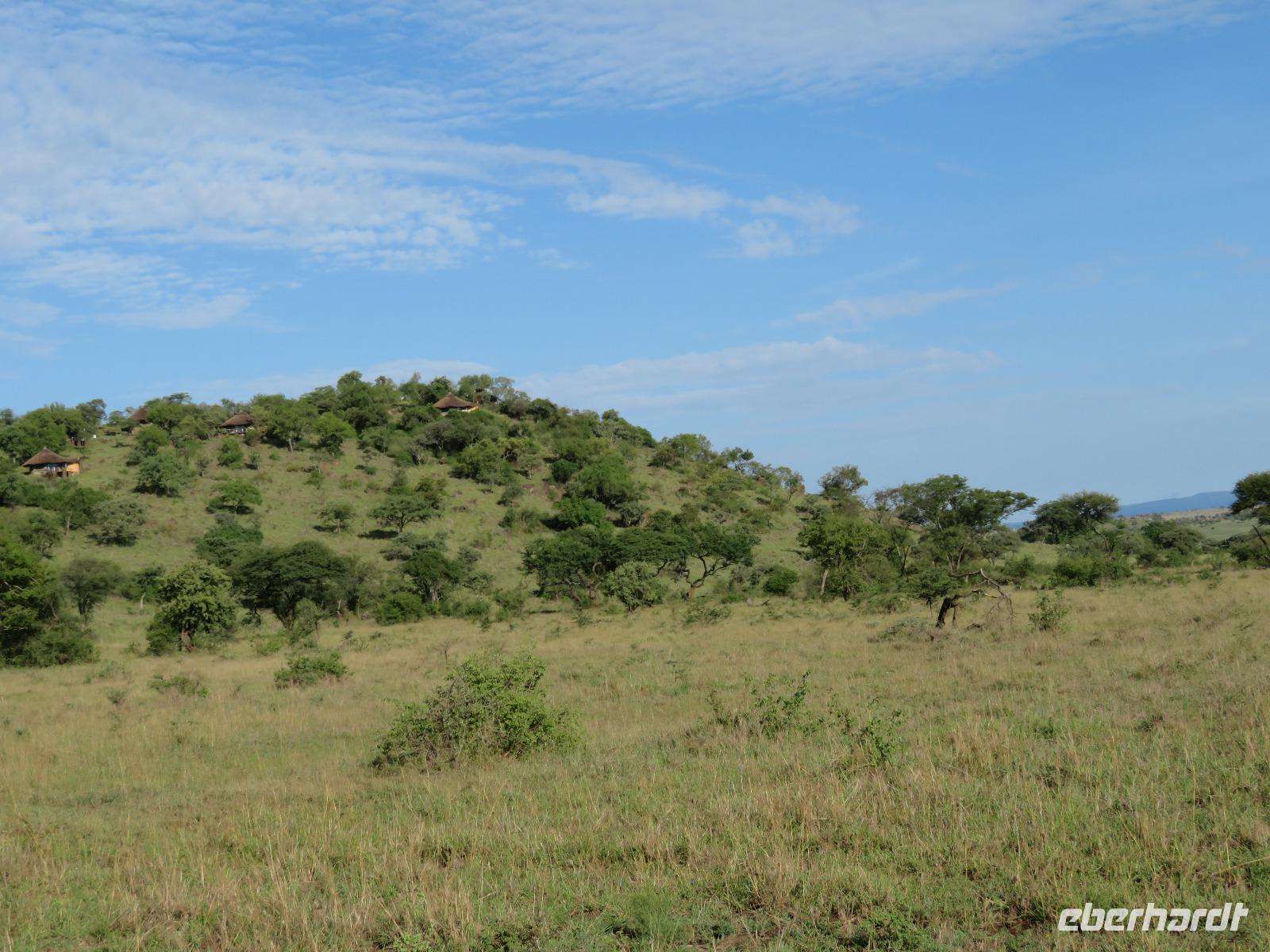 Wir haben die Nacht alle gut verbracht und starten gut gelaunt in den neuen Tag. Nach einem zeitigen Frühstück starten wir zur nächsten Pirschfahrt in den Park. Gleich zu Beginn begegnen uns wieder Impalas und Wasserböcke. Uns beeindrucken aber auch die riesigen Baobab-Bäume. Diese können bis zu 2.500 Jahre alt werden und sind sehr imposant. Leider sehen wir zunächst nur verschiedene Vögel, wie Kronenkraniche, Adler, Gaukler und Glanzstare. Die großen Tiere lassen noch auf sich warten. Doch bald sehen wir Giraffen und Strauße. Kleine, ganz reizend aussehende Dikdiks, die kleinste Antilopenart, kreuzen unseren Weg. Und auch einen Springschliefer, eine seltene kleine Antilopenart entdecken wir auf einem Stein. Plötzlich hören wir regen Funkverkehr zwischen den Rangern von verschiedenen Fahrzeugen. Nach einer kurzen Toiletten-Pause geht die Fahrt nun etwas zügiger. Irgendetwas haben die Ranger entdeckt. Wir lassen Giraffen, Sträuße und verschiedene Vögel erst mal links liegen. Am Rand des großen Sumpfgebietes des Tranagire- Nationalparks haben die Ranger Löwen entdeckt. Drei stattliche Löwenherren - vermutlich Brüder - liegen in der Sonne und dösen vor sich hin. Wir können bis auf wenige Meter an den König der Tiere ranfahren. Vermutlich haben sie am Morgen eine Antilope gerissen und sind nun satt. Ein tolles Erlebnis mit wunderschönen Bildern. Nun geht es zurück und wir beobachten dabei noch Hornvögel, Störche und Zebramangusten. Am Picknickplatz mit herrlicher Aussicht über das große Sumpfgebiet zaubern unsere beiden Fahrer ein vorzügliches Mittagessen aus dem Auto. Die Küchencrew der Lodge hatte uns ein wunderbares Menü mitgegeben. Dieses wurde uns stilecht mit Tischdecke und Geschirr serviert. Wir waren begeistert. Gut gestärkt treten wir nun die Rückfahrt Richtung Lodge an. Unterwegs sehen wir nochmals Giraffen, Zebras und immer wieder auch Impalas und Warzenschweine. Kurz vor dem Verlassen des Parks stoßen wir auf eine Elefantenmama mit ihren Kindern. Wunderschön war es anzusehen, wie diese imposanten Tiere mit ihren großen Ohren schlagen und sich damit Kühlung verschaffen. Zum Abschluss sehen wir eine ganze Familie blauer Meerkatzen durch die Bäume toben. Wir sind uns einig: es war eine herrliche Pirschfahrt, auch wenn wir in der Mittagszeit nicht allzu viele Tiere gesehen haben. Bis zum Abendessen blieb noch Zeit für eine Abkühlung im Pool oder einfach zum Genießen der herrlichen Landschaft von der Terrasse der Zelte aus.