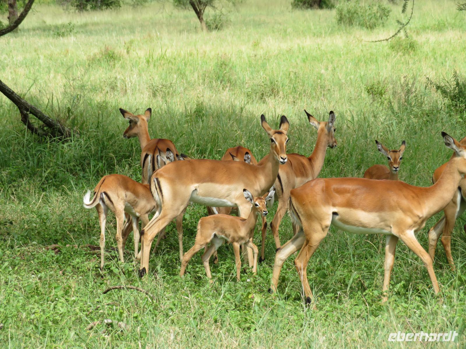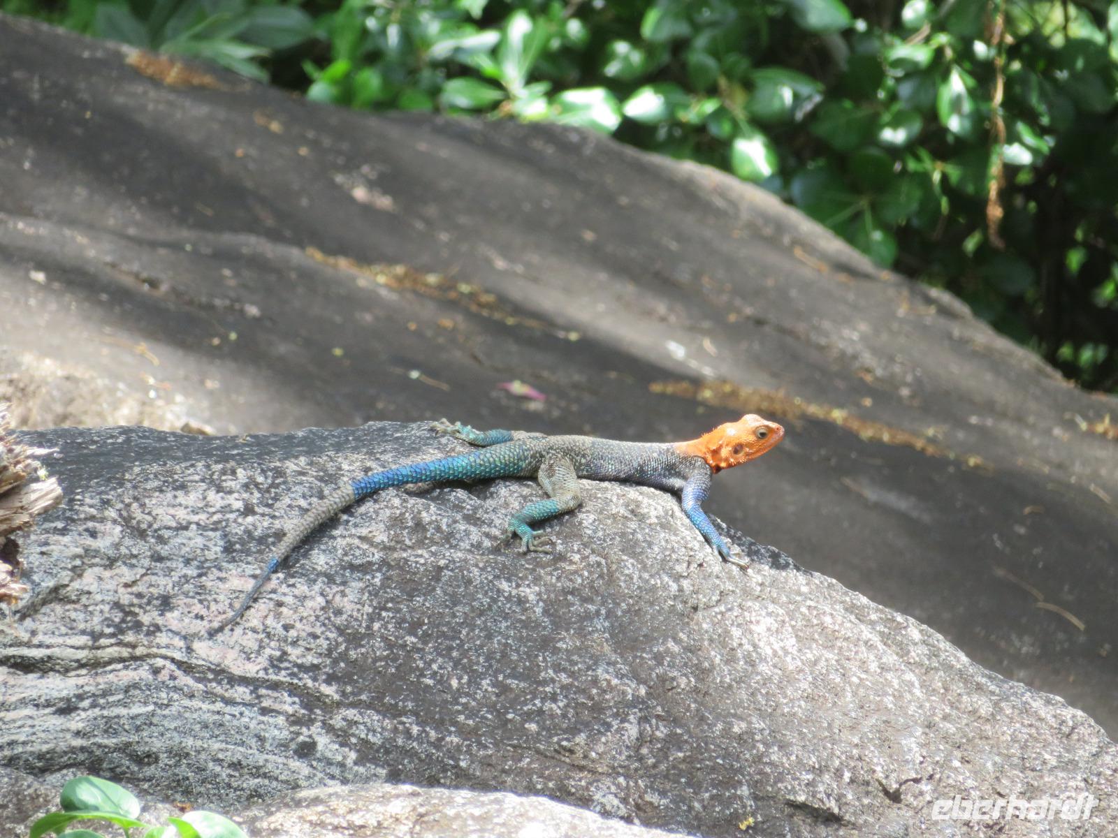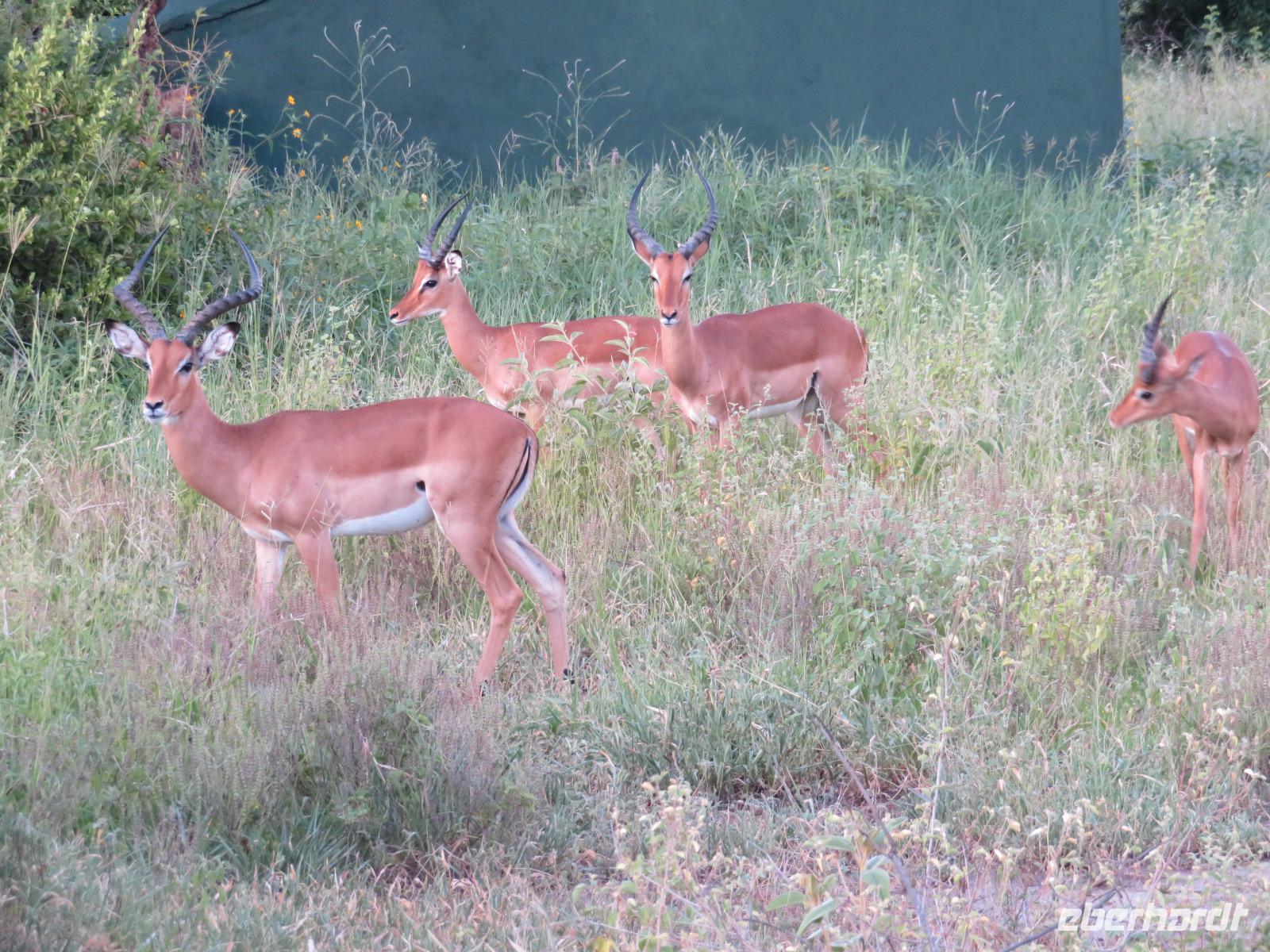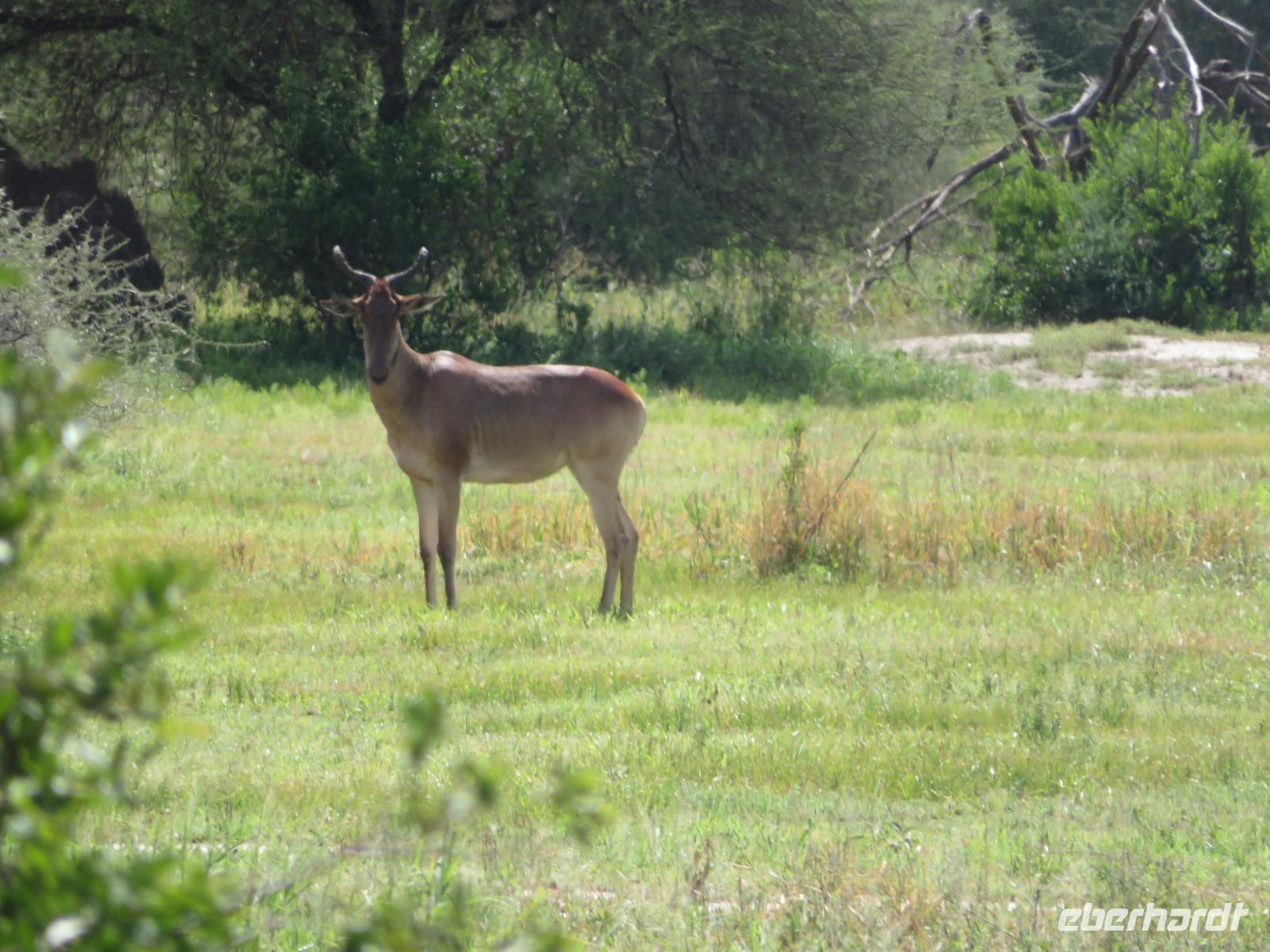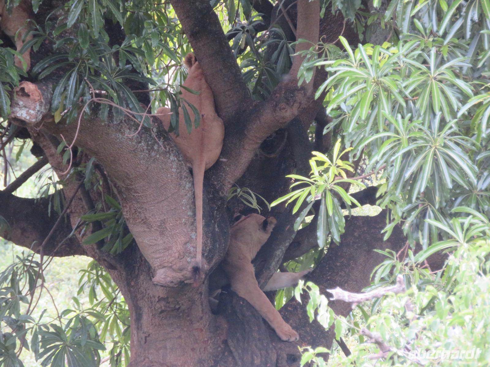 Wir haben die Nacht alle gut verbracht und starten gut gelaunt in den neuen Tag. Nach einem zeitigen Frühstück starten wir zur nächsten Pirschfahrt in den Park. Gleich zu Beginn begegnen uns wieder Impalas und Wasserböcke. Uns beeindrucken aber auch die riesigen Baobab-Bäume. Diese können bis zu 2.500 Jahre alt werden und sind sehr imposant. Leider sehen wir zunächst nur verschiedene Vögel, wie Kronenkraniche, Adler, Gaukler und Glanzstare. Die großen Tiere lassen noch auf sich warten. Doch bald sehen wir Giraffen und Strauße. Kleine, ganz reizend aussehende Dikdiks, die kleinste Antilopenart, kreuzen unseren Weg. Und auch einen Springschliefer, eine seltene kleine Antilopenart entdecken wir auf einem Stein. Plötzlich hören wir regen Funkverkehr zwischen den Rangern von verschiedenen Fahrzeugen. Nach einer kurzen Toiletten-Pause geht die Fahrt nun etwas zügiger. Irgendetwas haben die Ranger entdeckt. Wir lassen Giraffen, Sträuße und verschiedene Vögel erst mal links liegen. Am Rand des großen Sumpfgebietes des Tranagire- Nationalparks haben die Ranger Löwen entdeckt. Drei stattliche Löwenherren - vermutlich Brüder - liegen in der Sonne und dösen vor sich hin. Wir können bis auf wenige Meter an den König der Tiere ranfahren. Vermutlich haben sie am Morgen eine Antilope gerissen und sind nun satt. Ein tolles Erlebnis mit wunderschönen Bildern. Nun geht es zurück und wir beobachten dabei noch Hornvögel, Störche und Zebramangusten. Am Picknickplatz mit herrlicher Aussicht über das große Sumpfgebiet zaubern unsere beiden Fahrer ein vorzügliches Mittagessen aus dem Auto. Die Küchencrew der Lodge hatte uns ein wunderbares Menü mitgegeben. Dieses wurde uns stilecht mit Tischdecke und Geschirr serviert. Wir waren begeistert. Gut gestärkt treten wir nun die Rückfahrt Richtung Lodge an. Unterwegs sehen wir nochmals Giraffen, Zebras und immer wieder auch Impalas und Warzenschweine. Kurz vor dem Verlassen des Parks stoßen wir auf eine Elefantenmama mit ihren Kindern. Wunderschön war es anzusehen, wie diese imposanten Tiere mit ihren großen Ohren schlagen und sich damit Kühlung verschaffen. Zum Abschluss sehen wir eine ganze Familie blauer Meerkatzen durch die Bäume toben. Wir sind uns einig: es war eine herrliche Pirschfahrt, auch wenn wir in der Mittagszeit nicht allzu viele Tiere gesehen haben. Bis zum Abendessen blieb noch Zeit für eine Abkühlung im Pool oder einfach zum Genießen der herrlichen Landschaft von der Terrasse der Zelte aus.
