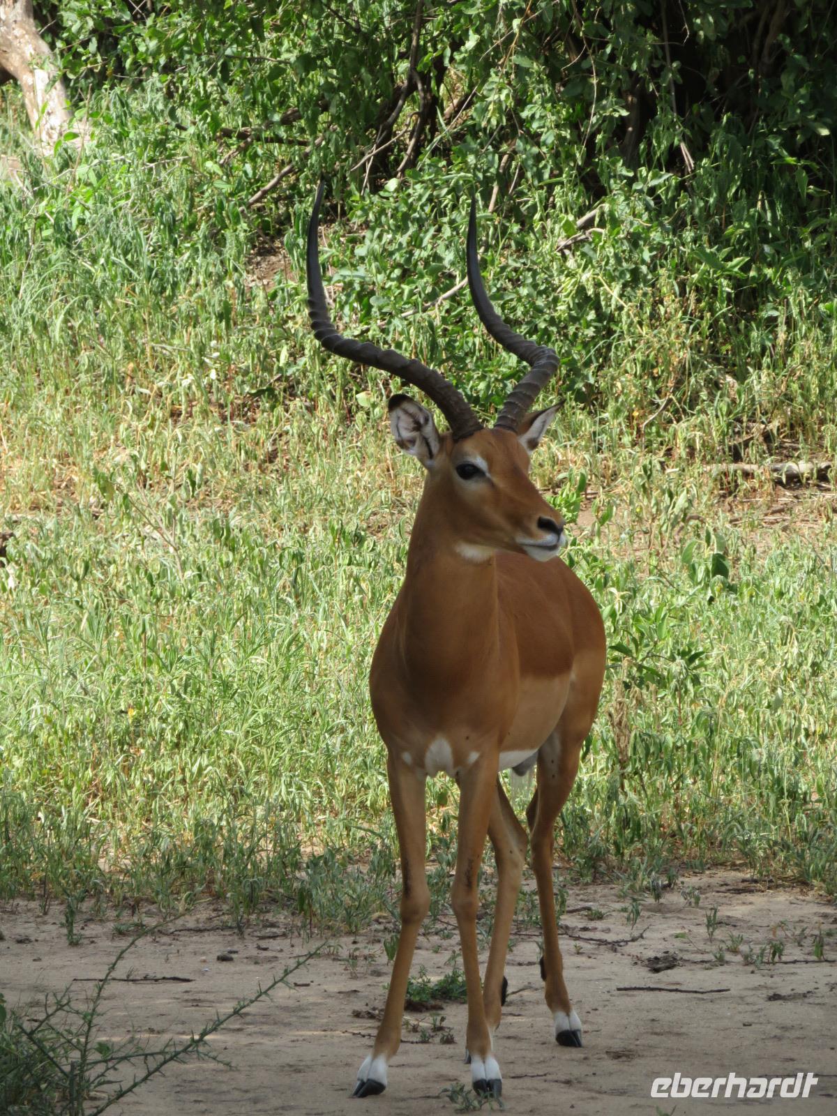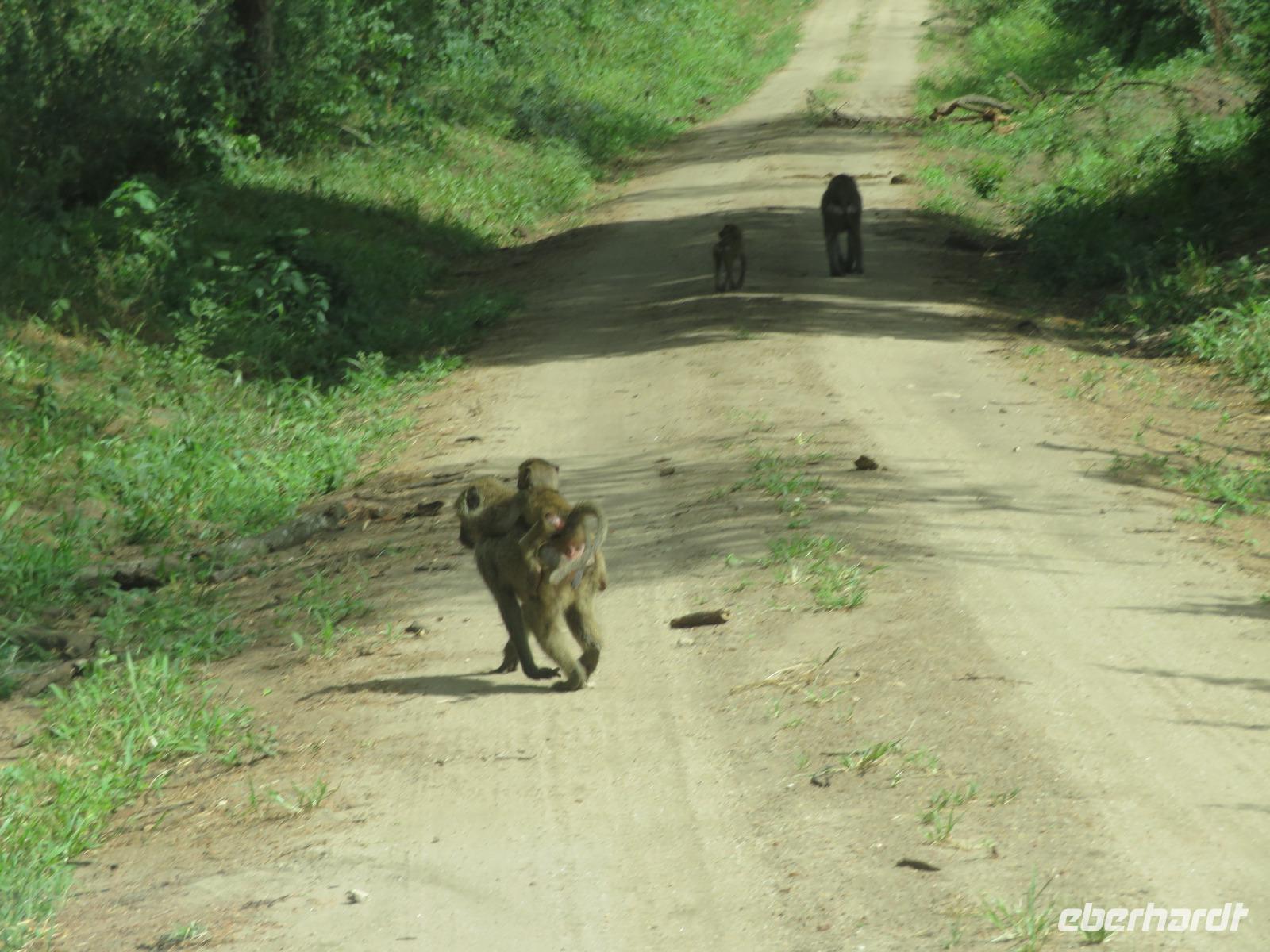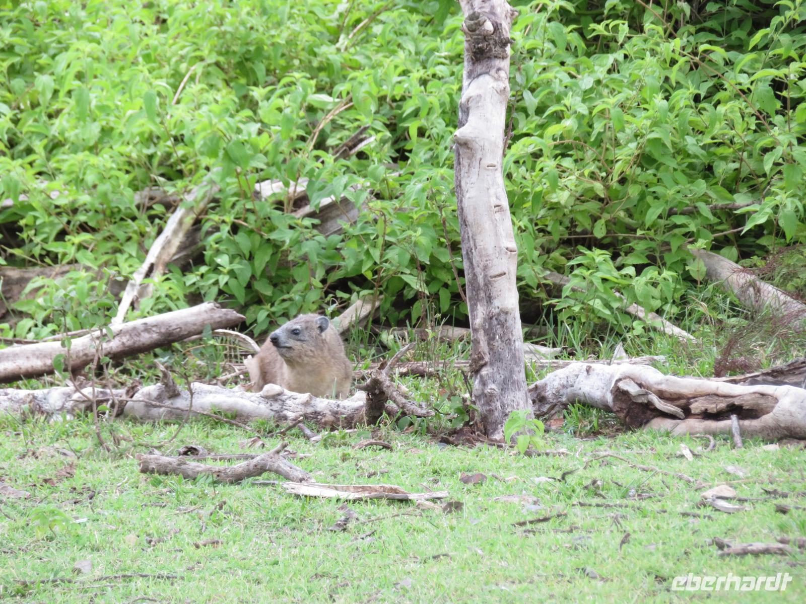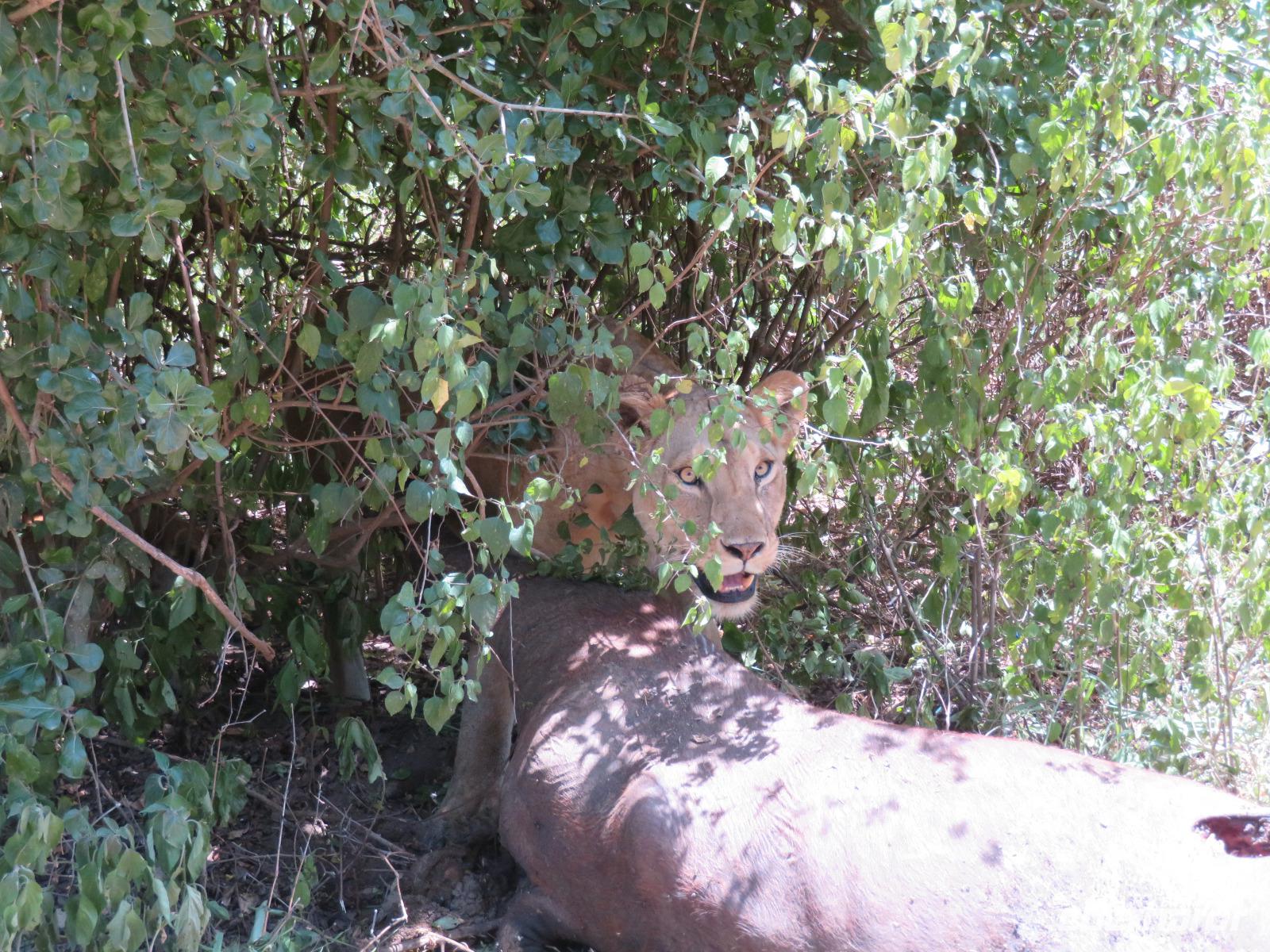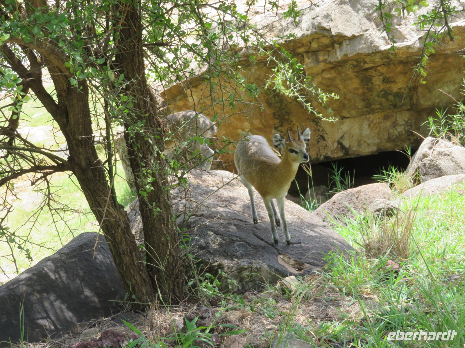 Wir haben die Nacht alle gut verbracht und starten gut gelaunt in den neuen Tag. Nach einem zeitigen Frühstück starten wir zur nächsten Pirschfahrt in den Park. Gleich zu Beginn begegnen uns wieder Impalas und Wasserböcke. Uns beeindrucken aber auch die riesigen Baobab-Bäume. Diese können bis zu 2.500 Jahre alt werden und sind sehr imposant. Leider sehen wir zunächst nur verschiedene Vögel, wie Kronenkraniche, Adler, Gaukler und Glanzstare. Die großen Tiere lassen noch auf sich warten. Doch bald sehen wir Giraffen und Strauße. Kleine, ganz reizend aussehende Dikdiks, die kleinste Antilopenart, kreuzen unseren Weg. Und auch einen Springschliefer, eine seltene kleine Antilopenart entdecken wir auf einem Stein. Plötzlich hören wir regen Funkverkehr zwischen den Rangern von verschiedenen Fahrzeugen. Nach einer kurzen Toiletten-Pause geht die Fahrt nun etwas zügiger. Irgendetwas haben die Ranger entdeckt. Wir lassen Giraffen, Sträuße und verschiedene Vögel erst mal links liegen. Am Rand des großen Sumpfgebietes des Tranagire- Nationalparks haben die Ranger Löwen entdeckt. Drei stattliche Löwenherren - vermutlich Brüder - liegen in der Sonne und dösen vor sich hin. Wir können bis auf wenige Meter an den König der Tiere ranfahren. Vermutlich haben sie am Morgen eine Antilope gerissen und sind nun satt. Ein tolles Erlebnis mit wunderschönen Bildern. Nun geht es zurück und wir beobachten dabei noch Hornvögel, Störche und Zebramangusten. Am Picknickplatz mit herrlicher Aussicht über das große Sumpfgebiet zaubern unsere beiden Fahrer ein vorzügliches Mittagessen aus dem Auto. Die Küchencrew der Lodge hatte uns ein wunderbares Menü mitgegeben. Dieses wurde uns stilecht mit Tischdecke und Geschirr serviert. Wir waren begeistert. Gut gestärkt treten wir nun die Rückfahrt Richtung Lodge an. Unterwegs sehen wir nochmals Giraffen, Zebras und immer wieder auch Impalas und Warzenschweine. Kurz vor dem Verlassen des Parks stoßen wir auf eine Elefantenmama mit ihren Kindern. Wunderschön war es anzusehen, wie diese imposanten Tiere mit ihren großen Ohren schlagen und sich damit Kühlung verschaffen. Zum Abschluss sehen wir eine ganze Familie blauer Meerkatzen durch die Bäume toben. Wir sind uns einig: es war eine herrliche Pirschfahrt, auch wenn wir in der Mittagszeit nicht allzu viele Tiere gesehen haben. Bis zum Abendessen blieb noch Zeit für eine Abkühlung im Pool oder einfach zum Genießen der herrlichen Landschaft von der Terrasse der Zelte aus.