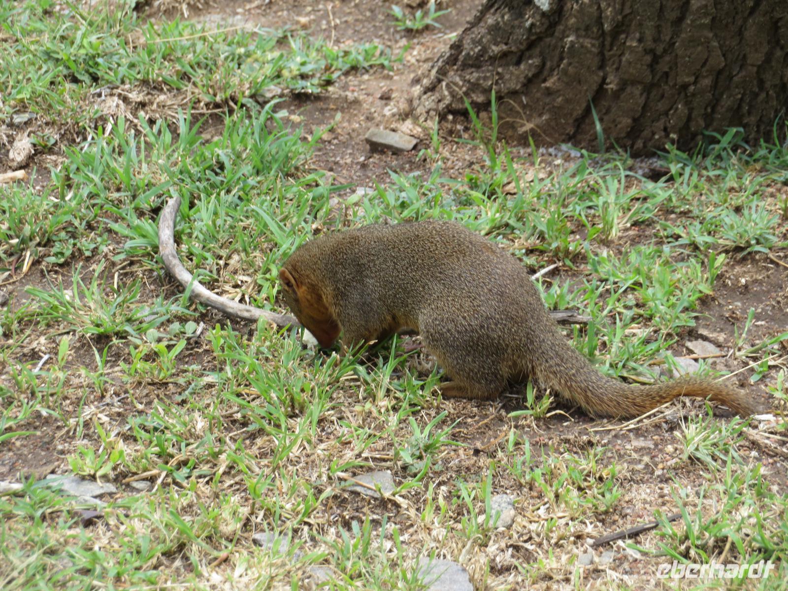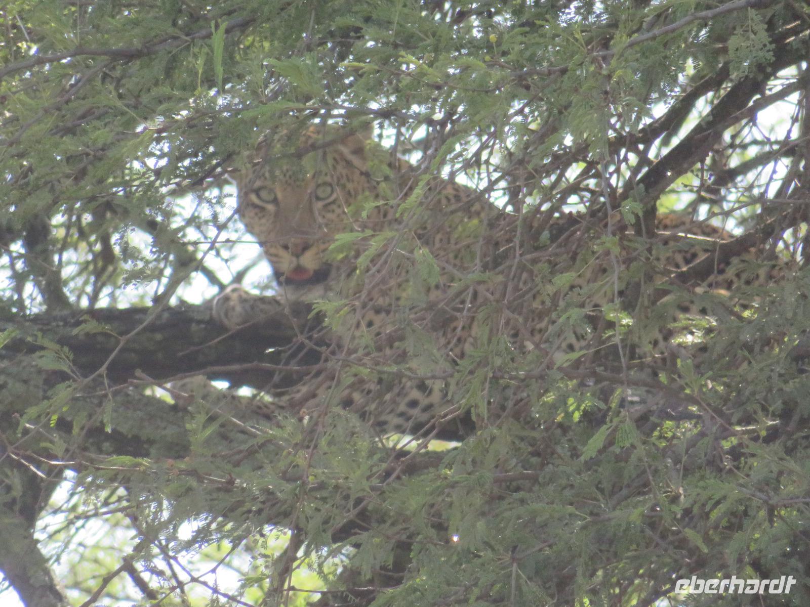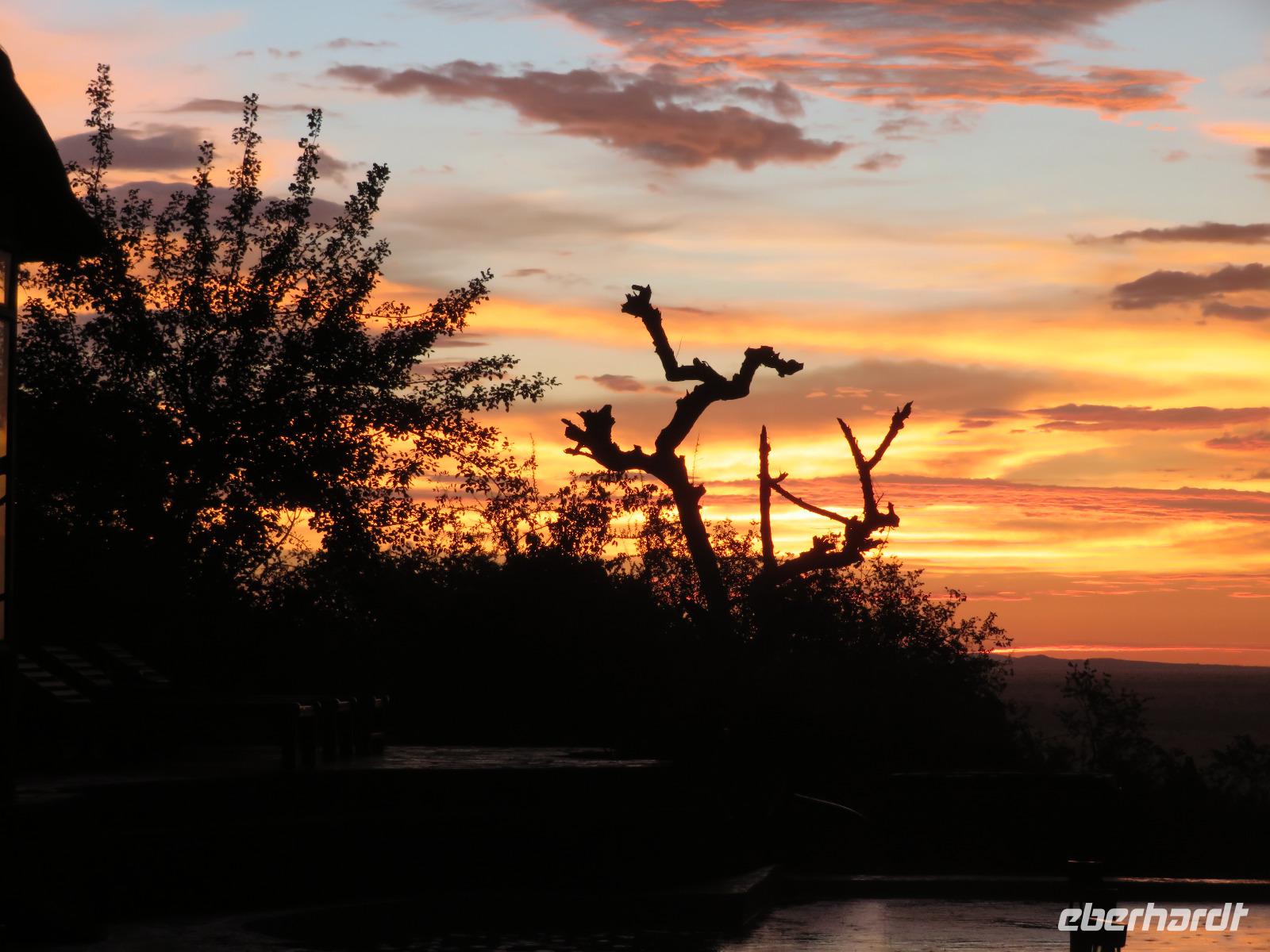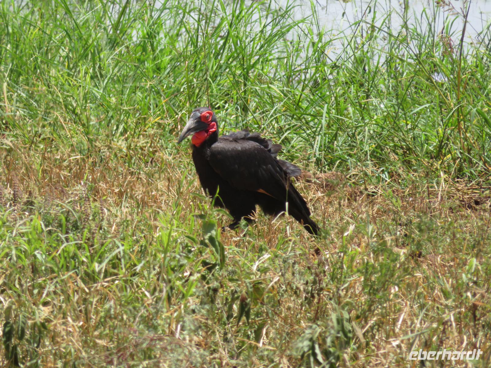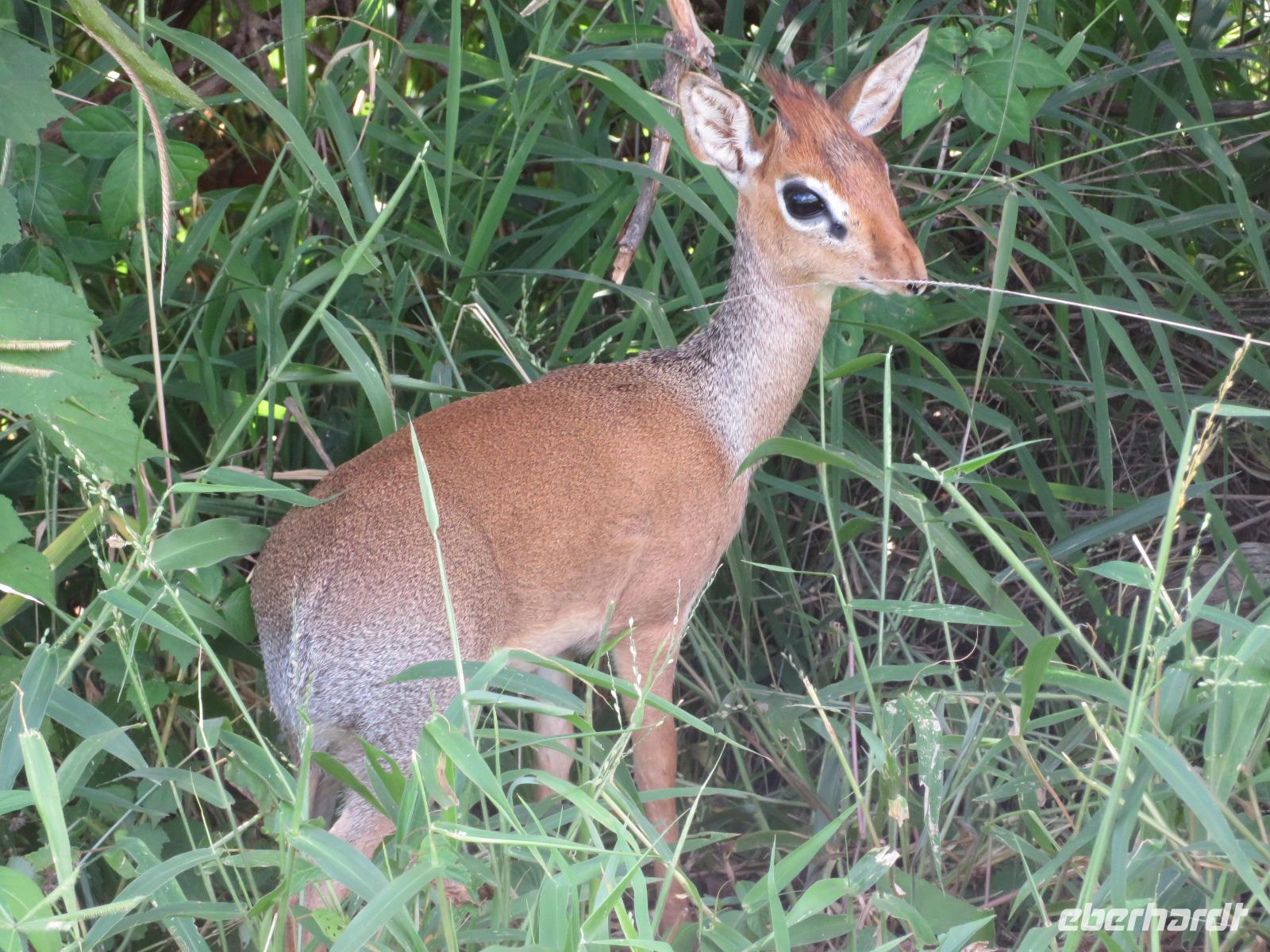 Wir haben die Nacht alle gut verbracht und starten gut gelaunt in den neuen Tag. Nach einem zeitigen Frühstück starten wir zur nächsten Pirschfahrt in den Park. Gleich zu Beginn begegnen uns wieder Impalas und Wasserböcke. Uns beeindrucken aber auch die riesigen Baobab-Bäume. Diese können bis zu 2.500 Jahre alt werden und sind sehr imposant. Leider sehen wir zunächst nur verschiedene Vögel, wie Kronenkraniche, Adler, Gaukler und Glanzstare. Die großen Tiere lassen noch auf sich warten. Doch bald sehen wir Giraffen und Strauße. Kleine, ganz reizend aussehende Dikdiks, die kleinste Antilopenart, kreuzen unseren Weg. Und auch einen Springschliefer, eine seltene kleine Antilopenart entdecken wir auf einem Stein. Plötzlich hören wir regen Funkverkehr zwischen den Rangern von verschiedenen Fahrzeugen. Nach einer kurzen Toiletten-Pause geht die Fahrt nun etwas zügiger. Irgendetwas haben die Ranger entdeckt. Wir lassen Giraffen, Sträuße und verschiedene Vögel erst mal links liegen. Am Rand des großen Sumpfgebietes des Tranagire- Nationalparks haben die Ranger Löwen entdeckt. Drei stattliche Löwenherren - vermutlich Brüder - liegen in der Sonne und dösen vor sich hin. Wir können bis auf wenige Meter an den König der Tiere ranfahren. Vermutlich haben sie am Morgen eine Antilope gerissen und sind nun satt. Ein tolles Erlebnis mit wunderschönen Bildern. Nun geht es zurück und wir beobachten dabei noch Hornvögel, Störche und Zebramangusten. Am Picknickplatz mit herrlicher Aussicht über das große Sumpfgebiet zaubern unsere beiden Fahrer ein vorzügliches Mittagessen aus dem Auto. Die Küchencrew der Lodge hatte uns ein wunderbares Menü mitgegeben. Dieses wurde uns stilecht mit Tischdecke und Geschirr serviert. Wir waren begeistert. Gut gestärkt treten wir nun die Rückfahrt Richtung Lodge an. Unterwegs sehen wir nochmals Giraffen, Zebras und immer wieder auch Impalas und Warzenschweine. Kurz vor dem Verlassen des Parks stoßen wir auf eine Elefantenmama mit ihren Kindern. Wunderschön war es anzusehen, wie diese imposanten Tiere mit ihren großen Ohren schlagen und sich damit Kühlung verschaffen. Zum Abschluss sehen wir eine ganze Familie blauer Meerkatzen durch die Bäume toben. Wir sind uns einig: es war eine herrliche Pirschfahrt, auch wenn wir in der Mittagszeit nicht allzu viele Tiere gesehen haben. Bis zum Abendessen blieb noch Zeit für eine Abkühlung im Pool oder einfach zum Genießen der herrlichen Landschaft von der Terrasse der Zelte aus.