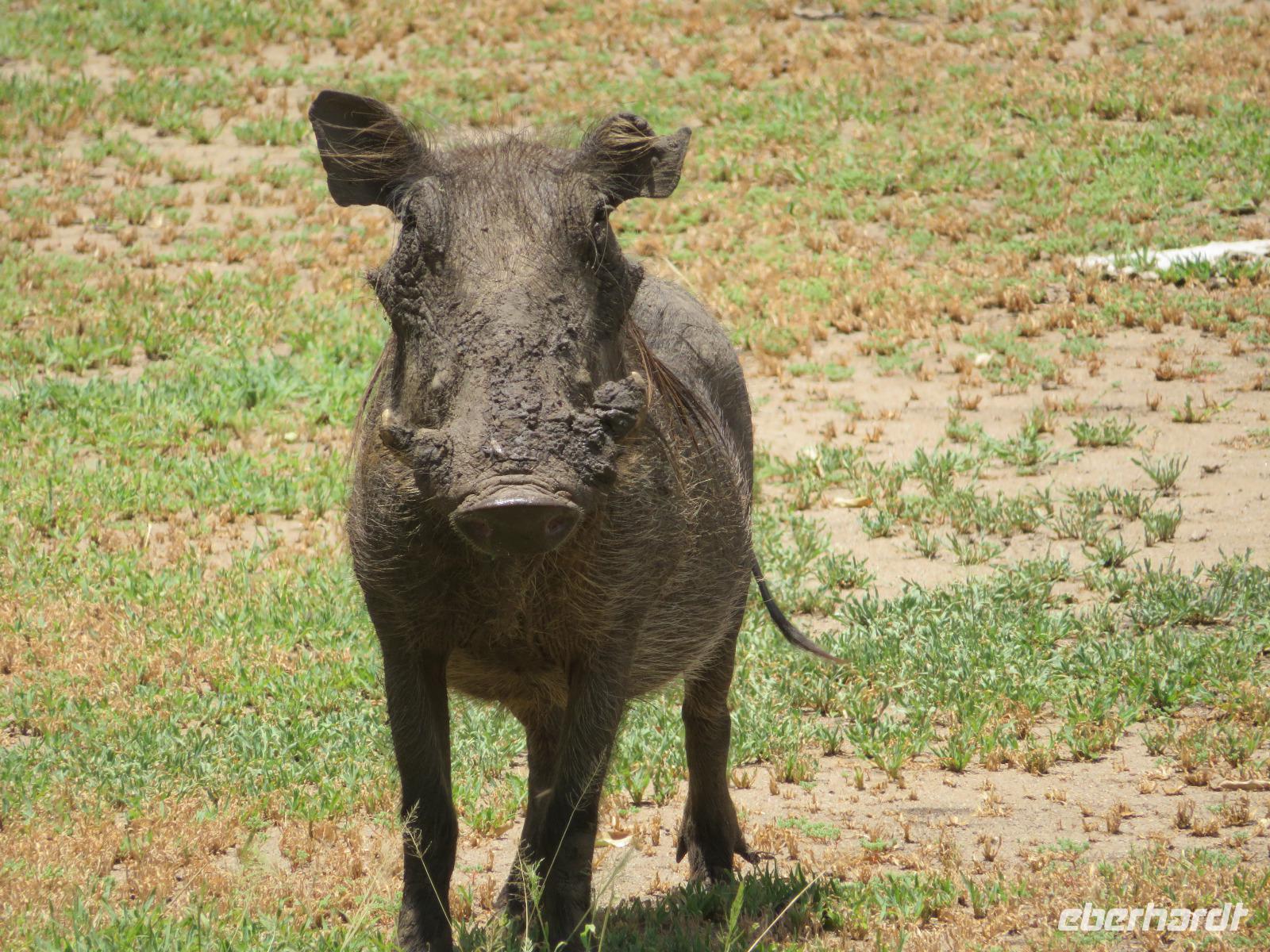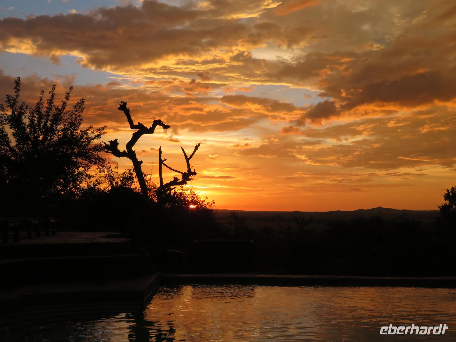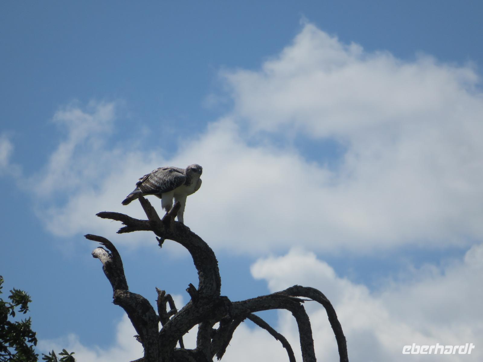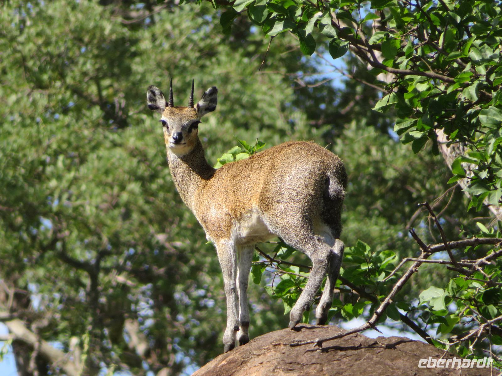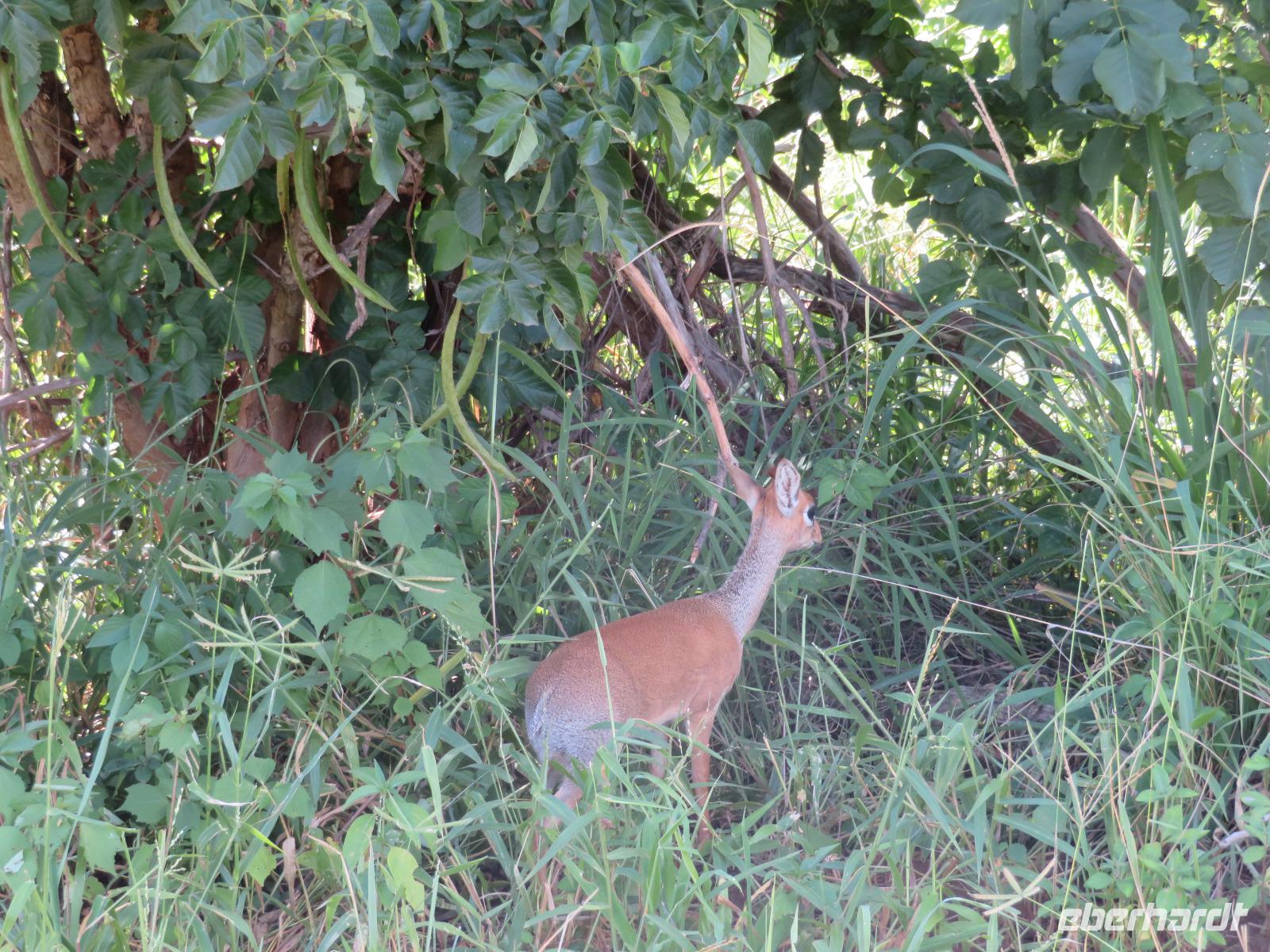 Wir haben die Nacht alle gut verbracht und starten gut gelaunt in den neuen Tag. Nach einem zeitigen Frühstück starten wir zur nächsten Pirschfahrt in den Park. Gleich zu Beginn begegnen uns wieder Impalas und Wasserböcke. Uns beeindrucken aber auch die riesigen Baobab-Bäume. Diese können bis zu 2.500 Jahre alt werden und sind sehr imposant. Leider sehen wir zunächst nur verschiedene Vögel, wie Kronenkraniche, Adler, Gaukler und Glanzstare. Die großen Tiere lassen noch auf sich warten. Doch bald sehen wir Giraffen und Strauße. Kleine, ganz reizend aussehende Dikdiks, die kleinste Antilopenart, kreuzen unseren Weg. Und auch einen Springschliefer, eine seltene kleine Antilopenart entdecken wir auf einem Stein. Plötzlich hören wir regen Funkverkehr zwischen den Rangern von verschiedenen Fahrzeugen. Nach einer kurzen Toiletten-Pause geht die Fahrt nun etwas zügiger. Irgendetwas haben die Ranger entdeckt. Wir lassen Giraffen, Sträuße und verschiedene Vögel erst mal links liegen. Am Rand des großen Sumpfgebietes des Tranagire- Nationalparks haben die Ranger Löwen entdeckt. Drei stattliche Löwenherren - vermutlich Brüder - liegen in der Sonne und dösen vor sich hin. Wir können bis auf wenige Meter an den König der Tiere ranfahren. Vermutlich haben sie am Morgen eine Antilope gerissen und sind nun satt. Ein tolles Erlebnis mit wunderschönen Bildern. Nun geht es zurück und wir beobachten dabei noch Hornvögel, Störche und Zebramangusten. Am Picknickplatz mit herrlicher Aussicht über das große Sumpfgebiet zaubern unsere beiden Fahrer ein vorzügliches Mittagessen aus dem Auto. Die Küchencrew der Lodge hatte uns ein wunderbares Menü mitgegeben. Dieses wurde uns stilecht mit Tischdecke und Geschirr serviert. Wir waren begeistert. Gut gestärkt treten wir nun die Rückfahrt Richtung Lodge an. Unterwegs sehen wir nochmals Giraffen, Zebras und immer wieder auch Impalas und Warzenschweine. Kurz vor dem Verlassen des Parks stoßen wir auf eine Elefantenmama mit ihren Kindern. Wunderschön war es anzusehen, wie diese imposanten Tiere mit ihren großen Ohren schlagen und sich damit Kühlung verschaffen. Zum Abschluss sehen wir eine ganze Familie blauer Meerkatzen durch die Bäume toben. Wir sind uns einig: es war eine herrliche Pirschfahrt, auch wenn wir in der Mittagszeit nicht allzu viele Tiere gesehen haben. Bis zum Abendessen blieb noch Zeit für eine Abkühlung im Pool oder einfach zum Genießen der herrlichen Landschaft von der Terrasse der Zelte aus.