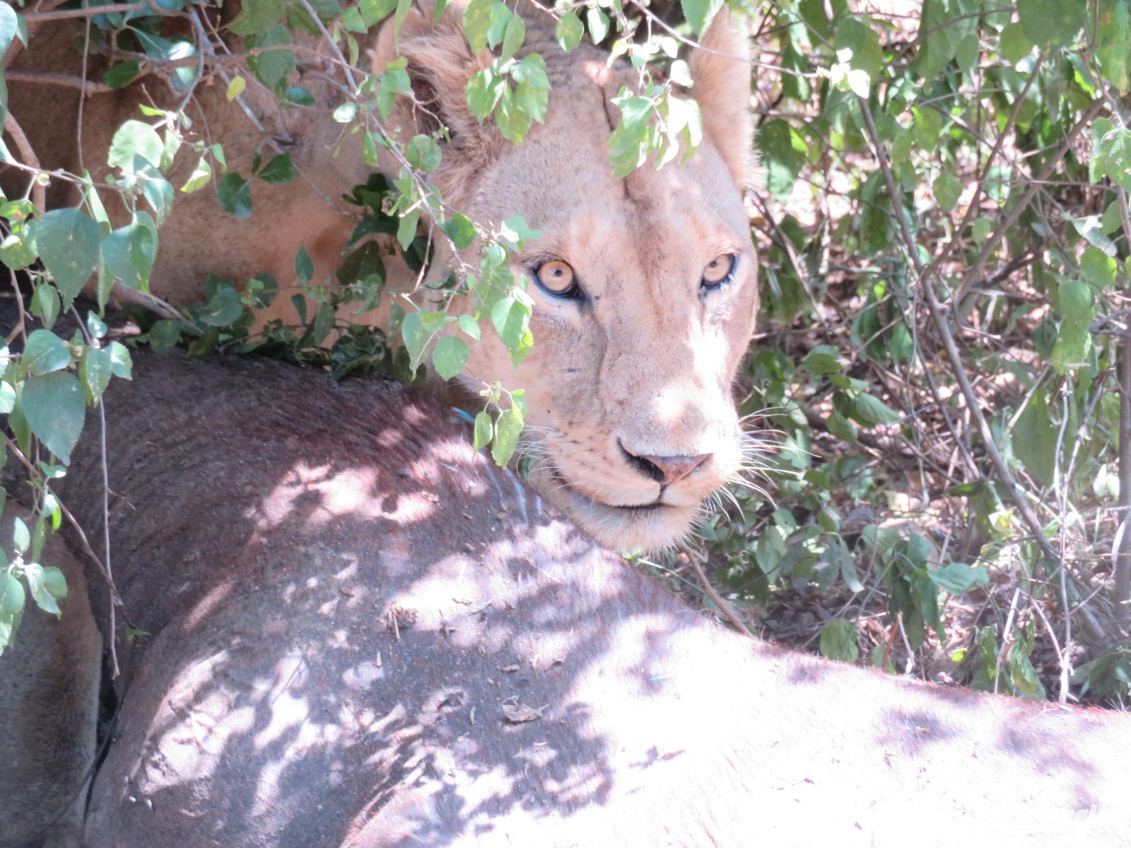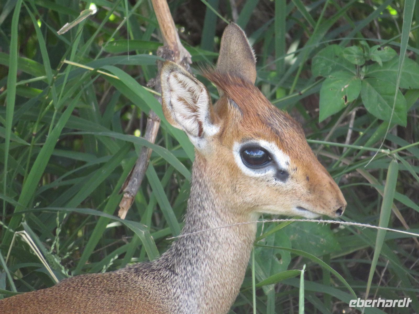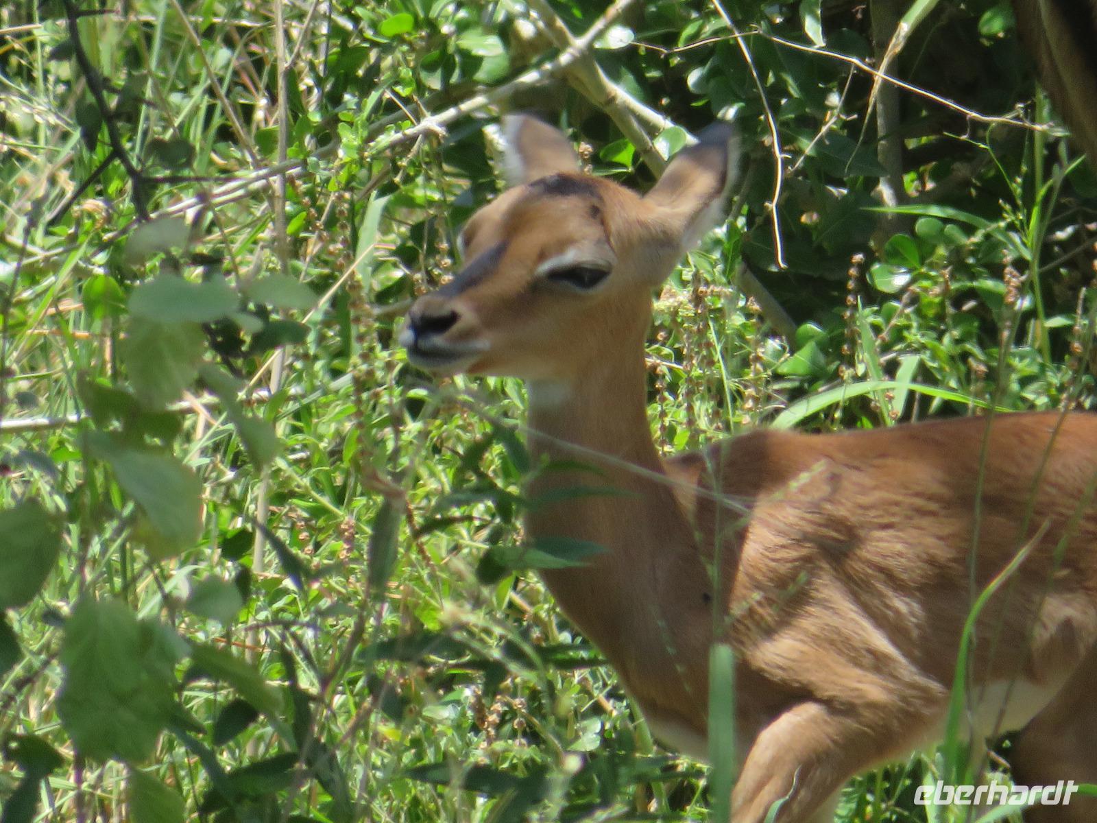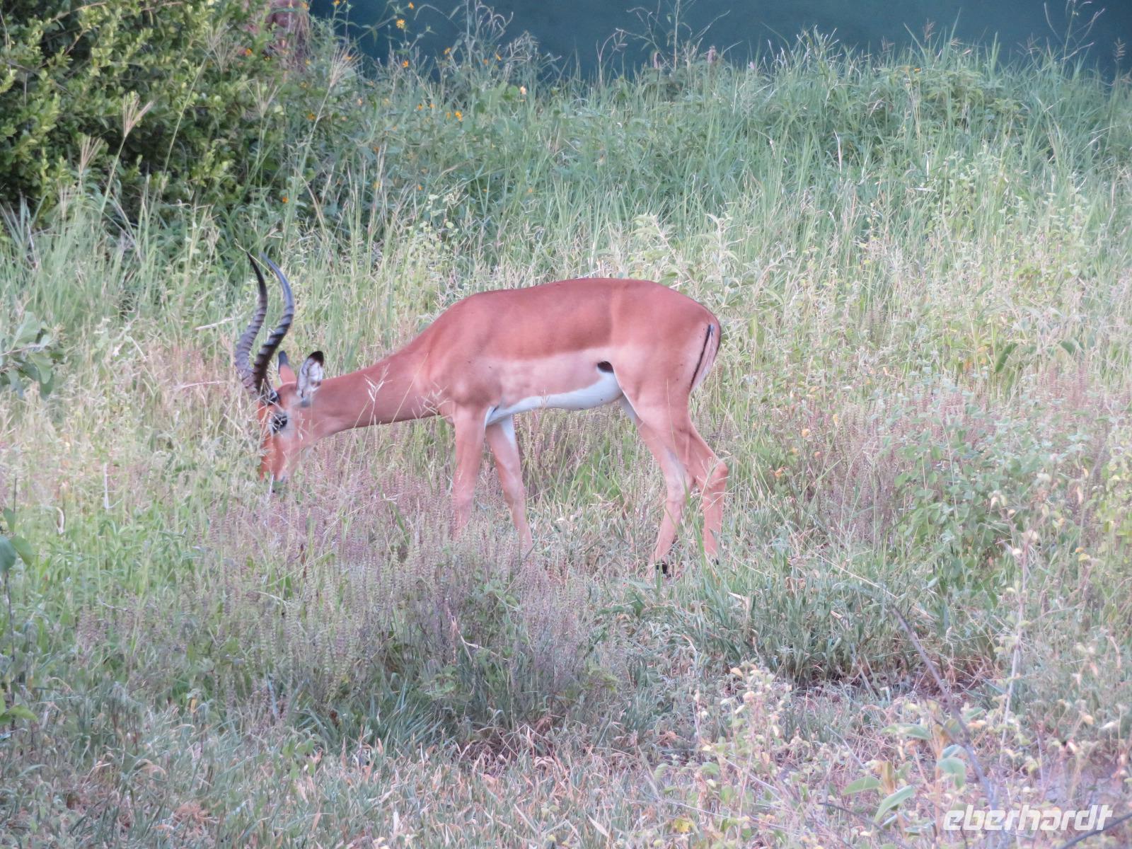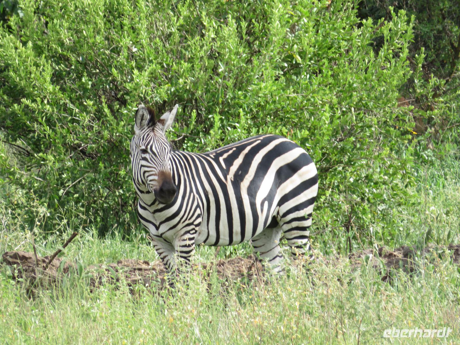 Wir haben die Nacht alle gut verbracht und starten gut gelaunt in den neuen Tag. Nach einem zeitigen Frühstück starten wir zur nächsten Pirschfahrt in den Park. Gleich zu Beginn begegnen uns wieder Impalas und Wasserböcke. Uns beeindrucken aber auch die riesigen Baobab-Bäume. Diese können bis zu 2.500 Jahre alt werden und sind sehr imposant. Leider sehen wir zunächst nur verschiedene Vögel, wie Kronenkraniche, Adler, Gaukler und Glanzstare. Die großen Tiere lassen noch auf sich warten. Doch bald sehen wir Giraffen und Strauße. Kleine, ganz reizend aussehende Dikdiks, die kleinste Antilopenart, kreuzen unseren Weg. Und auch einen Springschliefer, eine seltene kleine Antilopenart entdecken wir auf einem Stein. Plötzlich hören wir regen Funkverkehr zwischen den Rangern von verschiedenen Fahrzeugen. Nach einer kurzen Toiletten-Pause geht die Fahrt nun etwas zügiger. Irgendetwas haben die Ranger entdeckt. Wir lassen Giraffen, Sträuße und verschiedene Vögel erst mal links liegen. Am Rand des großen Sumpfgebietes des Tranagire- Nationalparks haben die Ranger Löwen entdeckt. Drei stattliche Löwenherren - vermutlich Brüder - liegen in der Sonne und dösen vor sich hin. Wir können bis auf wenige Meter an den König der Tiere ranfahren. Vermutlich haben sie am Morgen eine Antilope gerissen und sind nun satt. Ein tolles Erlebnis mit wunderschönen Bildern. Nun geht es zurück und wir beobachten dabei noch Hornvögel, Störche und Zebramangusten. Am Picknickplatz mit herrlicher Aussicht über das große Sumpfgebiet zaubern unsere beiden Fahrer ein vorzügliches Mittagessen aus dem Auto. Die Küchencrew der Lodge hatte uns ein wunderbares Menü mitgegeben. Dieses wurde uns stilecht mit Tischdecke und Geschirr serviert. Wir waren begeistert. Gut gestärkt treten wir nun die Rückfahrt Richtung Lodge an. Unterwegs sehen wir nochmals Giraffen, Zebras und immer wieder auch Impalas und Warzenschweine. Kurz vor dem Verlassen des Parks stoßen wir auf eine Elefantenmama mit ihren Kindern. Wunderschön war es anzusehen, wie diese imposanten Tiere mit ihren großen Ohren schlagen und sich damit Kühlung verschaffen. Zum Abschluss sehen wir eine ganze Familie blauer Meerkatzen durch die Bäume toben. Wir sind uns einig: es war eine herrliche Pirschfahrt, auch wenn wir in der Mittagszeit nicht allzu viele Tiere gesehen haben. Bis zum Abendessen blieb noch Zeit für eine Abkühlung im Pool oder einfach zum Genießen der herrlichen Landschaft von der Terrasse der Zelte aus.