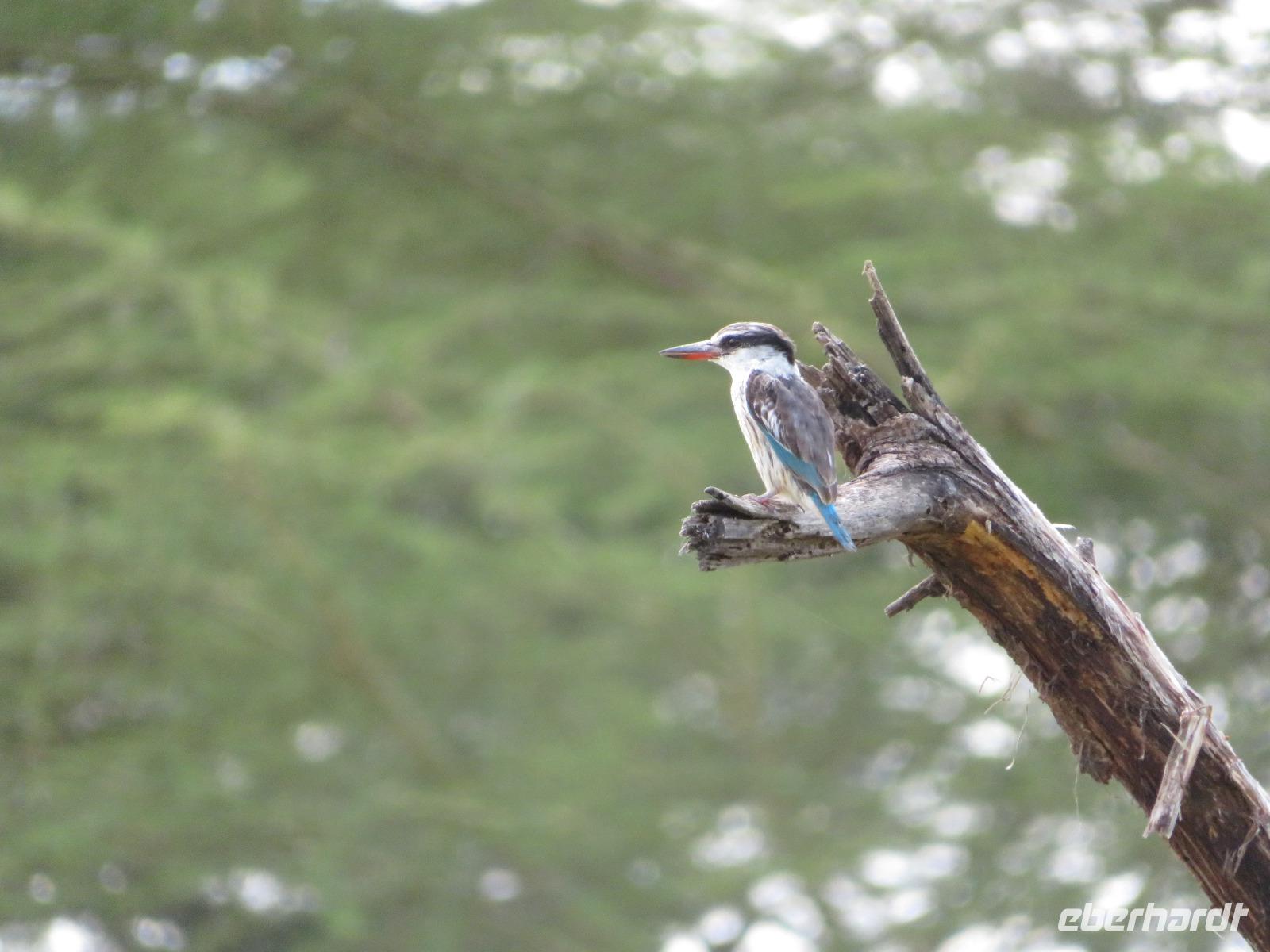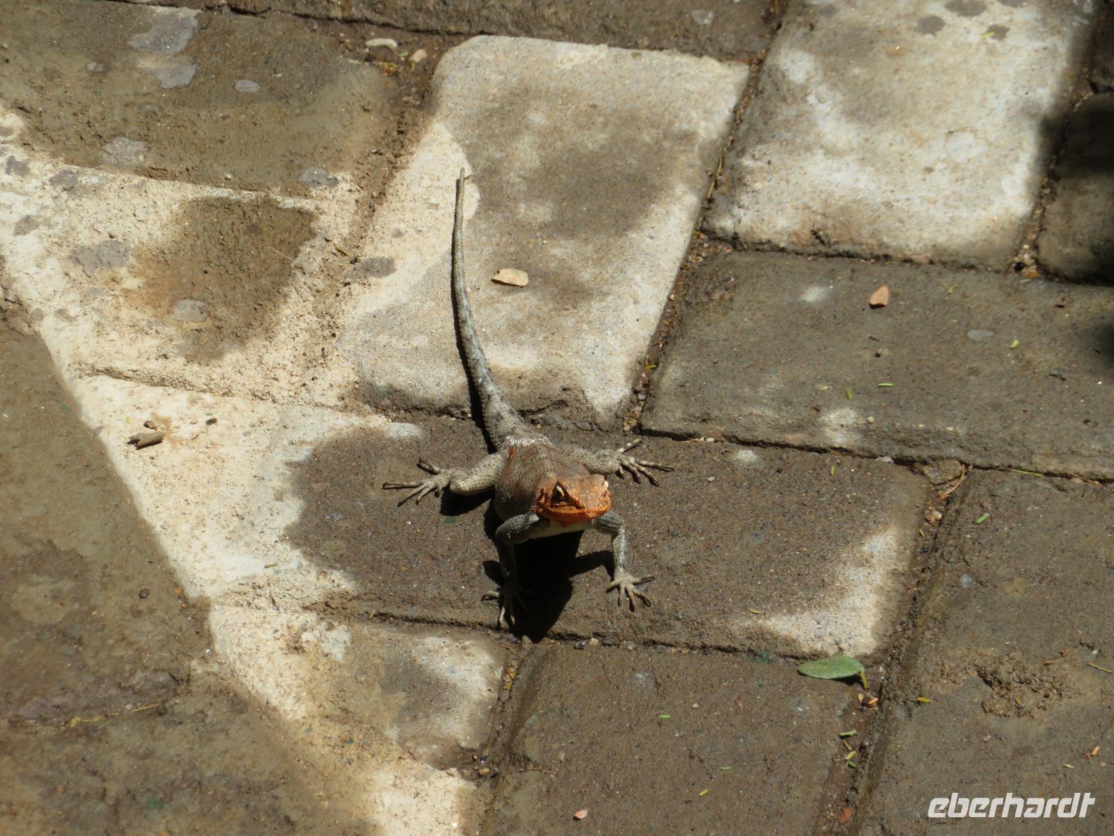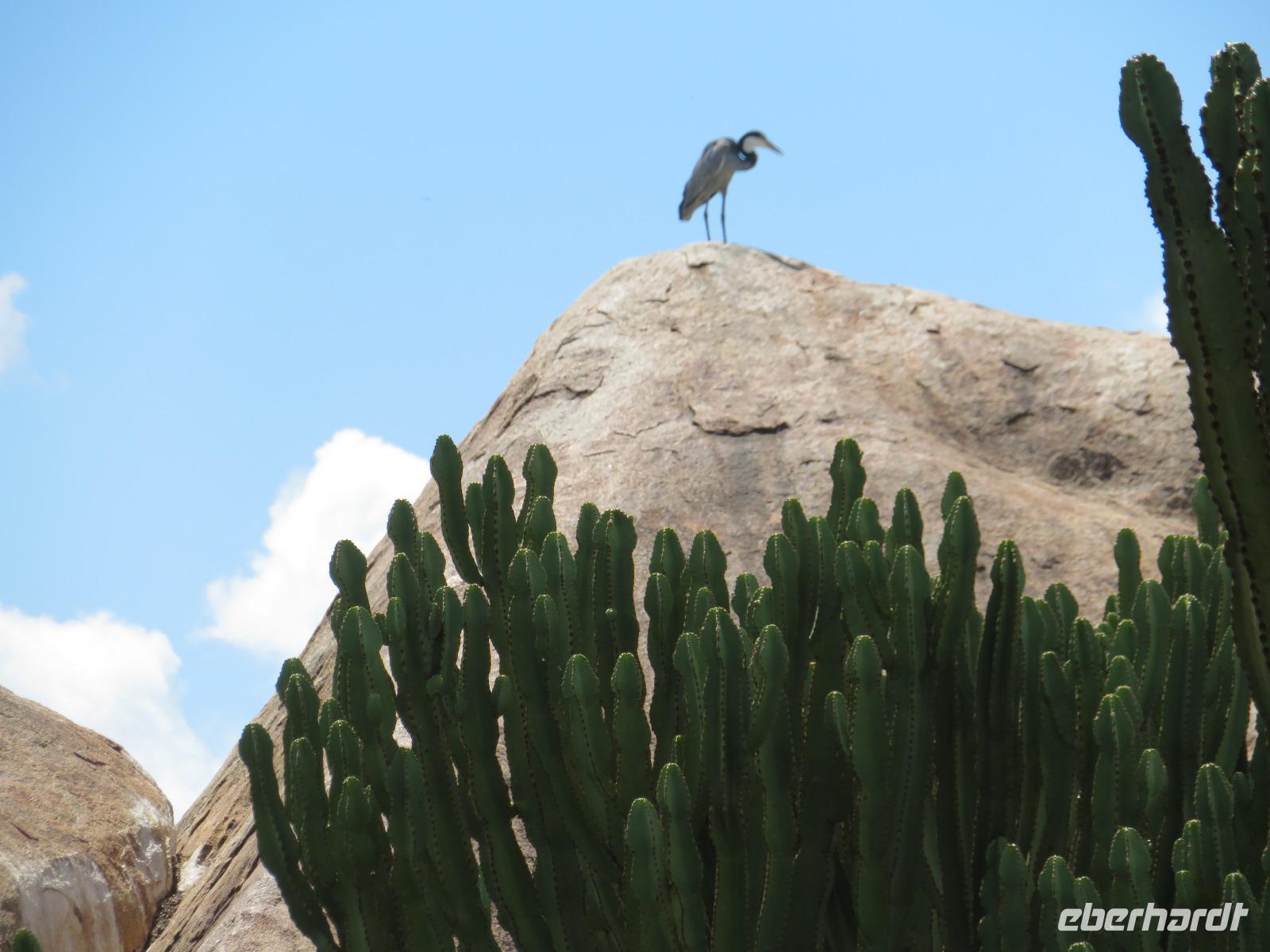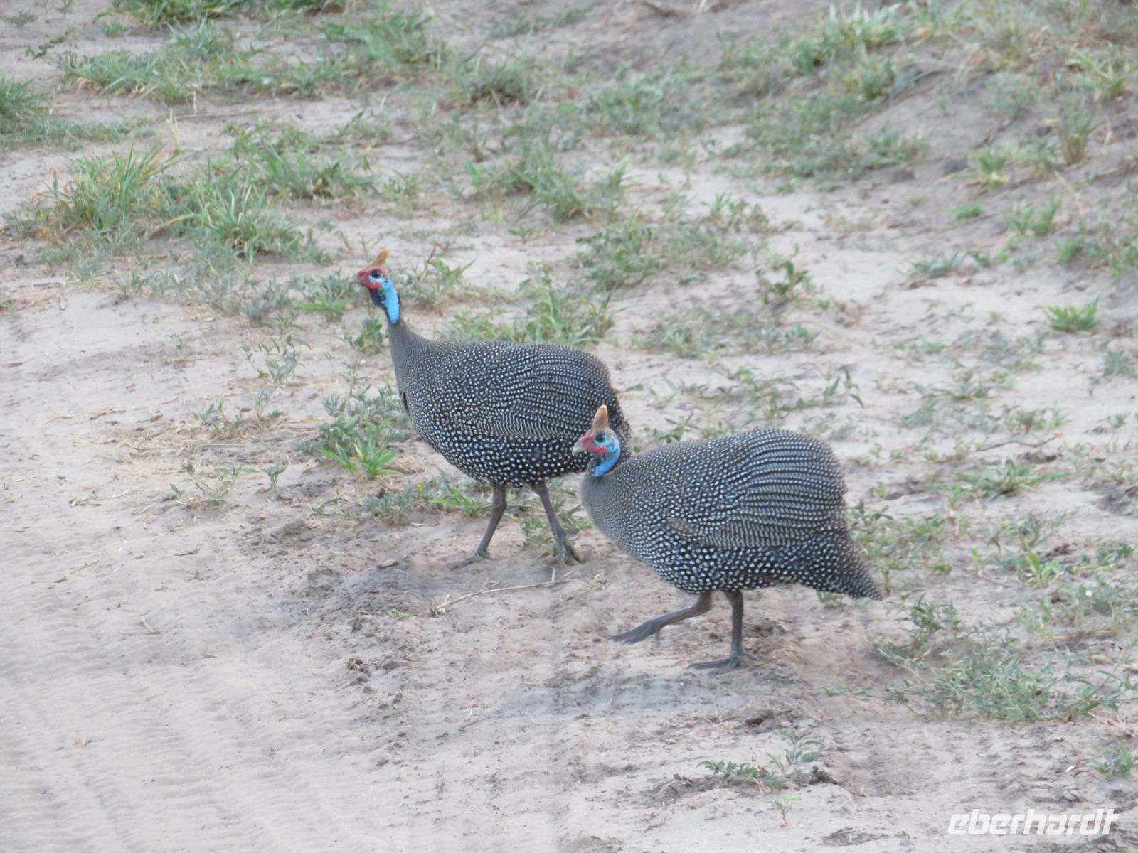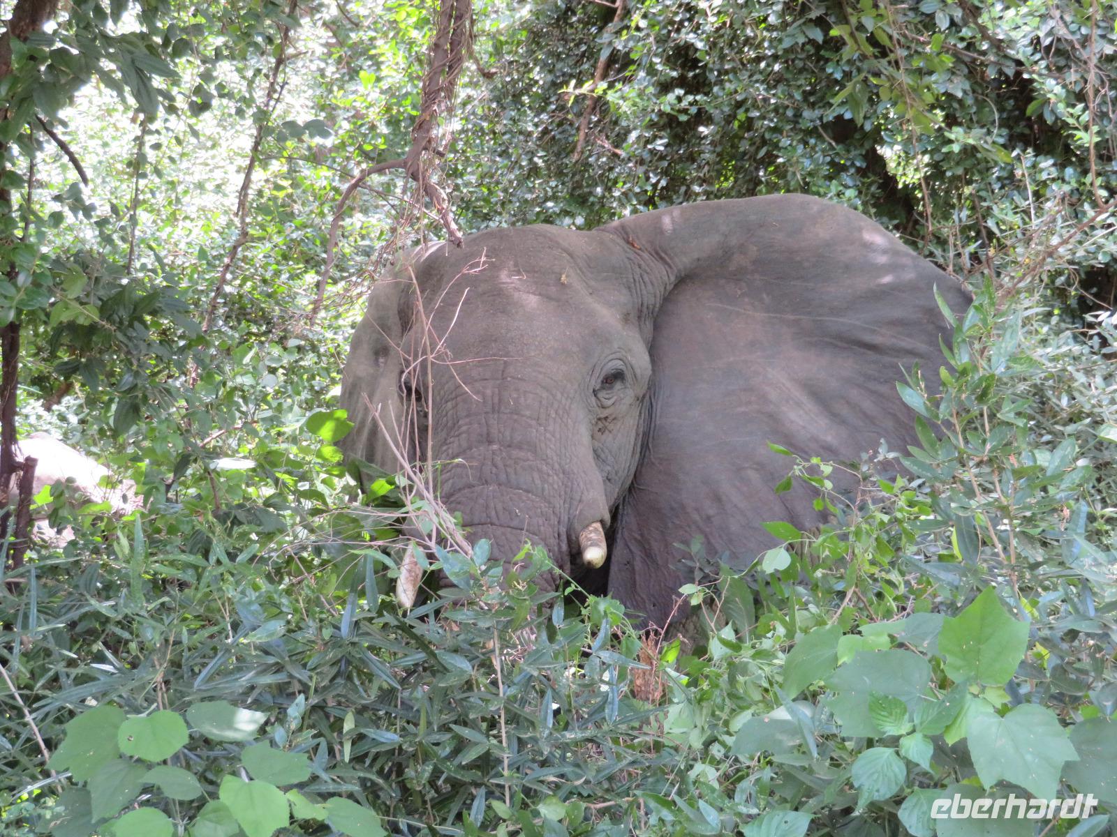 Wir haben die Nacht alle gut verbracht und starten gut gelaunt in den neuen Tag. Nach einem zeitigen Frühstück starten wir zur nächsten Pirschfahrt in den Park. Gleich zu Beginn begegnen uns wieder Impalas und Wasserböcke. Uns beeindrucken aber auch die riesigen Baobab-Bäume. Diese können bis zu 2.500 Jahre alt werden und sind sehr imposant. Leider sehen wir zunächst nur verschiedene Vögel, wie Kronenkraniche, Adler, Gaukler und Glanzstare. Die großen Tiere lassen noch auf sich warten. Doch bald sehen wir Giraffen und Strauße. Kleine, ganz reizend aussehende Dikdiks, die kleinste Antilopenart, kreuzen unseren Weg. Und auch einen Springschliefer, eine seltene kleine Antilopenart entdecken wir auf einem Stein. Plötzlich hören wir regen Funkverkehr zwischen den Rangern von verschiedenen Fahrzeugen. Nach einer kurzen Toiletten-Pause geht die Fahrt nun etwas zügiger. Irgendetwas haben die Ranger entdeckt. Wir lassen Giraffen, Sträuße und verschiedene Vögel erst mal links liegen. Am Rand des großen Sumpfgebietes des Tranagire- Nationalparks haben die Ranger Löwen entdeckt. Drei stattliche Löwenherren - vermutlich Brüder - liegen in der Sonne und dösen vor sich hin. Wir können bis auf wenige Meter an den König der Tiere ranfahren. Vermutlich haben sie am Morgen eine Antilope gerissen und sind nun satt. Ein tolles Erlebnis mit wunderschönen Bildern. Nun geht es zurück und wir beobachten dabei noch Hornvögel, Störche und Zebramangusten. Am Picknickplatz mit herrlicher Aussicht über das große Sumpfgebiet zaubern unsere beiden Fahrer ein vorzügliches Mittagessen aus dem Auto. Die Küchencrew der Lodge hatte uns ein wunderbares Menü mitgegeben. Dieses wurde uns stilecht mit Tischdecke und Geschirr serviert. Wir waren begeistert. Gut gestärkt treten wir nun die Rückfahrt Richtung Lodge an. Unterwegs sehen wir nochmals Giraffen, Zebras und immer wieder auch Impalas und Warzenschweine. Kurz vor dem Verlassen des Parks stoßen wir auf eine Elefantenmama mit ihren Kindern. Wunderschön war es anzusehen, wie diese imposanten Tiere mit ihren großen Ohren schlagen und sich damit Kühlung verschaffen. Zum Abschluss sehen wir eine ganze Familie blauer Meerkatzen durch die Bäume toben. Wir sind uns einig: es war eine herrliche Pirschfahrt, auch wenn wir in der Mittagszeit nicht allzu viele Tiere gesehen haben. Bis zum Abendessen blieb noch Zeit für eine Abkühlung im Pool oder einfach zum Genießen der herrlichen Landschaft von der Terrasse der Zelte aus.