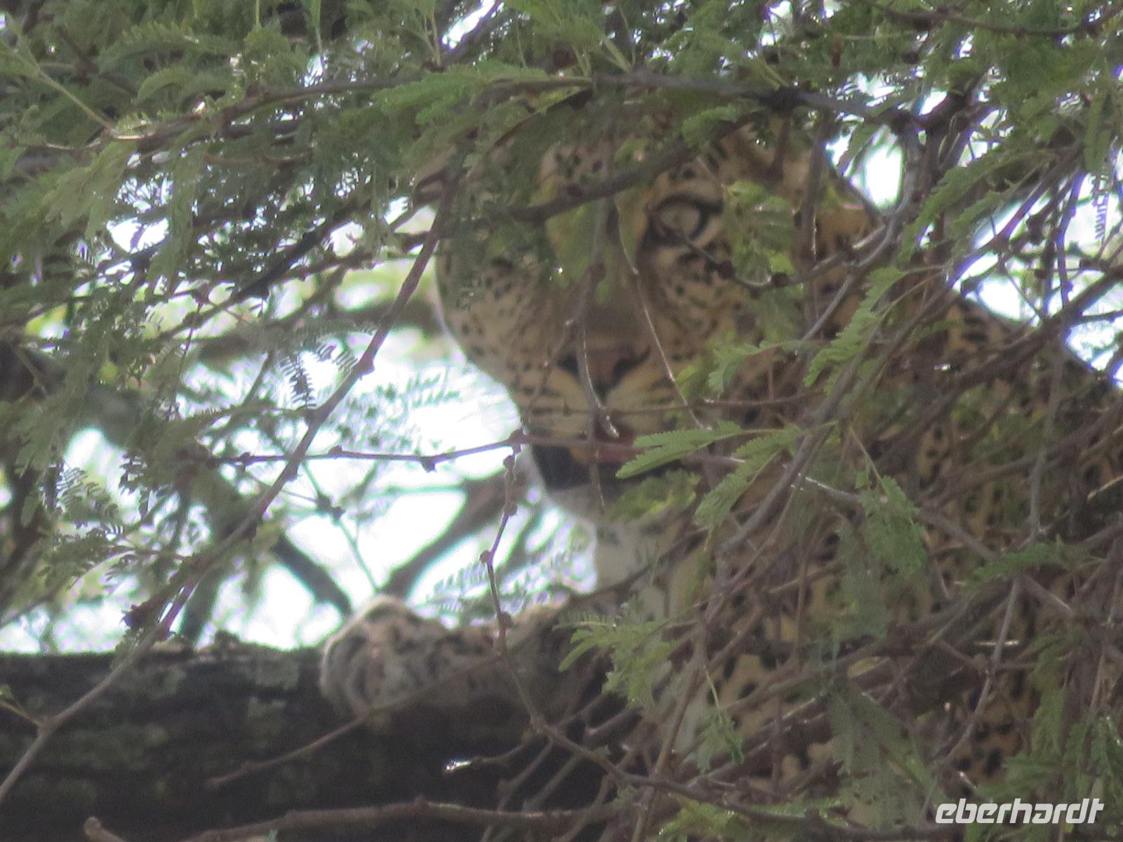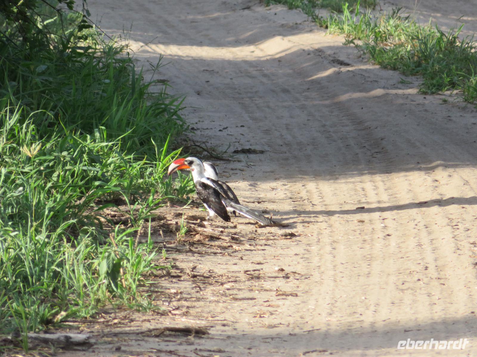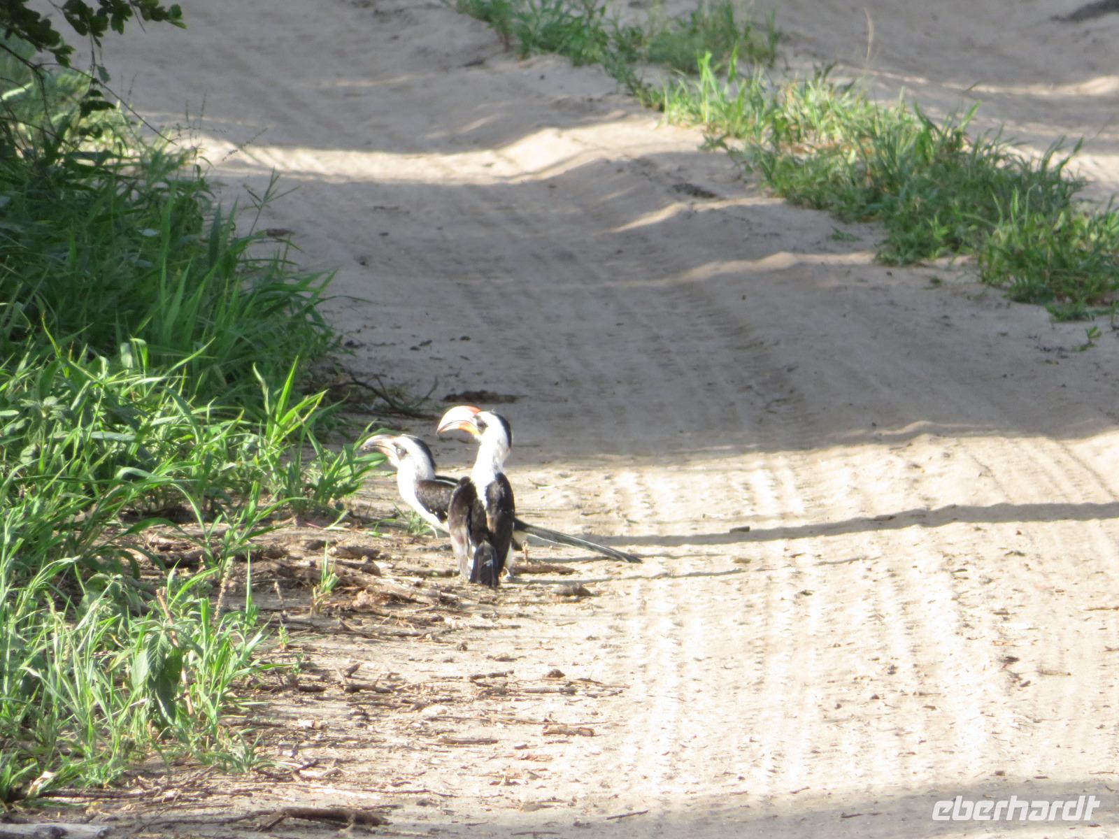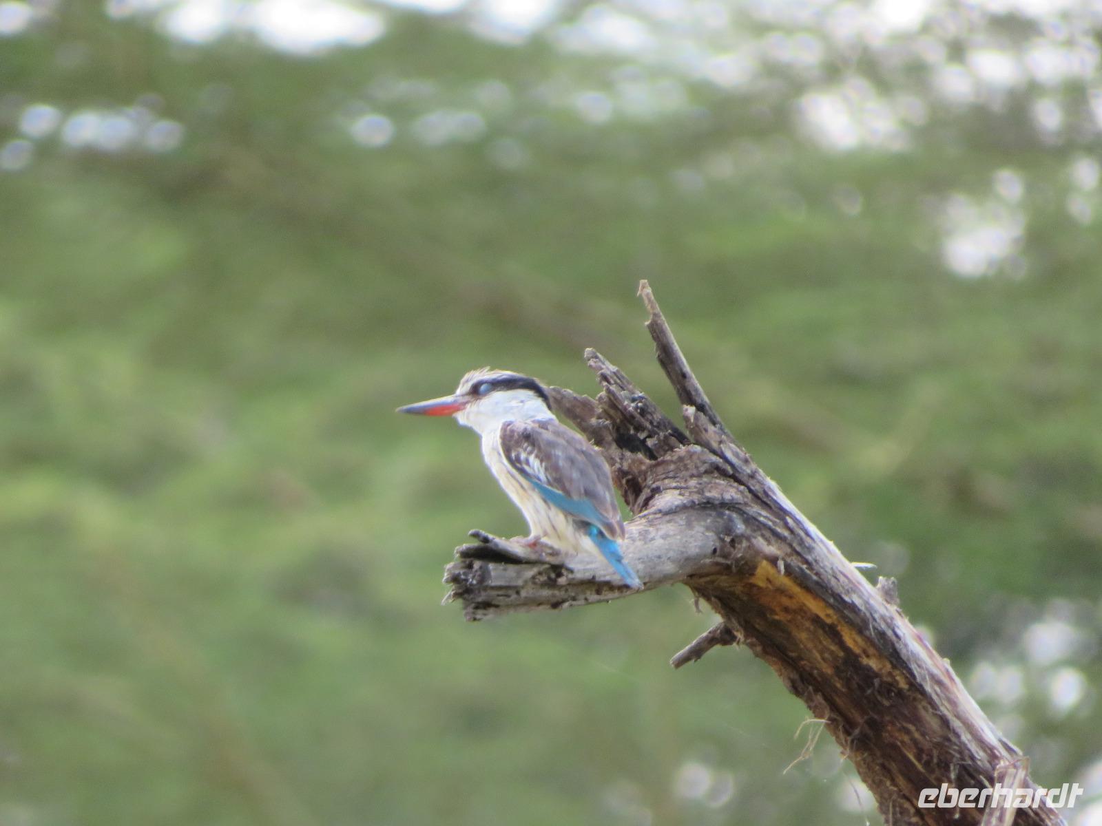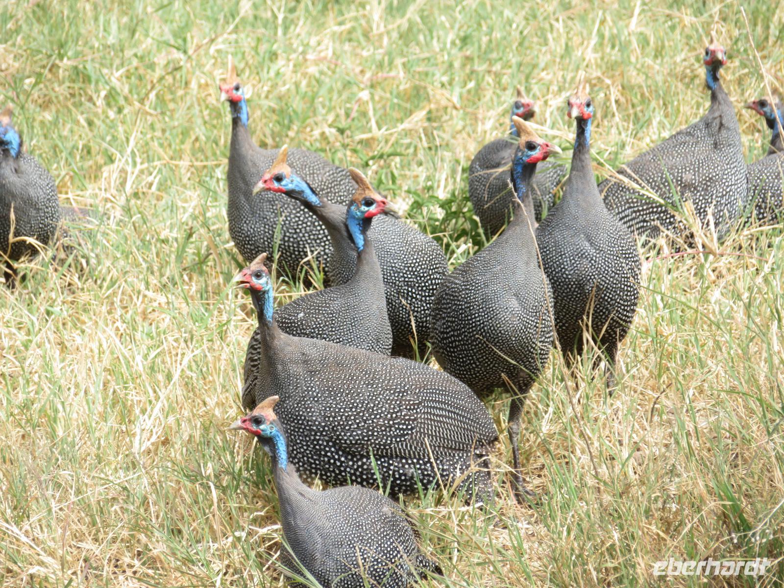 Wir haben die Nacht alle gut verbracht und starten gut gelaunt in den neuen Tag. Nach einem zeitigen Frühstück starten wir zur nächsten Pirschfahrt in den Park. Gleich zu Beginn begegnen uns wieder Impalas und Wasserböcke. Uns beeindrucken aber auch die riesigen Baobab-Bäume. Diese können bis zu 2.500 Jahre alt werden und sind sehr imposant. Leider sehen wir zunächst nur verschiedene Vögel, wie Kronenkraniche, Adler, Gaukler und Glanzstare. Die großen Tiere lassen noch auf sich warten. Doch bald sehen wir Giraffen und Strauße. Kleine, ganz reizend aussehende Dikdiks, die kleinste Antilopenart, kreuzen unseren Weg. Und auch einen Springschliefer, eine seltene kleine Antilopenart entdecken wir auf einem Stein. Plötzlich hören wir regen Funkverkehr zwischen den Rangern von verschiedenen Fahrzeugen. Nach einer kurzen Toiletten-Pause geht die Fahrt nun etwas zügiger. Irgendetwas haben die Ranger entdeckt. Wir lassen Giraffen, Sträuße und verschiedene Vögel erst mal links liegen. Am Rand des großen Sumpfgebietes des Tranagire- Nationalparks haben die Ranger Löwen entdeckt. Drei stattliche Löwenherren - vermutlich Brüder - liegen in der Sonne und dösen vor sich hin. Wir können bis auf wenige Meter an den König der Tiere ranfahren. Vermutlich haben sie am Morgen eine Antilope gerissen und sind nun satt. Ein tolles Erlebnis mit wunderschönen Bildern. Nun geht es zurück und wir beobachten dabei noch Hornvögel, Störche und Zebramangusten. Am Picknickplatz mit herrlicher Aussicht über das große Sumpfgebiet zaubern unsere beiden Fahrer ein vorzügliches Mittagessen aus dem Auto. Die Küchencrew der Lodge hatte uns ein wunderbares Menü mitgegeben. Dieses wurde uns stilecht mit Tischdecke und Geschirr serviert. Wir waren begeistert. Gut gestärkt treten wir nun die Rückfahrt Richtung Lodge an. Unterwegs sehen wir nochmals Giraffen, Zebras und immer wieder auch Impalas und Warzenschweine. Kurz vor dem Verlassen des Parks stoßen wir auf eine Elefantenmama mit ihren Kindern. Wunderschön war es anzusehen, wie diese imposanten Tiere mit ihren großen Ohren schlagen und sich damit Kühlung verschaffen. Zum Abschluss sehen wir eine ganze Familie blauer Meerkatzen durch die Bäume toben. Wir sind uns einig: es war eine herrliche Pirschfahrt, auch wenn wir in der Mittagszeit nicht allzu viele Tiere gesehen haben. Bis zum Abendessen blieb noch Zeit für eine Abkühlung im Pool oder einfach zum Genießen der herrlichen Landschaft von der Terrasse der Zelte aus.