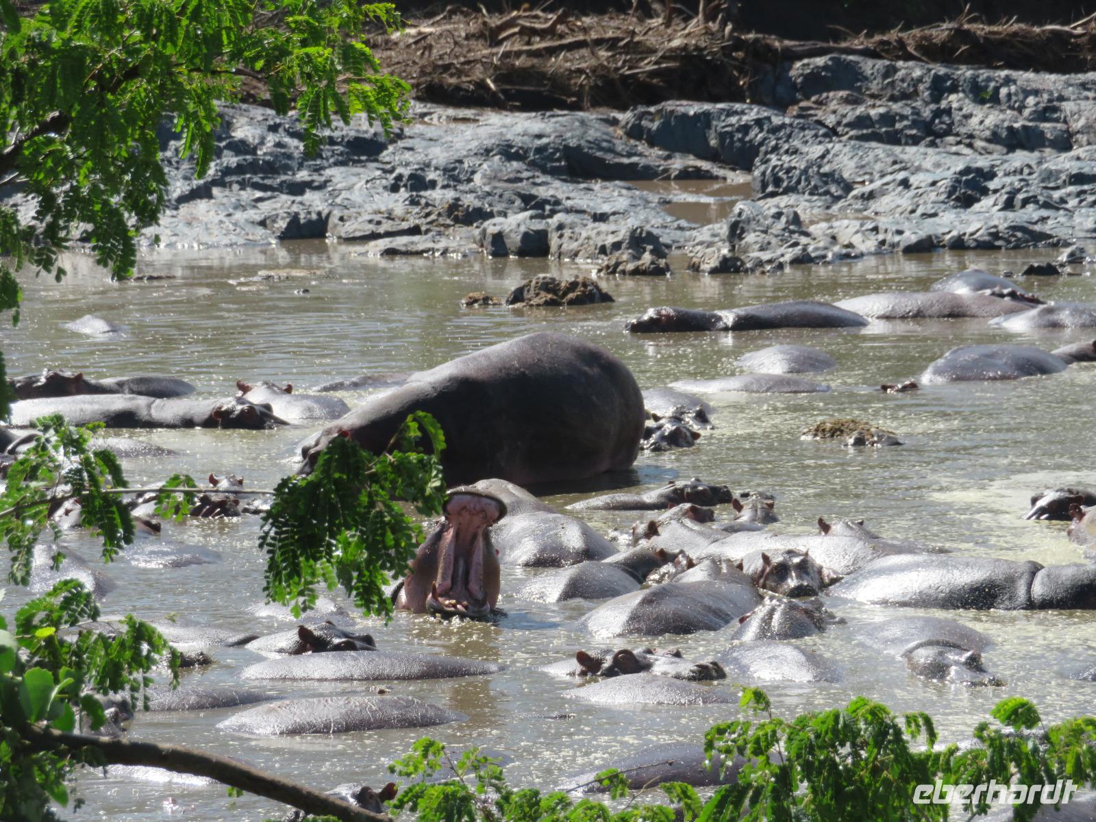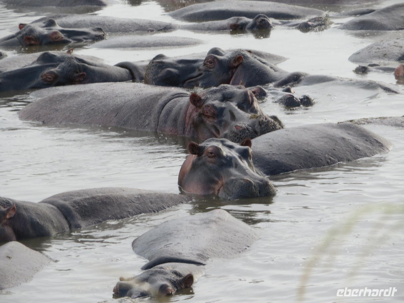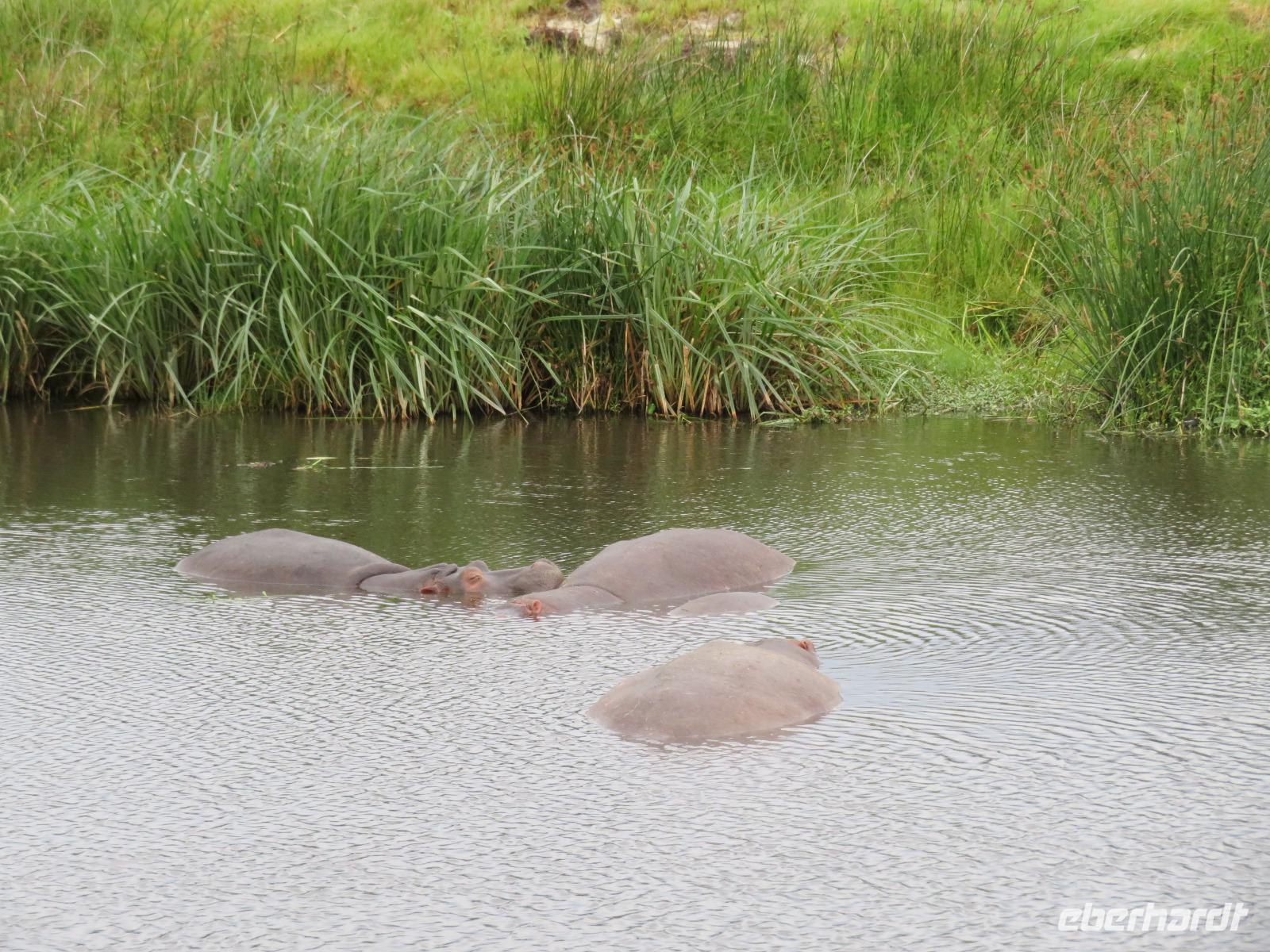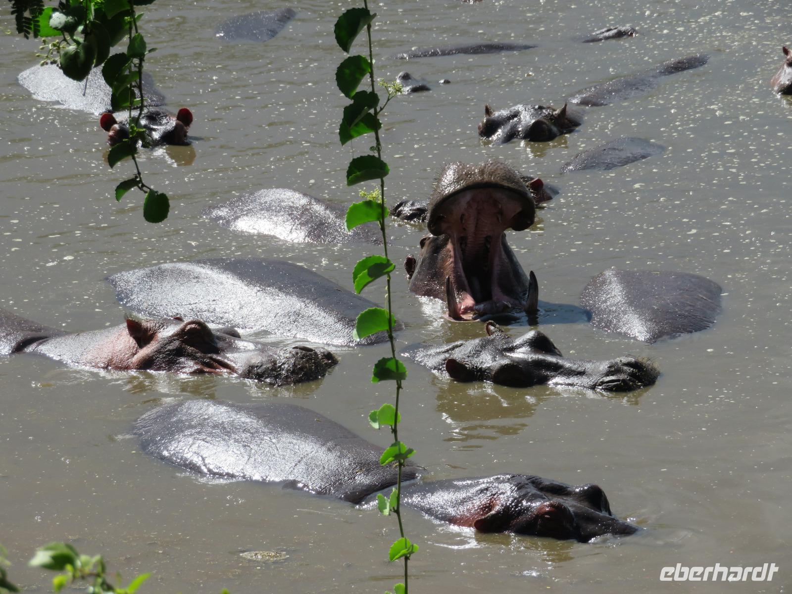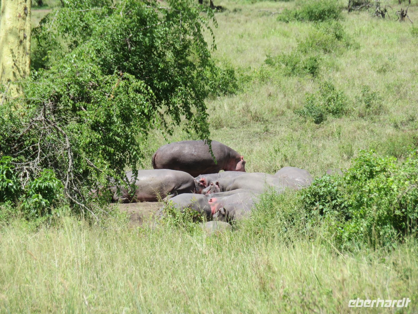 Gut gelaunt starten wir in den neuen Tag. Am Morgen beginnen wir unsere Pirschfahrt in der Serengeti. Wir sehen Giraffen nur wenige Meter von der Straße entfernt. Diese majestätischen Tiere zupfen sich ganz geschickt die grünen Blättchen von den Kameldornsträuchern zwischen den langen Dornen ab. Wieder begegnen wir Impalas und Zebras. Sehen Elefanten und Topis auch eine Antilopenart. Wir sehen den Massai-Kopies, eine große Felsformation, die aus der platten Ebene herausragt. Plötzlich fahren unsere Fahrer etwas schneller und wir bemerken, dass immer mehr Jeeps die gleiche Richtung einschlagen. Eine weitere Felsformation kommt zum Vorschein und unter einer Schirmarkazie davor haben sich ca. 18 Jeeps im Kreis postiert. Direkt unter dem Baum liegt ein Löwenpaar. Unsere Guides erklären uns, dass sich diese zur Paarung zurückgezogen haben. Geduldig warten wir. Dabei entdecken wir noch einen zweiten Löwenmann zwischen den Felsen. Vermutlich ist es der Bruder des Löwen am Baum. Männliche und weibliche Löwen finden sich nur zur Paarungszeit zusammen. Ansonsten leben die Männchen in Gruppen zusammen und die Weibchen mit den Jungtieren bilden ein Rudel. Unsre Geduld wird belohnt und wir erleben einen Paarungsakt der Löwen. Schon wieder ein tolles Erlebnis! Nun fahren wir zum Nationalparkzentrum Seronera. Wir nehmen unser Mittagspicknick ein. Anschließend erläutert uns eine junge Mitarbeiterin die kleine Ausstellung mit Schädeln und Knochen von unterschiedlichsten Tieren, wie z.B. Büffel, Giraffe und Nilpferd. Sie führt uns über einen kleinen hübsch angelegten Lehrpfad, der uns viele Informationen zu den legendären Tierwanderungen in der Serengeti liefert. Danach setzen wir unsre Pirschfahrt fort. Auch jetzt sehen wir wieder Giraffen und aus der Ferne Elefanten. Macdonald und Amos haben uns noch eine Überraschung versprochen. Kurz nach dem Mittag geht aber wieder ein Regenguss nieder. Beide Guides sind sich nicht sicher, ob wir es schaffen, durch den Schlamm zu kommen, aber sie versuchen es. Plötzlich stehen wir vor einem größeren Wasserpool. In diesem tummeln sich wahnsinnig viele Nilpferde. Wir warten noch einige Minuten, bis der Regen nachlässt und steigen dann am Aussichtspunkt aus. Wir werden auch hier für unsere Geduld belohnt, denn die Sonne kommt durch. Wir sind wiederum beeindruckt von der großen Zahl der Nilpferde und der Nähe, aus der wir sie erleben dürfen. Kleine noch sehr junge Nilpferde spielen im Wasser, einige kugeln sich und große, wahrscheinlich Bullen reißen ihre riesigen Mäuler weit auf, um den anderen zu zeigen, dass sie nicht zu nahekommen sollen. Gleichzeitig sind wir erstaunt, wie schnell die Kolosse auch laufen können. Dies ist ein wunderschöner Abschluss der Pirschfahrt. Kurz bevor wir den Park wieder verlassen, dürfen wir nochmals einen Leoparden beobachten. Diesen hatten wir am Morgen schon kurz gesehen, dann war er aber im Gras verschwunden. Nun lag er wieder auf dem Baum. Glücklich kehren wir zur Lodge zurück, wo wir am Abend mit einem schmackhaften Abendessen mit Fleisch vom Grill verwöhnt werden. Wir sind uns einig: Wir durften eine wunderschöne Zeit in Tansania erleben! Und um mit den Worten von Prof. Bernhard Gziemek zu spechen: „Die Serengeti darf nicht sterbe!" - Dem können wir uns nur anschließen!