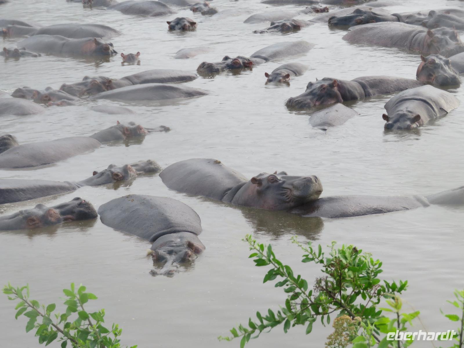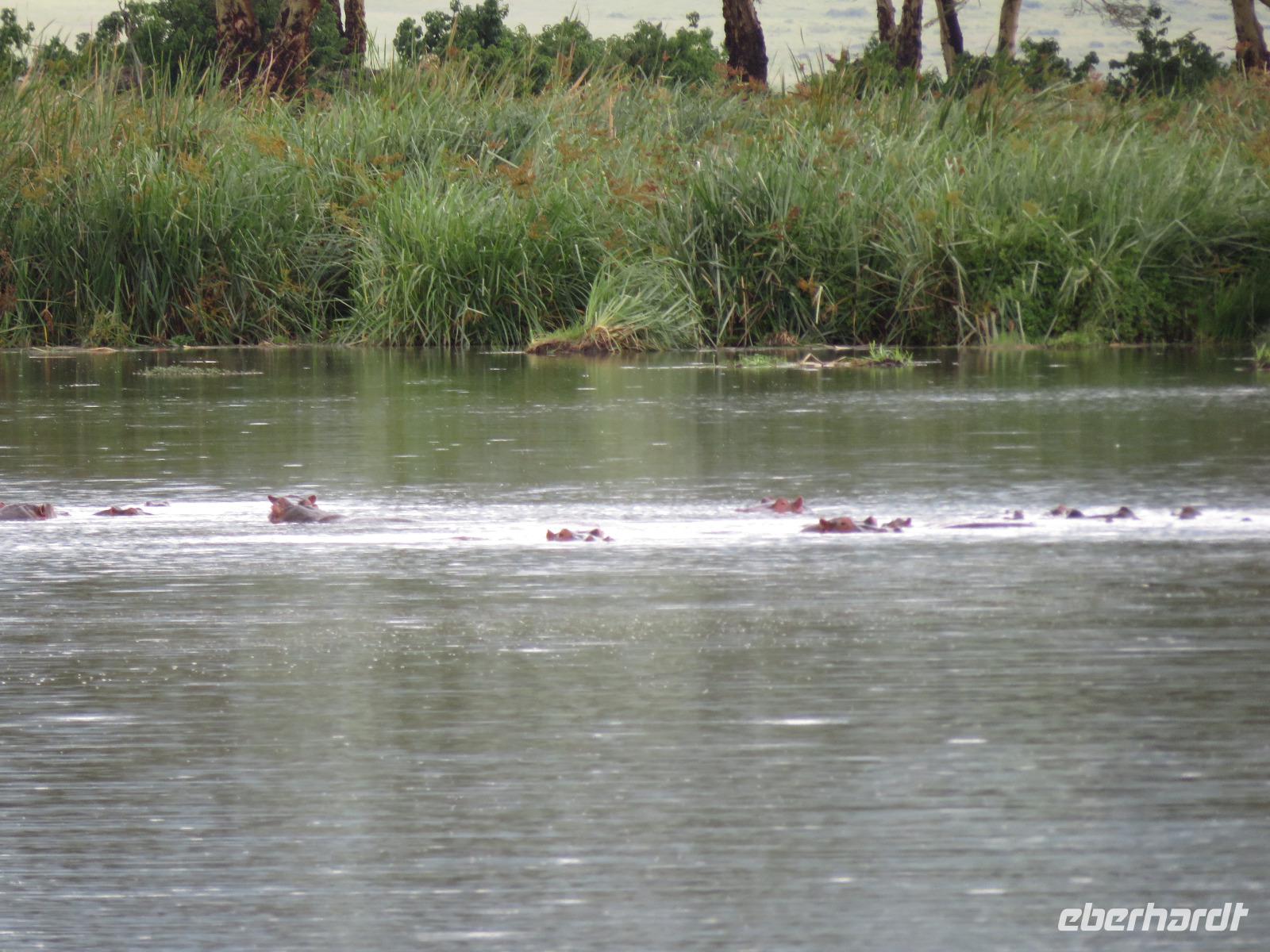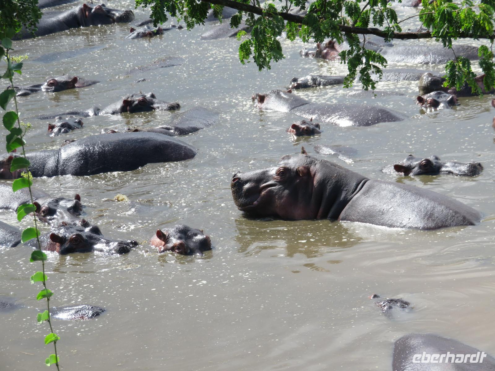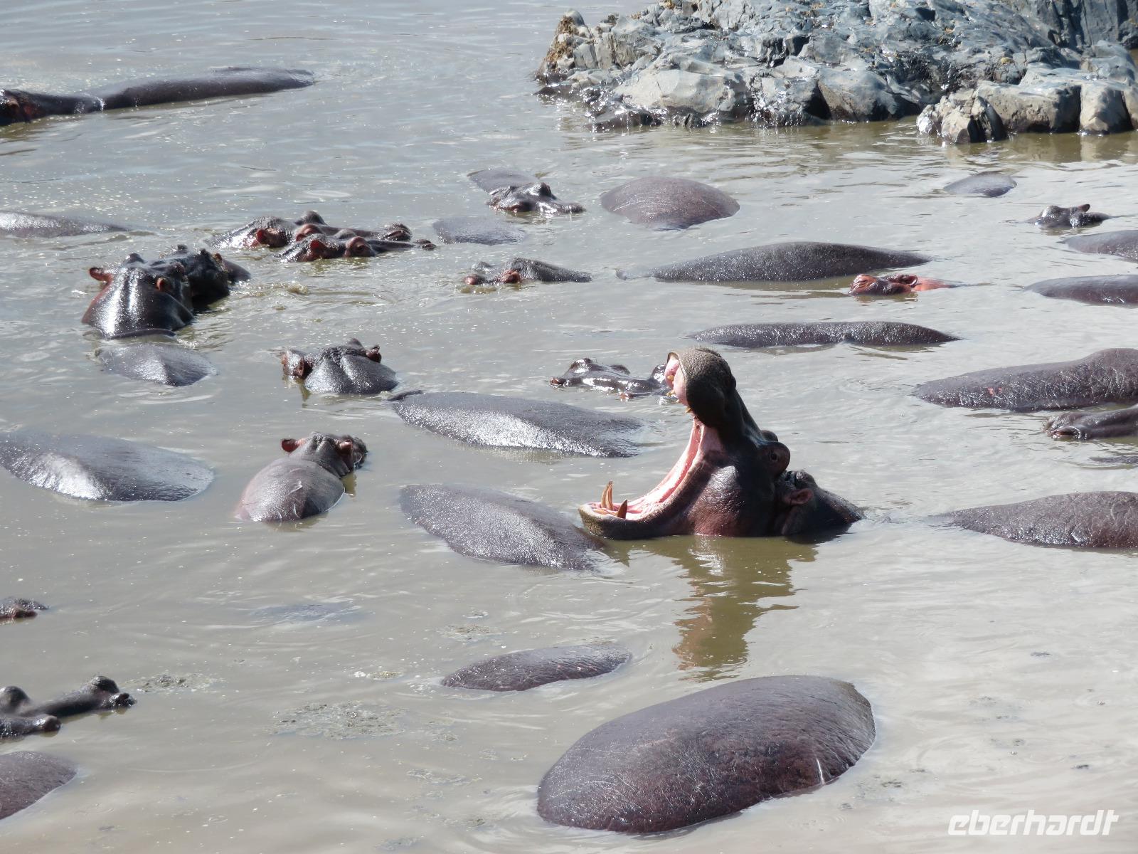 Gut gelaunt starten wir in den neuen Tag. Am Morgen beginnen wir unsere Pirschfahrt in der Serengeti. Wir sehen Giraffen nur wenige Meter von der Straße entfernt. Diese majestätischen Tiere zupfen sich ganz geschickt die grünen Blättchen von den Kameldornsträuchern zwischen den langen Dornen ab. Wieder begegnen wir Impalas und Zebras. Sehen Elefanten und Topis auch eine Antilopenart. Wir sehen den Massai-Kopies, eine große Felsformation, die aus der platten Ebene herausragt. Plötzlich fahren unsere Fahrer etwas schneller und wir bemerken, dass immer mehr Jeeps die gleiche Richtung einschlagen. Eine weitere Felsformation kommt zum Vorschein und unter einer Schirmarkazie davor haben sich ca. 18 Jeeps im Kreis postiert. Direkt unter dem Baum liegt ein Löwenpaar. Unsere Guides erklären uns, dass sich diese zur Paarung zurückgezogen haben. Geduldig warten wir. Dabei entdecken wir noch einen zweiten Löwenmann zwischen den Felsen. Vermutlich ist es der Bruder des Löwen am Baum. Männliche und weibliche Löwen finden sich nur zur Paarungszeit zusammen. Ansonsten leben die Männchen in Gruppen zusammen und die Weibchen mit den Jungtieren bilden ein Rudel. Unsre Geduld wird belohnt und wir erleben einen Paarungsakt der Löwen. Schon wieder ein tolles Erlebnis! Nun fahren wir zum Nationalparkzentrum Seronera. Wir nehmen unser Mittagspicknick ein. Anschließend erläutert uns eine junge Mitarbeiterin die kleine Ausstellung mit Schädeln und Knochen von unterschiedlichsten Tieren, wie z.B. Büffel, Giraffe und Nilpferd. Sie führt uns über einen kleinen hübsch angelegten Lehrpfad, der uns viele Informationen zu den legendären Tierwanderungen in der Serengeti liefert. Danach setzen wir unsre Pirschfahrt fort. Auch jetzt sehen wir wieder Giraffen und aus der Ferne Elefanten. Macdonald und Amos haben uns noch eine Überraschung versprochen. Kurz nach dem Mittag geht aber wieder ein Regenguss nieder. Beide Guides sind sich nicht sicher, ob wir es schaffen, durch den Schlamm zu kommen, aber sie versuchen es. Plötzlich stehen wir vor einem größeren Wasserpool. In diesem tummeln sich wahnsinnig viele Nilpferde. Wir warten noch einige Minuten, bis der Regen nachlässt und steigen dann am Aussichtspunkt aus. Wir werden auch hier für unsere Geduld belohnt, denn die Sonne kommt durch. Wir sind wiederum beeindruckt von der großen Zahl der Nilpferde und der Nähe, aus der wir sie erleben dürfen. Kleine noch sehr junge Nilpferde spielen im Wasser, einige kugeln sich und große, wahrscheinlich Bullen reißen ihre riesigen Mäuler weit auf, um den anderen zu zeigen, dass sie nicht zu nahekommen sollen. Gleichzeitig sind wir erstaunt, wie schnell die Kolosse auch laufen können. Dies ist ein wunderschöner Abschluss der Pirschfahrt. Kurz bevor wir den Park wieder verlassen, dürfen wir nochmals einen Leoparden beobachten. Diesen hatten wir am Morgen schon kurz gesehen, dann war er aber im Gras verschwunden. Nun lag er wieder auf dem Baum. Glücklich kehren wir zur Lodge zurück, wo wir am Abend mit einem schmackhaften Abendessen mit Fleisch vom Grill verwöhnt werden. Wir sind uns einig: Wir durften eine wunderschöne Zeit in Tansania erleben! Und um mit den Worten von Prof. Bernhard Gziemek zu spechen: „Die Serengeti darf nicht sterbe!" - Dem können wir uns nur anschließen!