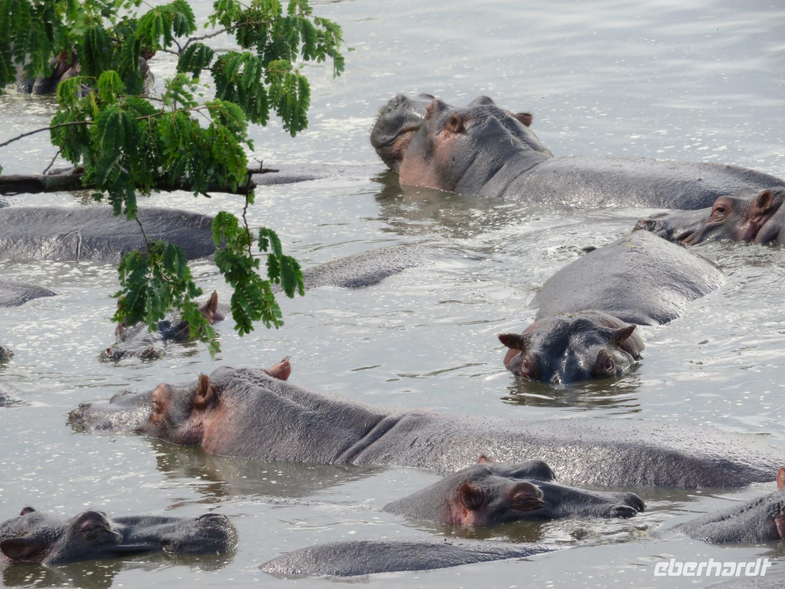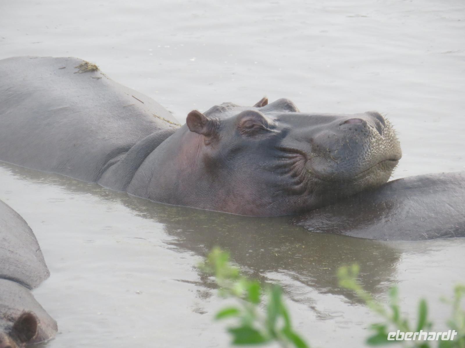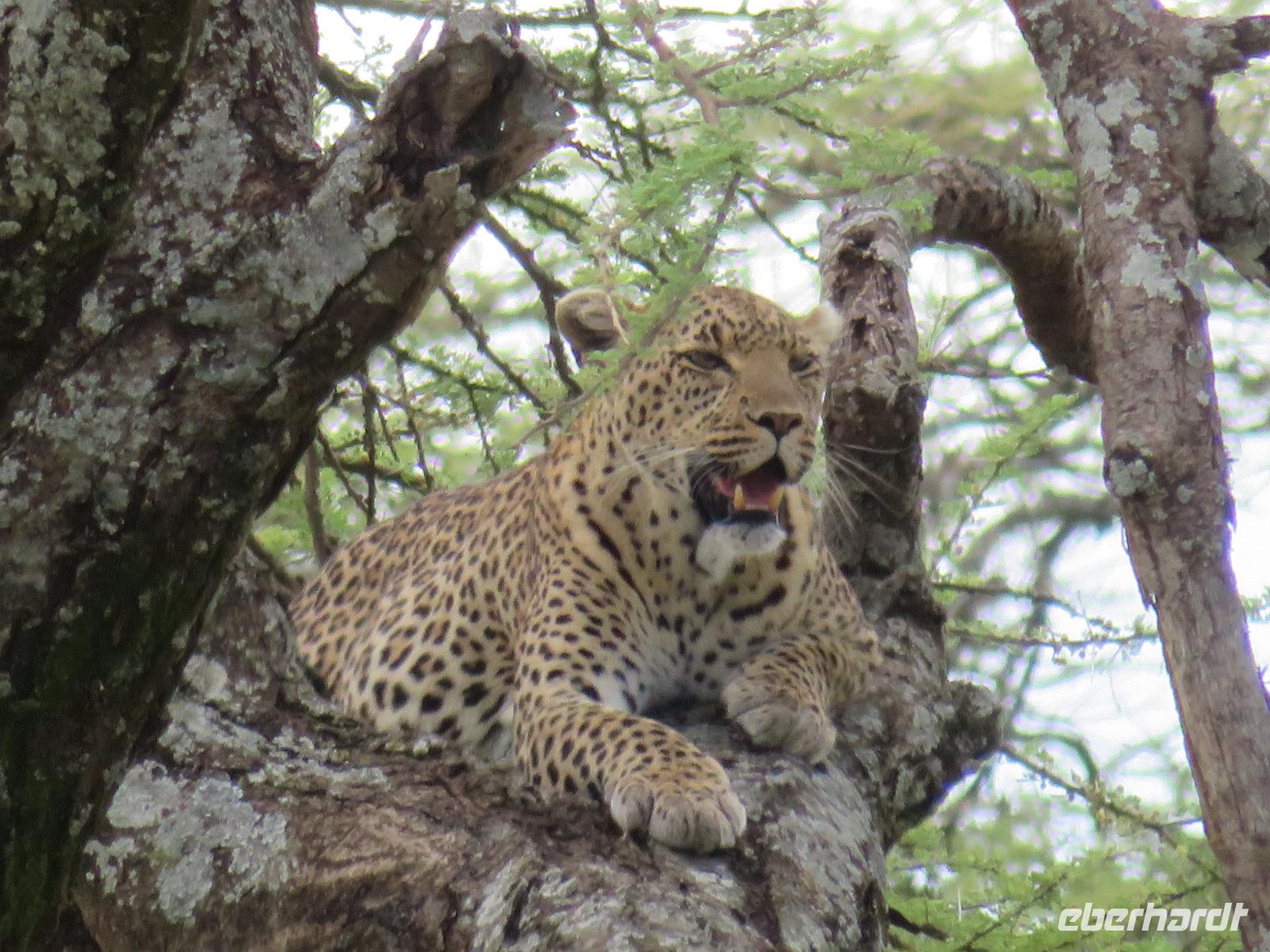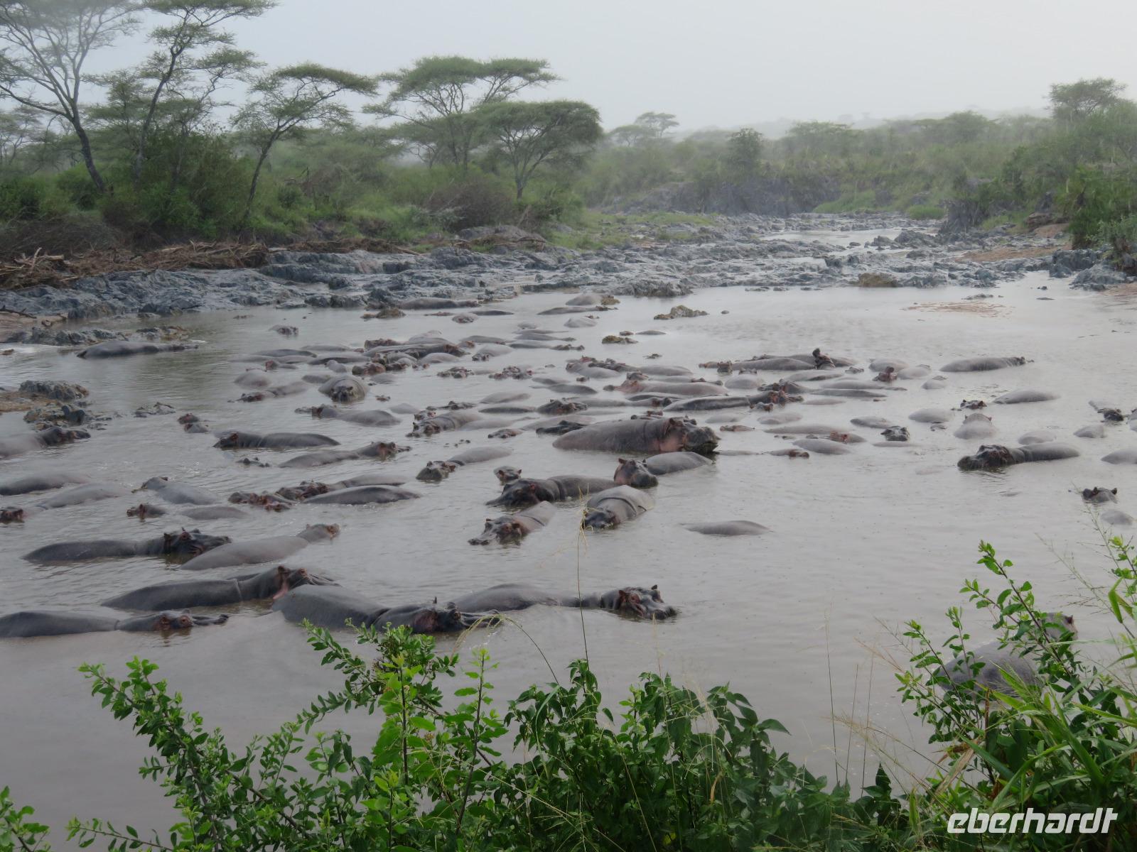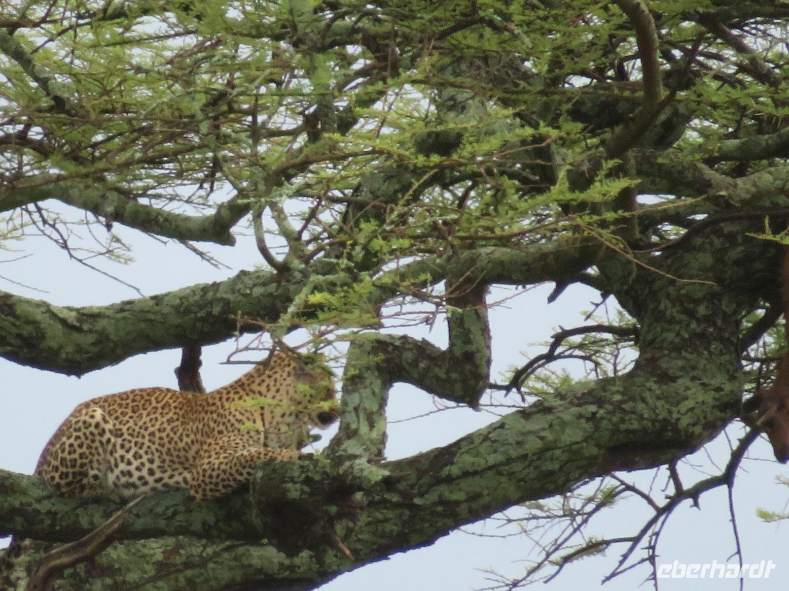 Gut gelaunt starten wir in den neuen Tag. Am Morgen beginnen wir unsere Pirschfahrt in der Serengeti. Wir sehen Giraffen nur wenige Meter von der Straße entfernt. Diese majestätischen Tiere zupfen sich ganz geschickt die grünen Blättchen von den Kameldornsträuchern zwischen den langen Dornen ab. Wieder begegnen wir Impalas und Zebras. Sehen Elefanten und Topis auch eine Antilopenart. Wir sehen den Massai-Kopies, eine große Felsformation, die aus der platten Ebene herausragt. Plötzlich fahren unsere Fahrer etwas schneller und wir bemerken, dass immer mehr Jeeps die gleiche Richtung einschlagen. Eine weitere Felsformation kommt zum Vorschein und unter einer Schirmarkazie davor haben sich ca. 18 Jeeps im Kreis postiert. Direkt unter dem Baum liegt ein Löwenpaar. Unsere Guides erklären uns, dass sich diese zur Paarung zurückgezogen haben. Geduldig warten wir. Dabei entdecken wir noch einen zweiten Löwenmann zwischen den Felsen. Vermutlich ist es der Bruder des Löwen am Baum. Männliche und weibliche Löwen finden sich nur zur Paarungszeit zusammen. Ansonsten leben die Männchen in Gruppen zusammen und die Weibchen mit den Jungtieren bilden ein Rudel. Unsre Geduld wird belohnt und wir erleben einen Paarungsakt der Löwen. Schon wieder ein tolles Erlebnis! Nun fahren wir zum Nationalparkzentrum Seronera. Wir nehmen unser Mittagspicknick ein. Anschließend erläutert uns eine junge Mitarbeiterin die kleine Ausstellung mit Schädeln und Knochen von unterschiedlichsten Tieren, wie z.B. Büffel, Giraffe und Nilpferd. Sie führt uns über einen kleinen hübsch angelegten Lehrpfad, der uns viele Informationen zu den legendären Tierwanderungen in der Serengeti liefert. Danach setzen wir unsre Pirschfahrt fort. Auch jetzt sehen wir wieder Giraffen und aus der Ferne Elefanten. Macdonald und Amos haben uns noch eine Überraschung versprochen. Kurz nach dem Mittag geht aber wieder ein Regenguss nieder. Beide Guides sind sich nicht sicher, ob wir es schaffen, durch den Schlamm zu kommen, aber sie versuchen es. Plötzlich stehen wir vor einem größeren Wasserpool. In diesem tummeln sich wahnsinnig viele Nilpferde. Wir warten noch einige Minuten, bis der Regen nachlässt und steigen dann am Aussichtspunkt aus. Wir werden auch hier für unsere Geduld belohnt, denn die Sonne kommt durch. Wir sind wiederum beeindruckt von der großen Zahl der Nilpferde und der Nähe, aus der wir sie erleben dürfen. Kleine noch sehr junge Nilpferde spielen im Wasser, einige kugeln sich und große, wahrscheinlich Bullen reißen ihre riesigen Mäuler weit auf, um den anderen zu zeigen, dass sie nicht zu nahekommen sollen. Gleichzeitig sind wir erstaunt, wie schnell die Kolosse auch laufen können. Dies ist ein wunderschöner Abschluss der Pirschfahrt. Kurz bevor wir den Park wieder verlassen, dürfen wir nochmals einen Leoparden beobachten. Diesen hatten wir am Morgen schon kurz gesehen, dann war er aber im Gras verschwunden. Nun lag er wieder auf dem Baum. Glücklich kehren wir zur Lodge zurück, wo wir am Abend mit einem schmackhaften Abendessen mit Fleisch vom Grill verwöhnt werden. Wir sind uns einig: Wir durften eine wunderschöne Zeit in Tansania erleben! Und um mit den Worten von Prof. Bernhard Gziemek zu spechen: „Die Serengeti darf nicht sterbe!" - Dem können wir uns nur anschließen!