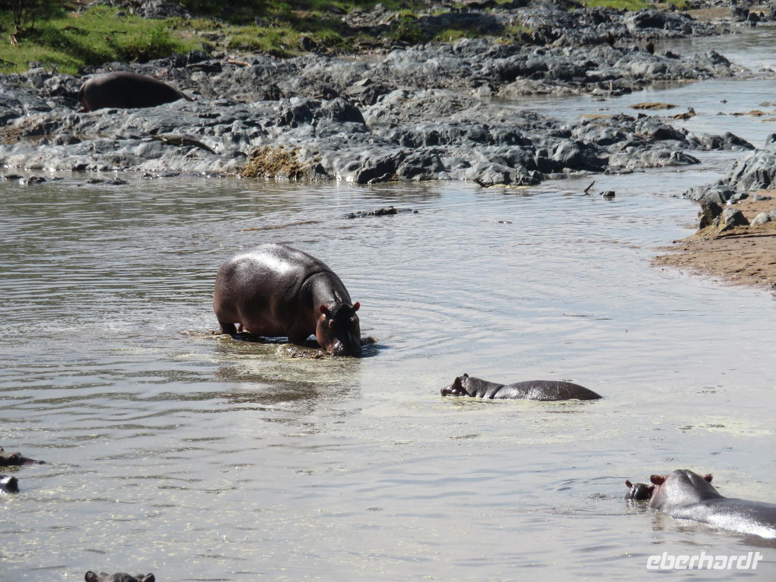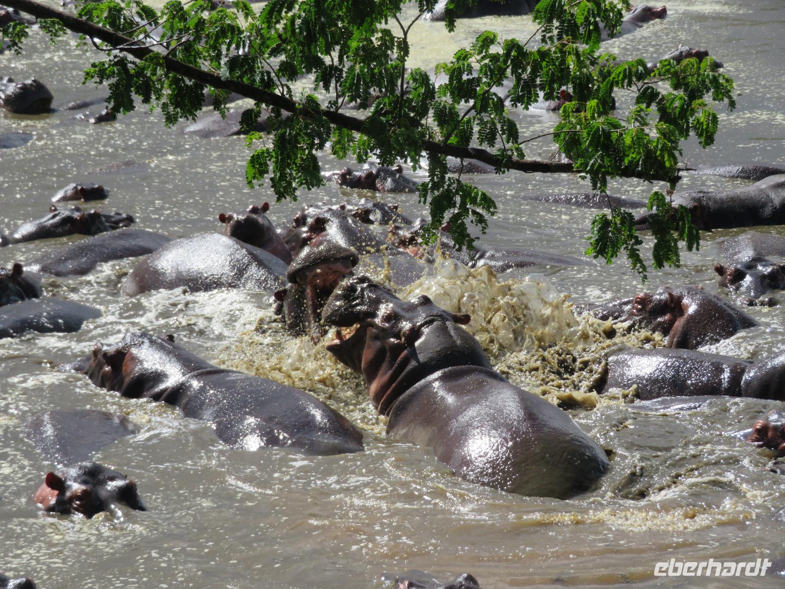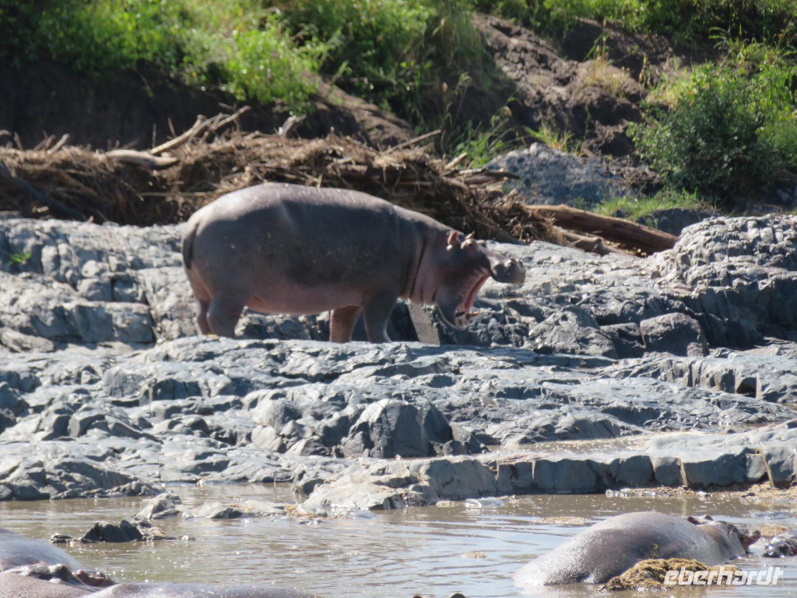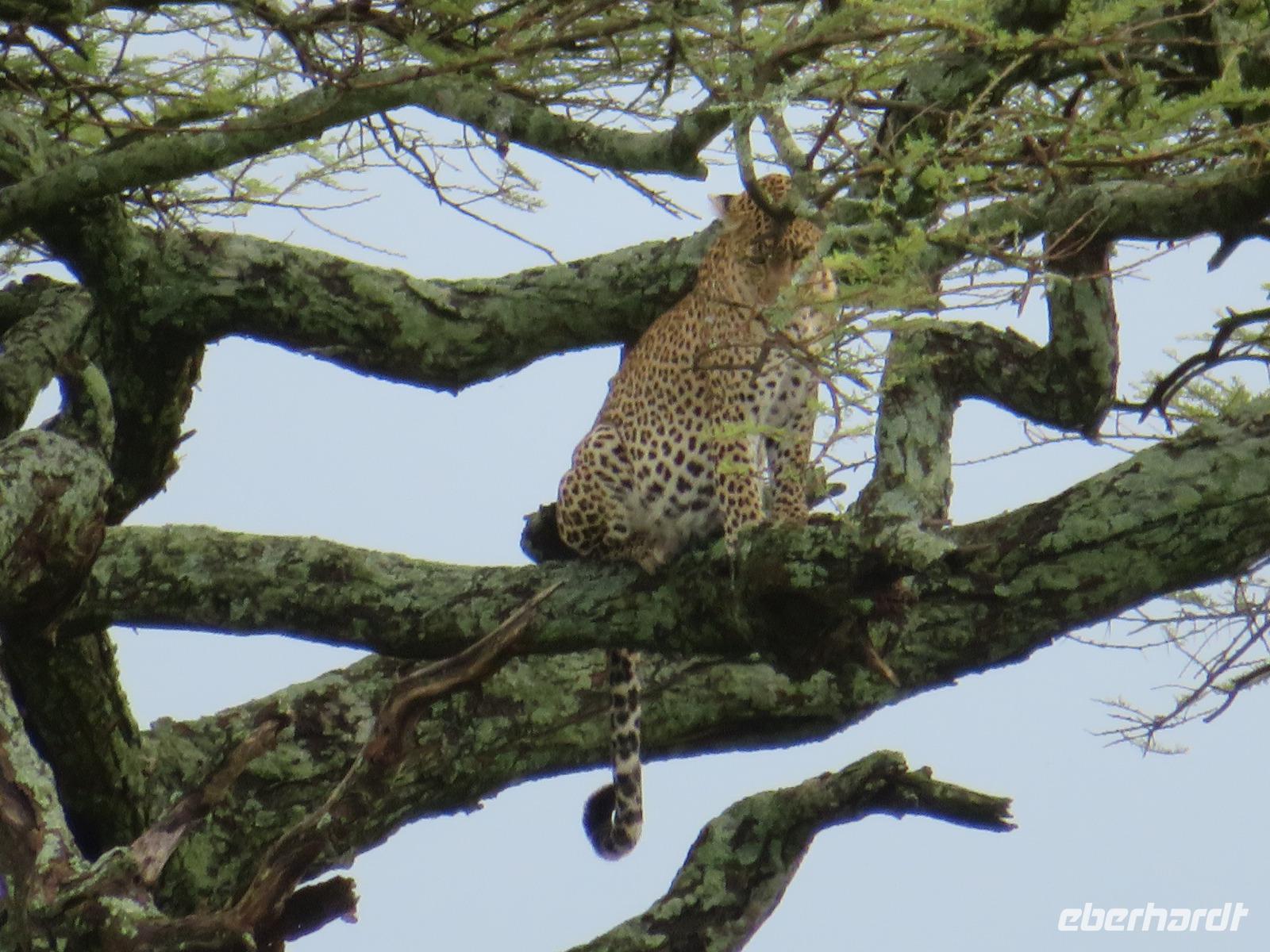Gut gelaunt starten wir in den neuen Tag. Am Morgen beginnen wir unsere Pirschfahrt in der Serengeti. Wir sehen Giraffen nur wenige Meter von der Straße entfernt. Diese majestätischen Tiere zupfen sich ganz geschickt die grünen Blättchen von den Kameldornsträuchern zwischen den langen Dornen ab. Wieder begegnen wir Impalas und Zebras. Sehen Elefanten und Topis auch eine Antilopenart. Wir sehen den Massai-Kopies, eine große Felsformation, die aus der platten Ebene herausragt. Plötzlich fahren unsere Fahrer etwas schneller und wir bemerken, dass immer mehr Jeeps die gleiche Richtung einschlagen. Eine weitere Felsformation kommt zum Vorschein und unter einer Schirmarkazie davor haben sich ca. 18 Jeeps im Kreis postiert. Direkt unter dem Baum liegt ein Löwenpaar. Unsere Guides erklären uns, dass sich diese zur Paarung zurückgezogen haben. Geduldig warten wir. Dabei entdecken wir noch einen zweiten Löwenmann zwischen den Felsen. Vermutlich ist es der Bruder des Löwen am Baum. Männliche und weibliche Löwen finden sich nur zur Paarungszeit zusammen. Ansonsten leben die Männchen in Gruppen zusammen und die Weibchen mit den Jungtieren bilden ein Rudel. Unsre Geduld wird belohnt und wir erleben einen Paarungsakt der Löwen. Schon wieder ein tolles Erlebnis! Nun fahren wir zum Nationalparkzentrum Seronera. Wir nehmen unser Mittagspicknick ein. Anschließend erläutert uns eine junge Mitarbeiterin die kleine Ausstellung mit Schädeln und Knochen von unterschiedlichsten Tieren, wie z.B. Büffel, Giraffe und Nilpferd. Sie führt uns über einen kleinen hübsch angelegten Lehrpfad, der uns viele Informationen zu den legendären Tierwanderungen in der Serengeti liefert. Danach setzen wir unsre Pirschfahrt fort. Auch jetzt sehen wir wieder Giraffen und aus der Ferne Elefanten. Macdonald und Amos haben uns noch eine Überraschung versprochen. Kurz nach dem Mittag geht aber wieder ein Regenguss nieder. Beide Guides sind sich nicht sicher, ob wir es schaffen, durch den Schlamm zu kommen, aber sie versuchen es. Plötzlich stehen wir vor einem größeren Wasserpool. In diesem tummeln sich wahnsinnig viele Nilpferde. Wir warten noch einige Minuten, bis der Regen nachlässt und steigen dann am Aussichtspunkt aus. Wir werden auch hier für unsere Geduld belohnt, denn die Sonne kommt durch. Wir sind wiederum beeindruckt von der großen Zahl der Nilpferde und der Nähe, aus der wir sie erleben dürfen. Kleine noch sehr junge Nilpferde spielen im Wasser, einige kugeln sich und große, wahrscheinlich Bullen reißen ihre riesigen Mäuler weit auf, um den anderen zu zeigen, dass sie nicht zu nahekommen sollen. Gleichzeitig sind wir erstaunt, wie schnell die Kolosse auch laufen können. Dies ist ein wunderschöner Abschluss der Pirschfahrt. Kurz bevor wir den Park wieder verlassen, dürfen wir nochmals einen Leoparden beobachten. Diesen hatten wir am Morgen schon kurz gesehen, dann war er aber im Gras verschwunden. Nun lag er wieder auf dem Baum. Glücklich kehren wir zur Lodge zurück, wo wir am Abend mit einem schmackhaften Abendessen mit Fleisch vom Grill verwöhnt werden. Wir sind uns einig: Wir durften eine wunderschöne Zeit in Tansania erleben! Und um mit den Worten von Prof. Bernhard Gziemek zu spechen: „Die Serengeti darf nicht sterbe!" - Dem können wir uns nur anschließen!