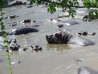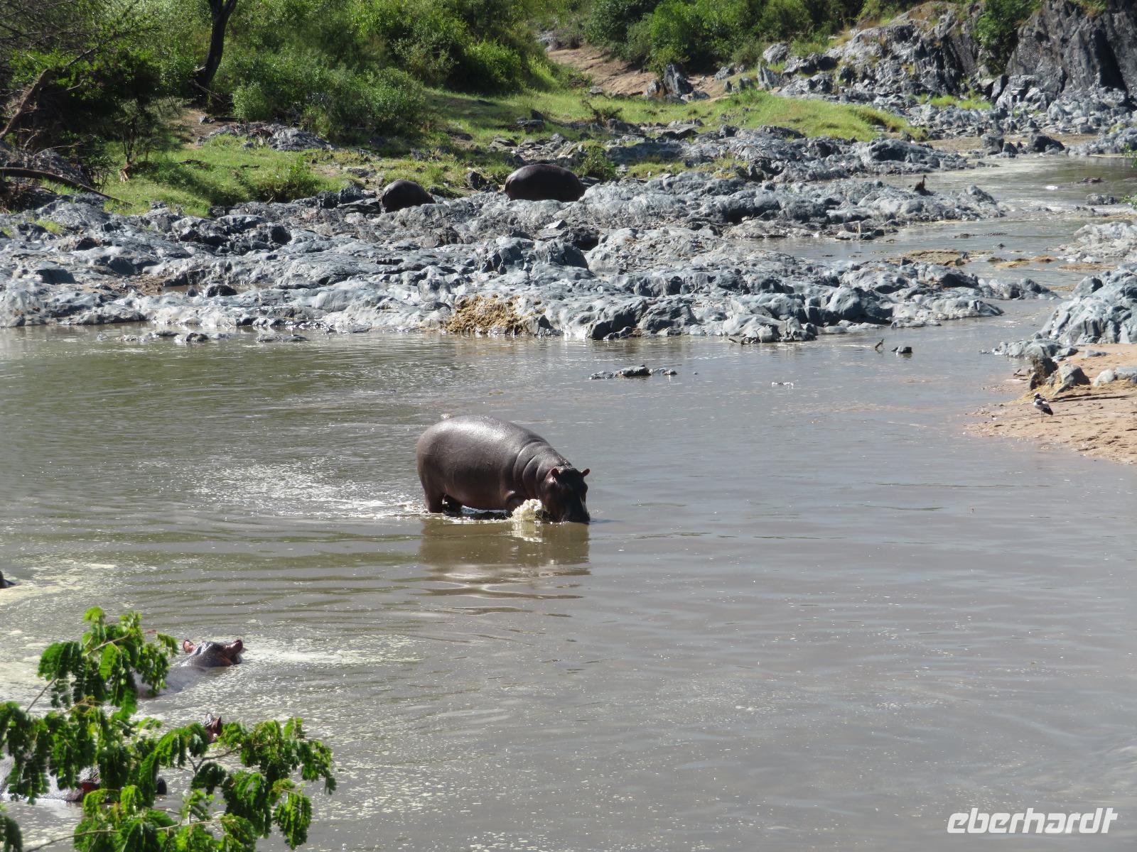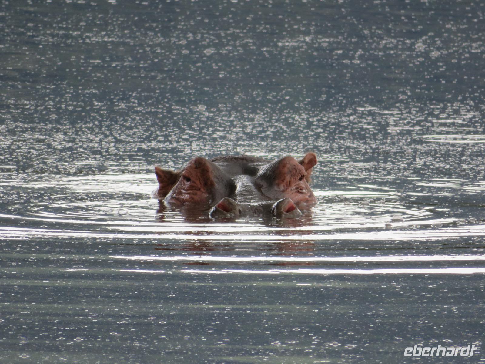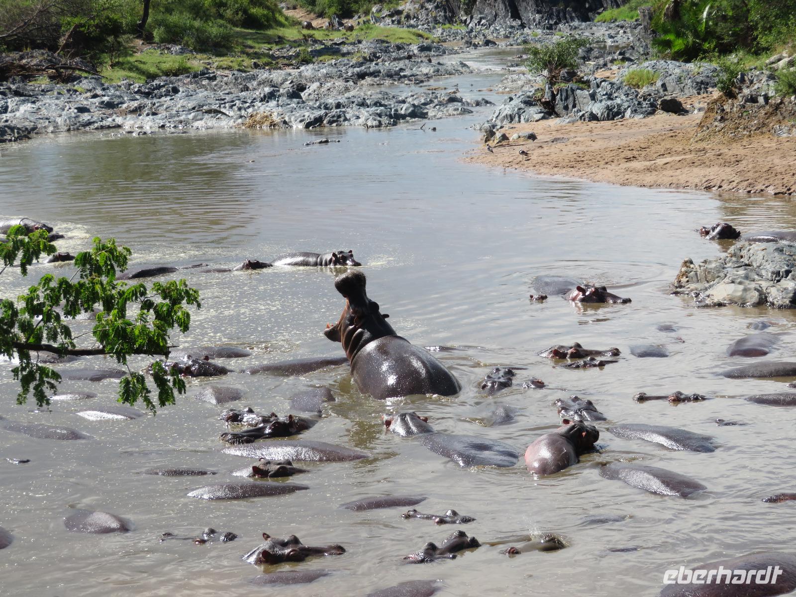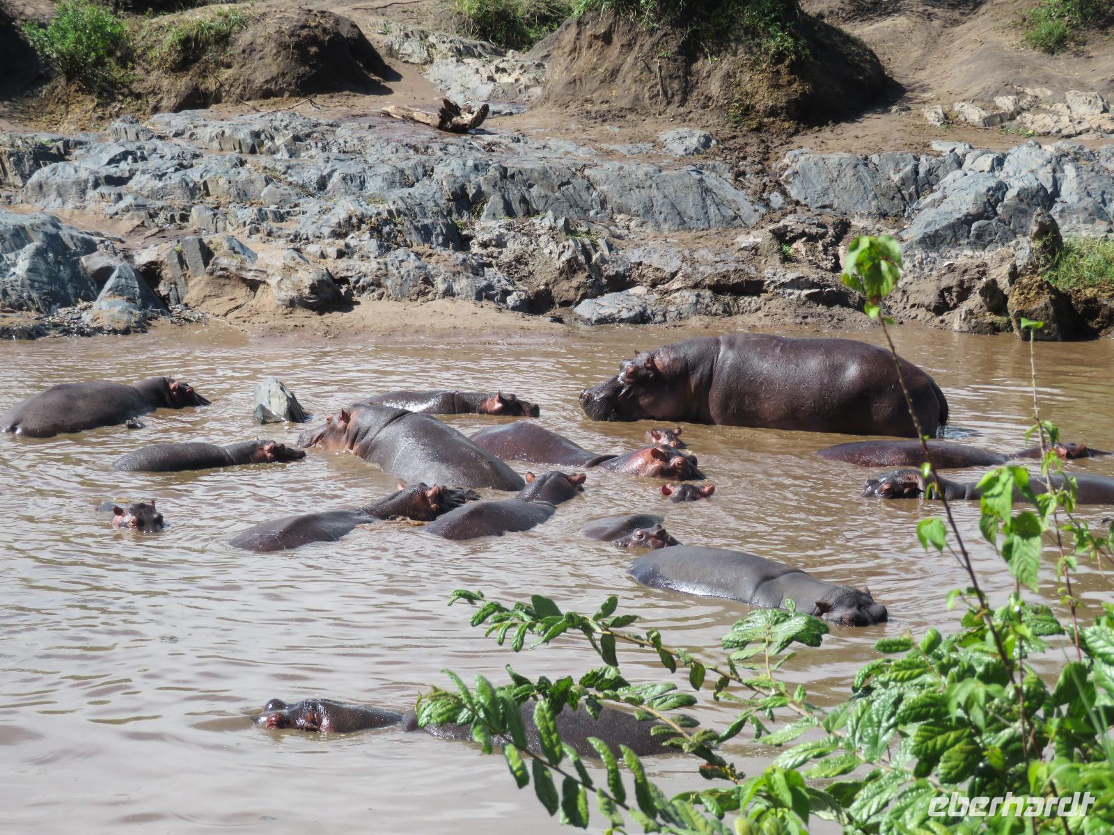 Gut gelaunt starten wir in den neuen Tag. Am Morgen beginnen wir unsere Pirschfahrt in der Serengeti. Wir sehen Giraffen nur wenige Meter von der Straße entfernt. Diese majestätischen Tiere zupfen sich ganz geschickt die grünen Blättchen von den Kameldornsträuchern zwischen den langen Dornen ab. Wieder begegnen wir Impalas und Zebras. Sehen Elefanten und Topis auch eine Antilopenart. Wir sehen den Massai-Kopies, eine große Felsformation, die aus der platten Ebene herausragt. Plötzlich fahren unsere Fahrer etwas schneller und wir bemerken, dass immer mehr Jeeps die gleiche Richtung einschlagen. Eine weitere Felsformation kommt zum Vorschein und unter einer Schirmarkazie davor haben sich ca. 18 Jeeps im Kreis postiert. Direkt unter dem Baum liegt ein Löwenpaar. Unsere Guides erklären uns, dass sich diese zur Paarung zurückgezogen haben. Geduldig warten wir. Dabei entdecken wir noch einen zweiten Löwenmann zwischen den Felsen. Vermutlich ist es der Bruder des Löwen am Baum. Männliche und weibliche Löwen finden sich nur zur Paarungszeit zusammen. Ansonsten leben die Männchen in Gruppen zusammen und die Weibchen mit den Jungtieren bilden ein Rudel. Unsre Geduld wird belohnt und wir erleben einen Paarungsakt der Löwen. Schon wieder ein tolles Erlebnis! Nun fahren wir zum Nationalparkzentrum Seronera. Wir nehmen unser Mittagspicknick ein. Anschließend erläutert uns eine junge Mitarbeiterin die kleine Ausstellung mit Schädeln und Knochen von unterschiedlichsten Tieren, wie z.B. Büffel, Giraffe und Nilpferd. Sie führt uns über einen kleinen hübsch angelegten Lehrpfad, der uns viele Informationen zu den legendären Tierwanderungen in der Serengeti liefert. Danach setzen wir unsre Pirschfahrt fort. Auch jetzt sehen wir wieder Giraffen und aus der Ferne Elefanten. Macdonald und Amos haben uns noch eine Überraschung versprochen. Kurz nach dem Mittag geht aber wieder ein Regenguss nieder. Beide Guides sind sich nicht sicher, ob wir es schaffen, durch den Schlamm zu kommen, aber sie versuchen es. Plötzlich stehen wir vor einem größeren Wasserpool. In diesem tummeln sich wahnsinnig viele Nilpferde. Wir warten noch einige Minuten, bis der Regen nachlässt und steigen dann am Aussichtspunkt aus. Wir werden auch hier für unsere Geduld belohnt, denn die Sonne kommt durch. Wir sind wiederum beeindruckt von der großen Zahl der Nilpferde und der Nähe, aus der wir sie erleben dürfen. Kleine noch sehr junge Nilpferde spielen im Wasser, einige kugeln sich und große, wahrscheinlich Bullen reißen ihre riesigen Mäuler weit auf, um den anderen zu zeigen, dass sie nicht zu nahekommen sollen. Gleichzeitig sind wir erstaunt, wie schnell die Kolosse auch laufen können. Dies ist ein wunderschöner Abschluss der Pirschfahrt. Kurz bevor wir den Park wieder verlassen, dürfen wir nochmals einen Leoparden beobachten. Diesen hatten wir am Morgen schon kurz gesehen, dann war er aber im Gras verschwunden. Nun lag er wieder auf dem Baum. Glücklich kehren wir zur Lodge zurück, wo wir am Abend mit einem schmackhaften Abendessen mit Fleisch vom Grill verwöhnt werden. Wir sind uns einig: Wir durften eine wunderschöne Zeit in Tansania erleben! Und um mit den Worten von Prof. Bernhard Gziemek zu spechen: „Die Serengeti darf nicht sterbe!" - Dem können wir uns nur anschließen!