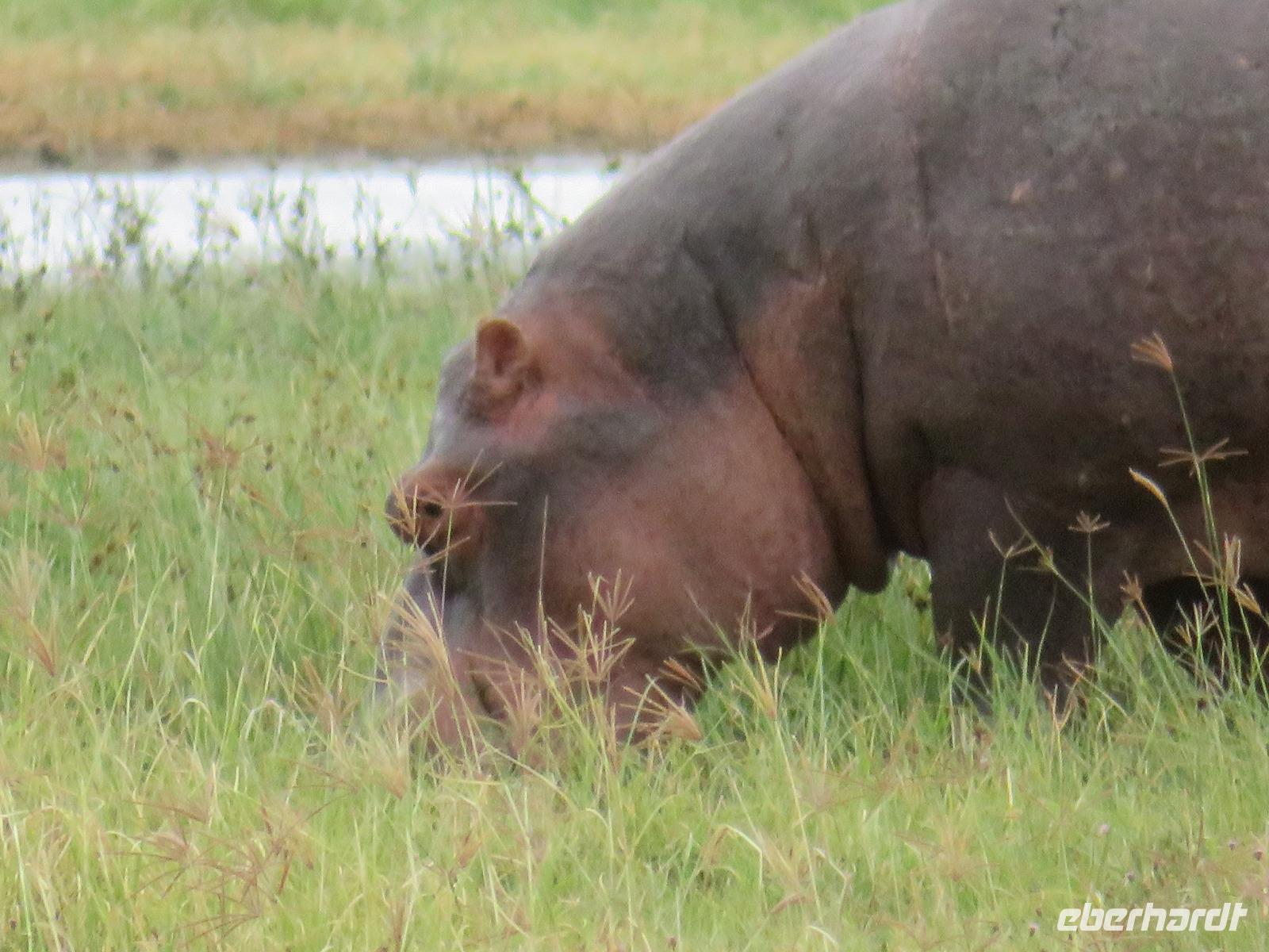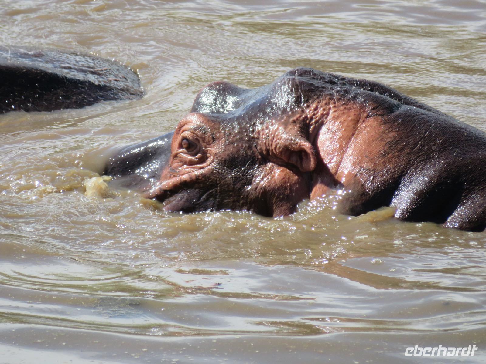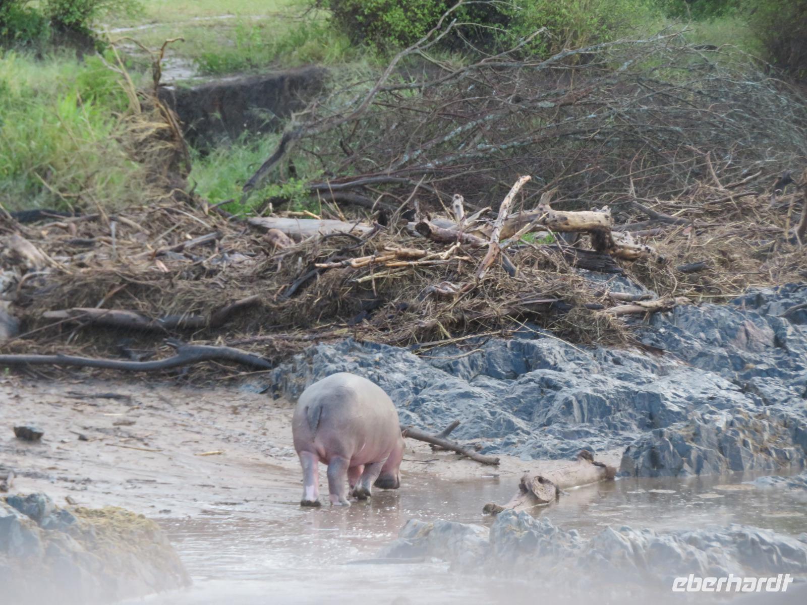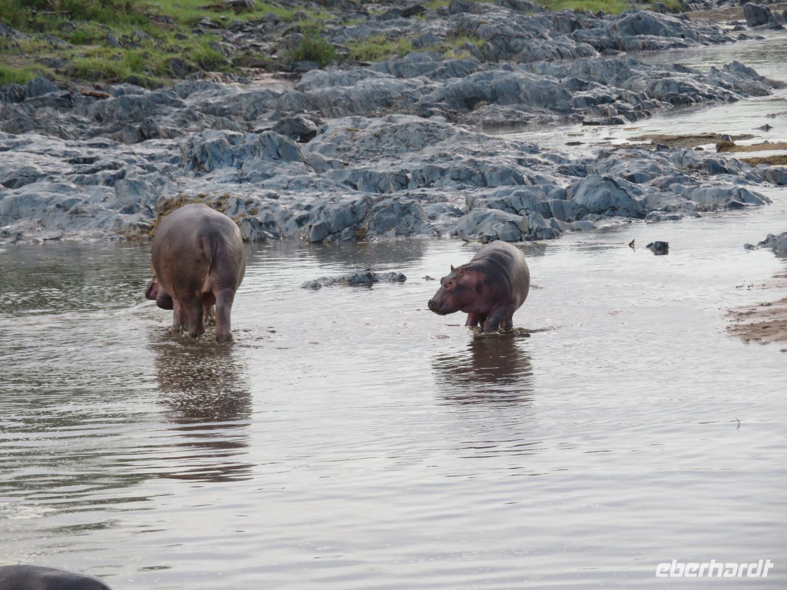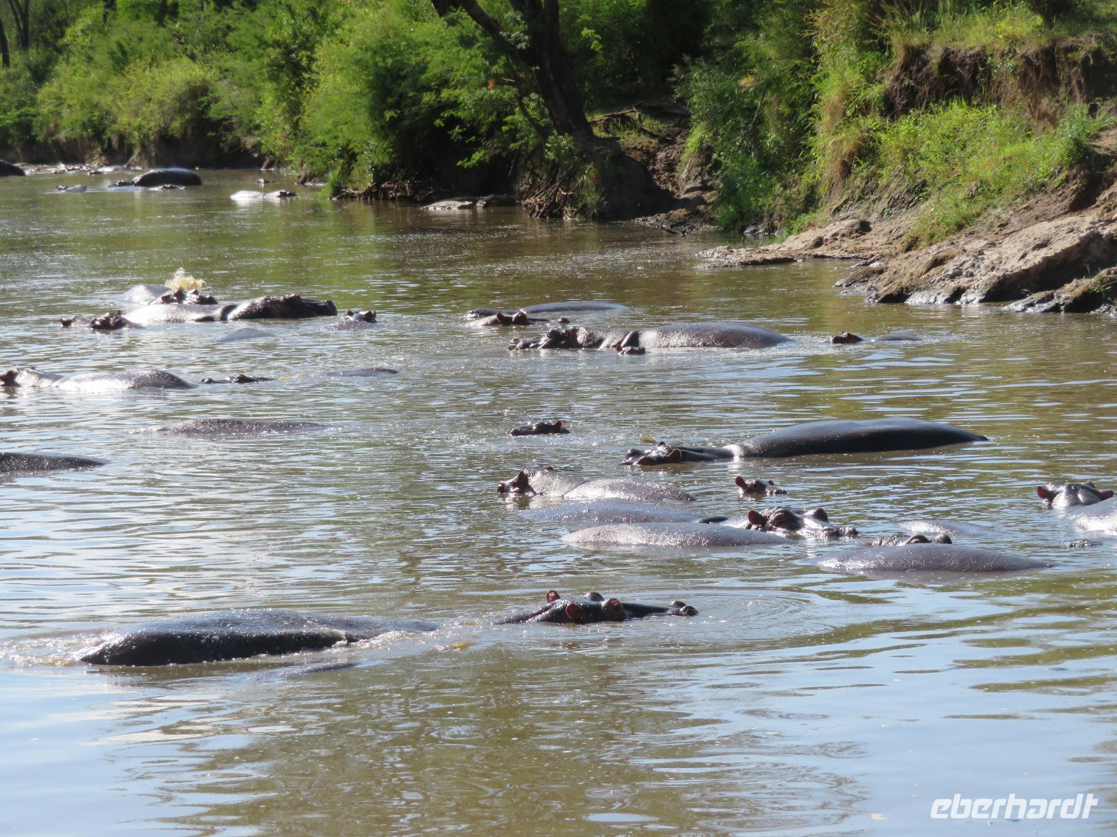 Gut gelaunt starten wir in den neuen Tag. Am Morgen beginnen wir unsere Pirschfahrt in der Serengeti. Wir sehen Giraffen nur wenige Meter von der Straße entfernt. Diese majestätischen Tiere zupfen sich ganz geschickt die grünen Blättchen von den Kameldornsträuchern zwischen den langen Dornen ab. Wieder begegnen wir Impalas und Zebras. Sehen Elefanten und Topis auch eine Antilopenart. Wir sehen den Massai-Kopies, eine große Felsformation, die aus der platten Ebene herausragt. Plötzlich fahren unsere Fahrer etwas schneller und wir bemerken, dass immer mehr Jeeps die gleiche Richtung einschlagen. Eine weitere Felsformation kommt zum Vorschein und unter einer Schirmarkazie davor haben sich ca. 18 Jeeps im Kreis postiert. Direkt unter dem Baum liegt ein Löwenpaar. Unsere Guides erklären uns, dass sich diese zur Paarung zurückgezogen haben. Geduldig warten wir. Dabei entdecken wir noch einen zweiten Löwenmann zwischen den Felsen. Vermutlich ist es der Bruder des Löwen am Baum. Männliche und weibliche Löwen finden sich nur zur Paarungszeit zusammen. Ansonsten leben die Männchen in Gruppen zusammen und die Weibchen mit den Jungtieren bilden ein Rudel. Unsre Geduld wird belohnt und wir erleben einen Paarungsakt der Löwen. Schon wieder ein tolles Erlebnis! Nun fahren wir zum Nationalparkzentrum Seronera. Wir nehmen unser Mittagspicknick ein. Anschließend erläutert uns eine junge Mitarbeiterin die kleine Ausstellung mit Schädeln und Knochen von unterschiedlichsten Tieren, wie z.B. Büffel, Giraffe und Nilpferd. Sie führt uns über einen kleinen hübsch angelegten Lehrpfad, der uns viele Informationen zu den legendären Tierwanderungen in der Serengeti liefert. Danach setzen wir unsre Pirschfahrt fort. Auch jetzt sehen wir wieder Giraffen und aus der Ferne Elefanten. Macdonald und Amos haben uns noch eine Überraschung versprochen. Kurz nach dem Mittag geht aber wieder ein Regenguss nieder. Beide Guides sind sich nicht sicher, ob wir es schaffen, durch den Schlamm zu kommen, aber sie versuchen es. Plötzlich stehen wir vor einem größeren Wasserpool. In diesem tummeln sich wahnsinnig viele Nilpferde. Wir warten noch einige Minuten, bis der Regen nachlässt und steigen dann am Aussichtspunkt aus. Wir werden auch hier für unsere Geduld belohnt, denn die Sonne kommt durch. Wir sind wiederum beeindruckt von der großen Zahl der Nilpferde und der Nähe, aus der wir sie erleben dürfen. Kleine noch sehr junge Nilpferde spielen im Wasser, einige kugeln sich und große, wahrscheinlich Bullen reißen ihre riesigen Mäuler weit auf, um den anderen zu zeigen, dass sie nicht zu nahekommen sollen. Gleichzeitig sind wir erstaunt, wie schnell die Kolosse auch laufen können. Dies ist ein wunderschöner Abschluss der Pirschfahrt. Kurz bevor wir den Park wieder verlassen, dürfen wir nochmals einen Leoparden beobachten. Diesen hatten wir am Morgen schon kurz gesehen, dann war er aber im Gras verschwunden. Nun lag er wieder auf dem Baum. Glücklich kehren wir zur Lodge zurück, wo wir am Abend mit einem schmackhaften Abendessen mit Fleisch vom Grill verwöhnt werden. Wir sind uns einig: Wir durften eine wunderschöne Zeit in Tansania erleben! Und um mit den Worten von Prof. Bernhard Gziemek zu spechen: „Die Serengeti darf nicht sterbe!" - Dem können wir uns nur anschließen!
