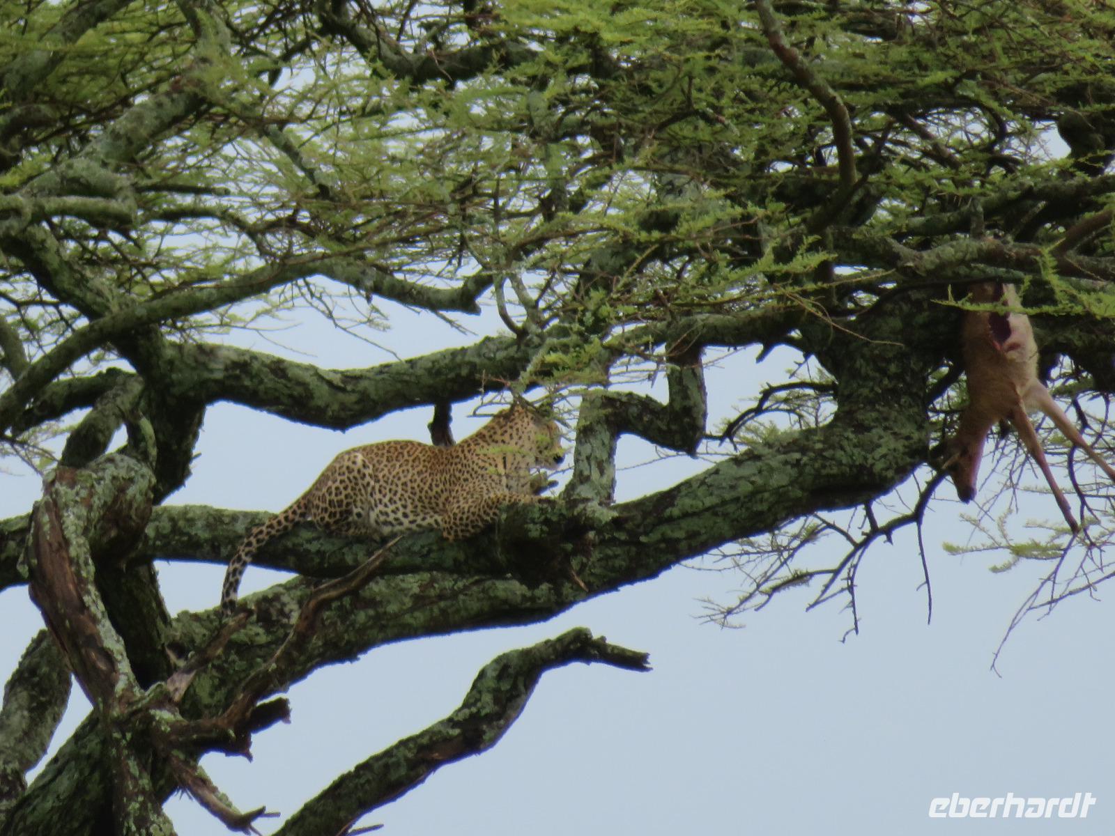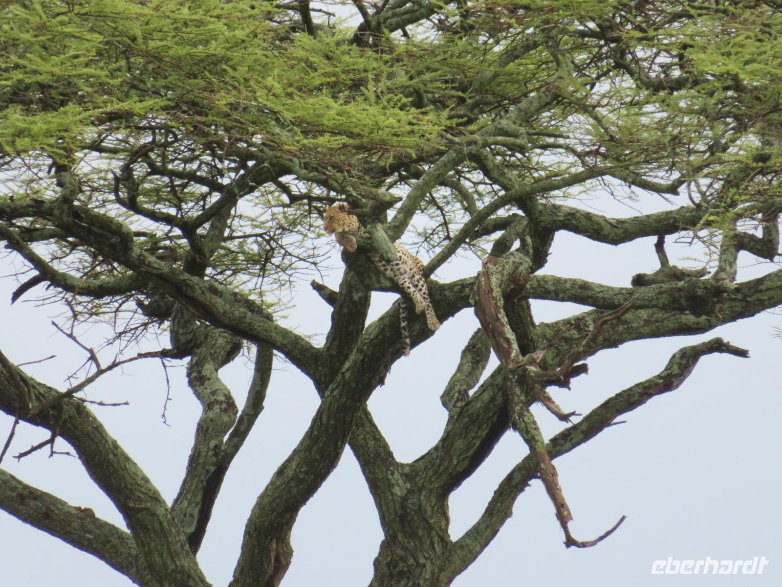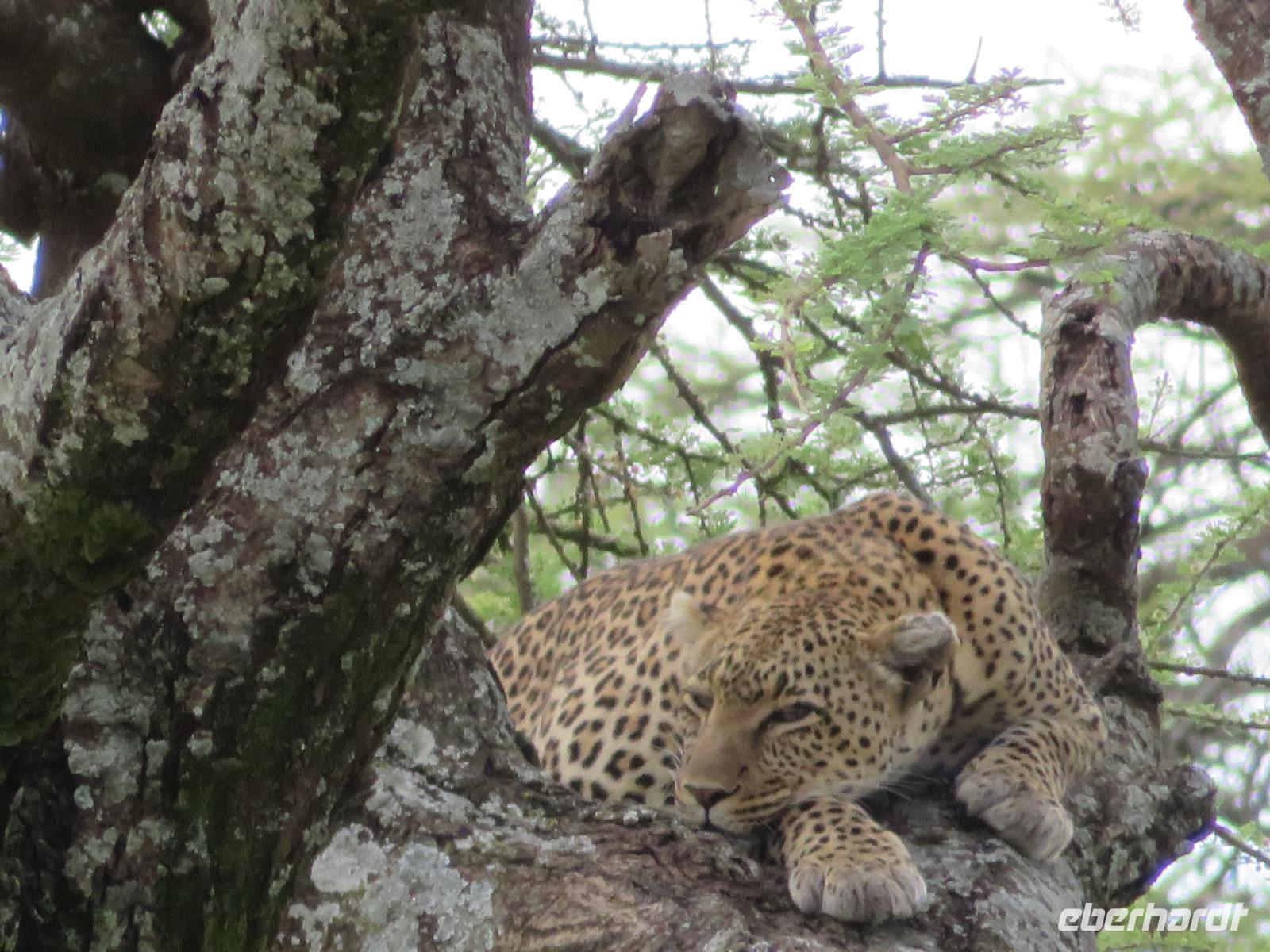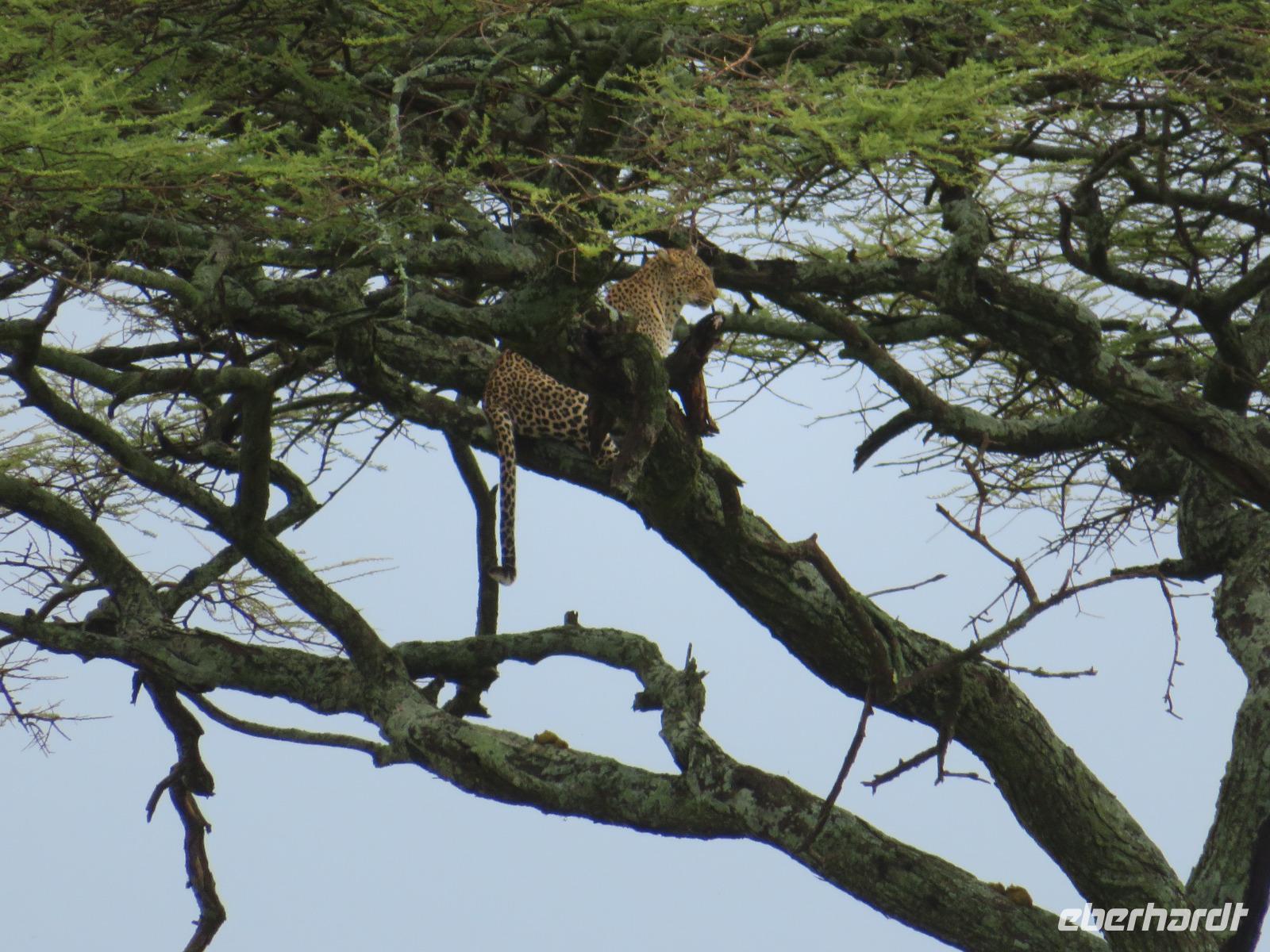 Am Morgen verlassen wir unsere Lodge und unsere Reise führt nochmals vorbei am Ngorongoro-Krater. Unsere erste Station ist ein Massai-Dorf. Die Menschen dieses bekannten Stammes leben noch völlig traditionell in ihren Dörfern in Lehmhütten meist als Hirten mit ihren Tieren. Wir werden zunächst von den Dorfbewohnern in ihrer bunten Kleidung und dem üppigen Perlenschmuck mit einem Begrüßungslied empfangen. Nun folgt die Vorführung eines Tanzes mit den typischen hohen Sprüngen der Männer. Dann werden wir in das Dorf gebeten. Die Männer zeigen uns, wie sie mit ihren langen Messern, Holz und trockenem Gras durch Reibung Hitze und damit Feuer anzünden. Anschließend besuchen wir den Kindergarten. Hier lernen die 3-5jährigen Kinder bereits das Alphabet und die Zahlen bis Einhundert. Auch die Kinder begrüßen uns mit einem fröhlichen Lied. Zum Abschluss werden wir noch eingeladen, in die Lehmhütten einzutreten. Wir sehen, wie einfach die Massai auf kleinstem Raum leben. Dies ist für uns ein sehr eindrückliches Erlebnis. Danach ist die Olduvai-Schlucht unser nächstes Ziel. Hier wurden bei Ausgrabungen Fußabdrücke der ersten aufrecht gehenden Menschen und primitive Steinwerkzeuge und menschliche Überreste gefunden. Diese Fußabdrücke hinterließen die ersten Menschen vor 3 Millionen Jahren in einer Lavaschicht. Sie wurden durch Vulkanasche konserviert. In einem gut gestalteten kleinen Museum werden die Geschichte und die weitere Entwicklung der Menschen und der Tiere in früher Vorzeit dargestellt. Vom Aussichtspunkt haben wir einen fantastischen Blick in die beeindruckende tiefe Schlucht, wo die Ausgrabungen erfolgten. Im Anschluss reisen wir weiter ins Serengeti-Schutzgebiet. Die Massai nennen die Serengeti "große, endlose Weite". Dieser Name ist durchaus berechtigt, umfasst das Schutzgebiet doch 10.000 Quadratkilometer. Wir fahren durch dieses einmalige Gebiet und sehen bereits wieder verschiedene Tiere: Löwinnen haben es sich mit ihren Jungtieren auf der Straße man sollte lieber Piste sagen, unter einem Jeep im Schatten gemütlich gemacht. Sie hatten wohl gerade gefressen, denn sie bewegten sich nur sehr langsam und hatten alle dicke Bäuche. Elefanten sind auf der Suche nach Futter und lassen sich dabei von uns nicht stören und Hippos, wie die Nilpferde genannt werden, dösen in der Sonne an einem Tümpel. Wir sind begeistert. Unser Mittagessen nehmen wir als sehr gutes Menü in der Serengeti Sopa Lodge mit herrlichem Blick in die Serengeti ein. Anschließend fahren wir weiter durch den Nationalpark. Wir sehen wieder große Herden von Zebras und Impalas. Allerdings zieht auch ein heftiges Gewitter auf. Gerade noch rechtzeitig schließen wir die Dächer unserer Jeeps, bevor ein mächtiger Regenguss auf die Erde niedergeht. Im Nu verwandeln sich die Pisten in kleine Bäche oder Schlammstraßen. Macdonald und Amos beweisen ihr ganzes Können beim Fahren. Manchmal kommen wir uns vor, wie in einem Amphipien-Fahrzeug. Es geht durch Wasserlöcher, Bachläufe und Schlammstellen. Doch so schnell wie der Regen kam, ist er auch wieder weg. Unsere Tour geht weiter und plötzlich biegen unsere beiden Fahrer von der Hauptpiste in einen Nebenweg ein. Dieser gleicht einer Schlammwüste. Immer mehr Jeeps folgen uns. Was haben die Guides entdeckt? Vor uns stehen auf einmal an die 10 Jeeps und alle schauen gebannt in eine Schirmakazie: Da ist er endlich - Nummer 5 der „Big Five" - ein Leopard. Wir können es kaum fassen. Wir dürfen sogar sehen, dass er auch seine „Vorratskammer" aufgefüllt hat: in ca. 5 - 6 Metern Höhe hängt eine tote Gazelle kopfüber im Geäst. Uns ist es vergönnt, wunderschöne Fotos von diesem tollen Leoparden zu machen. Wir sind alle total begeistert! Am frühen Abend erreichen wir das Gate und verlassen zunächst den Nationalpark. Wir erreichen die Serengeti Simba Lodge, unser Quartier für die nächsten beiden Nächte. Diese liegt wunderschön an einem Hügel. Die Zimmer sind wieder massive teils mit Zeltbahnen erbaute kleine Hütten. Jede verfügt über ein großes Panoramafenster und Terrasse mit herrlichem Blick in die Serengeti. Wir lassen den Tag beim Abendessen nochmals Revue passieren. Dabei dürfen wir noch ein besonderes Wetterphänomen erleben: Auf der einen Seite braut sich ein starkes Gewitter mit beginnendem Regen zusammen und taucht den Himmel in rosa-violettes Licht mit einem phantastischen doppelten Regenbogen und auf der anderen Seite geht die Sonne mit einem wunderbaren Lichtspiel in gelb und orange unter. Wir hören die Rufe des Löwen und die Schreie der Hyänen. Nun ist uns auch wieder klar, warum wir von Massai im Dunkeln vom Restaurant zu unseren Zelten gebracht werden.