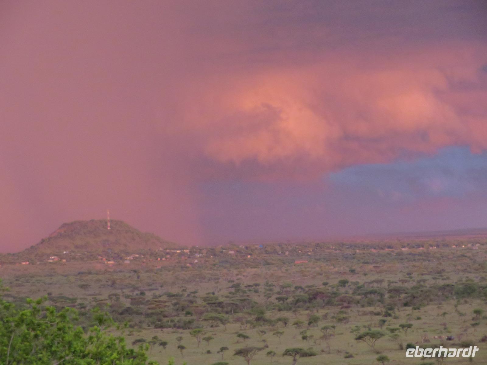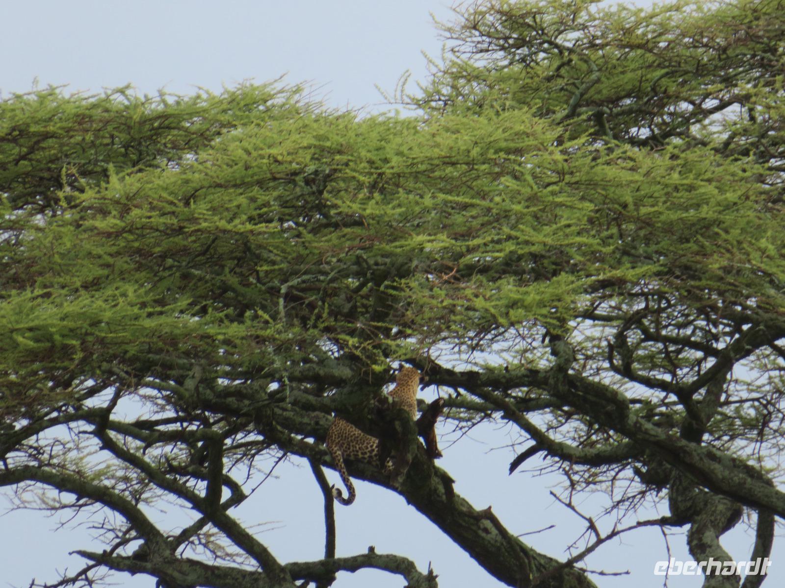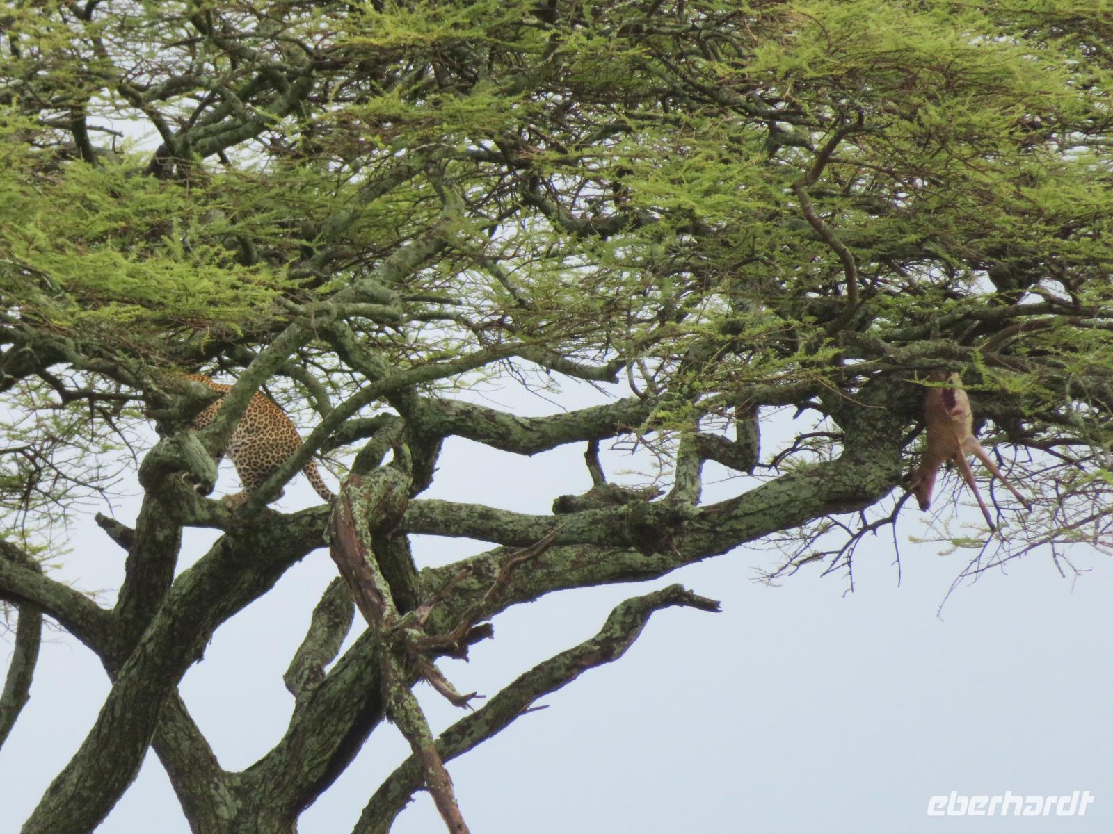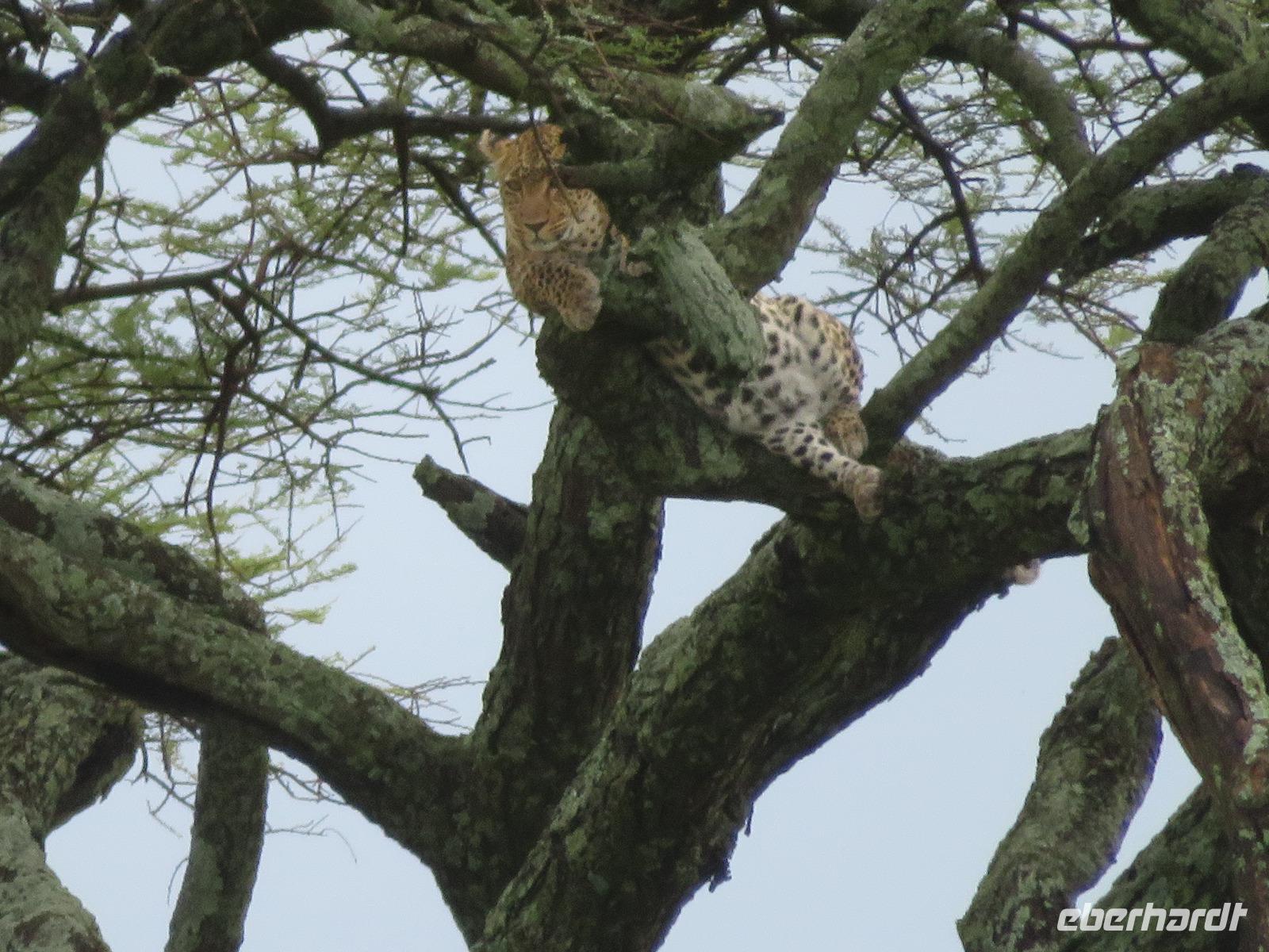 Am Morgen verlassen wir unsere Lodge und unsere Reise führt nochmals vorbei am Ngorongoro-Krater. Unsere erste Station ist ein Massai-Dorf. Die Menschen dieses bekannten Stammes leben noch völlig traditionell in ihren Dörfern in Lehmhütten meist als Hirten mit ihren Tieren. Wir werden zunächst von den Dorfbewohnern in ihrer bunten Kleidung und dem üppigen Perlenschmuck mit einem Begrüßungslied empfangen. Nun folgt die Vorführung eines Tanzes mit den typischen hohen Sprüngen der Männer. Dann werden wir in das Dorf gebeten. Die Männer zeigen uns, wie sie mit ihren langen Messern, Holz und trockenem Gras durch Reibung Hitze und damit Feuer anzünden. Anschließend besuchen wir den Kindergarten. Hier lernen die 3-5jährigen Kinder bereits das Alphabet und die Zahlen bis Einhundert. Auch die Kinder begrüßen uns mit einem fröhlichen Lied. Zum Abschluss werden wir noch eingeladen, in die Lehmhütten einzutreten. Wir sehen, wie einfach die Massai auf kleinstem Raum leben. Dies ist für uns ein sehr eindrückliches Erlebnis. Danach ist die Olduvai-Schlucht unser nächstes Ziel. Hier wurden bei Ausgrabungen Fußabdrücke der ersten aufrecht gehenden Menschen und primitive Steinwerkzeuge und menschliche Überreste gefunden. Diese Fußabdrücke hinterließen die ersten Menschen vor 3 Millionen Jahren in einer Lavaschicht. Sie wurden durch Vulkanasche konserviert. In einem gut gestalteten kleinen Museum werden die Geschichte und die weitere Entwicklung der Menschen und der Tiere in früher Vorzeit dargestellt. Vom Aussichtspunkt haben wir einen fantastischen Blick in die beeindruckende tiefe Schlucht, wo die Ausgrabungen erfolgten. Im Anschluss reisen wir weiter ins Serengeti-Schutzgebiet. Die Massai nennen die Serengeti "große, endlose Weite". Dieser Name ist durchaus berechtigt, umfasst das Schutzgebiet doch 10.000 Quadratkilometer. Wir fahren durch dieses einmalige Gebiet und sehen bereits wieder verschiedene Tiere: Löwinnen haben es sich mit ihren Jungtieren auf der Straße man sollte lieber Piste sagen, unter einem Jeep im Schatten gemütlich gemacht. Sie hatten wohl gerade gefressen, denn sie bewegten sich nur sehr langsam und hatten alle dicke Bäuche. Elefanten sind auf der Suche nach Futter und lassen sich dabei von uns nicht stören und Hippos, wie die Nilpferde genannt werden, dösen in der Sonne an einem Tümpel. Wir sind begeistert. Unser Mittagessen nehmen wir als sehr gutes Menü in der Serengeti Sopa Lodge mit herrlichem Blick in die Serengeti ein. Anschließend fahren wir weiter durch den Nationalpark. Wir sehen wieder große Herden von Zebras und Impalas. Allerdings zieht auch ein heftiges Gewitter auf. Gerade noch rechtzeitig schließen wir die Dächer unserer Jeeps, bevor ein mächtiger Regenguss auf die Erde niedergeht. Im Nu verwandeln sich die Pisten in kleine Bäche oder Schlammstraßen. Macdonald und Amos beweisen ihr ganzes Können beim Fahren. Manchmal kommen wir uns vor, wie in einem Amphipien-Fahrzeug. Es geht durch Wasserlöcher, Bachläufe und Schlammstellen. Doch so schnell wie der Regen kam, ist er auch wieder weg. Unsere Tour geht weiter und plötzlich biegen unsere beiden Fahrer von der Hauptpiste in einen Nebenweg ein. Dieser gleicht einer Schlammwüste. Immer mehr Jeeps folgen uns. Was haben die Guides entdeckt? Vor uns stehen auf einmal an die 10 Jeeps und alle schauen gebannt in eine Schirmakazie: Da ist er endlich - Nummer 5 der „Big Five" - ein Leopard. Wir können es kaum fassen. Wir dürfen sogar sehen, dass er auch seine „Vorratskammer" aufgefüllt hat: in ca. 5 - 6 Metern Höhe hängt eine tote Gazelle kopfüber im Geäst. Uns ist es vergönnt, wunderschöne Fotos von diesem tollen Leoparden zu machen. Wir sind alle total begeistert! Am frühen Abend erreichen wir das Gate und verlassen zunächst den Nationalpark. Wir erreichen die Serengeti Simba Lodge, unser Quartier für die nächsten beiden Nächte. Diese liegt wunderschön an einem Hügel. Die Zimmer sind wieder massive teils mit Zeltbahnen erbaute kleine Hütten. Jede verfügt über ein großes Panoramafenster und Terrasse mit herrlichem Blick in die Serengeti. Wir lassen den Tag beim Abendessen nochmals Revue passieren. Dabei dürfen wir noch ein besonderes Wetterphänomen erleben: Auf der einen Seite braut sich ein starkes Gewitter mit beginnendem Regen zusammen und taucht den Himmel in rosa-violettes Licht mit einem phantastischen doppelten Regenbogen und auf der anderen Seite geht die Sonne mit einem wunderbaren Lichtspiel in gelb und orange unter. Wir hören die Rufe des Löwen und die Schreie der Hyänen. Nun ist uns auch wieder klar, warum wir von Massai im Dunkeln vom Restaurant zu unseren Zelten gebracht werden.