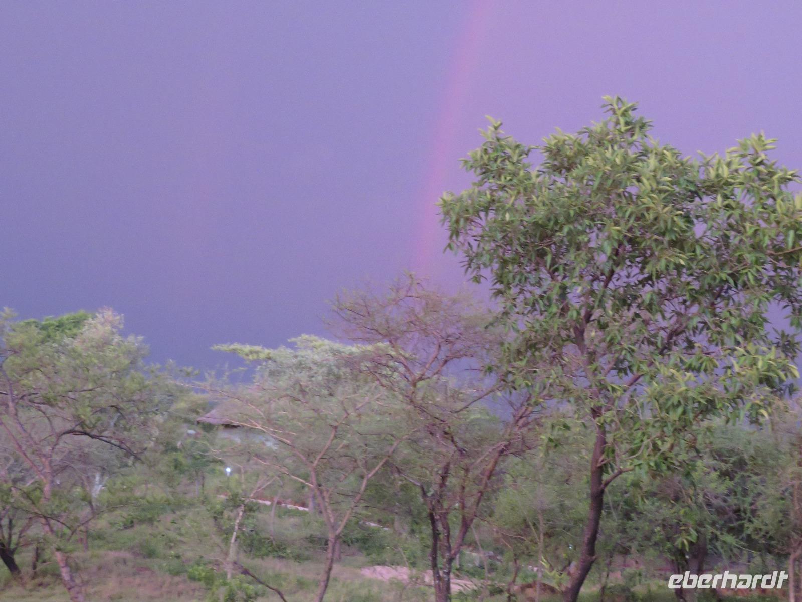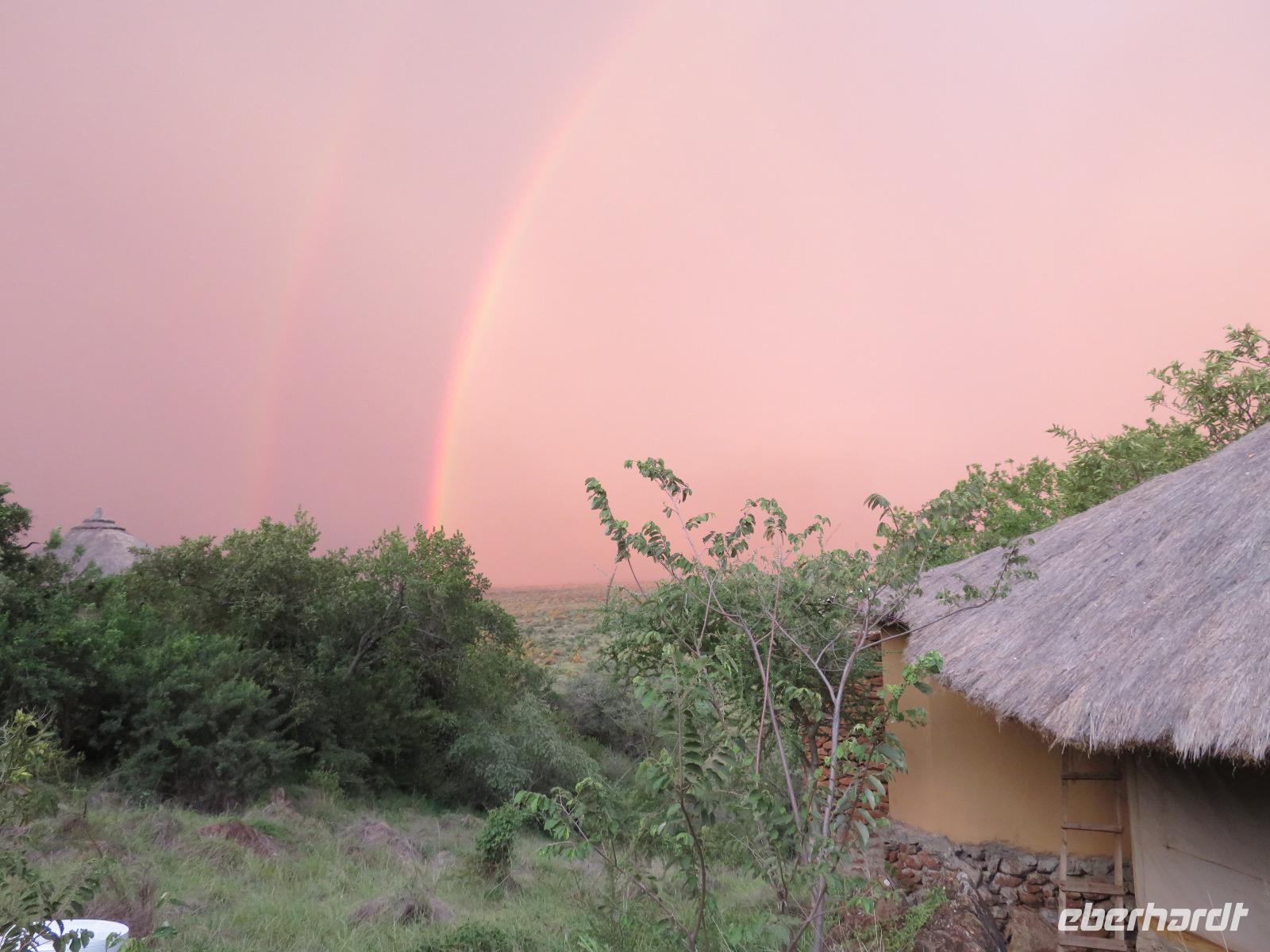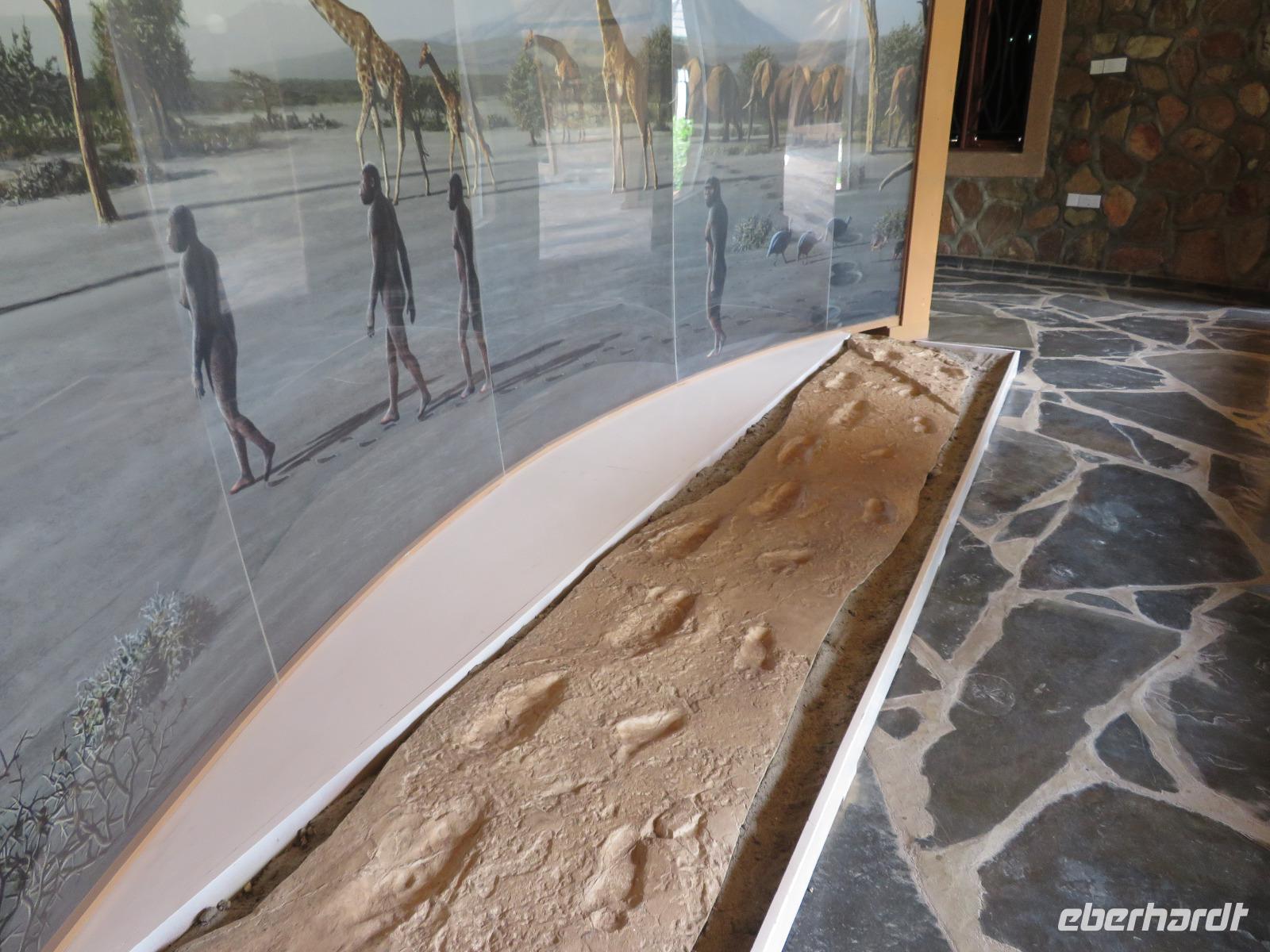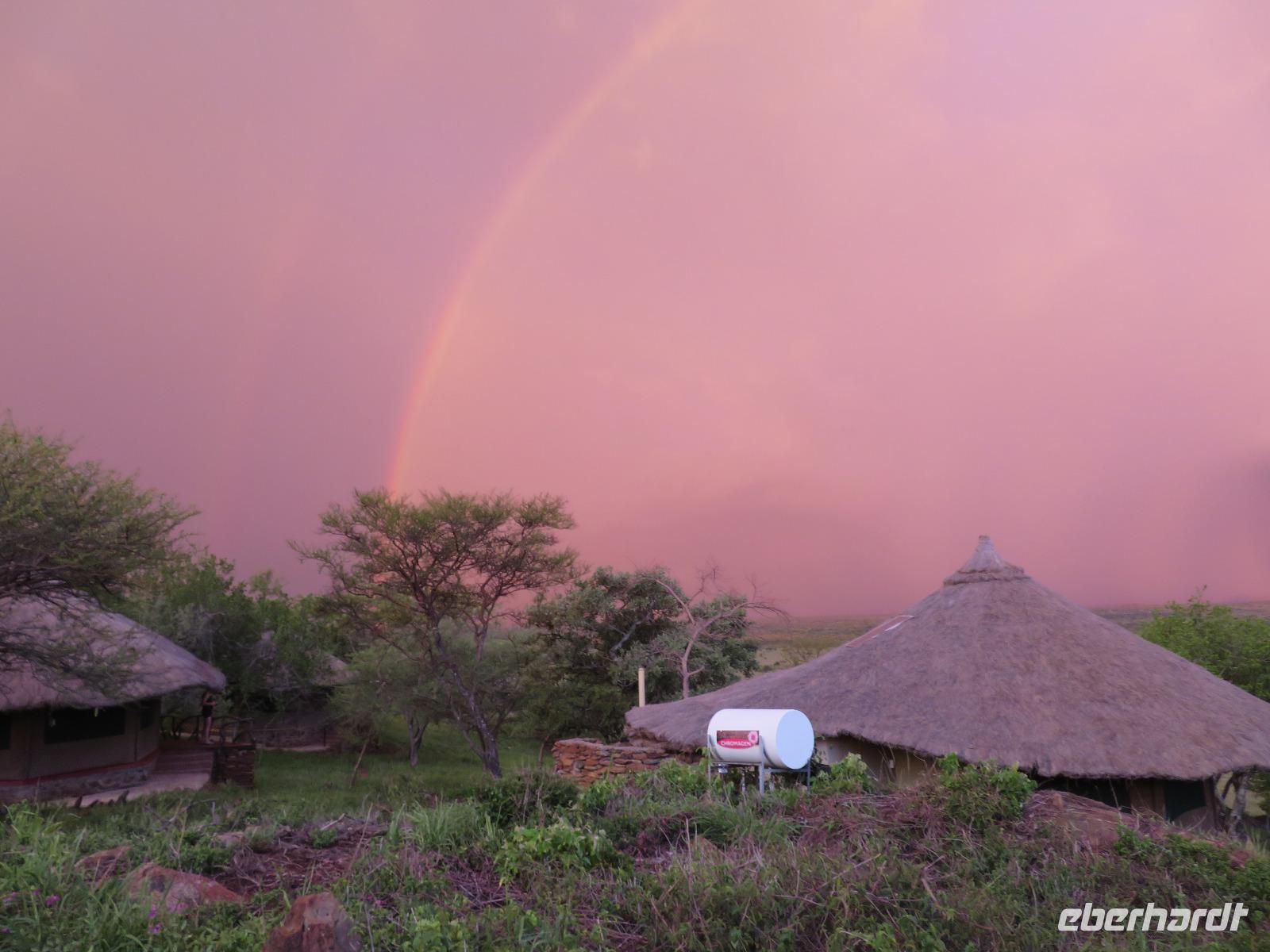 Am Morgen verlassen wir unsere Lodge und unsere Reise führt nochmals vorbei am Ngorongoro-Krater. Unsere erste Station ist ein Massai-Dorf. Die Menschen dieses bekannten Stammes leben noch völlig traditionell in ihren Dörfern in Lehmhütten meist als Hirten mit ihren Tieren. Wir werden zunächst von den Dorfbewohnern in ihrer bunten Kleidung und dem üppigen Perlenschmuck mit einem Begrüßungslied empfangen. Nun folgt die Vorführung eines Tanzes mit den typischen hohen Sprüngen der Männer. Dann werden wir in das Dorf gebeten. Die Männer zeigen uns, wie sie mit ihren langen Messern, Holz und trockenem Gras durch Reibung Hitze und damit Feuer anzünden. Anschließend besuchen wir den Kindergarten. Hier lernen die 3-5jährigen Kinder bereits das Alphabet und die Zahlen bis Einhundert. Auch die Kinder begrüßen uns mit einem fröhlichen Lied. Zum Abschluss werden wir noch eingeladen, in die Lehmhütten einzutreten. Wir sehen, wie einfach die Massai auf kleinstem Raum leben. Dies ist für uns ein sehr eindrückliches Erlebnis. Danach ist die Olduvai-Schlucht unser nächstes Ziel. Hier wurden bei Ausgrabungen Fußabdrücke der ersten aufrecht gehenden Menschen und primitive Steinwerkzeuge und menschliche Überreste gefunden. Diese Fußabdrücke hinterließen die ersten Menschen vor 3 Millionen Jahren in einer Lavaschicht. Sie wurden durch Vulkanasche konserviert. In einem gut gestalteten kleinen Museum werden die Geschichte und die weitere Entwicklung der Menschen und der Tiere in früher Vorzeit dargestellt. Vom Aussichtspunkt haben wir einen fantastischen Blick in die beeindruckende tiefe Schlucht, wo die Ausgrabungen erfolgten. Im Anschluss reisen wir weiter ins Serengeti-Schutzgebiet. Die Massai nennen die Serengeti "große, endlose Weite". Dieser Name ist durchaus berechtigt, umfasst das Schutzgebiet doch 10.000 Quadratkilometer. Wir fahren durch dieses einmalige Gebiet und sehen bereits wieder verschiedene Tiere: Löwinnen haben es sich mit ihren Jungtieren auf der Straße man sollte lieber Piste sagen, unter einem Jeep im Schatten gemütlich gemacht. Sie hatten wohl gerade gefressen, denn sie bewegten sich nur sehr langsam und hatten alle dicke Bäuche. Elefanten sind auf der Suche nach Futter und lassen sich dabei von uns nicht stören und Hippos, wie die Nilpferde genannt werden, dösen in der Sonne an einem Tümpel. Wir sind begeistert. Unser Mittagessen nehmen wir als sehr gutes Menü in der Serengeti Sopa Lodge mit herrlichem Blick in die Serengeti ein. Anschließend fahren wir weiter durch den Nationalpark. Wir sehen wieder große Herden von Zebras und Impalas. Allerdings zieht auch ein heftiges Gewitter auf. Gerade noch rechtzeitig schließen wir die Dächer unserer Jeeps, bevor ein mächtiger Regenguss auf die Erde niedergeht. Im Nu verwandeln sich die Pisten in kleine Bäche oder Schlammstraßen. Macdonald und Amos beweisen ihr ganzes Können beim Fahren. Manchmal kommen wir uns vor, wie in einem Amphipien-Fahrzeug. Es geht durch Wasserlöcher, Bachläufe und Schlammstellen. Doch so schnell wie der Regen kam, ist er auch wieder weg. Unsere Tour geht weiter und plötzlich biegen unsere beiden Fahrer von der Hauptpiste in einen Nebenweg ein. Dieser gleicht einer Schlammwüste. Immer mehr Jeeps folgen uns. Was haben die Guides entdeckt? Vor uns stehen auf einmal an die 10 Jeeps und alle schauen gebannt in eine Schirmakazie: Da ist er endlich - Nummer 5 der „Big Five" - ein Leopard. Wir können es kaum fassen. Wir dürfen sogar sehen, dass er auch seine „Vorratskammer" aufgefüllt hat: in ca. 5 - 6 Metern Höhe hängt eine tote Gazelle kopfüber im Geäst. Uns ist es vergönnt, wunderschöne Fotos von diesem tollen Leoparden zu machen. Wir sind alle total begeistert! Am frühen Abend erreichen wir das Gate und verlassen zunächst den Nationalpark. Wir erreichen die Serengeti Simba Lodge, unser Quartier für die nächsten beiden Nächte. Diese liegt wunderschön an einem Hügel. Die Zimmer sind wieder massive teils mit Zeltbahnen erbaute kleine Hütten. Jede verfügt über ein großes Panoramafenster und Terrasse mit herrlichem Blick in die Serengeti. Wir lassen den Tag beim Abendessen nochmals Revue passieren. Dabei dürfen wir noch ein besonderes Wetterphänomen erleben: Auf der einen Seite braut sich ein starkes Gewitter mit beginnendem Regen zusammen und taucht den Himmel in rosa-violettes Licht mit einem phantastischen doppelten Regenbogen und auf der anderen Seite geht die Sonne mit einem wunderbaren Lichtspiel in gelb und orange unter. Wir hören die Rufe des Löwen und die Schreie der Hyänen. Nun ist uns auch wieder klar, warum wir von Massai im Dunkeln vom Restaurant zu unseren Zelten gebracht werden.