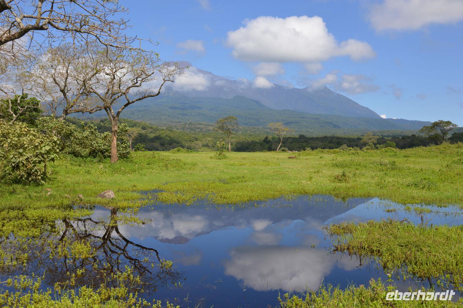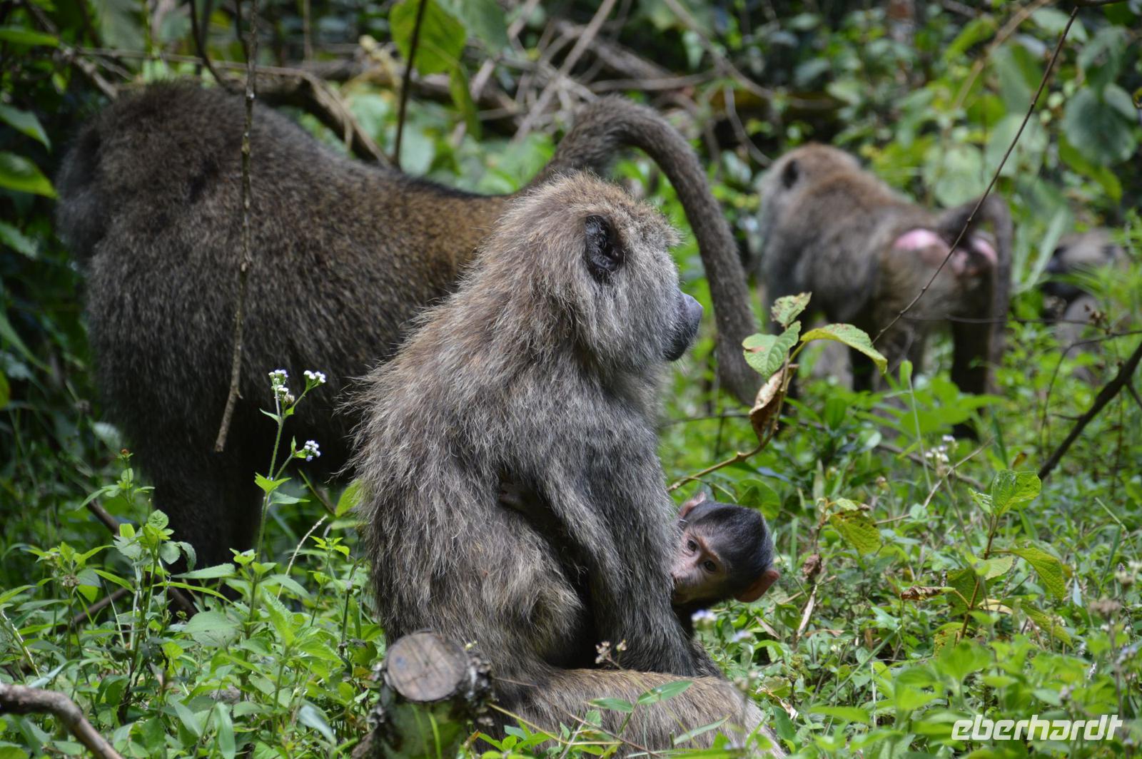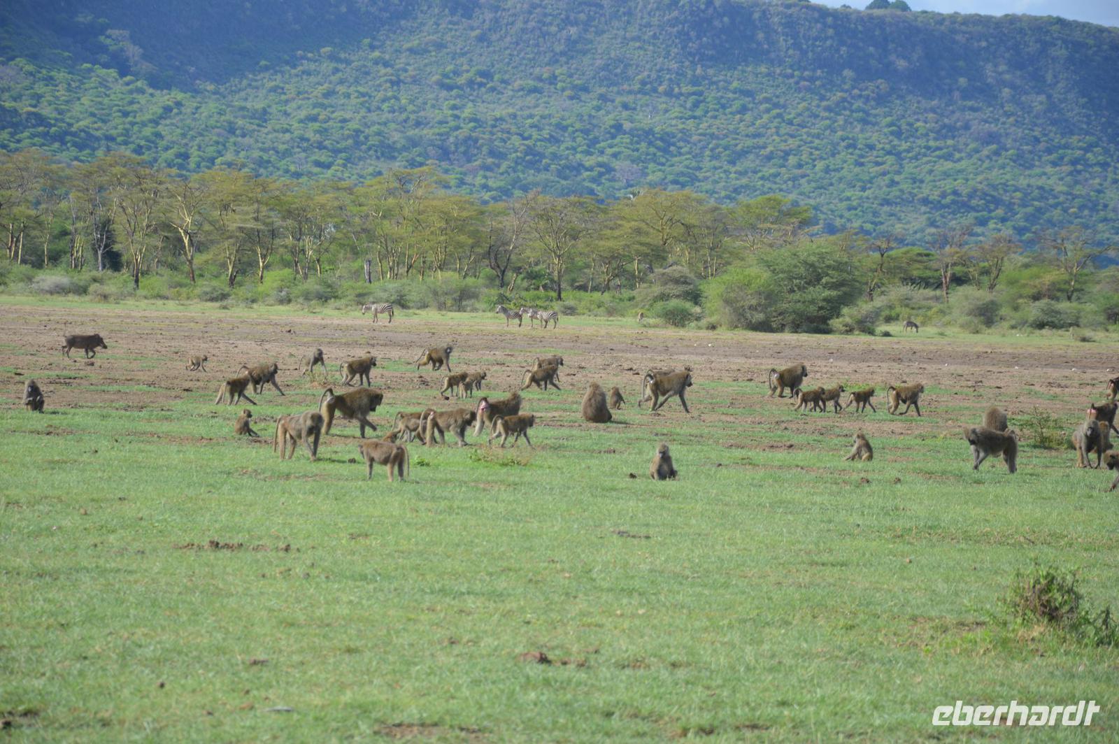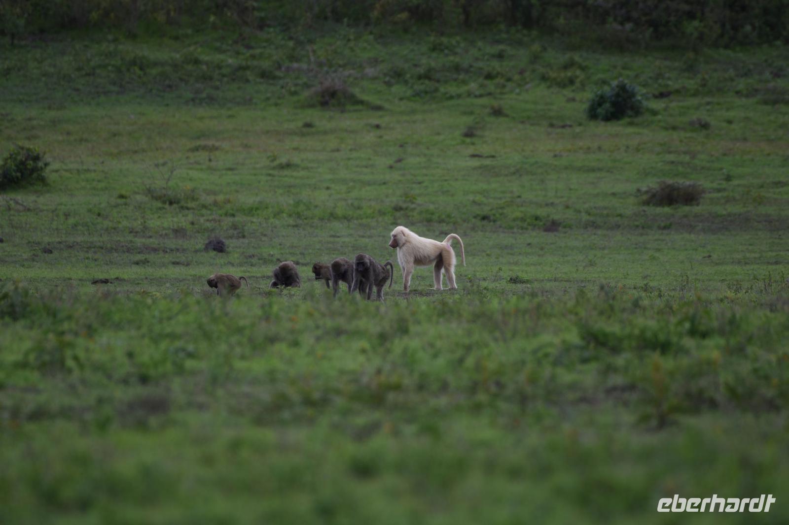 Unser Fahrer Charles holt uns mit seinem Jeep ab und wir fahren in den Arusha Nationalpark. Zuerst fahren wir auf den Kraterrand der Ngurdoto Kraters, genießen die Landschaft und auch die dort oben gut zu sehenden Guerezas. Im Bergnebelwald finden wir dann noch die Weißkehl Meerkatzen. Unten in der Grassteppe um die Momella Seen sind Wasserböcke, Büffel, Giraffen, Zebras und Kleinantilopen wie das Suni. Flamingos finden wir am Süßwasser Einfluss des Momella Sees, wo sie trinken und baden. Als ganz große Besonderheit sehen wir einen Albino Pavian, der mit seinem Harem im Pavianclan mitläuft, wirklich eine einmalige Beobachtung! Am kleinen Momella See machen wir Halt und haben dort unser Box Lunch. Auf dem Rückweg finden wir noch Schwarzhalsreiher und einiges an Kleinvogelarten sowie die winzigen Dikdiks.