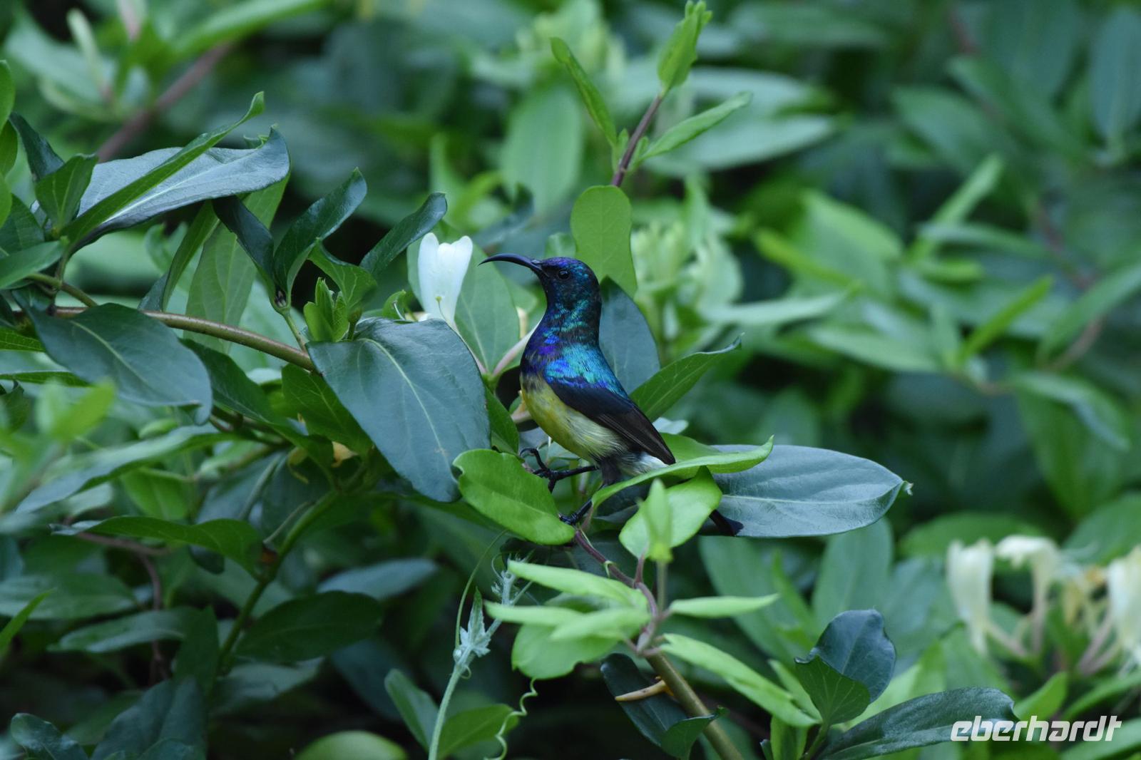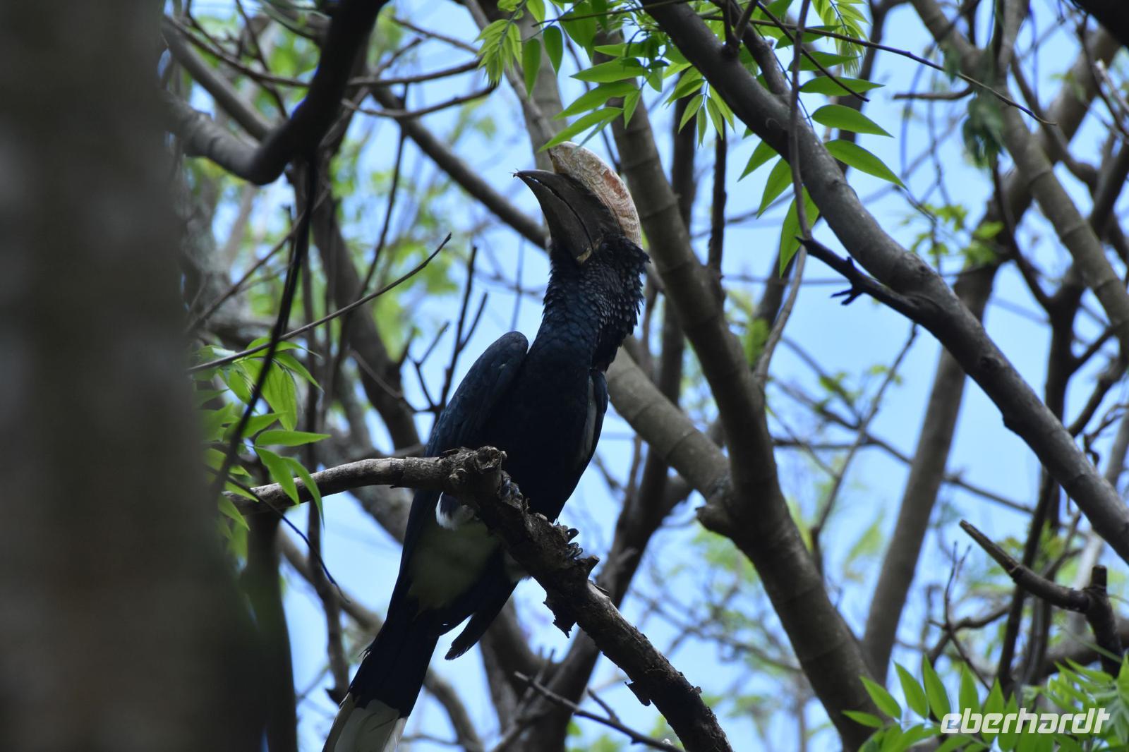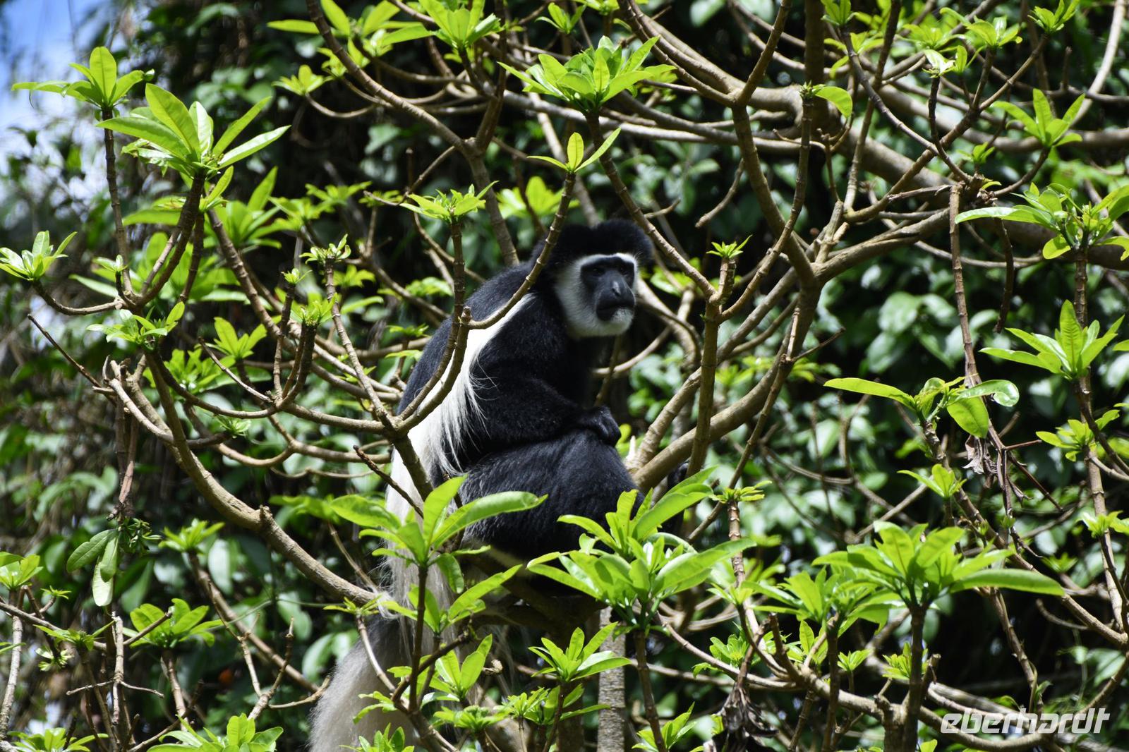 Nach einem Frühstück in toller Atmosphäre gehen wir mit einem lokalen Guide über die weitläufige Kaffeeplantage und erfahren viel über den Anbau von Hochlandkaffee. Dazu machen wir Tierbeobachtungen. Die schönen Schwarz-weißen Guerezas und beide große Hornvogelarten sind sehr gut zu sehen. An einem Flusslauf stehen große Bäume, und die sind die perfekten Brutbäume für den Silberwangen Hornvogel und Nahrungsbäume für die blattfressenden Guerezas. Im Bergnebelwald ist es immer feucht, also kein Wunder, dass wir auch die riesigen Achatschnecken sehen. Die blühenden Bäume werden von Nektarvögeln angeflogen und anderen an Nektar bzw. Insekten interessierten Vogelarten. Am Boden finden wir eine große Leopardenschildkröte. Es war ein gelungener Rundgang durch die Farm.