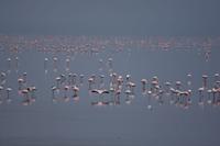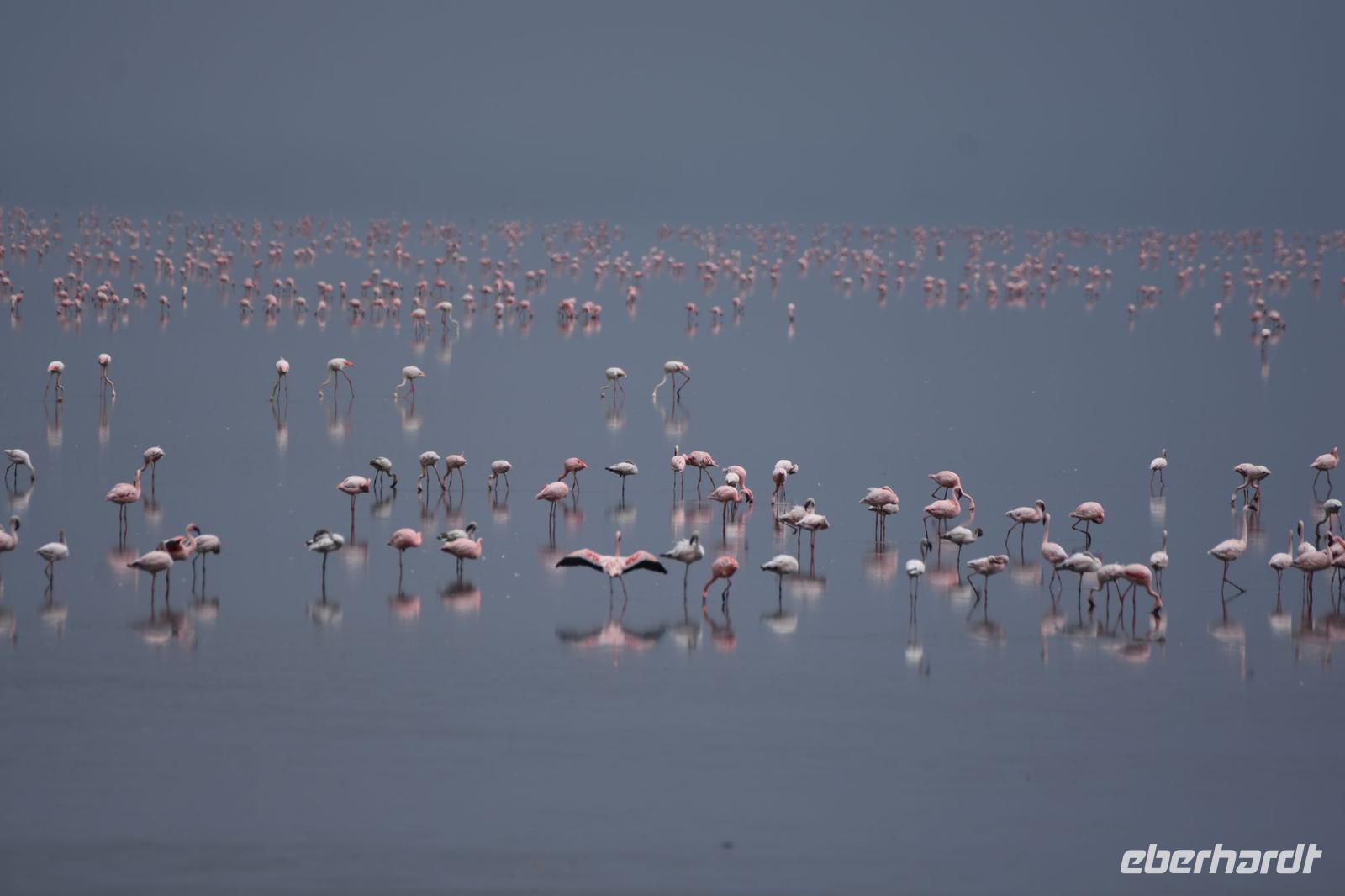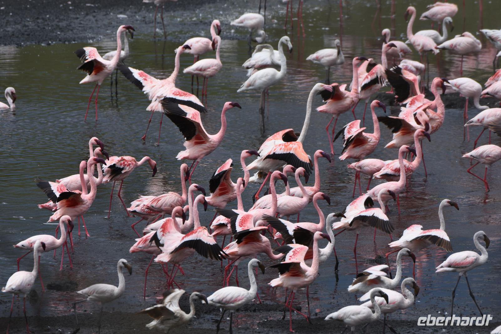 Wir müssen weiter. Da es nachts stark geregnet hat sind die Wege teilweise schlammig. Wir sehen etliche Trappen und landen quasi in einer riesigen Büffelherde von geschätzt 1.000 Tieren. Ein sehr neugieriger Elefantenbulle nähert sich dem Jeep bis auf wenige Meter. Unterwegs finden wir auch eine Ansammlung von Geiern und Marabus, die sich offensichtlich über einen weiter weg liegenden Kadaver hermachen. Am Sangaiwe Gate verlassen wir Tarangire und fahren zum Südeingang des Manyara Nationalparks durch die kleinbäuerlichen Siedlungen eines sesshaften und Ackerbau betreibenden Massai Clans. Nach dem Einchecken in den Manyara Park geht es durch den Wald zum See. Und dort finden wir endlich die Flamingomengen, die wir an den Momella Seen nicht gesehen haben: Die Oberfläche des Manyara Sees ist quasi rosa. Geschätzt dürfte sich hier momentan ca. 90% der gesamten Population beider Flamingoarten aufhalten - ein einfach sagenhaftes Schauspiel. Dazu kommen natürlich noch die hier fast weißen Gnus. Die Farbe kommt vom Suhlen in dem weißen Schlamm. Und dann die beiden Überraschungen. Um eine Kurve gefahren und wir stehen buchstäblich 3 m vor zwei Klippspringern und wenig später vor einem Palmgeier. Wir sind sprachlos, denn solche Beobachtungen sind extrem selten.
