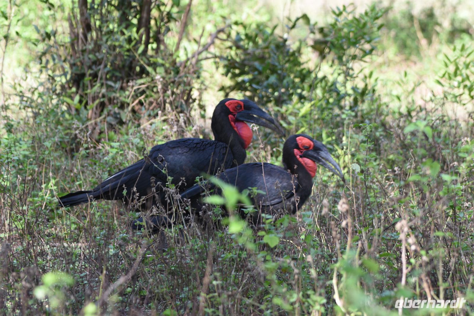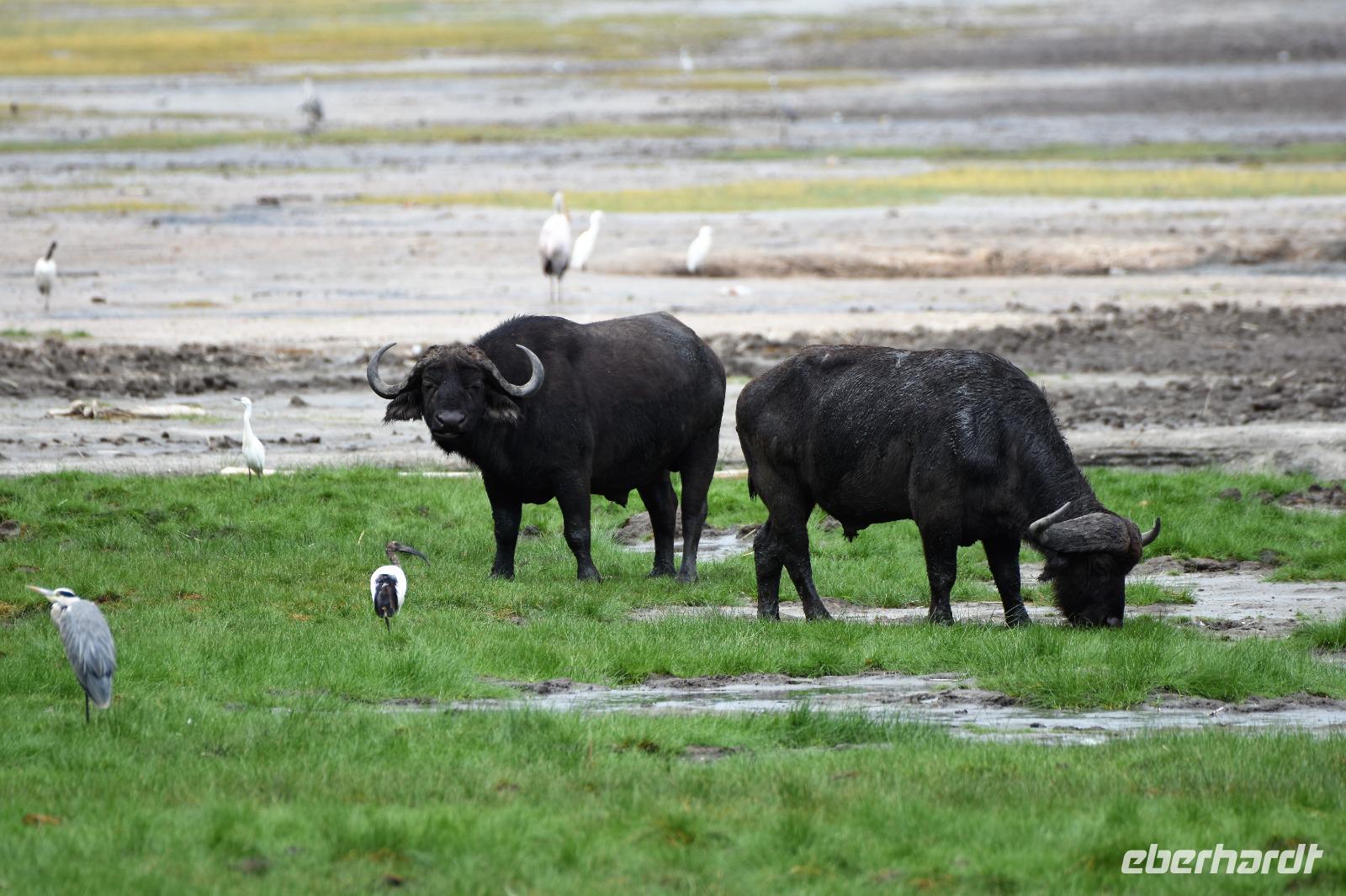 Den Boxlunch machen wir an den heißen Quellen. Dann geht es weiter Richtung Ausgang nach Norden. Eine Gruppe südlicher Hornraben hält uns dann nochmals längere Zeit auf. Am Hippo Pool sind einige Flusspferde zu sehen sowie sehr viele Reiher und Rallen nebst zwei sehr großen Büffelbullen.