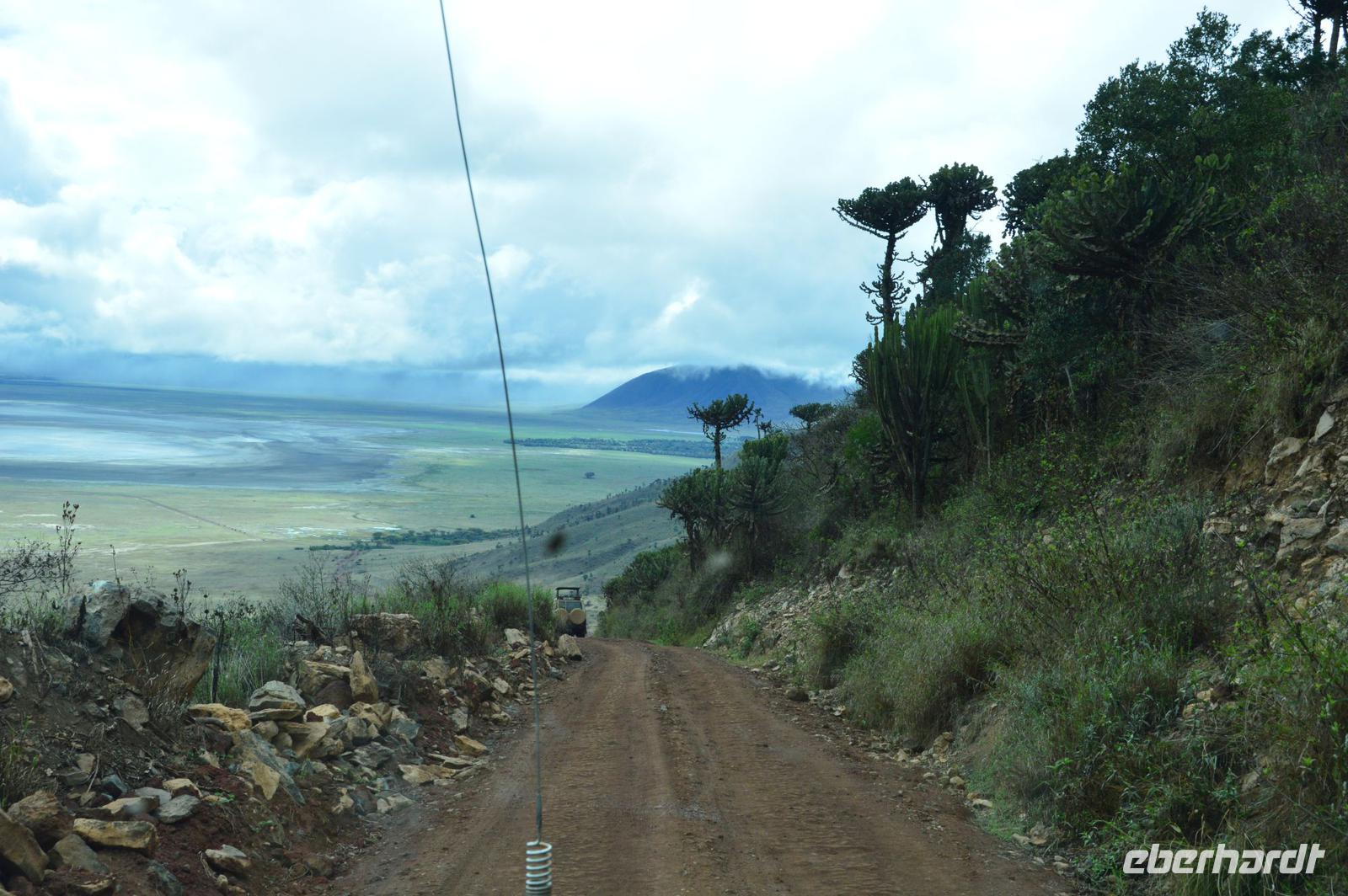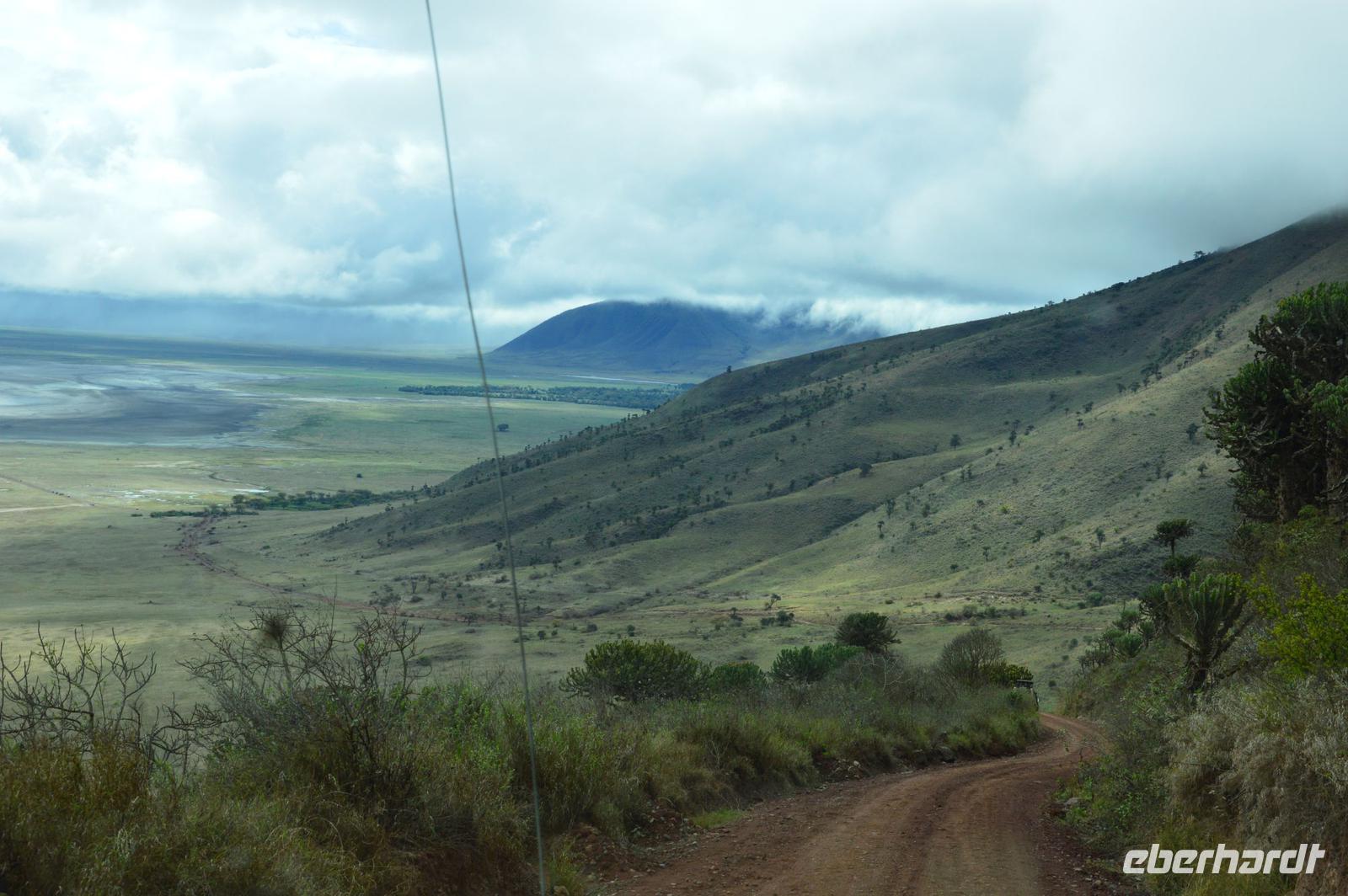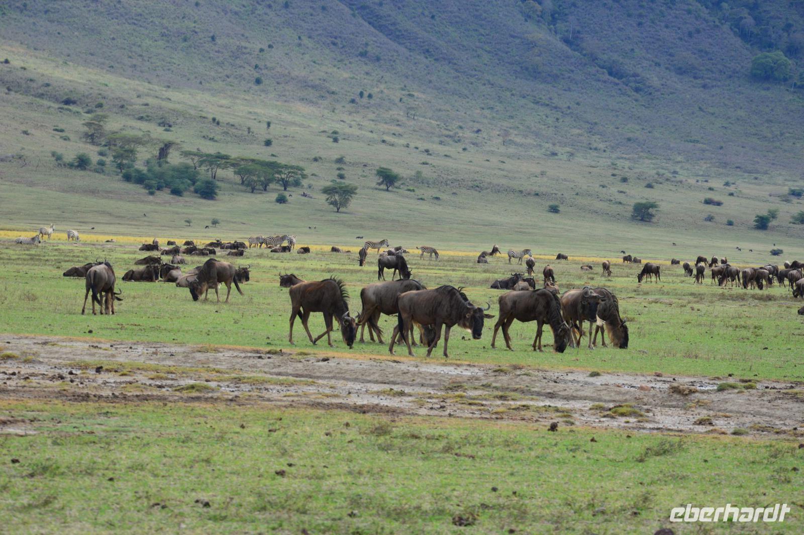 Es geht früh raus zum Ngorongoro Krater. Da wir auf der Ostseite hochfahren, geht es durch Bergnebelwald, der morgens dicht durch Nebel verhangen ist. Unten ist es dann klar. Große Herden von Gnus, Zebras, Grant- und Thomsongazellen, Büffel sind da. Wir sehen Schabracken- und Goldschakale, auch Löwen. Riesentrappen und Kronenkraniche sind gut zu beobachten und am Hippo Pool sind wirklich jede Menge Flusspferde. Am Lunchpoint haben wir unser Boxlunch. Danach sehen wir noch 6 Nashörner, allerdings weit weg. Nach dem Verlassen des Kraters stoppen wir am Denkmal für Michael und Bernhard Grzimek sowie am jetzt freien Aussichtspunkt, genießen nochmal den Blick in den Krater von oben. Dann geht es retour in die Kaffee Farm.