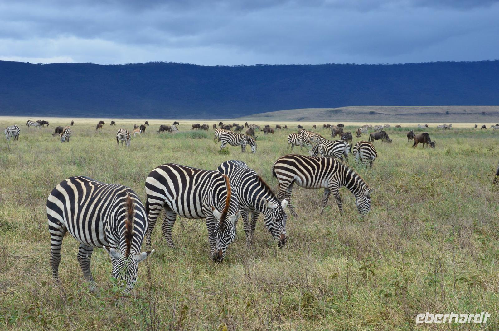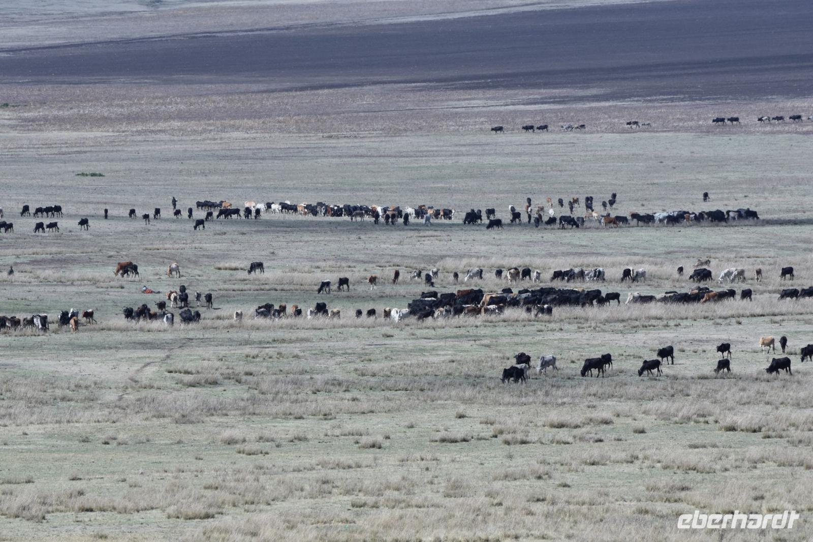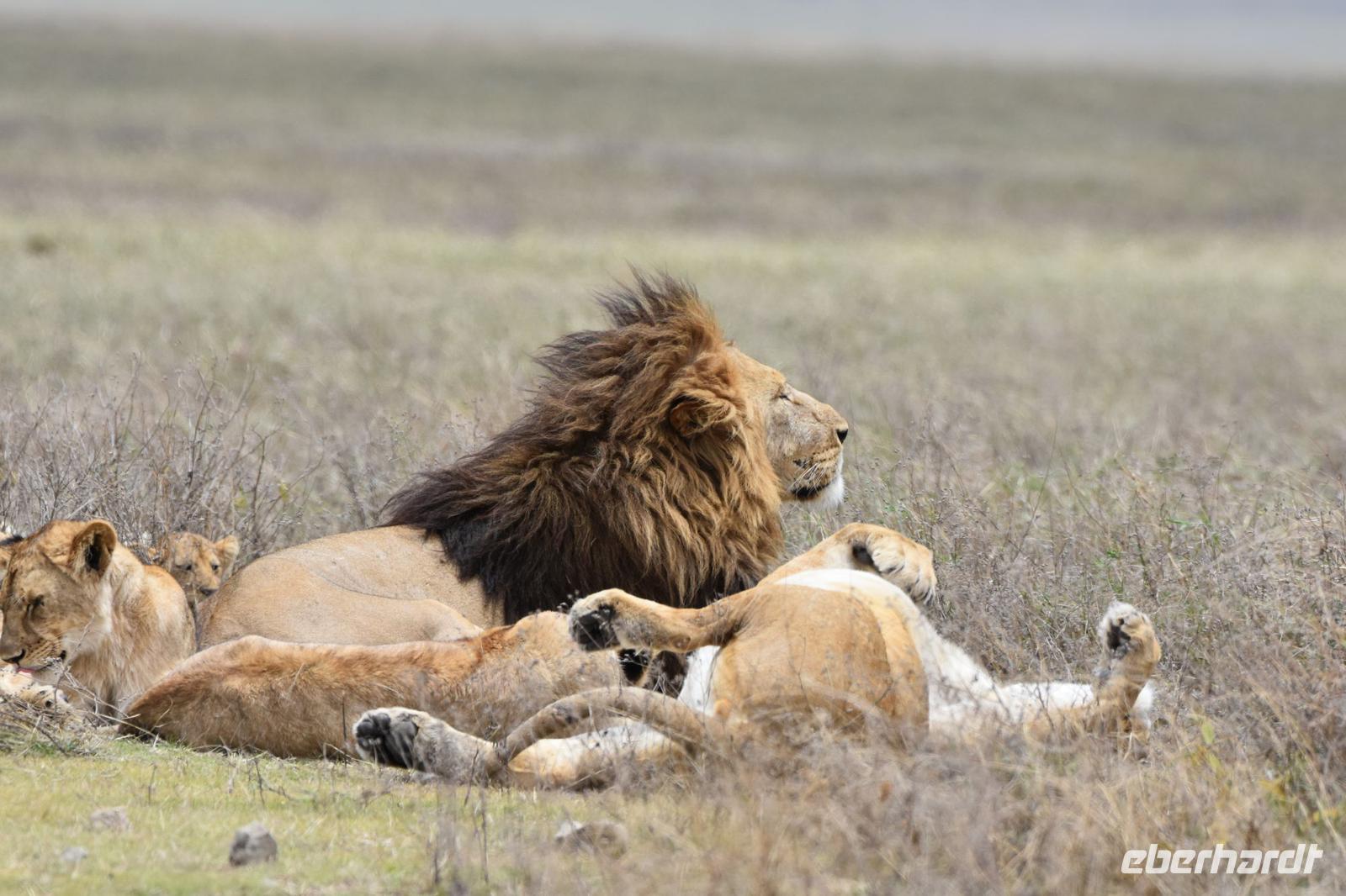 Es geht früh raus zum Ngorongoro Krater. Da wir auf der Ostseite hochfahren, geht es durch Bergnebelwald, der morgens dicht durch Nebel verhangen ist. Unten ist es dann klar. Große Herden von Gnus, Zebras, Grant- und Thomsongazellen, Büffel sind da. Wir sehen Schabracken- und Goldschakale, auch Löwen. Riesentrappen und Kronenkraniche sind gut zu beobachten und am Hippo Pool sind wirklich jede Menge Flusspferde. Am Lunchpoint haben wir unser Boxlunch. Danach sehen wir noch 6 Nashörner, allerdings weit weg. Nach dem Verlassen des Kraters stoppen wir am Denkmal für Michael und Bernhard Grzimek sowie am jetzt freien Aussichtspunkt, genießen nochmal den Blick in den Krater von oben. Dann geht es retour in die Kaffee Farm.