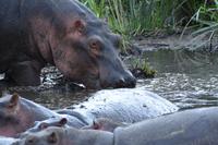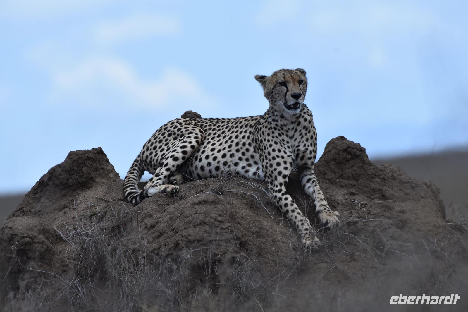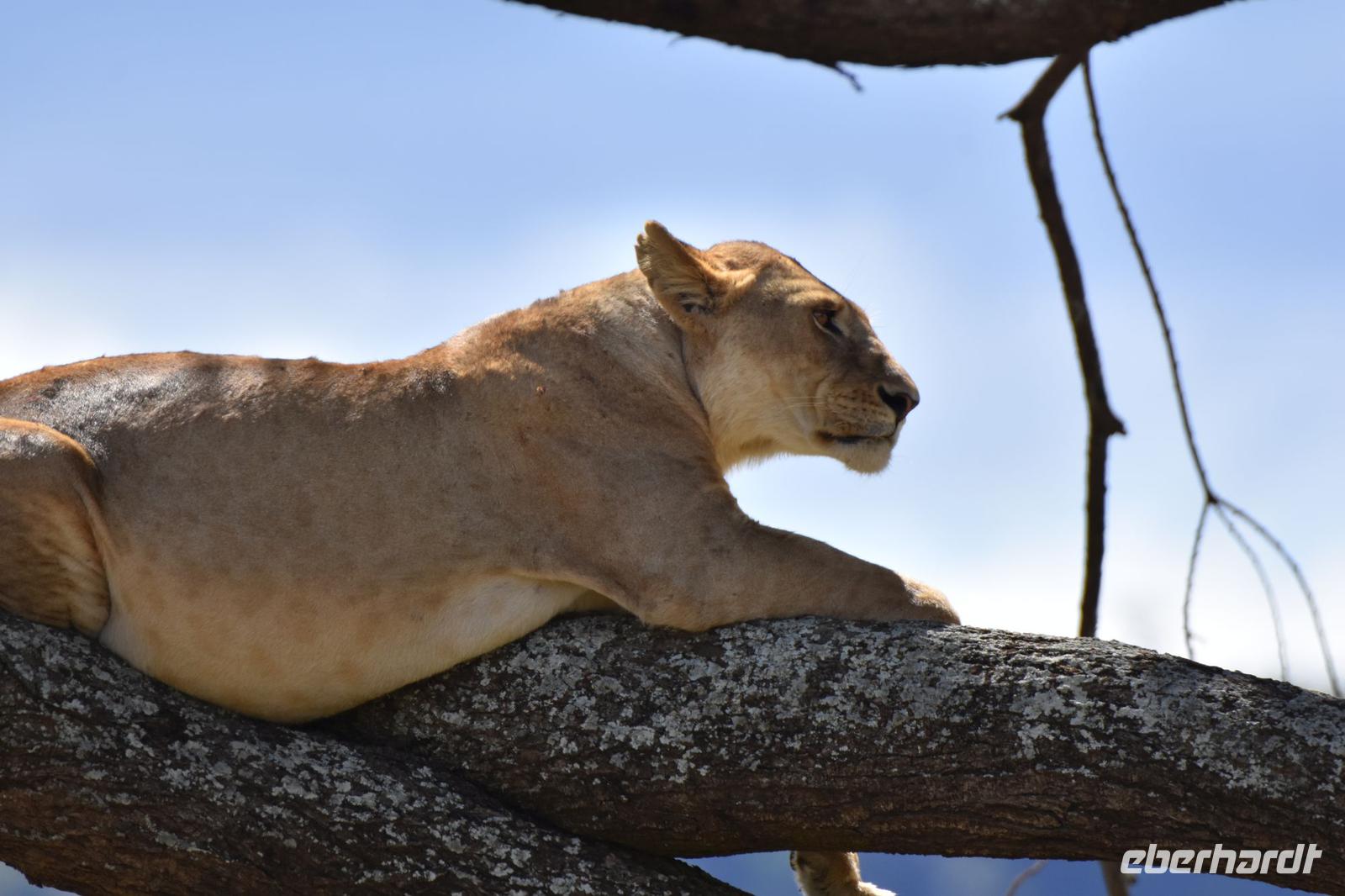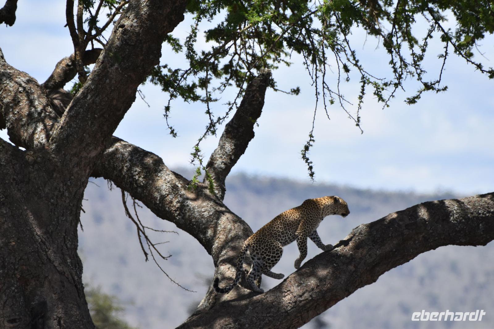 Wir fahren früh raus und nehmen Lunch Boxen mit. Dieser Game Drive war der Höhepunkt der Safari! Gleich am Camp sind riesige Herden von Gazellen, Kongonis und auch die ersten Topis. An den Kopjes sehen wir eine gro0e Elefantenherde, die wir lange beobachten. Am Ende standen wir quasi in der Herde und Jungbullen rangelten sich direkt neben dem Jeep: Unvergesslich. Dann liefen uns zwei Löwinnen mit ihren kleinen Welpen über den Weg und in einer Akazie fanden wir eine Leopardin mit einem halbwüchsigen Jungtier. Den Lunch hatten wir dann in der Seronera Lodge, wo uns beim Lunch die Klippschliefer wörtlich über die Füße liefen. Nach einem Rundgang um die Kopje ging es weiter und gleich hatten wir zwei Löwen auf einem Baum, etwas, was man in der Serengeti sehr selten sieht. Dann gab es noch einen neugierigen Geparden auf ca. 5 m und ein riesiges Nilkrokodil im Seronera Fluss. Auf dem Rückweg fanden wir eine Hyäne mit ihren Jungen, die sie gemütlich vor uns säugte. Es war einfach ein unglaublicher Game Drive!