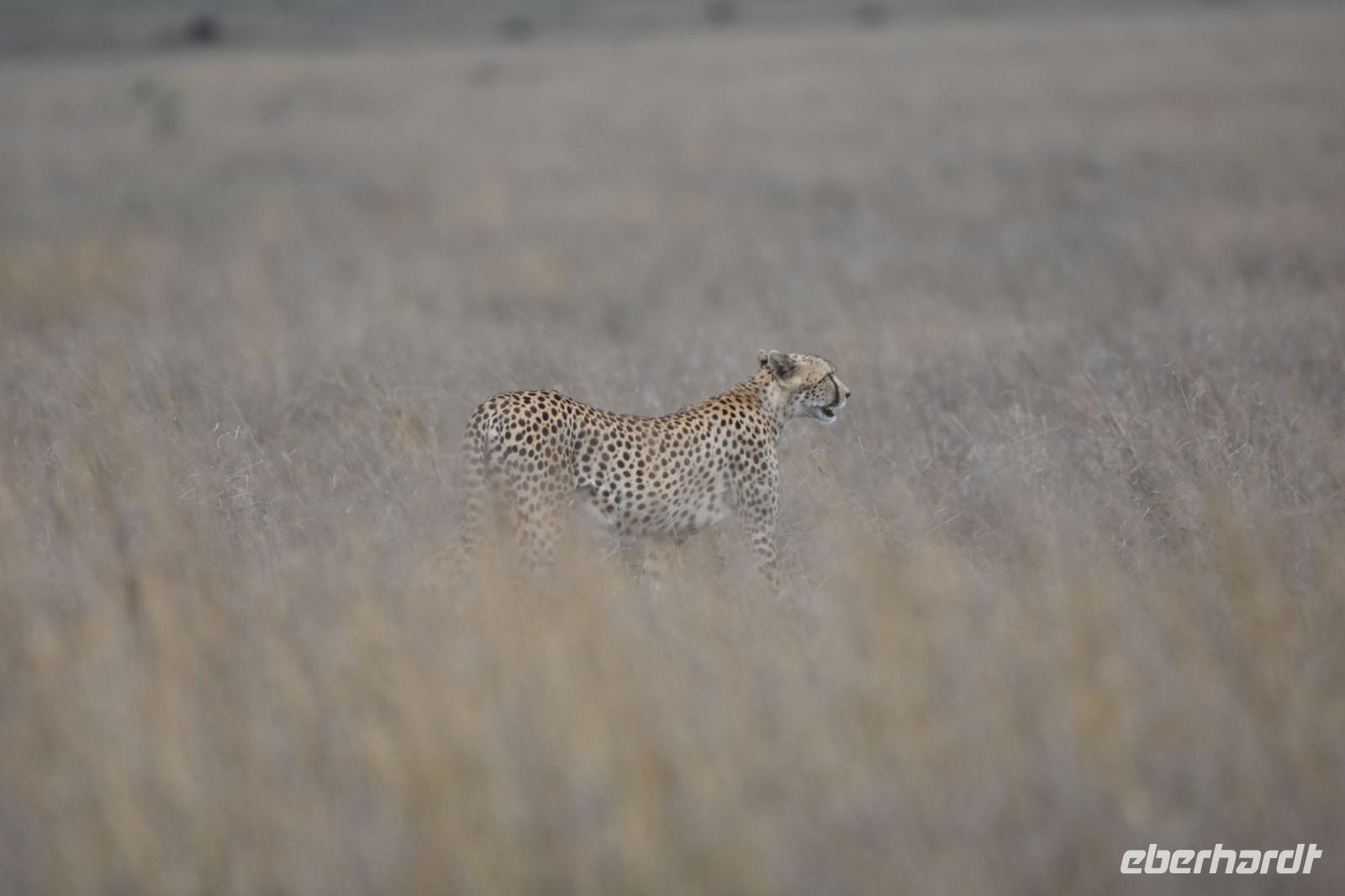 Wieder geht es früh raus Richtung Serengeti. Dafür müssen wir natürlich wieder über den Rand des Ngorongoro Kraters und dann weiter durch die Massai Steppe. Die Landschaft ist beeindruckend. An einer Massai Boma halten wir. Die Massai zeigen uns ihre Boma, begrüßen uns mit ihren Tänzen und zeigen uns auch das Innere ihrer kleinen Hütten, was doch sehr beeindruckend ist. Danach geht es zur Olduvai Schlucht, wo Leakey gegraben hat. Das neue Museum ist sehr gut gemacht und erklärt die Evolution des Menschen ordentlich. Weiter geht es zum Naabi Gate, dem Eingang in die Serengeti. Von dort bis zum unserem Zeltcamp sind es gut 70 km. Unterwegs sehen wir in der Kurzgrassteppe Massen von Gazellen beider Arten, große Zebraherden und die ersten Geparden und Löwen. Leider hat es zuvor stark geregnet, sodass die Wege ziemlich verschlammt sind. Wir bleiben prompt auch einmal mit dem Landcruiser hängen - auch das ist Afrika. Unser Zeltcamp liegt mitten in der Kurzgrassteppe. Kurz vor Erreichen des Camps sehen wir noch, wie sich Löwen und Hyänen um ein gerissenes Zebra streiten! Schakale, Trappen und jede Menge Kleinvogelarten sind überall. Auffällig ist die hohe Anzahl von insektenfressenden Arten. Die Erklärung kommt schnell: Abends gibt es Massenflug von Termiten - und daher kein Buschdinner, da wir ansonsten wohl mehr Termiten als Nahrungsmittel auf den Tellern finden würden,