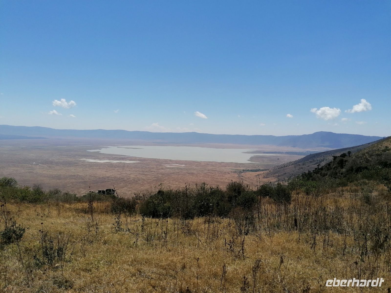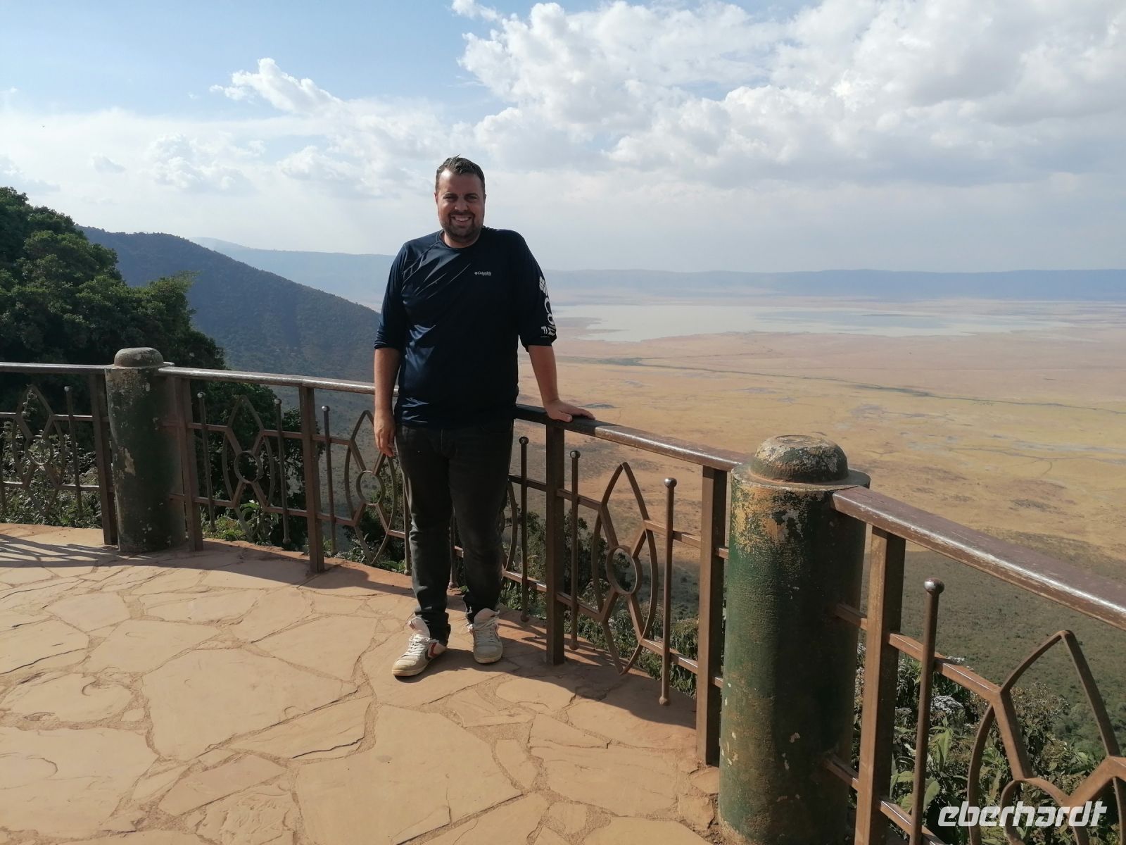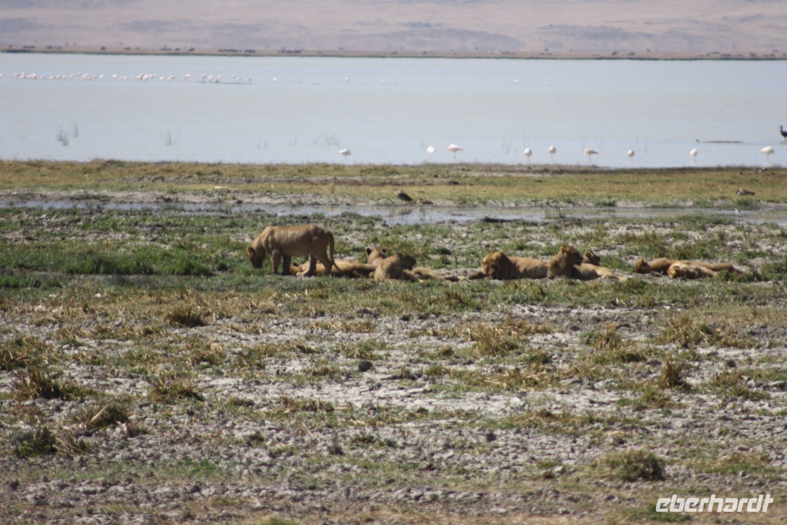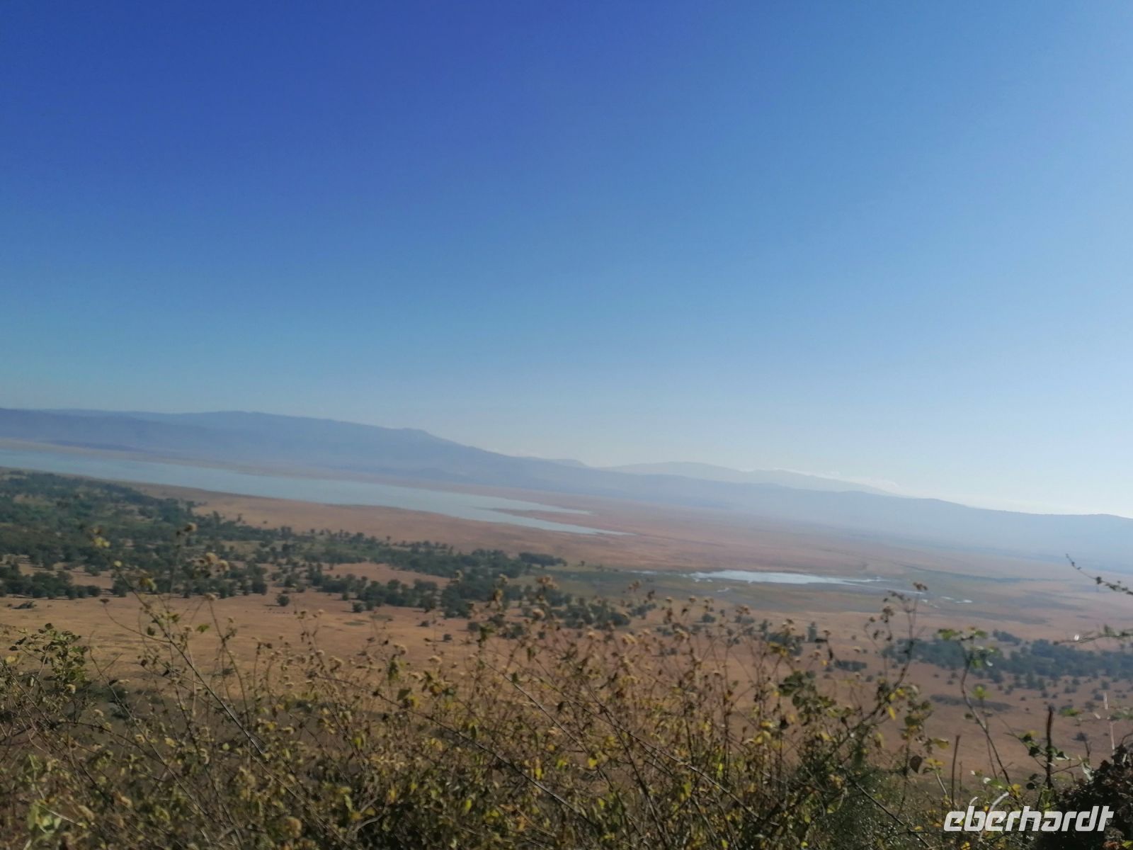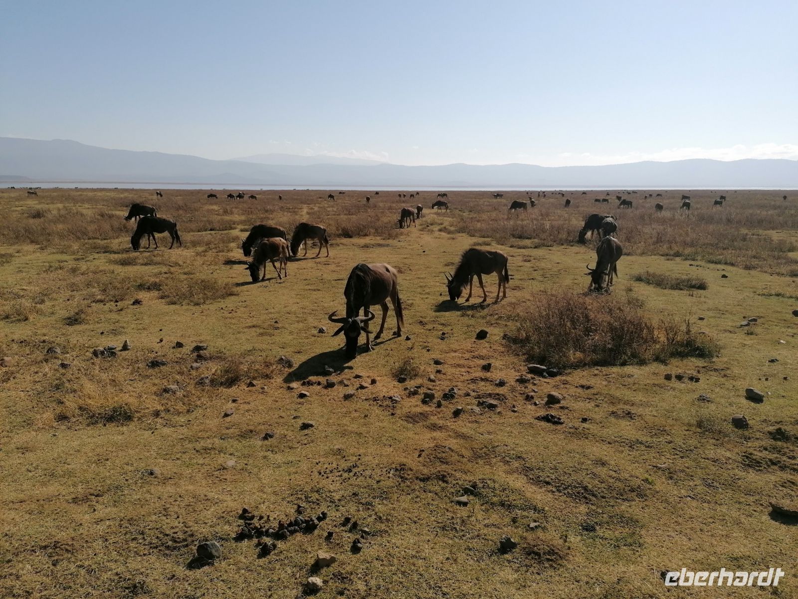 Mit dem Ngorongoro Krater stand heute ein weiteres Highlight auf unserer Agenda. Daher standen wir bereits eine Stunde früher auf und erreichten den Nationalpark bereits um 8 Uhr. Am Gate konnten wir nochmal auf Toilette und uns den Krater in einem kleinen Museum einprägen. Am Gate begrüßte uns bereits eine Paviane Familie und wir fuhren voller Vorfreude auf einer Allwetterpiste den Krater herab. Zwischendurch erhielten wir immer wieder spektakuläre Ausblicke in den Krater hinein. Unsere erste Tierbeobachtung im Krater war dagegen erstmal unspektakulär. Eine Gruppe Perlhühner hieß uns im Krater willkommen. Anschließend liefen allerdings unsere Kameras heiß. Neben einer riesigen Herde Gnu und einer Horde Büffel, konnten wir einen Schakal und Hyänen entdecken. Auch die Vogelwelt ließ sich zahlreich blicken und Bussarde, Kronenkraniche, Flamingos und Stelzenvögel flogen vor unsere Kameras. Am Rand des Lake Magadi konnten wir in eine Herde Hippos entdecken. Nicht weit entfernt fanden wir einen Rudel Hyänen, die sich ganz in der Nähe der Löwen aufhielten. Das Rudel Löwen bestand aus ca. 10 weiblichen Löwen, die bereits gespeist hatten und einen längeren Verdauungsschlaf hielten. Ein weitere Goldschakal huschte an uns vorbei, ehe wir den Hippo-Pool erreichten. In dem dreckigen Nass badeten über 30 Hippos und hielten wir uns ein Konzert ab. Grade als wir einen weiteren Vogelstrauß fotografieren wollten, erhielten wir die Nachricht, dass sich in der Nähe drei weitere Löwinnen aufhielten. Die drei Löwinnen posierten zunächst auf einen kleinen Felsvorsprung, ehe sie sich später auf einen Baum versteckten. Mit dem Fernglas konnten wir in der Ferne sogar 2 Nashörner erblicken. Nach nur wenigen Minuten spazierten eine Löwin direkt an unserem Jeep vorbei. Manchmal muss man einfach Glück haben. Ein männlicher Löwe hingegen schlummerte ganz in der Nähe im Gras und ließ sich von uns nicht stören. Auf dem Weg zum Picknick-Bereich folgte ein weiterer Höhepunkt. Zunächst erspähten wir ein Schakal, der sich eine Schlange erbeutet hatte. Plötzlich folgte ein Angriff eines Adlers und wir konnten einen Kampf um eine Schlange beobachten, welchen der Adler gewann. In der Mittagszeit speisten wir unser Lunchpaket im Jeep und genossen die wunderschöne Natur. Am Nachmittag fuhren wir ins Sumpfgebiet und konnten neben Büffel, auch Elefant beim Baden beobachten. Dann erhielten wir die Nachricht, dass ein Nashorn entdeckt wurden. Leider werden die Nashörner immer schwieriger zu sehen, da sich der Bestand der Nashörner ständig reduziert und die Wilderer ihres dazu beitragen. Unterwegs lichteten wir noch Grants-Gazellen und Thomson Gazelle ab und hielten beim einem Pelikan und Nimmersatt. Allerdings war auch hier das Nashorn nur vom weiten sichtbar, aber wir konnten immerhin ein Gefühl auf seine Größe bekommen. Leider war es nun wieder an der Zeit den Ngorongoro Krater zu verlassen. Unterwegs entdeckten wir noch weitere Hyäne, Pelikane, Hippos und einen Schakal. Am Kraterrand stoppten wir am Denkmal des berühmten Tierfilmer Bernhard Grzimek und genossen nochmal den atemberaubenden Ausblick in den Krater. Auf unserem Nachhauseweg stoppten wir noch kurz bei einem Souvenirladen, ehe wir am frühen Abend unsere Lodge erreichten. Ein atemberaubender Tag neigte sich leider dem Ende entgegen und wir stießen gemeinsam mit einen Amarula auf unseren ersten Teil der Reise an.