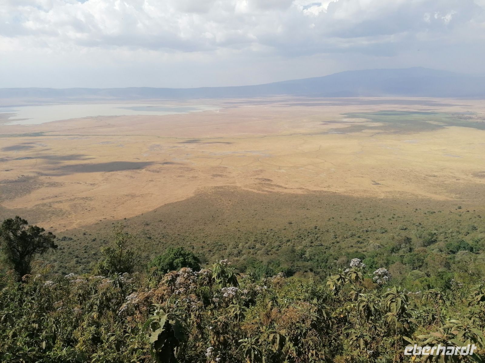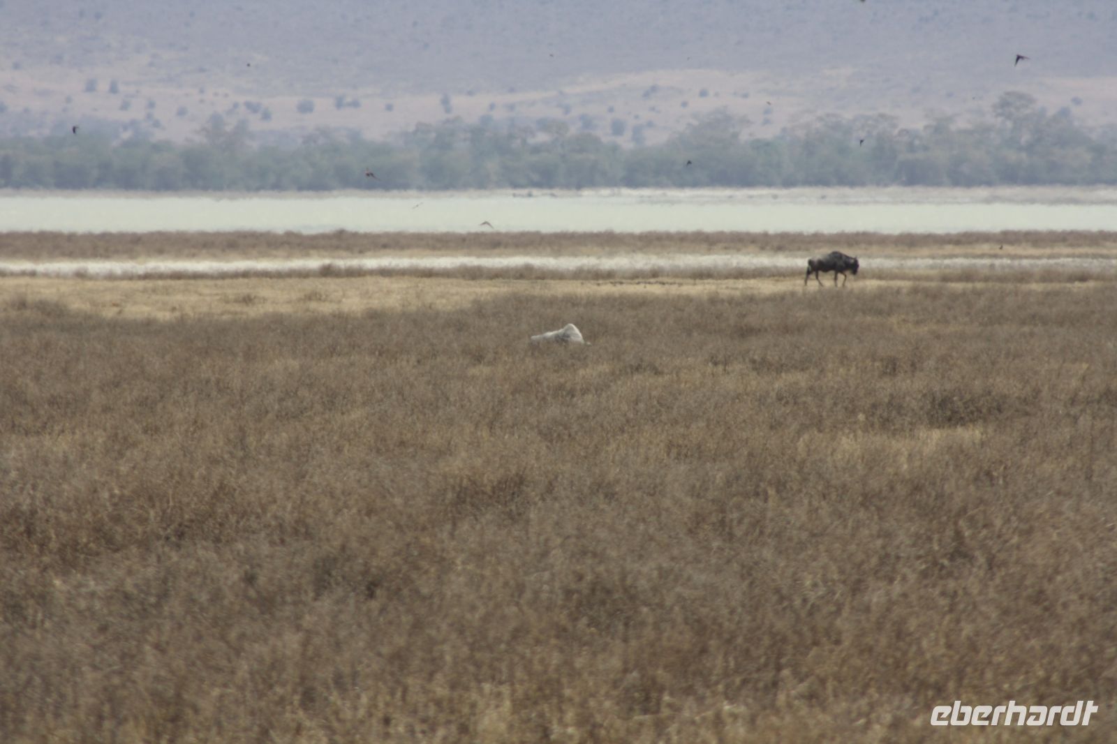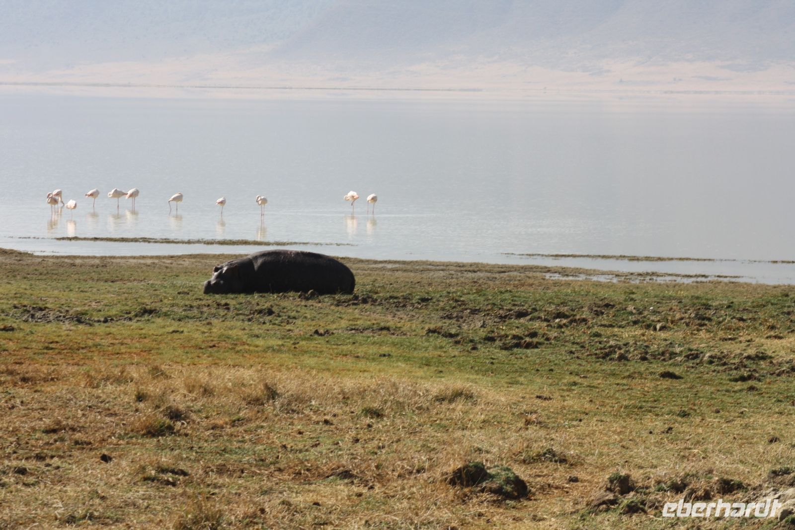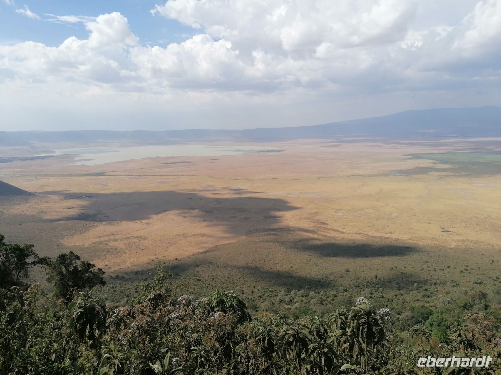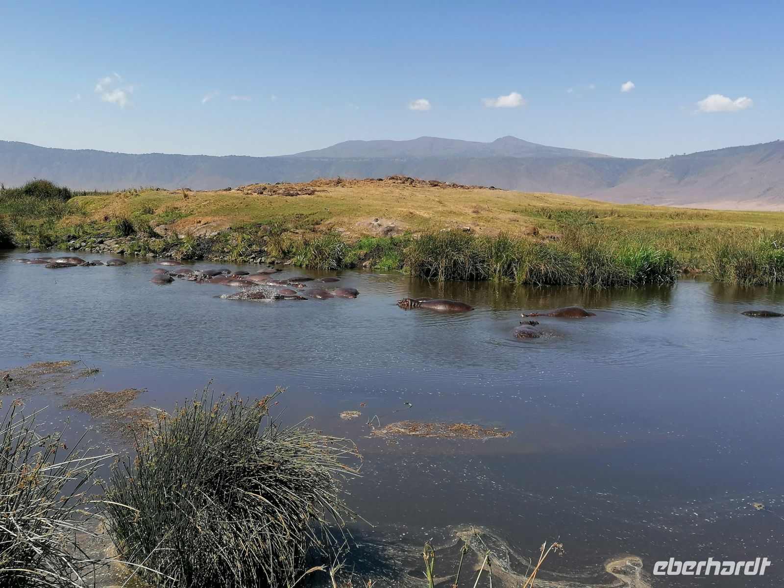 Mit dem Ngorongoro Krater stand heute ein weiteres Highlight auf unserer Agenda. Daher standen wir bereits eine Stunde früher auf und erreichten den Nationalpark bereits um 8 Uhr. Am Gate konnten wir nochmal auf Toilette und uns den Krater in einem kleinen Museum einprägen. Am Gate begrüßte uns bereits eine Paviane Familie und wir fuhren voller Vorfreude auf einer Allwetterpiste den Krater herab. Zwischendurch erhielten wir immer wieder spektakuläre Ausblicke in den Krater hinein. Unsere erste Tierbeobachtung im Krater war dagegen erstmal unspektakulär. Eine Gruppe Perlhühner hieß uns im Krater willkommen. Anschließend liefen allerdings unsere Kameras heiß. Neben einer riesigen Herde Gnu und einer Horde Büffel, konnten wir einen Schakal und Hyänen entdecken. Auch die Vogelwelt ließ sich zahlreich blicken und Bussarde, Kronenkraniche, Flamingos und Stelzenvögel flogen vor unsere Kameras. Am Rand des Lake Magadi konnten wir in eine Herde Hippos entdecken. Nicht weit entfernt fanden wir einen Rudel Hyänen, die sich ganz in der Nähe der Löwen aufhielten. Das Rudel Löwen bestand aus ca. 10 weiblichen Löwen, die bereits gespeist hatten und einen längeren Verdauungsschlaf hielten. Ein weitere Goldschakal huschte an uns vorbei, ehe wir den Hippo-Pool erreichten. In dem dreckigen Nass badeten über 30 Hippos und hielten wir uns ein Konzert ab. Grade als wir einen weiteren Vogelstrauß fotografieren wollten, erhielten wir die Nachricht, dass sich in der Nähe drei weitere Löwinnen aufhielten. Die drei Löwinnen posierten zunächst auf einen kleinen Felsvorsprung, ehe sie sich später auf einen Baum versteckten. Mit dem Fernglas konnten wir in der Ferne sogar 2 Nashörner erblicken. Nach nur wenigen Minuten spazierten eine Löwin direkt an unserem Jeep vorbei. Manchmal muss man einfach Glück haben. Ein männlicher Löwe hingegen schlummerte ganz in der Nähe im Gras und ließ sich von uns nicht stören. Auf dem Weg zum Picknick-Bereich folgte ein weiterer Höhepunkt. Zunächst erspähten wir ein Schakal, der sich eine Schlange erbeutet hatte. Plötzlich folgte ein Angriff eines Adlers und wir konnten einen Kampf um eine Schlange beobachten, welchen der Adler gewann. In der Mittagszeit speisten wir unser Lunchpaket im Jeep und genossen die wunderschöne Natur. Am Nachmittag fuhren wir ins Sumpfgebiet und konnten neben Büffel, auch Elefant beim Baden beobachten. Dann erhielten wir die Nachricht, dass ein Nashorn entdeckt wurden. Leider werden die Nashörner immer schwieriger zu sehen, da sich der Bestand der Nashörner ständig reduziert und die Wilderer ihres dazu beitragen. Unterwegs lichteten wir noch Grants-Gazellen und Thomson Gazelle ab und hielten beim einem Pelikan und Nimmersatt. Allerdings war auch hier das Nashorn nur vom weiten sichtbar, aber wir konnten immerhin ein Gefühl auf seine Größe bekommen. Leider war es nun wieder an der Zeit den Ngorongoro Krater zu verlassen. Unterwegs entdeckten wir noch weitere Hyäne, Pelikane, Hippos und einen Schakal. Am Kraterrand stoppten wir am Denkmal des berühmten Tierfilmer Bernhard Grzimek und genossen nochmal den atemberaubenden Ausblick in den Krater. Auf unserem Nachhauseweg stoppten wir noch kurz bei einem Souvenirladen, ehe wir am frühen Abend unsere Lodge erreichten. Ein atemberaubender Tag neigte sich leider dem Ende entgegen und wir stießen gemeinsam mit einen Amarula auf unseren ersten Teil der Reise an.