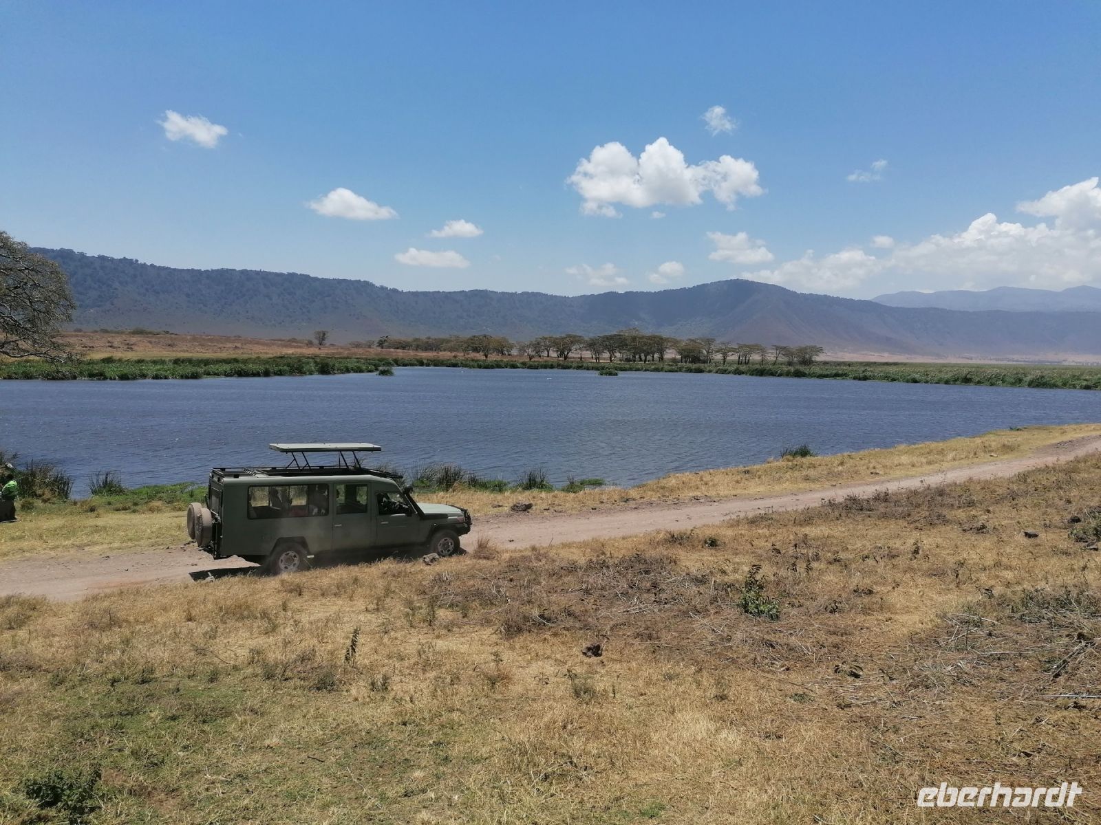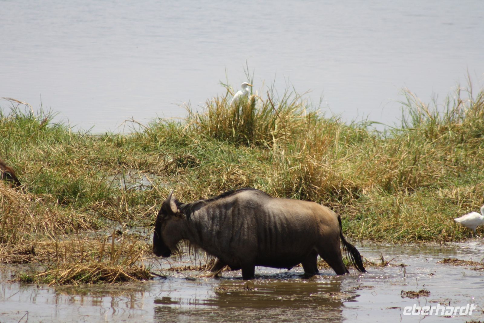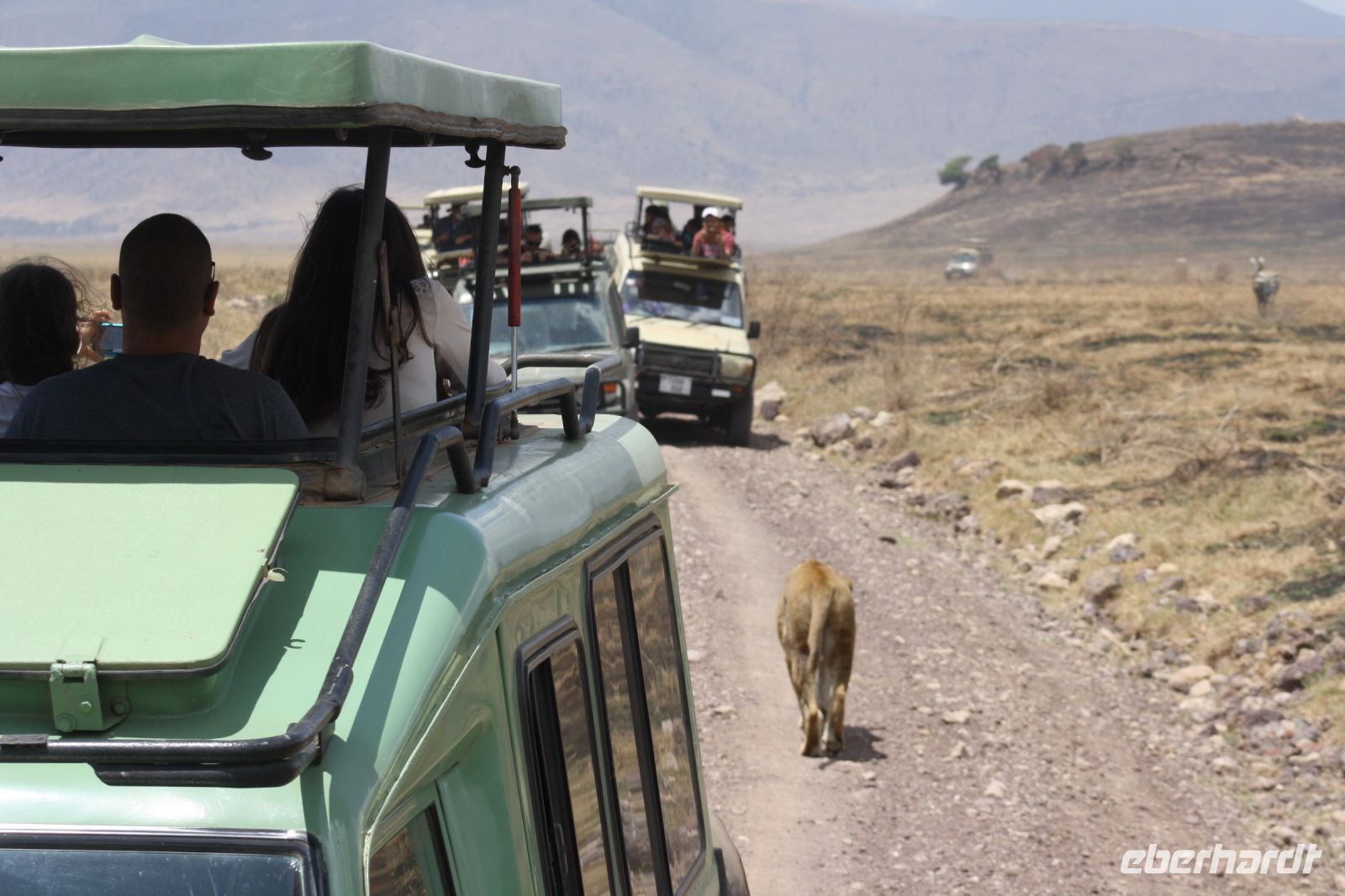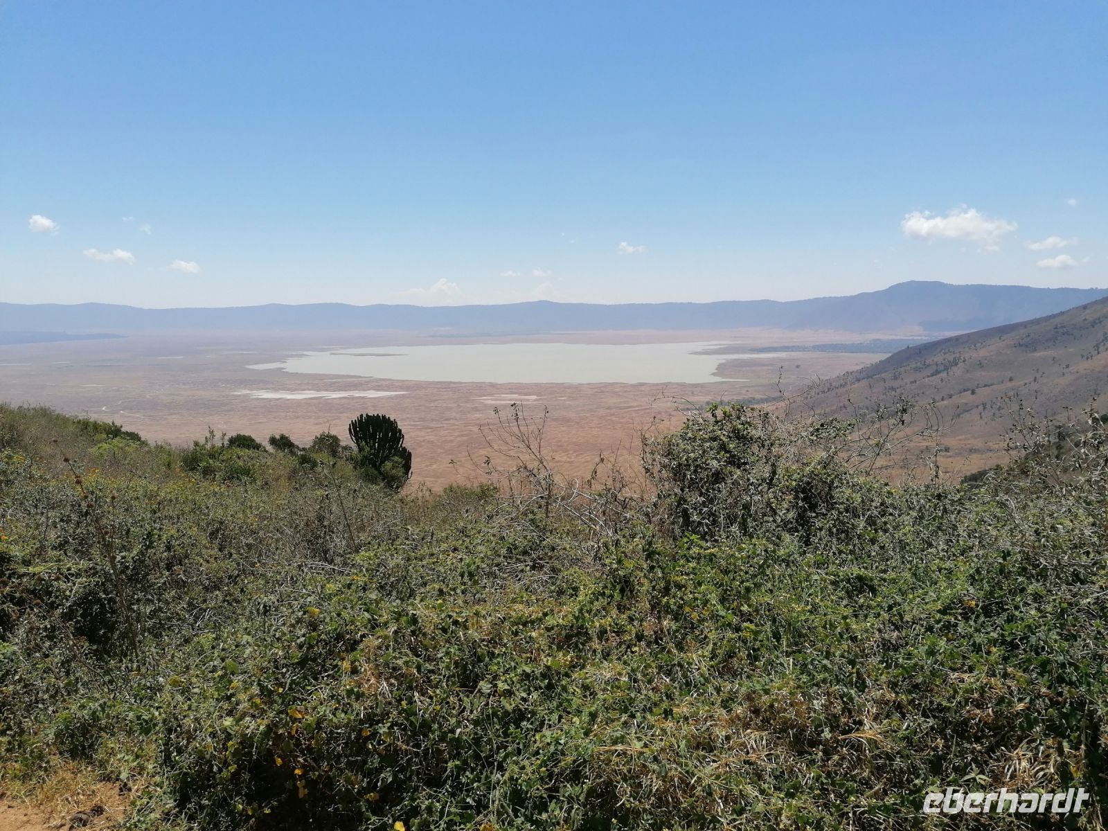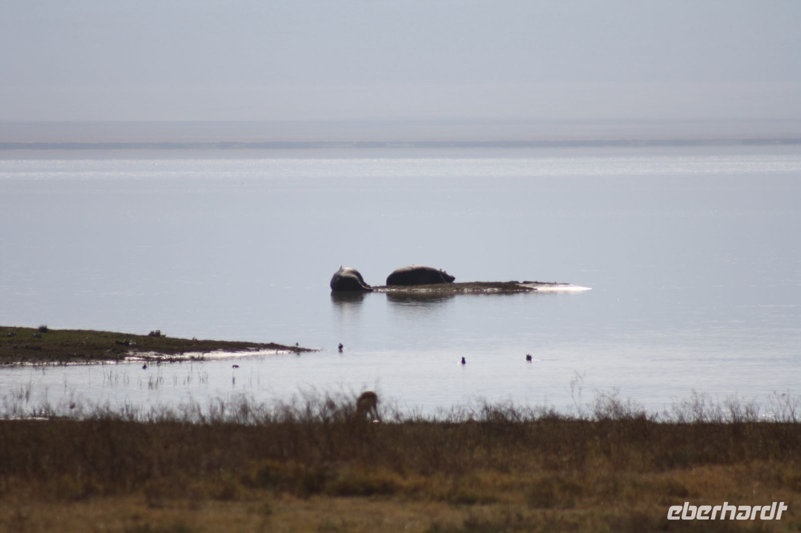 Mit dem Ngorongoro Krater stand heute ein weiteres Highlight auf unserer Agenda. Daher standen wir bereits eine Stunde früher auf und erreichten den Nationalpark bereits um 8 Uhr. Am Gate konnten wir nochmal auf Toilette und uns den Krater in einem kleinen Museum einprägen. Am Gate begrüßte uns bereits eine Paviane Familie und wir fuhren voller Vorfreude auf einer Allwetterpiste den Krater herab. Zwischendurch erhielten wir immer wieder spektakuläre Ausblicke in den Krater hinein. Unsere erste Tierbeobachtung im Krater war dagegen erstmal unspektakulär. Eine Gruppe Perlhühner hieß uns im Krater willkommen. Anschließend liefen allerdings unsere Kameras heiß. Neben einer riesigen Herde Gnu und einer Horde Büffel, konnten wir einen Schakal und Hyänen entdecken. Auch die Vogelwelt ließ sich zahlreich blicken und Bussarde, Kronenkraniche, Flamingos und Stelzenvögel flogen vor unsere Kameras. Am Rand des Lake Magadi konnten wir in eine Herde Hippos entdecken. Nicht weit entfernt fanden wir einen Rudel Hyänen, die sich ganz in der Nähe der Löwen aufhielten. Das Rudel Löwen bestand aus ca. 10 weiblichen Löwen, die bereits gespeist hatten und einen längeren Verdauungsschlaf hielten. Ein weitere Goldschakal huschte an uns vorbei, ehe wir den Hippo-Pool erreichten. In dem dreckigen Nass badeten über 30 Hippos und hielten wir uns ein Konzert ab. Grade als wir einen weiteren Vogelstrauß fotografieren wollten, erhielten wir die Nachricht, dass sich in der Nähe drei weitere Löwinnen aufhielten. Die drei Löwinnen posierten zunächst auf einen kleinen Felsvorsprung, ehe sie sich später auf einen Baum versteckten. Mit dem Fernglas konnten wir in der Ferne sogar 2 Nashörner erblicken. Nach nur wenigen Minuten spazierten eine Löwin direkt an unserem Jeep vorbei. Manchmal muss man einfach Glück haben. Ein männlicher Löwe hingegen schlummerte ganz in der Nähe im Gras und ließ sich von uns nicht stören. Auf dem Weg zum Picknick-Bereich folgte ein weiterer Höhepunkt. Zunächst erspähten wir ein Schakal, der sich eine Schlange erbeutet hatte. Plötzlich folgte ein Angriff eines Adlers und wir konnten einen Kampf um eine Schlange beobachten, welchen der Adler gewann. In der Mittagszeit speisten wir unser Lunchpaket im Jeep und genossen die wunderschöne Natur. Am Nachmittag fuhren wir ins Sumpfgebiet und konnten neben Büffel, auch Elefant beim Baden beobachten. Dann erhielten wir die Nachricht, dass ein Nashorn entdeckt wurden. Leider werden die Nashörner immer schwieriger zu sehen, da sich der Bestand der Nashörner ständig reduziert und die Wilderer ihres dazu beitragen. Unterwegs lichteten wir noch Grants-Gazellen und Thomson Gazelle ab und hielten beim einem Pelikan und Nimmersatt. Allerdings war auch hier das Nashorn nur vom weiten sichtbar, aber wir konnten immerhin ein Gefühl auf seine Größe bekommen. Leider war es nun wieder an der Zeit den Ngorongoro Krater zu verlassen. Unterwegs entdeckten wir noch weitere Hyäne, Pelikane, Hippos und einen Schakal. Am Kraterrand stoppten wir am Denkmal des berühmten Tierfilmer Bernhard Grzimek und genossen nochmal den atemberaubenden Ausblick in den Krater. Auf unserem Nachhauseweg stoppten wir noch kurz bei einem Souvenirladen, ehe wir am frühen Abend unsere Lodge erreichten. Ein atemberaubender Tag neigte sich leider dem Ende entgegen und wir stießen gemeinsam mit einen Amarula auf unseren ersten Teil der Reise an.