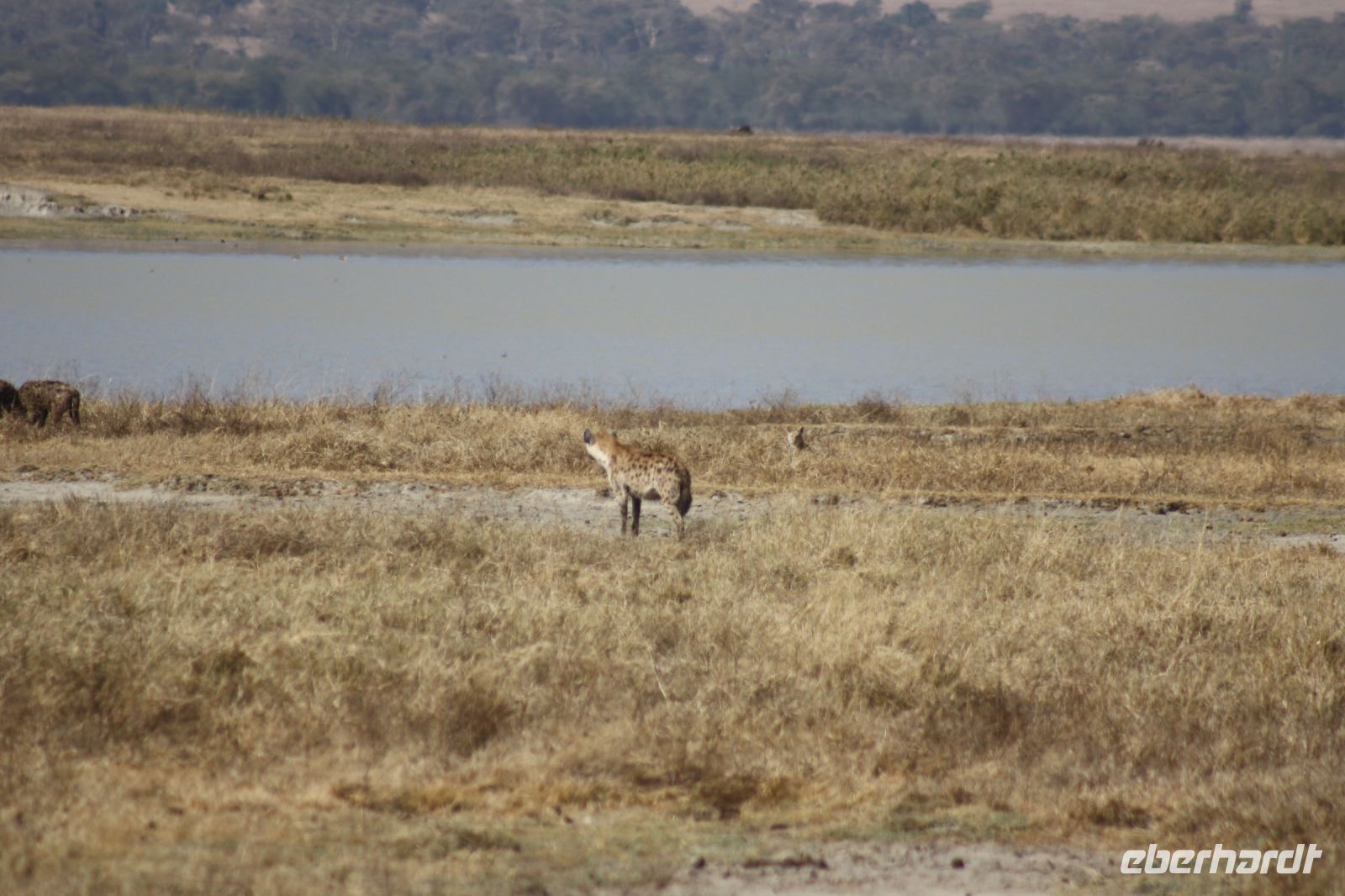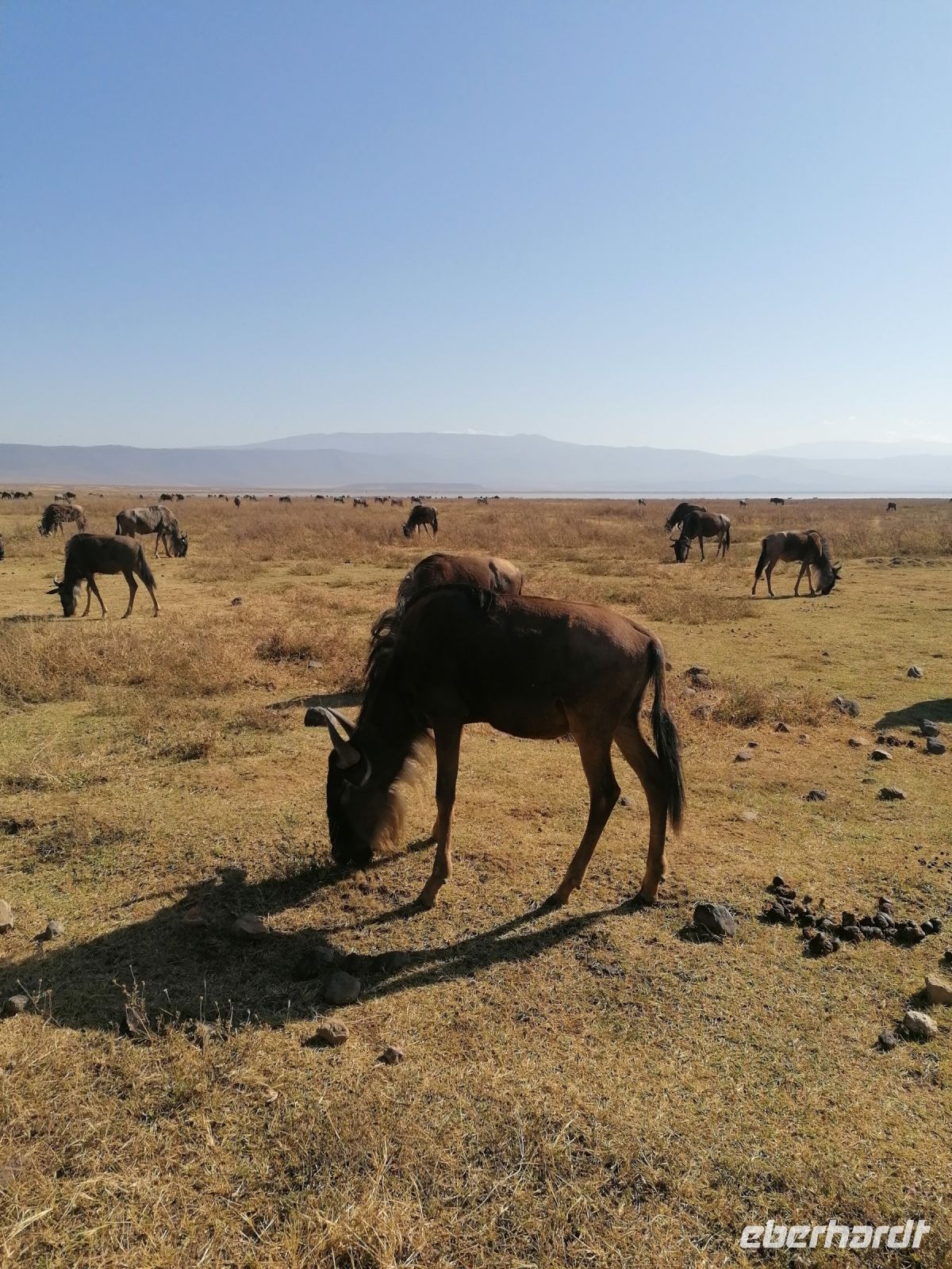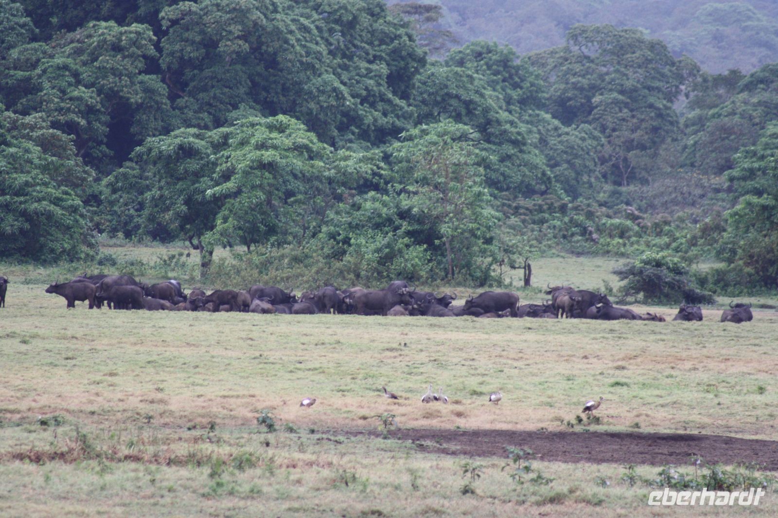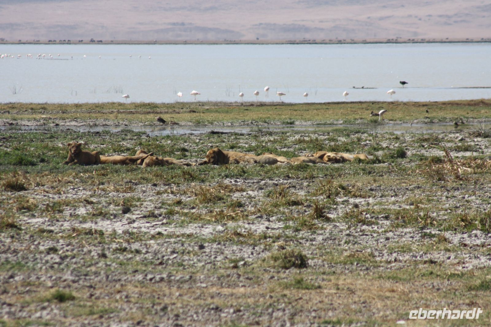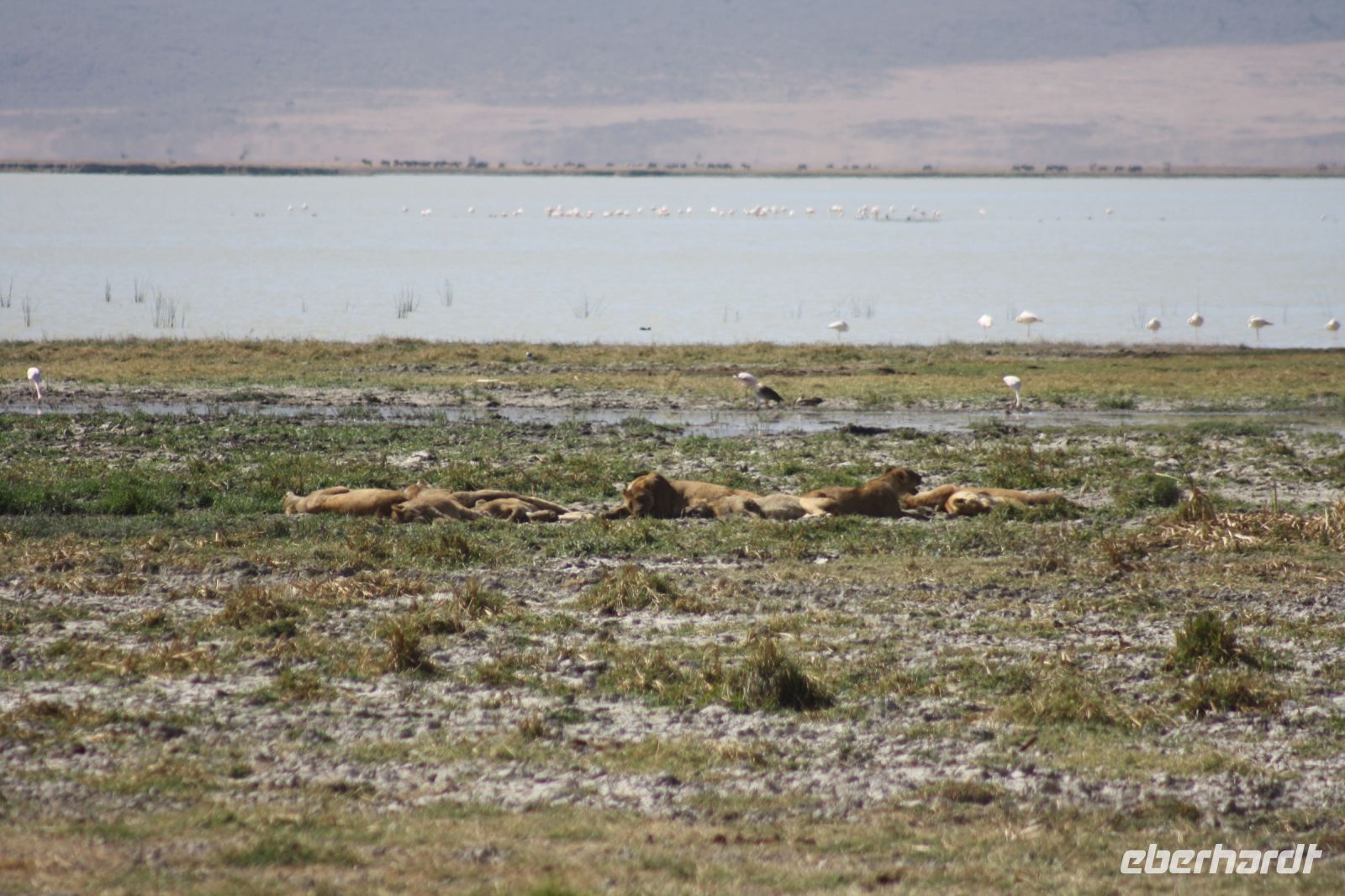 Mit dem Ngorongoro Krater stand heute ein weiteres Highlight auf unserer Agenda. Daher standen wir bereits eine Stunde früher auf und erreichten den Nationalpark bereits um 8 Uhr. Am Gate konnten wir nochmal auf Toilette und uns den Krater in einem kleinen Museum einprägen. Am Gate begrüßte uns bereits eine Paviane Familie und wir fuhren voller Vorfreude auf einer Allwetterpiste den Krater herab. Zwischendurch erhielten wir immer wieder spektakuläre Ausblicke in den Krater hinein. Unsere erste Tierbeobachtung im Krater war dagegen erstmal unspektakulär. Eine Gruppe Perlhühner hieß uns im Krater willkommen. Anschließend liefen allerdings unsere Kameras heiß. Neben einer riesigen Herde Gnu und einer Horde Büffel, konnten wir einen Schakal und Hyänen entdecken. Auch die Vogelwelt ließ sich zahlreich blicken und Bussarde, Kronenkraniche, Flamingos und Stelzenvögel flogen vor unsere Kameras. Am Rand des Lake Magadi konnten wir in eine Herde Hippos entdecken. Nicht weit entfernt fanden wir einen Rudel Hyänen, die sich ganz in der Nähe der Löwen aufhielten. Das Rudel Löwen bestand aus ca. 10 weiblichen Löwen, die bereits gespeist hatten und einen längeren Verdauungsschlaf hielten. Ein weitere Goldschakal huschte an uns vorbei, ehe wir den Hippo-Pool erreichten. In dem dreckigen Nass badeten über 30 Hippos und hielten wir uns ein Konzert ab. Grade als wir einen weiteren Vogelstrauß fotografieren wollten, erhielten wir die Nachricht, dass sich in der Nähe drei weitere Löwinnen aufhielten. Die drei Löwinnen posierten zunächst auf einen kleinen Felsvorsprung, ehe sie sich später auf einen Baum versteckten. Mit dem Fernglas konnten wir in der Ferne sogar 2 Nashörner erblicken. Nach nur wenigen Minuten spazierten eine Löwin direkt an unserem Jeep vorbei. Manchmal muss man einfach Glück haben. Ein männlicher Löwe hingegen schlummerte ganz in der Nähe im Gras und ließ sich von uns nicht stören. Auf dem Weg zum Picknick-Bereich folgte ein weiterer Höhepunkt. Zunächst erspähten wir ein Schakal, der sich eine Schlange erbeutet hatte. Plötzlich folgte ein Angriff eines Adlers und wir konnten einen Kampf um eine Schlange beobachten, welchen der Adler gewann. In der Mittagszeit speisten wir unser Lunchpaket im Jeep und genossen die wunderschöne Natur. Am Nachmittag fuhren wir ins Sumpfgebiet und konnten neben Büffel, auch Elefant beim Baden beobachten. Dann erhielten wir die Nachricht, dass ein Nashorn entdeckt wurden. Leider werden die Nashörner immer schwieriger zu sehen, da sich der Bestand der Nashörner ständig reduziert und die Wilderer ihres dazu beitragen. Unterwegs lichteten wir noch Grants-Gazellen und Thomson Gazelle ab und hielten beim einem Pelikan und Nimmersatt. Allerdings war auch hier das Nashorn nur vom weiten sichtbar, aber wir konnten immerhin ein Gefühl auf seine Größe bekommen. Leider war es nun wieder an der Zeit den Ngorongoro Krater zu verlassen. Unterwegs entdeckten wir noch weitere Hyäne, Pelikane, Hippos und einen Schakal. Am Kraterrand stoppten wir am Denkmal des berühmten Tierfilmer Bernhard Grzimek und genossen nochmal den atemberaubenden Ausblick in den Krater. Auf unserem Nachhauseweg stoppten wir noch kurz bei einem Souvenirladen, ehe wir am frühen Abend unsere Lodge erreichten. Ein atemberaubender Tag neigte sich leider dem Ende entgegen und wir stießen gemeinsam mit einen Amarula auf unseren ersten Teil der Reise an.