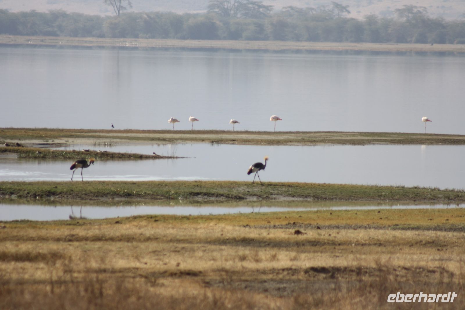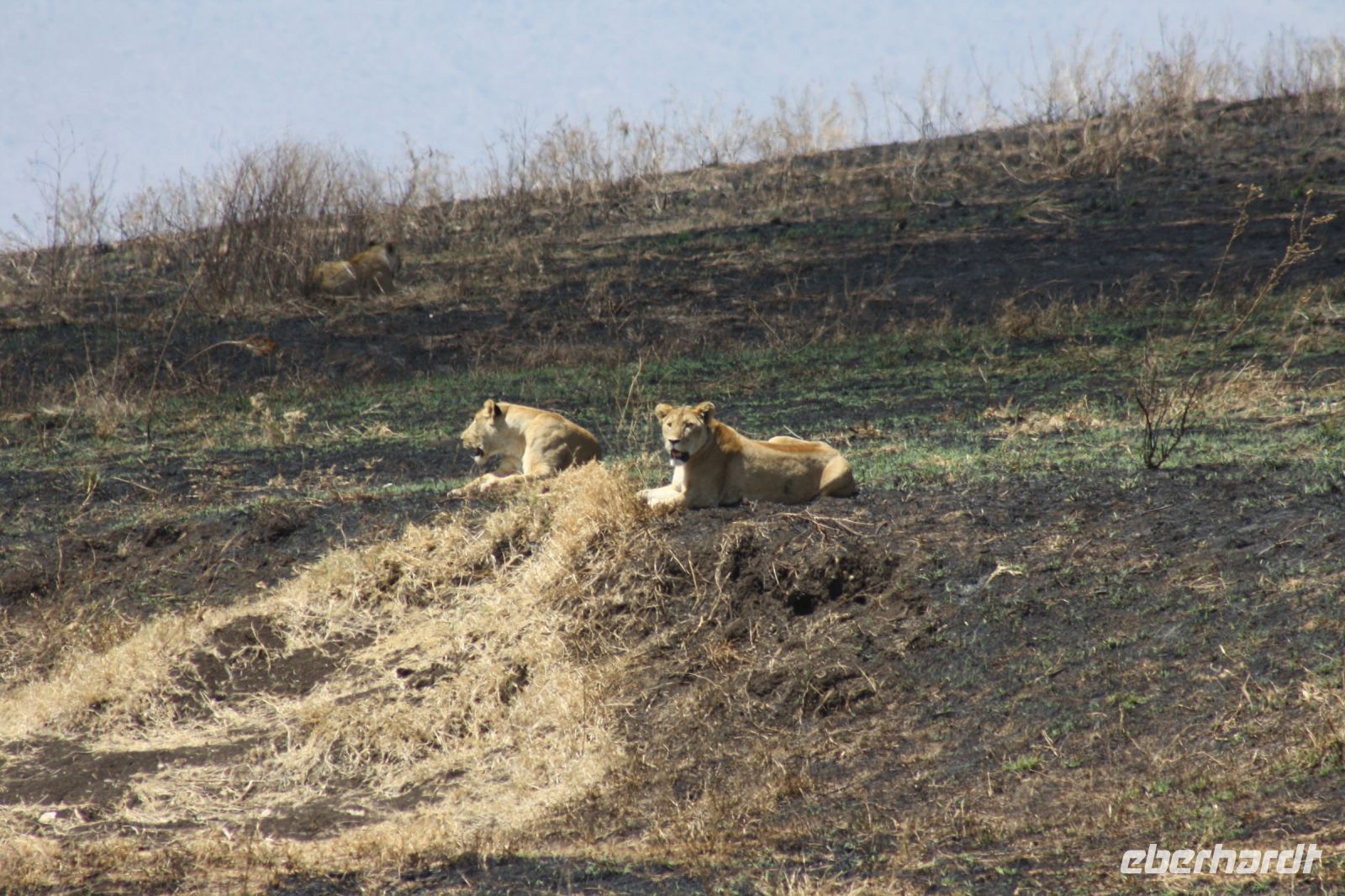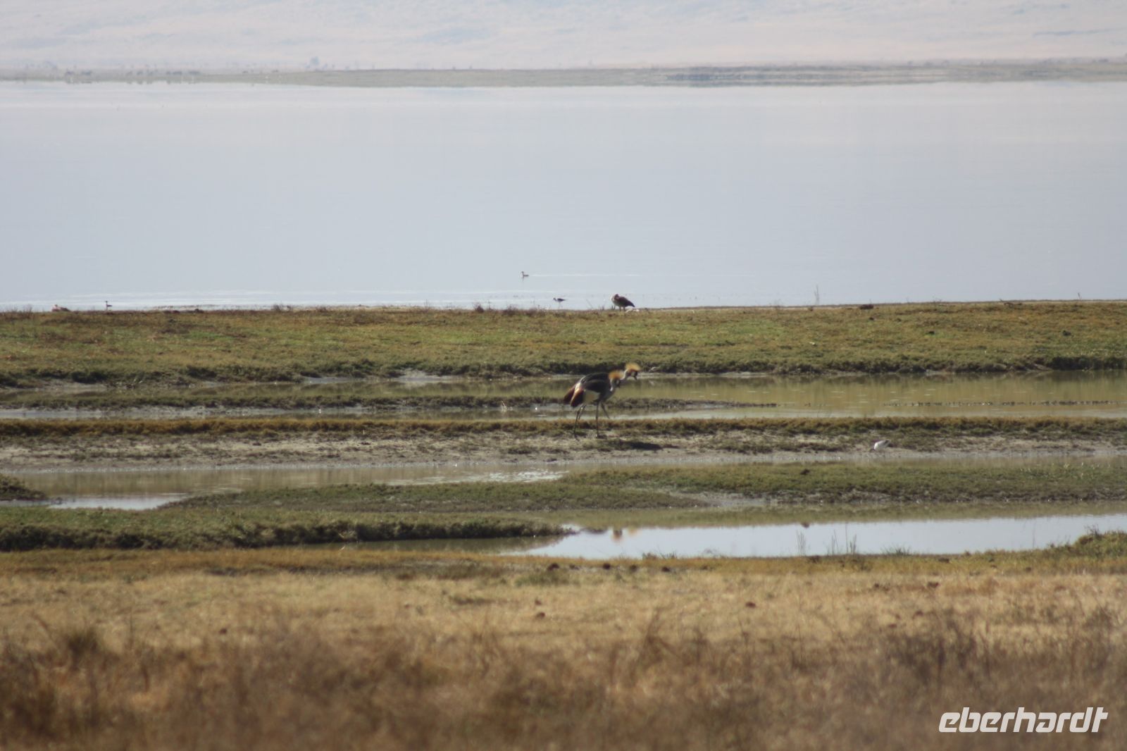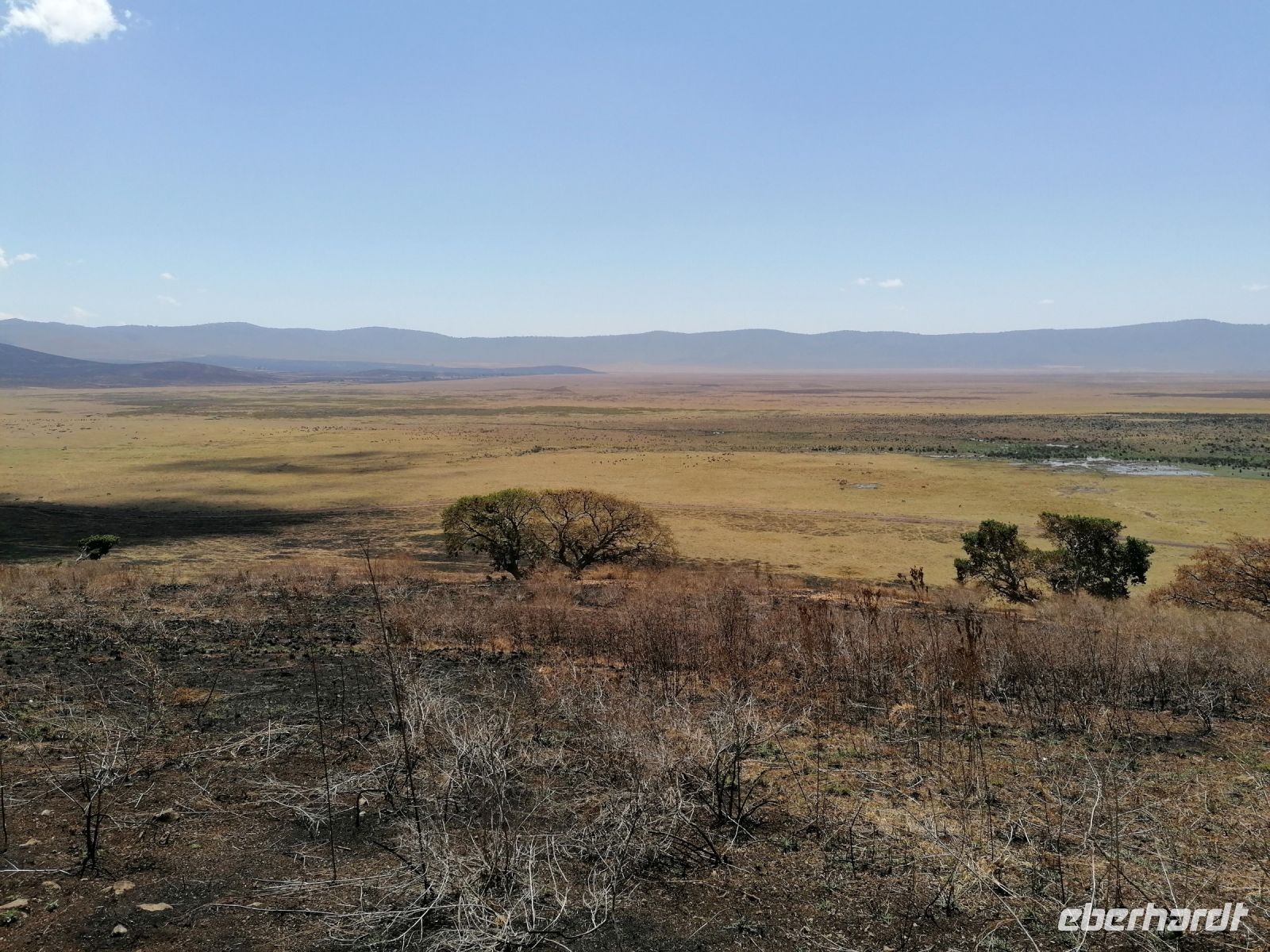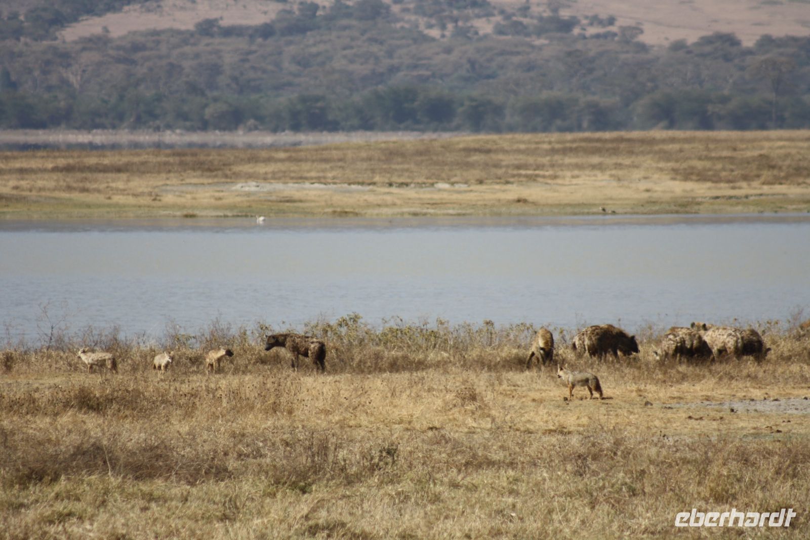 Mit dem Ngorongoro Krater stand heute ein weiteres Highlight auf unserer Agenda. Daher standen wir bereits eine Stunde früher auf und erreichten den Nationalpark bereits um 8 Uhr. Am Gate konnten wir nochmal auf Toilette und uns den Krater in einem kleinen Museum einprägen. Am Gate begrüßte uns bereits eine Paviane Familie und wir fuhren voller Vorfreude auf einer Allwetterpiste den Krater herab. Zwischendurch erhielten wir immer wieder spektakuläre Ausblicke in den Krater hinein. Unsere erste Tierbeobachtung im Krater war dagegen erstmal unspektakulär. Eine Gruppe Perlhühner hieß uns im Krater willkommen. Anschließend liefen allerdings unsere Kameras heiß. Neben einer riesigen Herde Gnu und einer Horde Büffel, konnten wir einen Schakal und Hyänen entdecken. Auch die Vogelwelt ließ sich zahlreich blicken und Bussarde, Kronenkraniche, Flamingos und Stelzenvögel flogen vor unsere Kameras. Am Rand des Lake Magadi konnten wir in eine Herde Hippos entdecken. Nicht weit entfernt fanden wir einen Rudel Hyänen, die sich ganz in der Nähe der Löwen aufhielten. Das Rudel Löwen bestand aus ca. 10 weiblichen Löwen, die bereits gespeist hatten und einen längeren Verdauungsschlaf hielten. Ein weitere Goldschakal huschte an uns vorbei, ehe wir den Hippo-Pool erreichten. In dem dreckigen Nass badeten über 30 Hippos und hielten wir uns ein Konzert ab. Grade als wir einen weiteren Vogelstrauß fotografieren wollten, erhielten wir die Nachricht, dass sich in der Nähe drei weitere Löwinnen aufhielten. Die drei Löwinnen posierten zunächst auf einen kleinen Felsvorsprung, ehe sie sich später auf einen Baum versteckten. Mit dem Fernglas konnten wir in der Ferne sogar 2 Nashörner erblicken. Nach nur wenigen Minuten spazierten eine Löwin direkt an unserem Jeep vorbei. Manchmal muss man einfach Glück haben. Ein männlicher Löwe hingegen schlummerte ganz in der Nähe im Gras und ließ sich von uns nicht stören. Auf dem Weg zum Picknick-Bereich folgte ein weiterer Höhepunkt. Zunächst erspähten wir ein Schakal, der sich eine Schlange erbeutet hatte. Plötzlich folgte ein Angriff eines Adlers und wir konnten einen Kampf um eine Schlange beobachten, welchen der Adler gewann. In der Mittagszeit speisten wir unser Lunchpaket im Jeep und genossen die wunderschöne Natur. Am Nachmittag fuhren wir ins Sumpfgebiet und konnten neben Büffel, auch Elefant beim Baden beobachten. Dann erhielten wir die Nachricht, dass ein Nashorn entdeckt wurden. Leider werden die Nashörner immer schwieriger zu sehen, da sich der Bestand der Nashörner ständig reduziert und die Wilderer ihres dazu beitragen. Unterwegs lichteten wir noch Grants-Gazellen und Thomson Gazelle ab und hielten beim einem Pelikan und Nimmersatt. Allerdings war auch hier das Nashorn nur vom weiten sichtbar, aber wir konnten immerhin ein Gefühl auf seine Größe bekommen. Leider war es nun wieder an der Zeit den Ngorongoro Krater zu verlassen. Unterwegs entdeckten wir noch weitere Hyäne, Pelikane, Hippos und einen Schakal. Am Kraterrand stoppten wir am Denkmal des berühmten Tierfilmer Bernhard Grzimek und genossen nochmal den atemberaubenden Ausblick in den Krater. Auf unserem Nachhauseweg stoppten wir noch kurz bei einem Souvenirladen, ehe wir am frühen Abend unsere Lodge erreichten. Ein atemberaubender Tag neigte sich leider dem Ende entgegen und wir stießen gemeinsam mit einen Amarula auf unseren ersten Teil der Reise an.