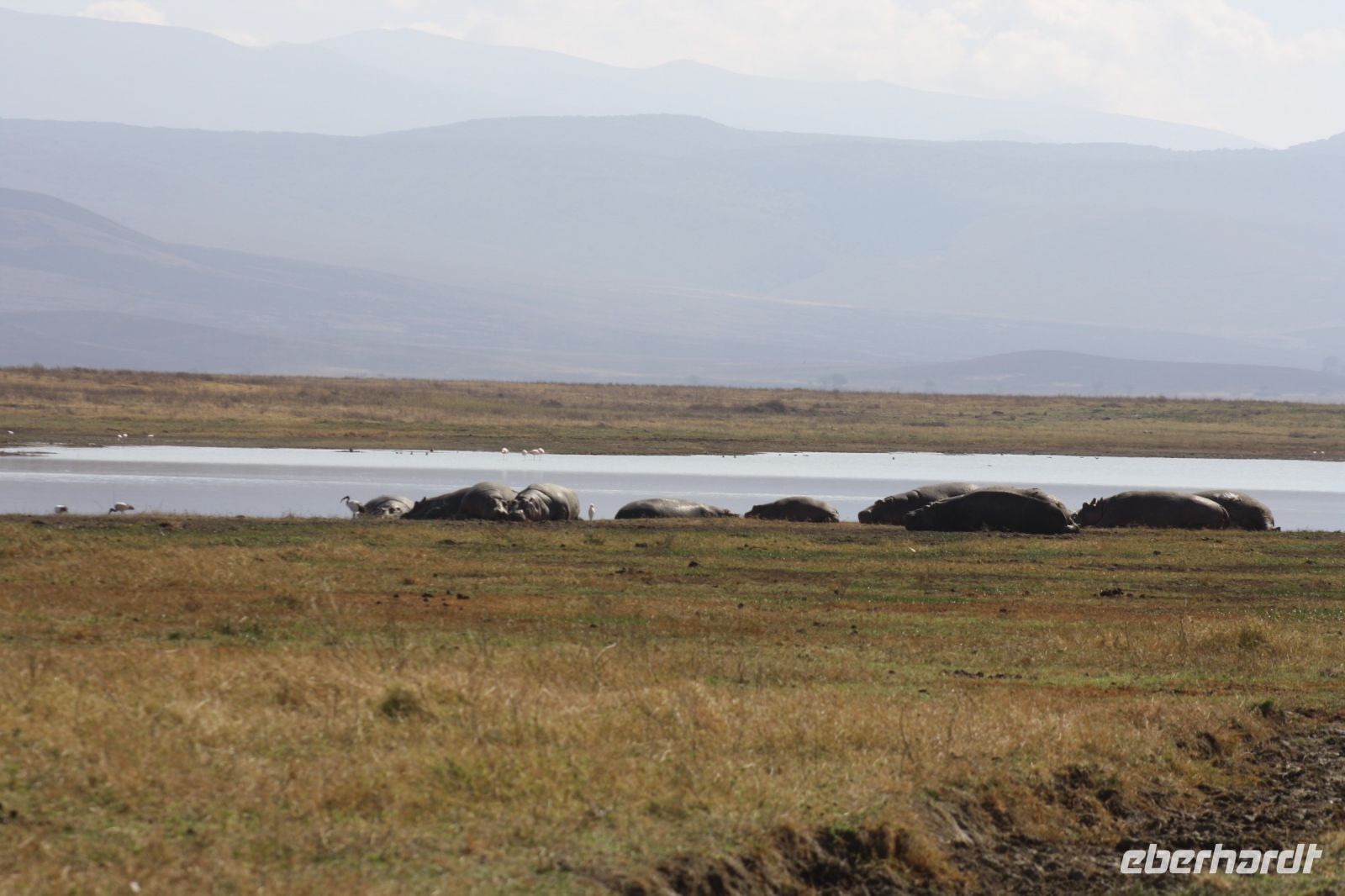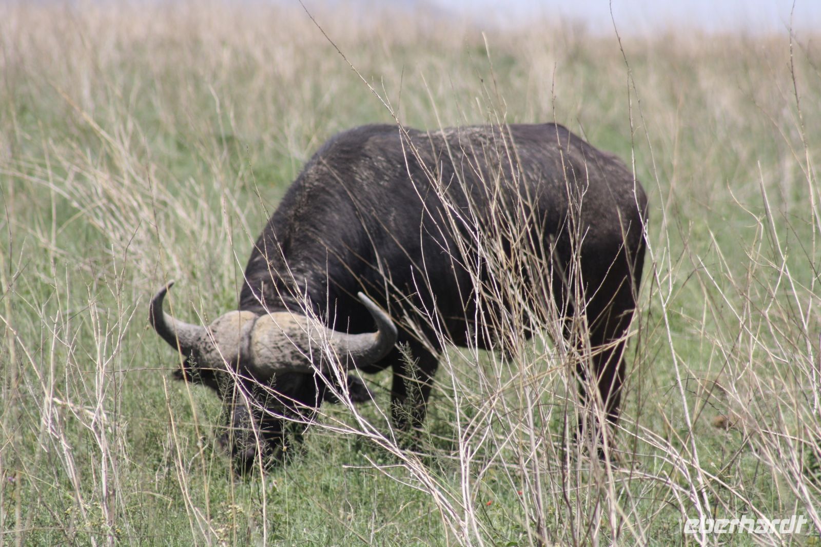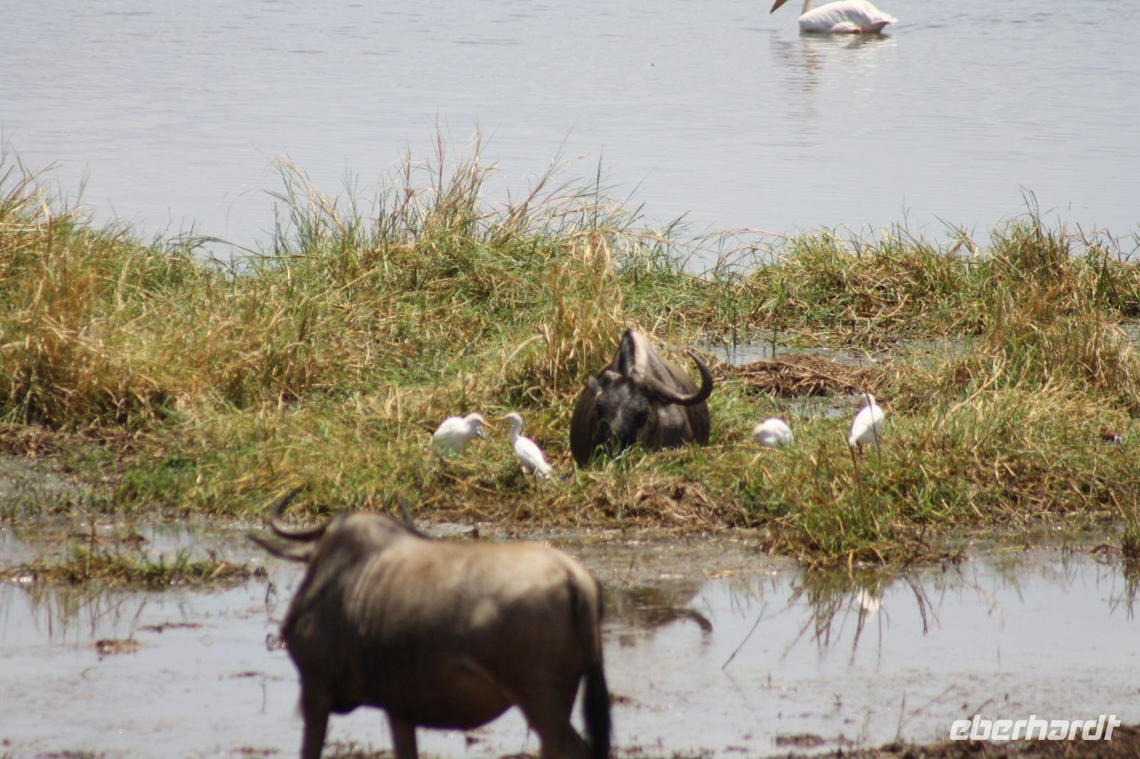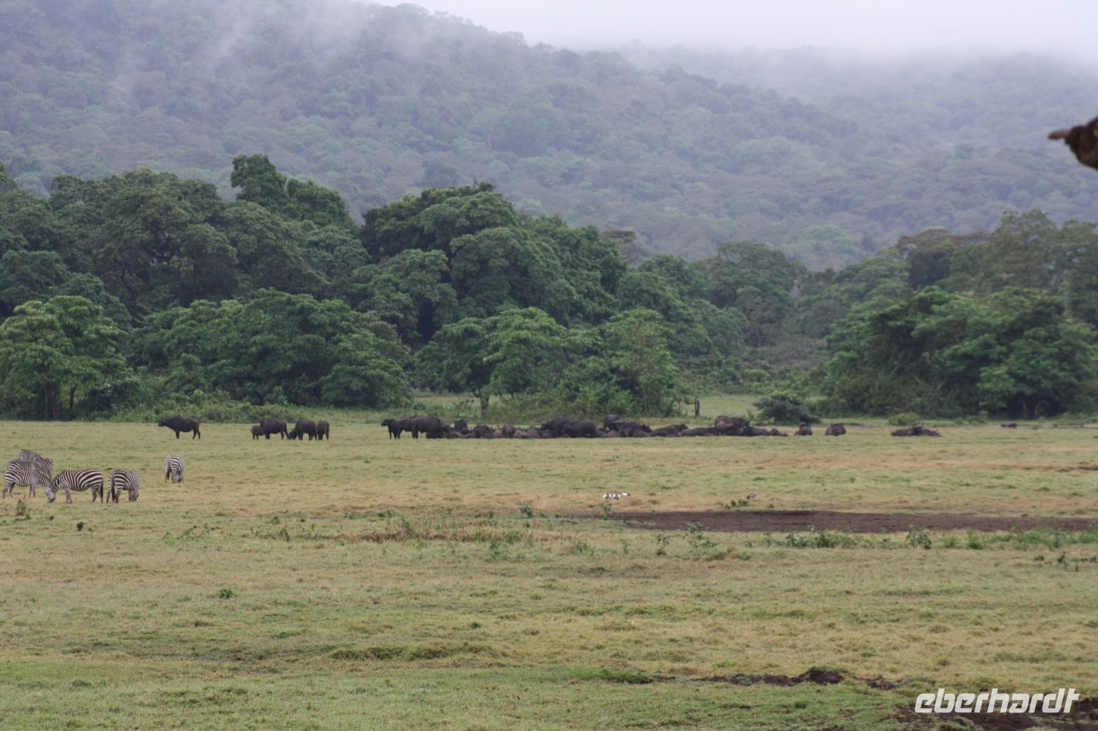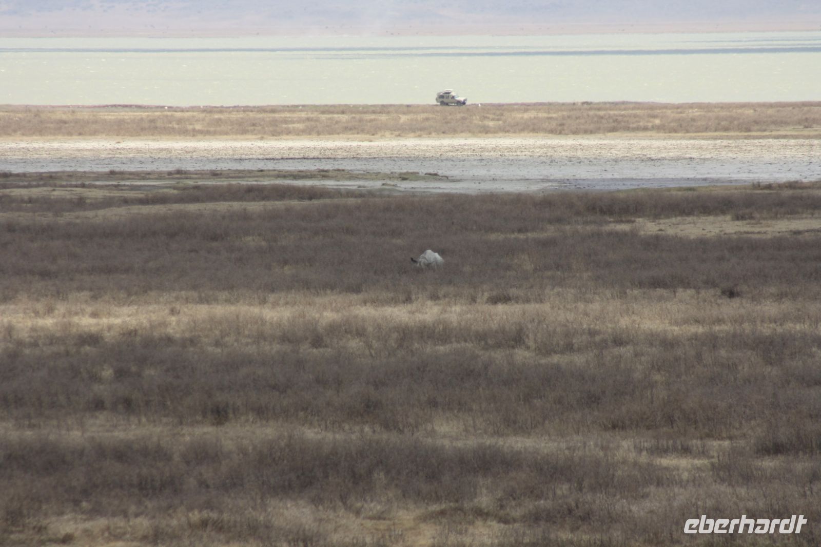 Mit dem Ngorongoro Krater stand heute ein weiteres Highlight auf unserer Agenda. Daher standen wir bereits eine Stunde früher auf und erreichten den Nationalpark bereits um 8 Uhr. Am Gate konnten wir nochmal auf Toilette und uns den Krater in einem kleinen Museum einprägen. Am Gate begrüßte uns bereits eine Paviane Familie und wir fuhren voller Vorfreude auf einer Allwetterpiste den Krater herab. Zwischendurch erhielten wir immer wieder spektakuläre Ausblicke in den Krater hinein. Unsere erste Tierbeobachtung im Krater war dagegen erstmal unspektakulär. Eine Gruppe Perlhühner hieß uns im Krater willkommen. Anschließend liefen allerdings unsere Kameras heiß. Neben einer riesigen Herde Gnu und einer Horde Büffel, konnten wir einen Schakal und Hyänen entdecken. Auch die Vogelwelt ließ sich zahlreich blicken und Bussarde, Kronenkraniche, Flamingos und Stelzenvögel flogen vor unsere Kameras. Am Rand des Lake Magadi konnten wir in eine Herde Hippos entdecken. Nicht weit entfernt fanden wir einen Rudel Hyänen, die sich ganz in der Nähe der Löwen aufhielten. Das Rudel Löwen bestand aus ca. 10 weiblichen Löwen, die bereits gespeist hatten und einen längeren Verdauungsschlaf hielten. Ein weitere Goldschakal huschte an uns vorbei, ehe wir den Hippo-Pool erreichten. In dem dreckigen Nass badeten über 30 Hippos und hielten wir uns ein Konzert ab. Grade als wir einen weiteren Vogelstrauß fotografieren wollten, erhielten wir die Nachricht, dass sich in der Nähe drei weitere Löwinnen aufhielten. Die drei Löwinnen posierten zunächst auf einen kleinen Felsvorsprung, ehe sie sich später auf einen Baum versteckten. Mit dem Fernglas konnten wir in der Ferne sogar 2 Nashörner erblicken. Nach nur wenigen Minuten spazierten eine Löwin direkt an unserem Jeep vorbei. Manchmal muss man einfach Glück haben. Ein männlicher Löwe hingegen schlummerte ganz in der Nähe im Gras und ließ sich von uns nicht stören. Auf dem Weg zum Picknick-Bereich folgte ein weiterer Höhepunkt. Zunächst erspähten wir ein Schakal, der sich eine Schlange erbeutet hatte. Plötzlich folgte ein Angriff eines Adlers und wir konnten einen Kampf um eine Schlange beobachten, welchen der Adler gewann. In der Mittagszeit speisten wir unser Lunchpaket im Jeep und genossen die wunderschöne Natur. Am Nachmittag fuhren wir ins Sumpfgebiet und konnten neben Büffel, auch Elefant beim Baden beobachten. Dann erhielten wir die Nachricht, dass ein Nashorn entdeckt wurden. Leider werden die Nashörner immer schwieriger zu sehen, da sich der Bestand der Nashörner ständig reduziert und die Wilderer ihres dazu beitragen. Unterwegs lichteten wir noch Grants-Gazellen und Thomson Gazelle ab und hielten beim einem Pelikan und Nimmersatt. Allerdings war auch hier das Nashorn nur vom weiten sichtbar, aber wir konnten immerhin ein Gefühl auf seine Größe bekommen. Leider war es nun wieder an der Zeit den Ngorongoro Krater zu verlassen. Unterwegs entdeckten wir noch weitere Hyäne, Pelikane, Hippos und einen Schakal. Am Kraterrand stoppten wir am Denkmal des berühmten Tierfilmer Bernhard Grzimek und genossen nochmal den atemberaubenden Ausblick in den Krater. Auf unserem Nachhauseweg stoppten wir noch kurz bei einem Souvenirladen, ehe wir am frühen Abend unsere Lodge erreichten. Ein atemberaubender Tag neigte sich leider dem Ende entgegen und wir stießen gemeinsam mit einen Amarula auf unseren ersten Teil der Reise an.