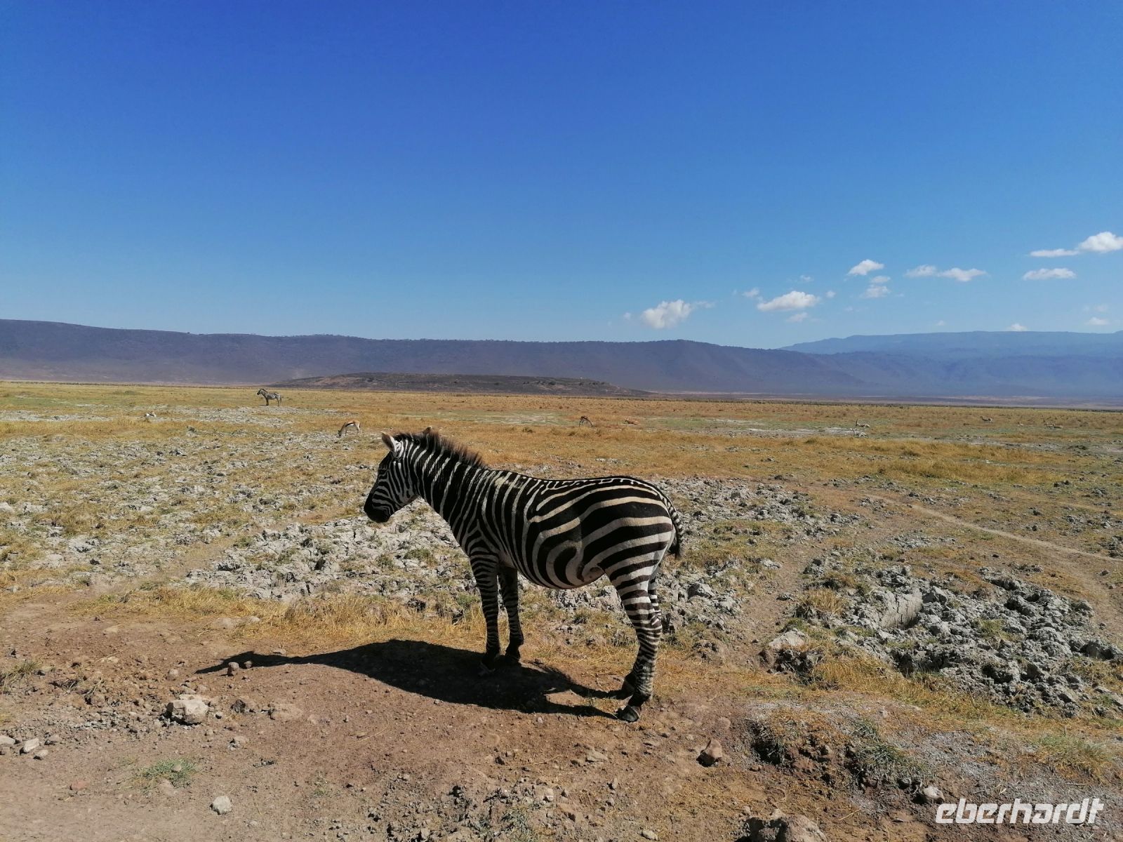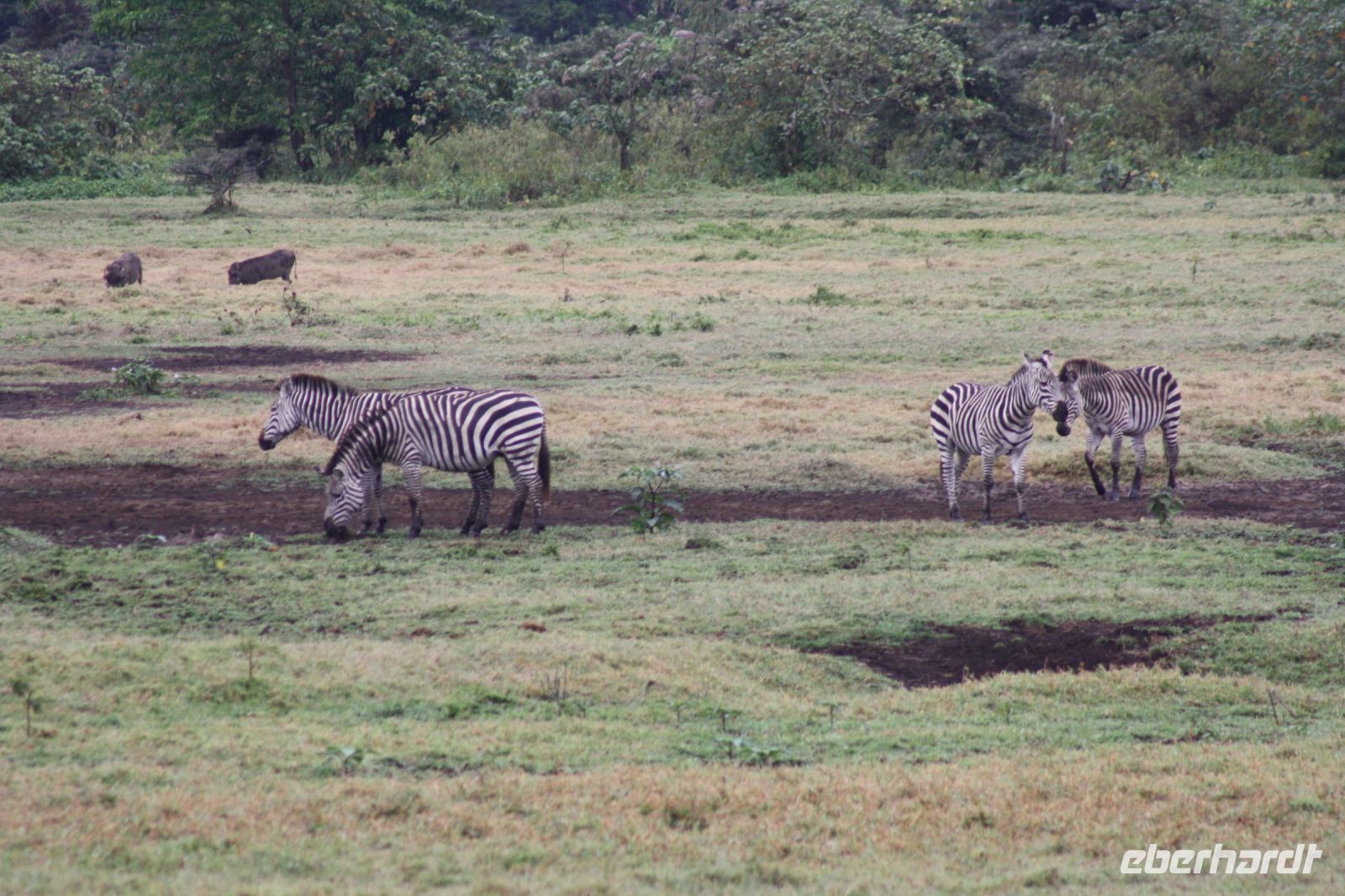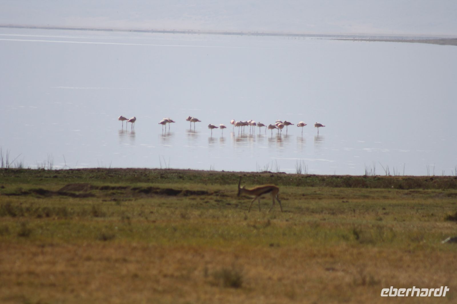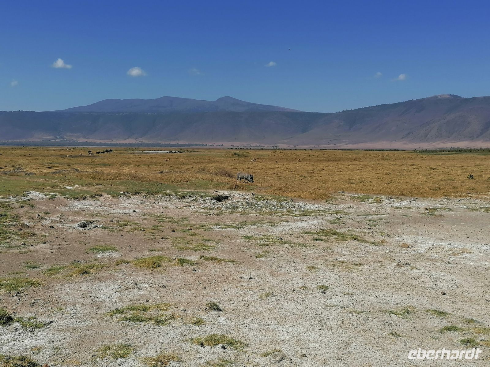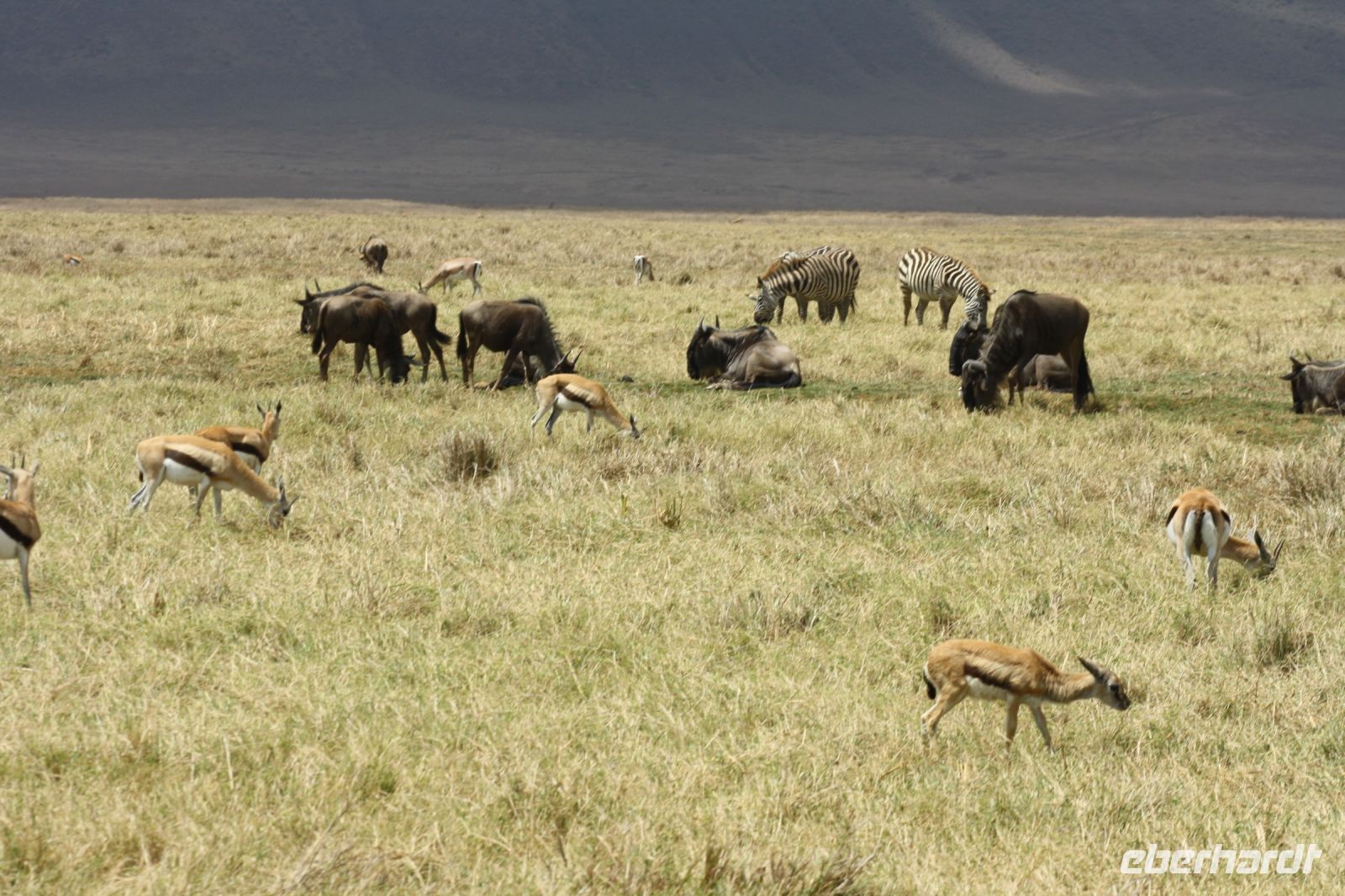 Mit dem Ngorongoro Krater stand heute ein weiteres Highlight auf unserer Agenda. Daher standen wir bereits eine Stunde früher auf und erreichten den Nationalpark bereits um 8 Uhr. Am Gate konnten wir nochmal auf Toilette und uns den Krater in einem kleinen Museum einprägen. Am Gate begrüßte uns bereits eine Paviane Familie und wir fuhren voller Vorfreude auf einer Allwetterpiste den Krater herab. Zwischendurch erhielten wir immer wieder spektakuläre Ausblicke in den Krater hinein. Unsere erste Tierbeobachtung im Krater war dagegen erstmal unspektakulär. Eine Gruppe Perlhühner hieß uns im Krater willkommen. Anschließend liefen allerdings unsere Kameras heiß. Neben einer riesigen Herde Gnu und einer Horde Büffel, konnten wir einen Schakal und Hyänen entdecken. Auch die Vogelwelt ließ sich zahlreich blicken und Bussarde, Kronenkraniche, Flamingos und Stelzenvögel flogen vor unsere Kameras. Am Rand des Lake Magadi konnten wir in eine Herde Hippos entdecken. Nicht weit entfernt fanden wir einen Rudel Hyänen, die sich ganz in der Nähe der Löwen aufhielten. Das Rudel Löwen bestand aus ca. 10 weiblichen Löwen, die bereits gespeist hatten und einen längeren Verdauungsschlaf hielten. Ein weitere Goldschakal huschte an uns vorbei, ehe wir den Hippo-Pool erreichten. In dem dreckigen Nass badeten über 30 Hippos und hielten wir uns ein Konzert ab. Grade als wir einen weiteren Vogelstrauß fotografieren wollten, erhielten wir die Nachricht, dass sich in der Nähe drei weitere Löwinnen aufhielten. Die drei Löwinnen posierten zunächst auf einen kleinen Felsvorsprung, ehe sie sich später auf einen Baum versteckten. Mit dem Fernglas konnten wir in der Ferne sogar 2 Nashörner erblicken. Nach nur wenigen Minuten spazierten eine Löwin direkt an unserem Jeep vorbei. Manchmal muss man einfach Glück haben. Ein männlicher Löwe hingegen schlummerte ganz in der Nähe im Gras und ließ sich von uns nicht stören. Auf dem Weg zum Picknick-Bereich folgte ein weiterer Höhepunkt. Zunächst erspähten wir ein Schakal, der sich eine Schlange erbeutet hatte. Plötzlich folgte ein Angriff eines Adlers und wir konnten einen Kampf um eine Schlange beobachten, welchen der Adler gewann. In der Mittagszeit speisten wir unser Lunchpaket im Jeep und genossen die wunderschöne Natur. Am Nachmittag fuhren wir ins Sumpfgebiet und konnten neben Büffel, auch Elefant beim Baden beobachten. Dann erhielten wir die Nachricht, dass ein Nashorn entdeckt wurden. Leider werden die Nashörner immer schwieriger zu sehen, da sich der Bestand der Nashörner ständig reduziert und die Wilderer ihres dazu beitragen. Unterwegs lichteten wir noch Grants-Gazellen und Thomson Gazelle ab und hielten beim einem Pelikan und Nimmersatt. Allerdings war auch hier das Nashorn nur vom weiten sichtbar, aber wir konnten immerhin ein Gefühl auf seine Größe bekommen. Leider war es nun wieder an der Zeit den Ngorongoro Krater zu verlassen. Unterwegs entdeckten wir noch weitere Hyäne, Pelikane, Hippos und einen Schakal. Am Kraterrand stoppten wir am Denkmal des berühmten Tierfilmer Bernhard Grzimek und genossen nochmal den atemberaubenden Ausblick in den Krater. Auf unserem Nachhauseweg stoppten wir noch kurz bei einem Souvenirladen, ehe wir am frühen Abend unsere Lodge erreichten. Ein atemberaubender Tag neigte sich leider dem Ende entgegen und wir stießen gemeinsam mit einen Amarula auf unseren ersten Teil der Reise an.
