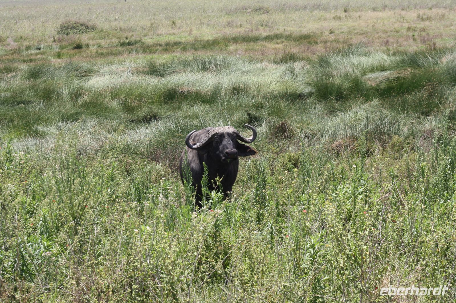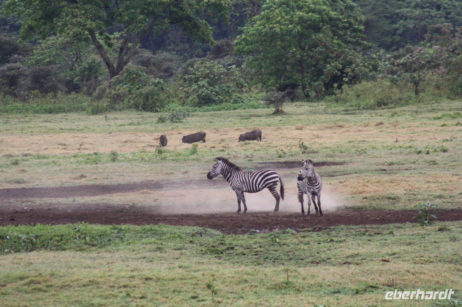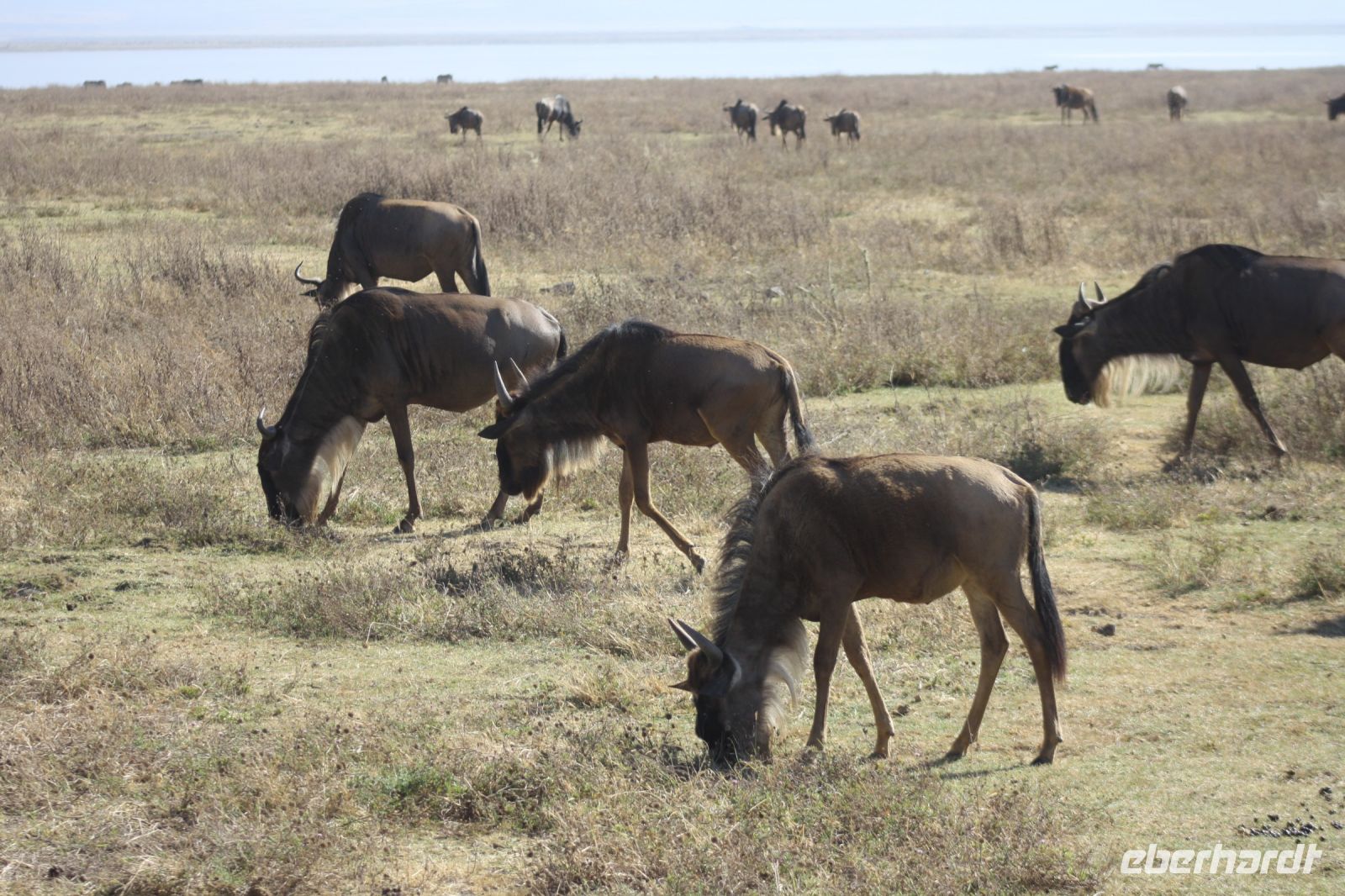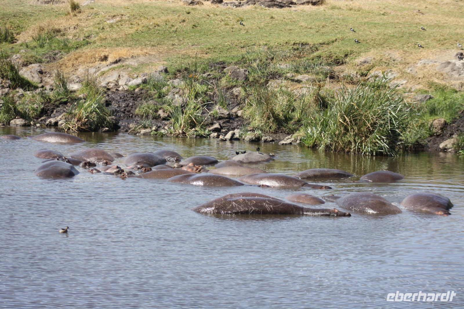 Mit dem Ngorongoro Krater stand heute ein weiteres Highlight auf unserer Agenda. Daher standen wir bereits eine Stunde früher auf und erreichten den Nationalpark bereits um 8 Uhr. Am Gate konnten wir nochmal auf Toilette und uns den Krater in einem kleinen Museum einprägen. Am Gate begrüßte uns bereits eine Paviane Familie und wir fuhren voller Vorfreude auf einer Allwetterpiste den Krater herab. Zwischendurch erhielten wir immer wieder spektakuläre Ausblicke in den Krater hinein. Unsere erste Tierbeobachtung im Krater war dagegen erstmal unspektakulär. Eine Gruppe Perlhühner hieß uns im Krater willkommen. Anschließend liefen allerdings unsere Kameras heiß. Neben einer riesigen Herde Gnu und einer Horde Büffel, konnten wir einen Schakal und Hyänen entdecken. Auch die Vogelwelt ließ sich zahlreich blicken und Bussarde, Kronenkraniche, Flamingos und Stelzenvögel flogen vor unsere Kameras. Am Rand des Lake Magadi konnten wir in eine Herde Hippos entdecken. Nicht weit entfernt fanden wir einen Rudel Hyänen, die sich ganz in der Nähe der Löwen aufhielten. Das Rudel Löwen bestand aus ca. 10 weiblichen Löwen, die bereits gespeist hatten und einen längeren Verdauungsschlaf hielten. Ein weitere Goldschakal huschte an uns vorbei, ehe wir den Hippo-Pool erreichten. In dem dreckigen Nass badeten über 30 Hippos und hielten wir uns ein Konzert ab. Grade als wir einen weiteren Vogelstrauß fotografieren wollten, erhielten wir die Nachricht, dass sich in der Nähe drei weitere Löwinnen aufhielten. Die drei Löwinnen posierten zunächst auf einen kleinen Felsvorsprung, ehe sie sich später auf einen Baum versteckten. Mit dem Fernglas konnten wir in der Ferne sogar 2 Nashörner erblicken. Nach nur wenigen Minuten spazierten eine Löwin direkt an unserem Jeep vorbei. Manchmal muss man einfach Glück haben. Ein männlicher Löwe hingegen schlummerte ganz in der Nähe im Gras und ließ sich von uns nicht stören. Auf dem Weg zum Picknick-Bereich folgte ein weiterer Höhepunkt. Zunächst erspähten wir ein Schakal, der sich eine Schlange erbeutet hatte. Plötzlich folgte ein Angriff eines Adlers und wir konnten einen Kampf um eine Schlange beobachten, welchen der Adler gewann. In der Mittagszeit speisten wir unser Lunchpaket im Jeep und genossen die wunderschöne Natur. Am Nachmittag fuhren wir ins Sumpfgebiet und konnten neben Büffel, auch Elefant beim Baden beobachten. Dann erhielten wir die Nachricht, dass ein Nashorn entdeckt wurden. Leider werden die Nashörner immer schwieriger zu sehen, da sich der Bestand der Nashörner ständig reduziert und die Wilderer ihres dazu beitragen. Unterwegs lichteten wir noch Grants-Gazellen und Thomson Gazelle ab und hielten beim einem Pelikan und Nimmersatt. Allerdings war auch hier das Nashorn nur vom weiten sichtbar, aber wir konnten immerhin ein Gefühl auf seine Größe bekommen. Leider war es nun wieder an der Zeit den Ngorongoro Krater zu verlassen. Unterwegs entdeckten wir noch weitere Hyäne, Pelikane, Hippos und einen Schakal. Am Kraterrand stoppten wir am Denkmal des berühmten Tierfilmer Bernhard Grzimek und genossen nochmal den atemberaubenden Ausblick in den Krater. Auf unserem Nachhauseweg stoppten wir noch kurz bei einem Souvenirladen, ehe wir am frühen Abend unsere Lodge erreichten. Ein atemberaubender Tag neigte sich leider dem Ende entgegen und wir stießen gemeinsam mit einen Amarula auf unseren ersten Teil der Reise an.