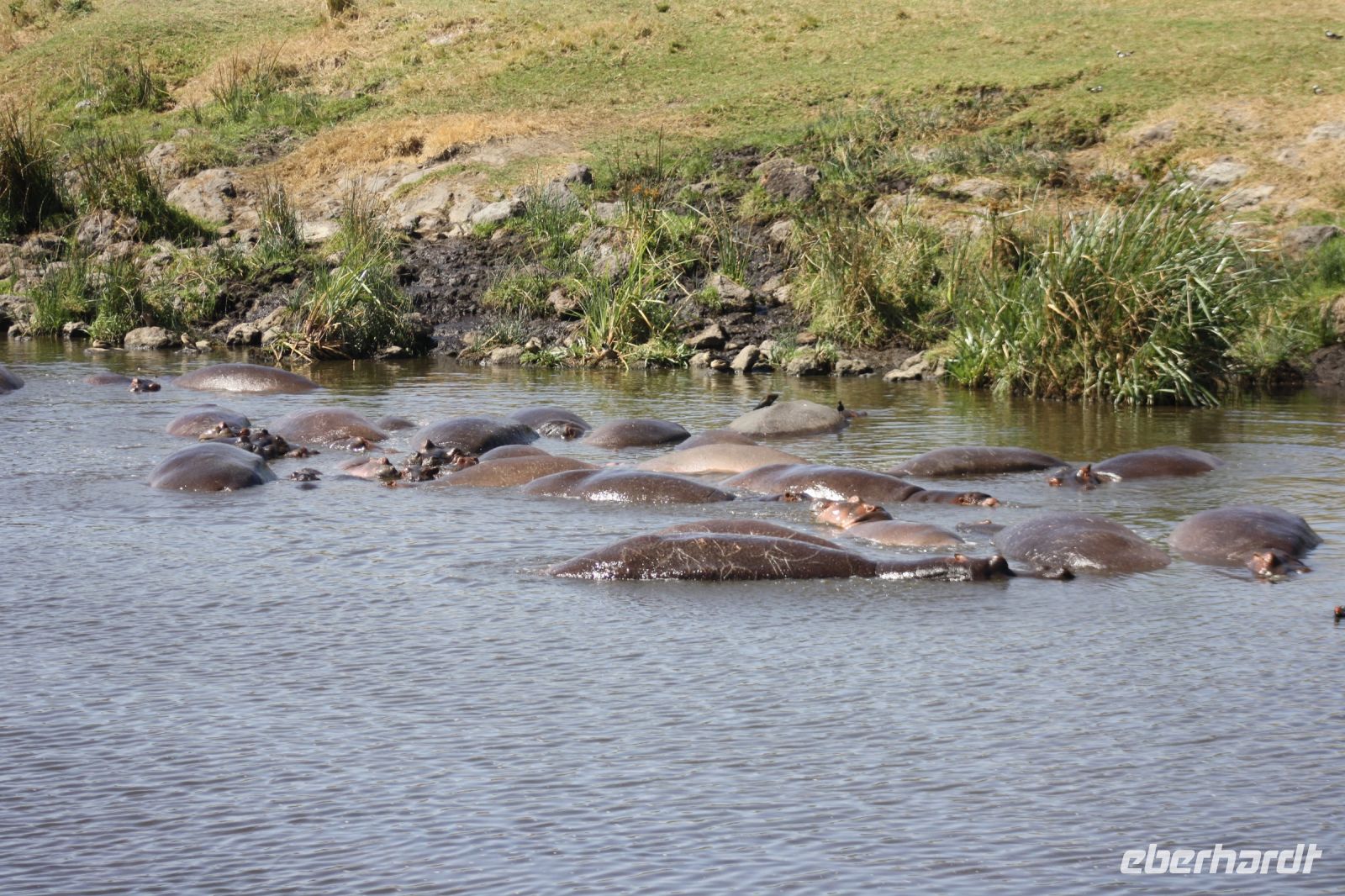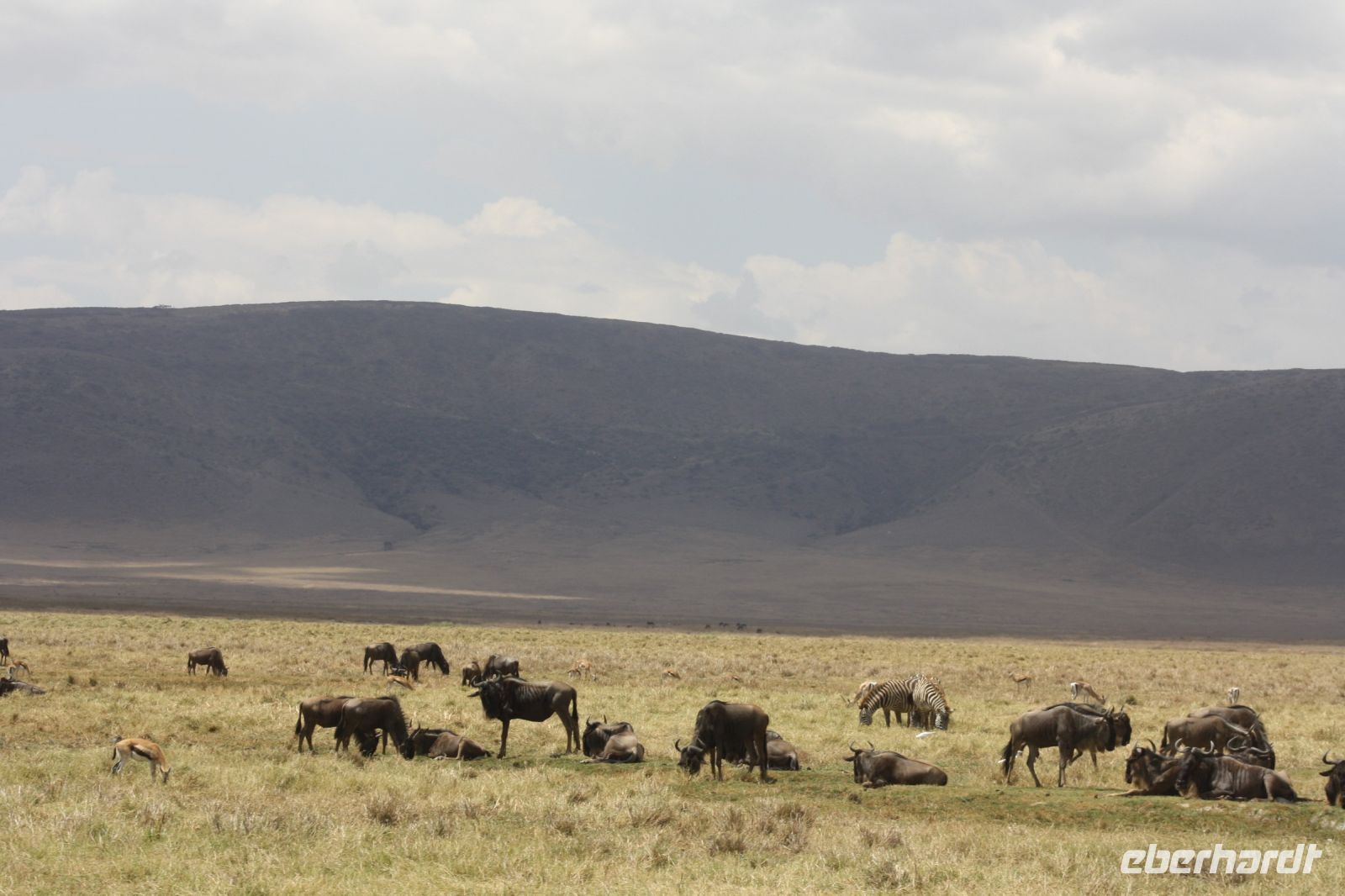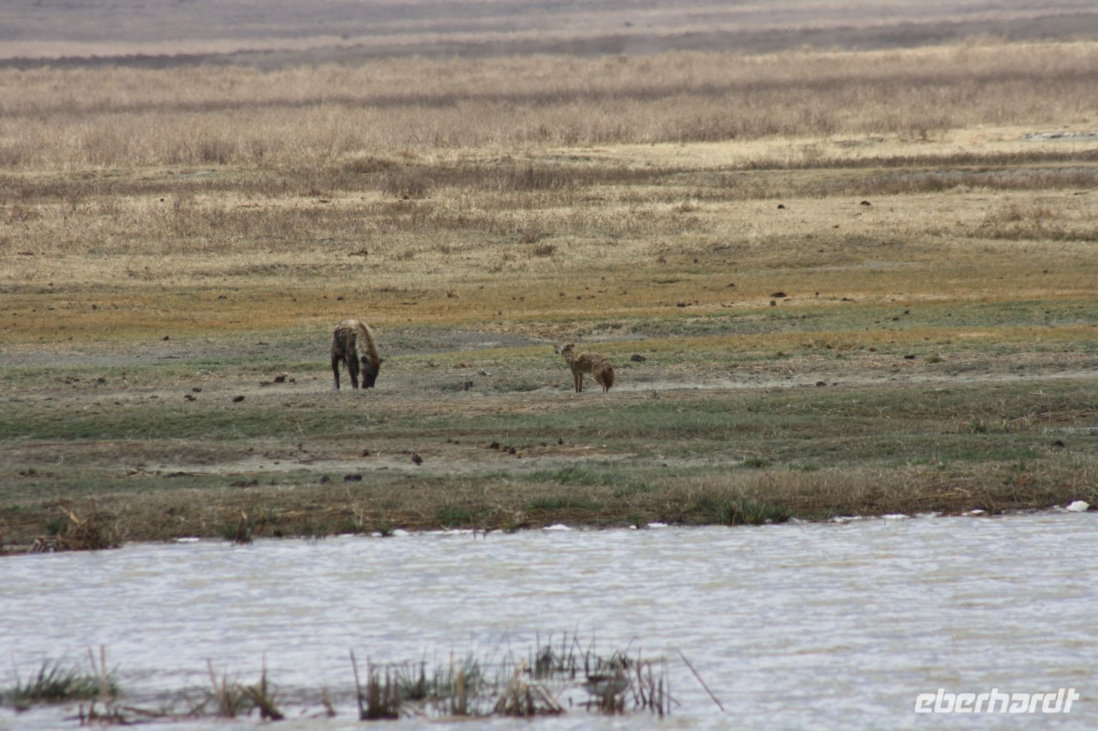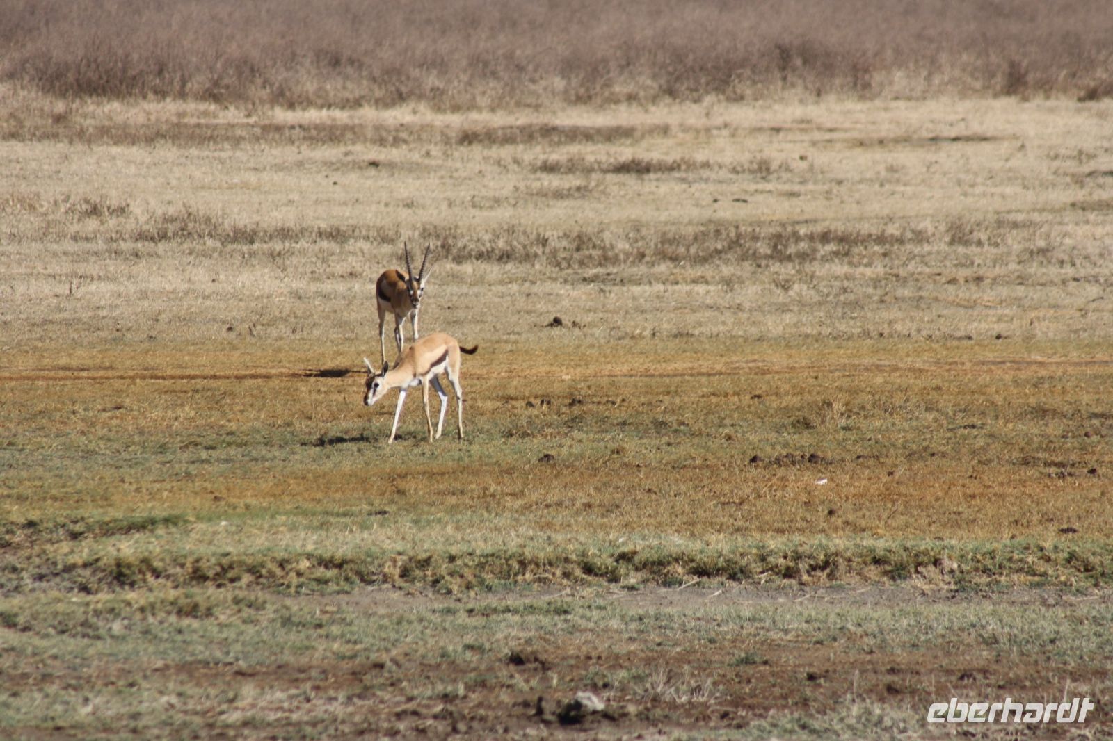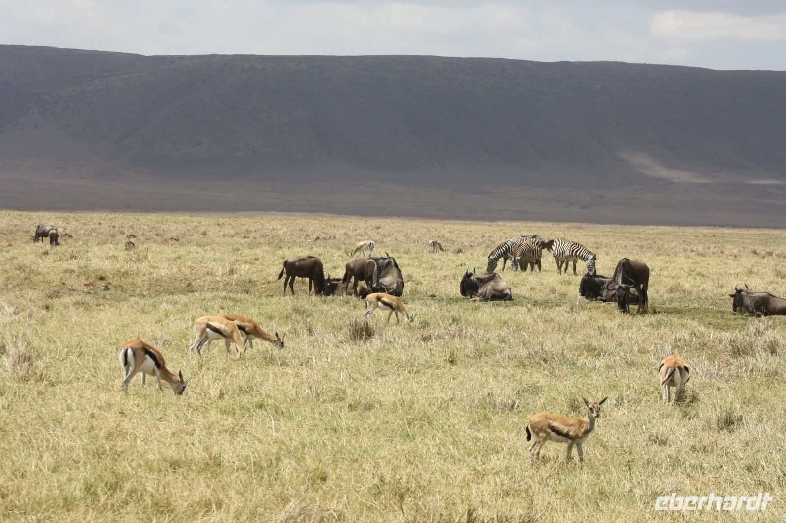 Mit dem Ngorongoro Krater stand heute ein weiteres Highlight auf unserer Agenda. Daher standen wir bereits eine Stunde früher auf und erreichten den Nationalpark bereits um 8 Uhr. Am Gate konnten wir nochmal auf Toilette und uns den Krater in einem kleinen Museum einprägen. Am Gate begrüßte uns bereits eine Paviane Familie und wir fuhren voller Vorfreude auf einer Allwetterpiste den Krater herab. Zwischendurch erhielten wir immer wieder spektakuläre Ausblicke in den Krater hinein. Unsere erste Tierbeobachtung im Krater war dagegen erstmal unspektakulär. Eine Gruppe Perlhühner hieß uns im Krater willkommen. Anschließend liefen allerdings unsere Kameras heiß. Neben einer riesigen Herde Gnu und einer Horde Büffel, konnten wir einen Schakal und Hyänen entdecken. Auch die Vogelwelt ließ sich zahlreich blicken und Bussarde, Kronenkraniche, Flamingos und Stelzenvögel flogen vor unsere Kameras. Am Rand des Lake Magadi konnten wir in eine Herde Hippos entdecken. Nicht weit entfernt fanden wir einen Rudel Hyänen, die sich ganz in der Nähe der Löwen aufhielten. Das Rudel Löwen bestand aus ca. 10 weiblichen Löwen, die bereits gespeist hatten und einen längeren Verdauungsschlaf hielten. Ein weitere Goldschakal huschte an uns vorbei, ehe wir den Hippo-Pool erreichten. In dem dreckigen Nass badeten über 30 Hippos und hielten wir uns ein Konzert ab. Grade als wir einen weiteren Vogelstrauß fotografieren wollten, erhielten wir die Nachricht, dass sich in der Nähe drei weitere Löwinnen aufhielten. Die drei Löwinnen posierten zunächst auf einen kleinen Felsvorsprung, ehe sie sich später auf einen Baum versteckten. Mit dem Fernglas konnten wir in der Ferne sogar 2 Nashörner erblicken. Nach nur wenigen Minuten spazierten eine Löwin direkt an unserem Jeep vorbei. Manchmal muss man einfach Glück haben. Ein männlicher Löwe hingegen schlummerte ganz in der Nähe im Gras und ließ sich von uns nicht stören. Auf dem Weg zum Picknick-Bereich folgte ein weiterer Höhepunkt. Zunächst erspähten wir ein Schakal, der sich eine Schlange erbeutet hatte. Plötzlich folgte ein Angriff eines Adlers und wir konnten einen Kampf um eine Schlange beobachten, welchen der Adler gewann. In der Mittagszeit speisten wir unser Lunchpaket im Jeep und genossen die wunderschöne Natur. Am Nachmittag fuhren wir ins Sumpfgebiet und konnten neben Büffel, auch Elefant beim Baden beobachten. Dann erhielten wir die Nachricht, dass ein Nashorn entdeckt wurden. Leider werden die Nashörner immer schwieriger zu sehen, da sich der Bestand der Nashörner ständig reduziert und die Wilderer ihres dazu beitragen. Unterwegs lichteten wir noch Grants-Gazellen und Thomson Gazelle ab und hielten beim einem Pelikan und Nimmersatt. Allerdings war auch hier das Nashorn nur vom weiten sichtbar, aber wir konnten immerhin ein Gefühl auf seine Größe bekommen. Leider war es nun wieder an der Zeit den Ngorongoro Krater zu verlassen. Unterwegs entdeckten wir noch weitere Hyäne, Pelikane, Hippos und einen Schakal. Am Kraterrand stoppten wir am Denkmal des berühmten Tierfilmer Bernhard Grzimek und genossen nochmal den atemberaubenden Ausblick in den Krater. Auf unserem Nachhauseweg stoppten wir noch kurz bei einem Souvenirladen, ehe wir am frühen Abend unsere Lodge erreichten. Ein atemberaubender Tag neigte sich leider dem Ende entgegen und wir stießen gemeinsam mit einen Amarula auf unseren ersten Teil der Reise an.